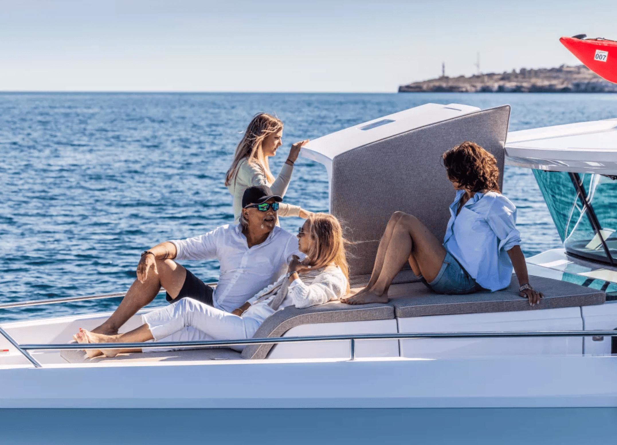 The Axopar 45 XC Cross Cabin sets a new standard for adventure on the water, combining exhilarating performance with exceptional functionality and lavish comfort. This striking new model showcases the exclusive BRABUS Line trim package, featuring bold black accents that enhance its modern aesthetic. Its design includes practical elements such as robust grab rails equipped with fishing rod holders, a sturdy water ski frame, and versatile roof racks, making it the ultimate choice for leisure and adventure seekers.
