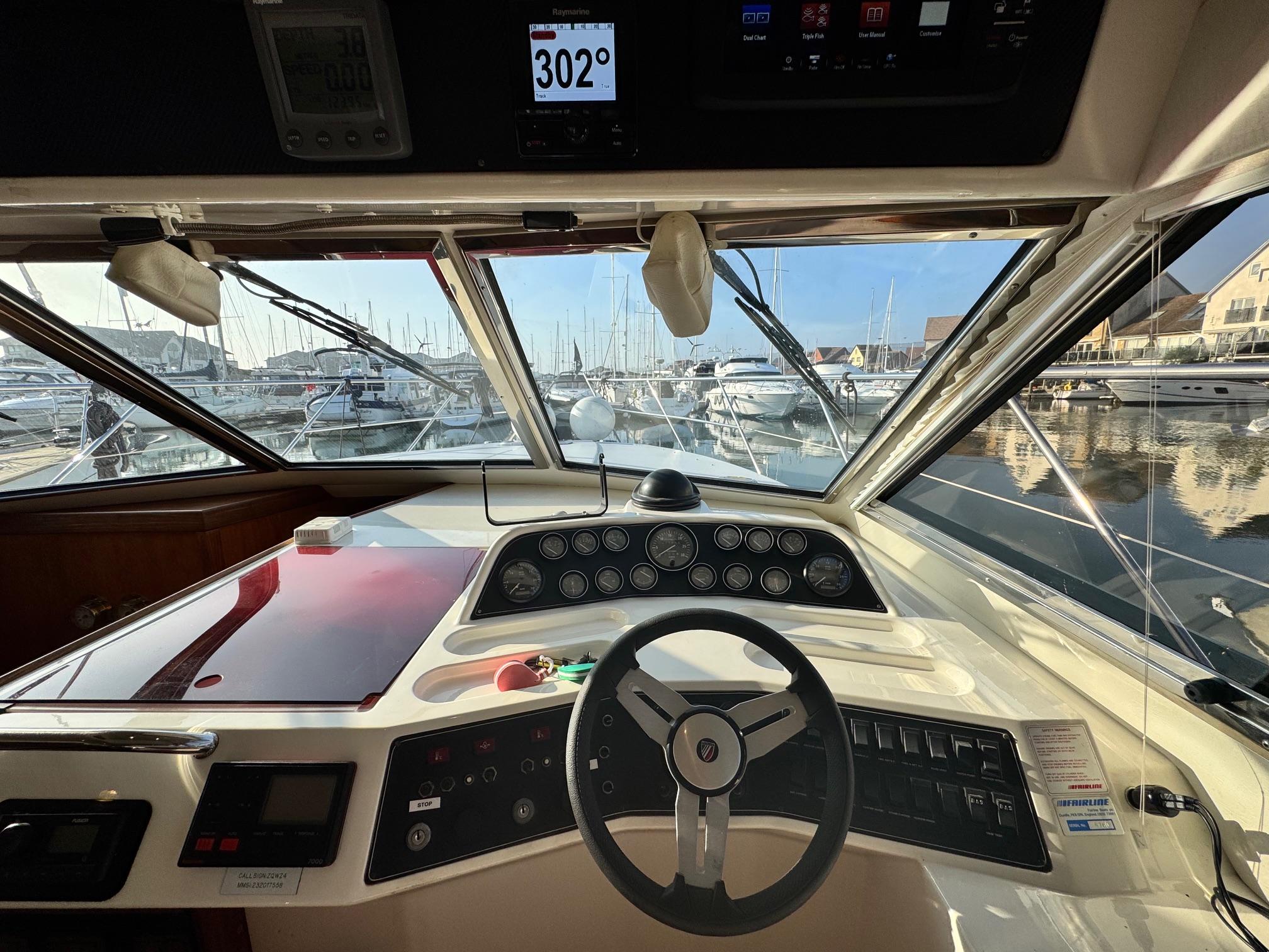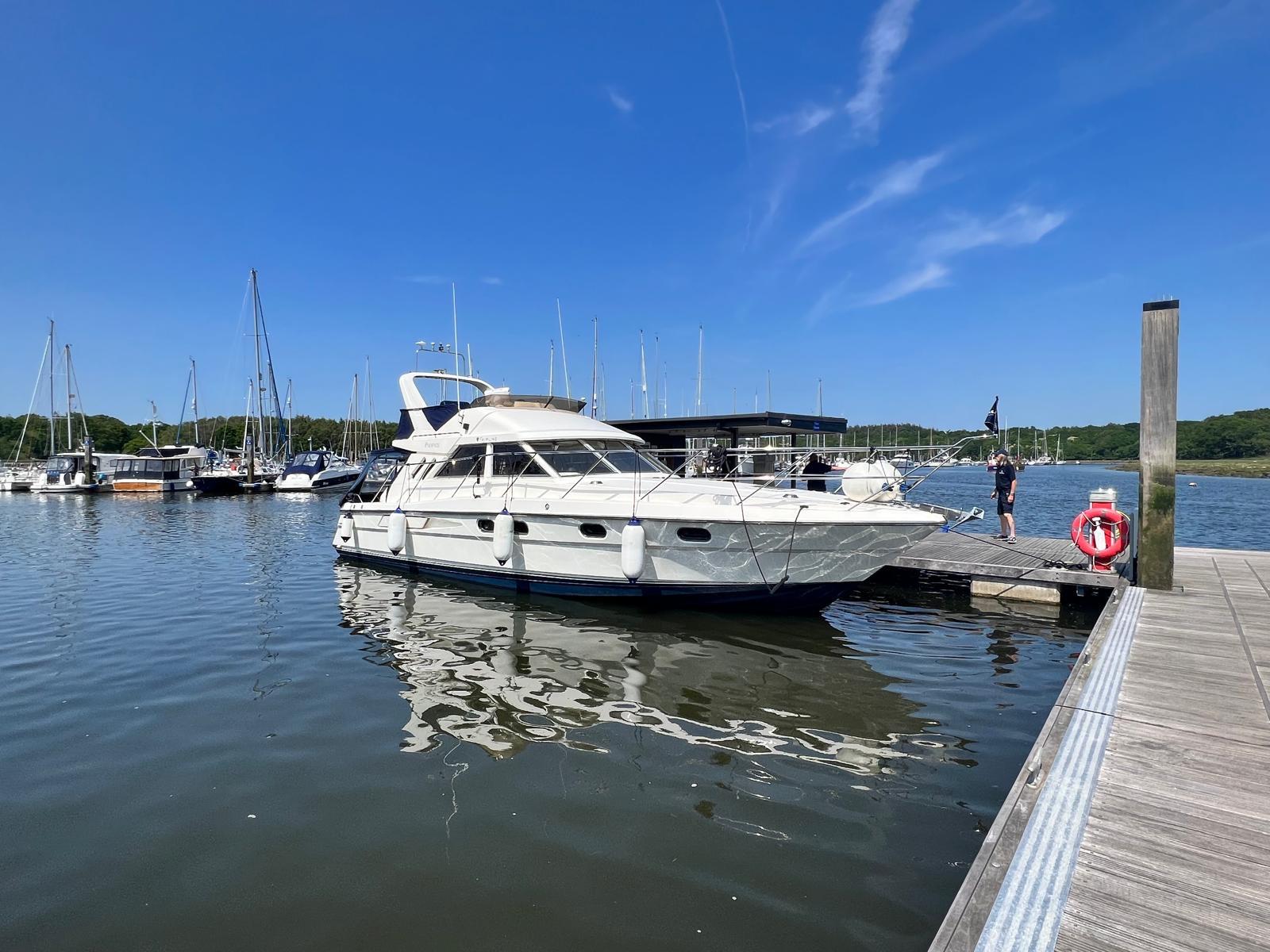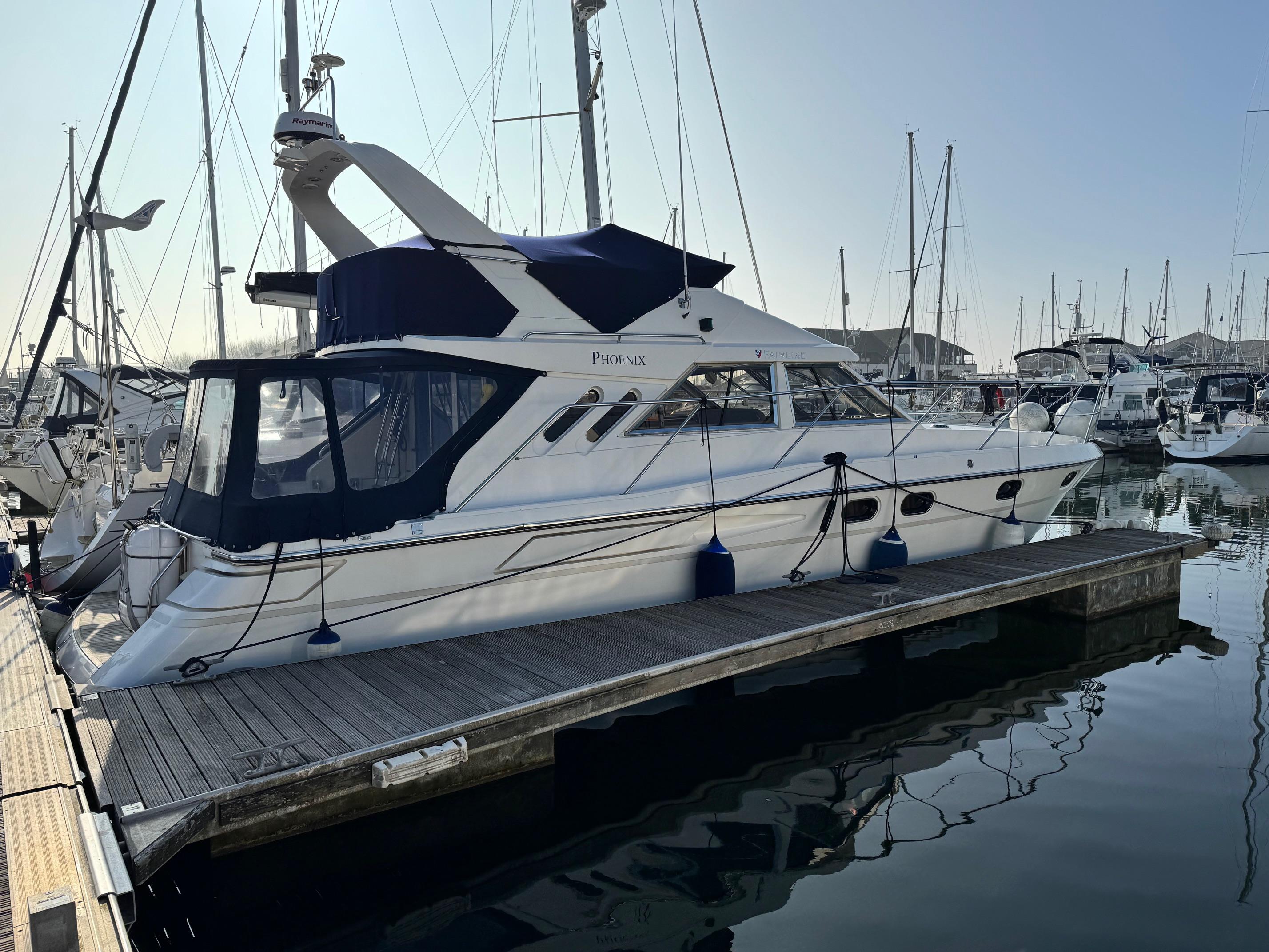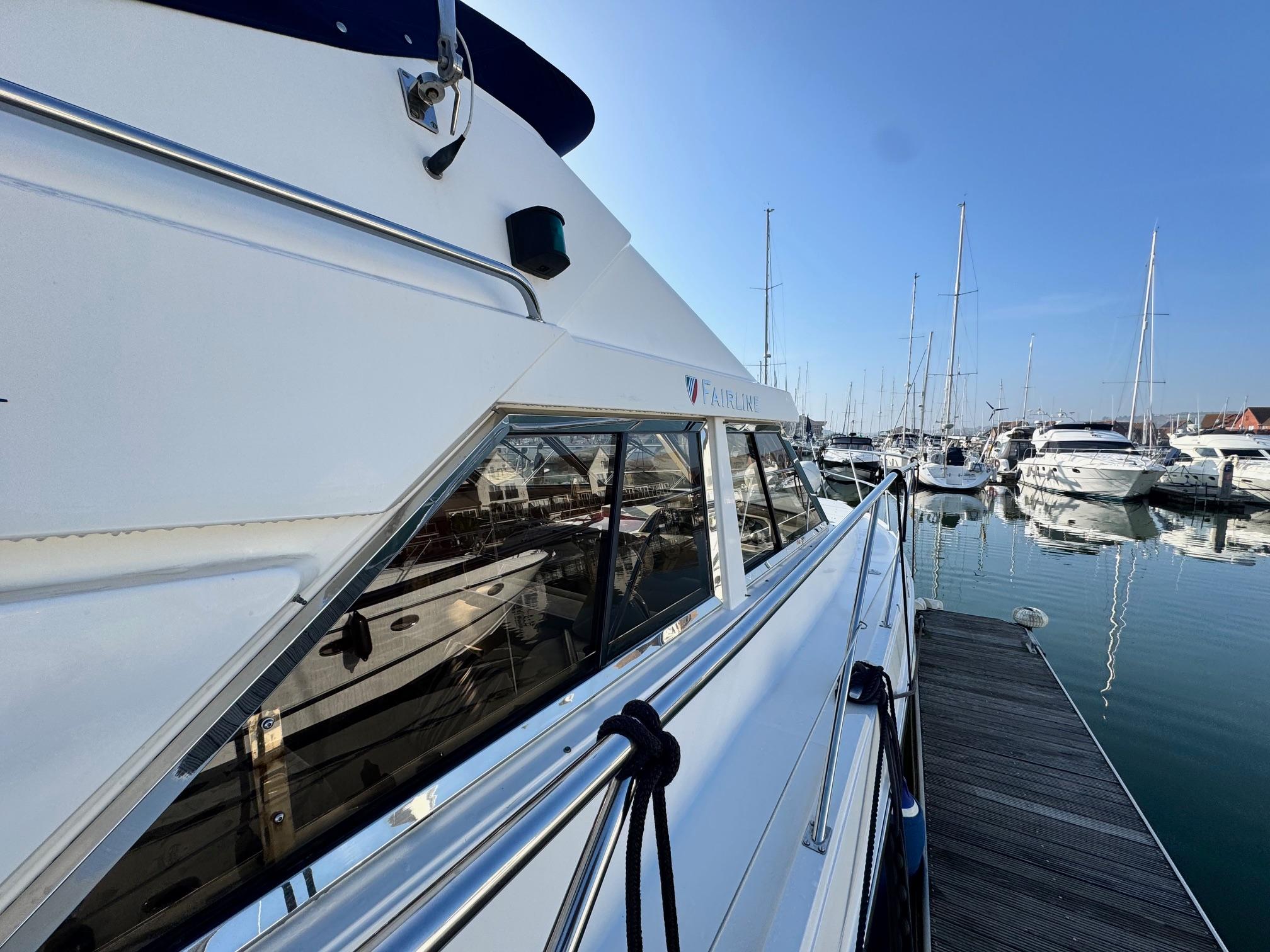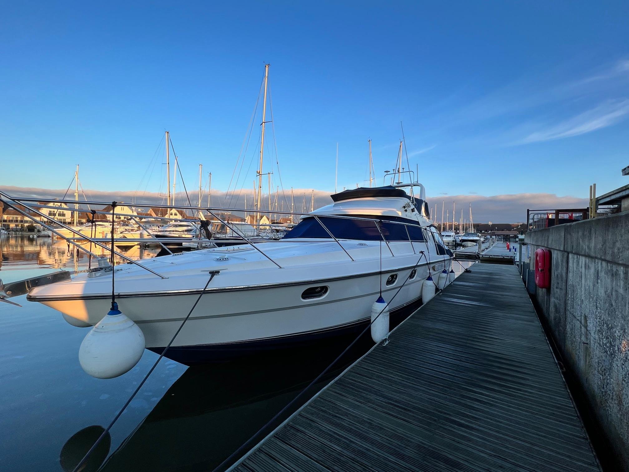 1989 Fairline 41 Sedan equipped with twin Caterpillar 3208 TA (375hp) Diesel engines. Lovingly cared for, this model by the renowned manufacturer offers a large specification that includes: Chartplotter, lower and upper helm, Radar (new in 2024) Depth Log, Compass, Autopilot, Speed Log, VHF, GPS – all repeated on flybridge. Bow and Stern Thrusters with remote control, Digital TV in lounge and master bedroom, Eberspacher heating, fridge in galley and lounge, Fusion Stereo with speakers in lounge, cockpit and flybridge, Electric hob and microwave, new flybridge Canopy, summer canopies for forward flybridge seats and instrument panel, windscreen and side window cover, new flybridge seats, new dodgers, Faux Teak flybridge floor, lower cockpit has faux teak floor, large lazarette, new seats, under seat storage, additional centre seat insert and more. Engines serviced in 2024, antifouled and new anodes applied March 2025, props burnished and hull polished Available to view via appointment only.