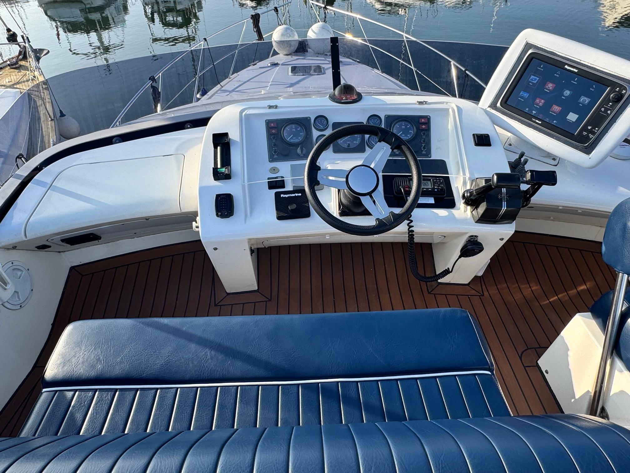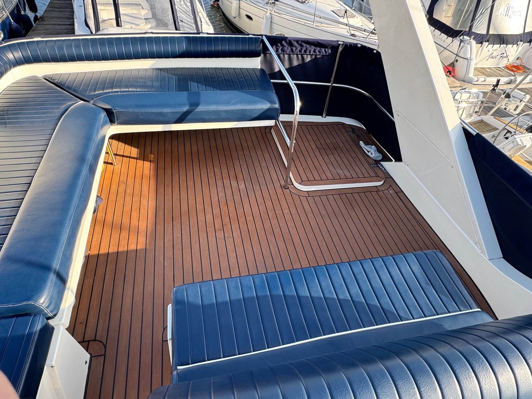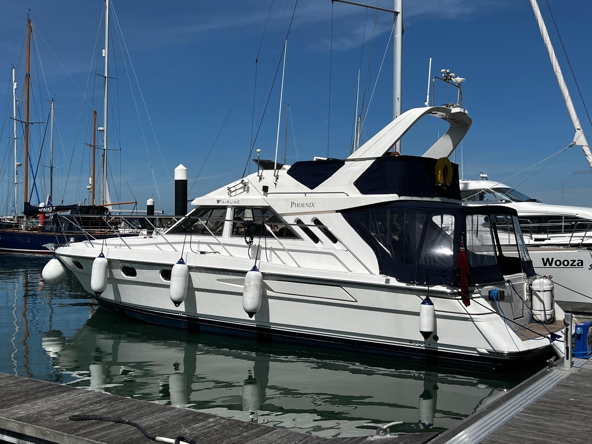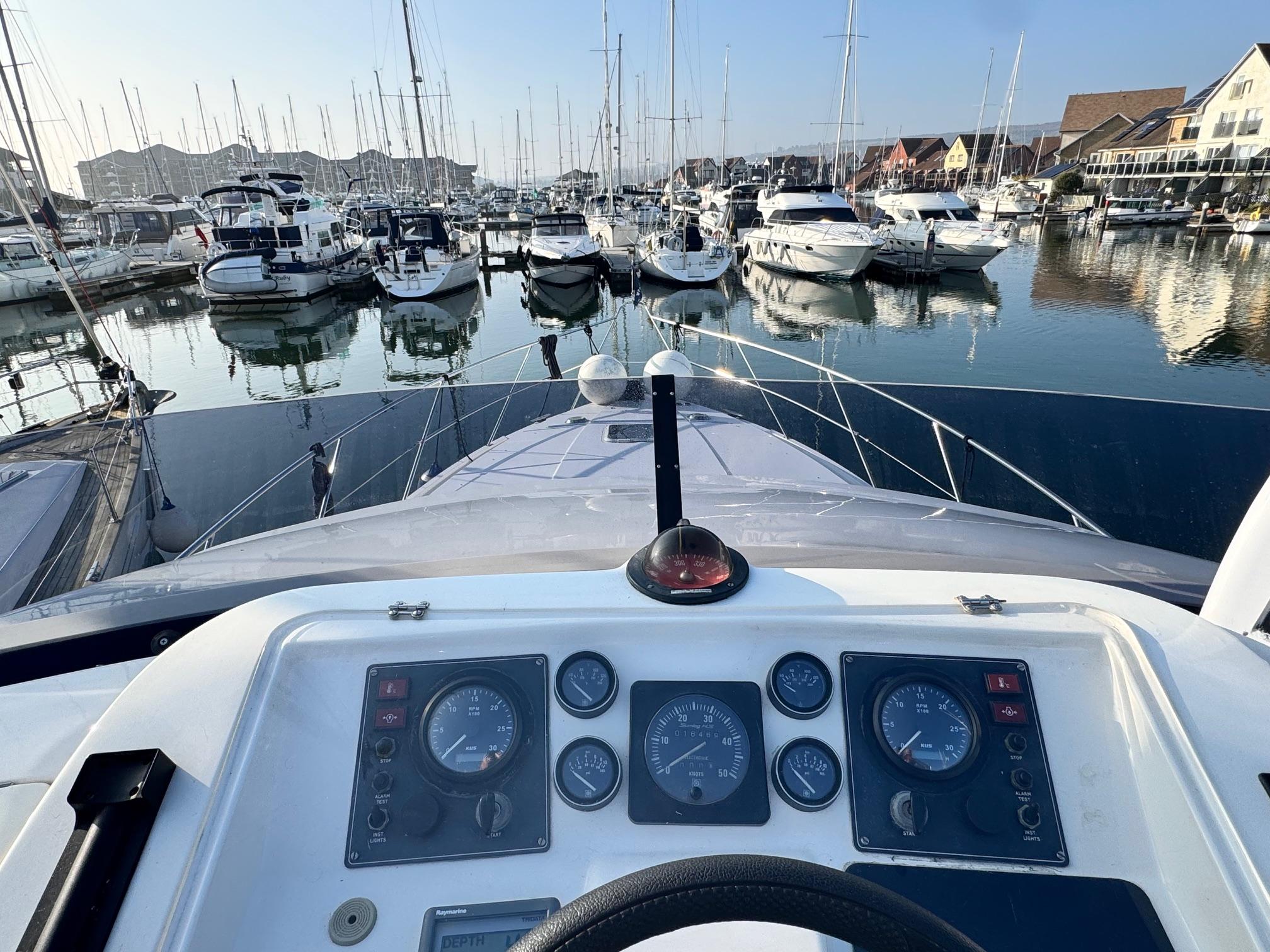 1989 Fairline 41 Sedan equipped with twin Caterpillar 3208 TA (375hp) Diesel engines. Lovingly cared for, this model by the renowned manufacturer offers a large specification that includes: Chartplotter, lower and upper helm, Radar (new in 2024) Depth Log, Compass, Autopilot, Speed Log, VHF, GPS – all repeated on flybridge. Bow and Stern Thrusters with remote control, Digital TV in lounge and master bedroom, Eberspacher heating, fridge in galley and lounge, Fusion Stereo with speakers in lounge, cockpit and flybridge, Electric hob and microwave, new flybridge Canopy, summer canopies for forward flybridge seats and instrument panel, windscreen and side window cover, new flybridge seats, new dodgers, Faux Teak flybridge floor, lower cockpit has faux teak floor, large lazarette, new seats, under seat storage, additional centre seat insert and more. Engines serviced in 2024, antifouled and new anodes applied March 2025, props burnished and hull polished Available to view via appointment only.