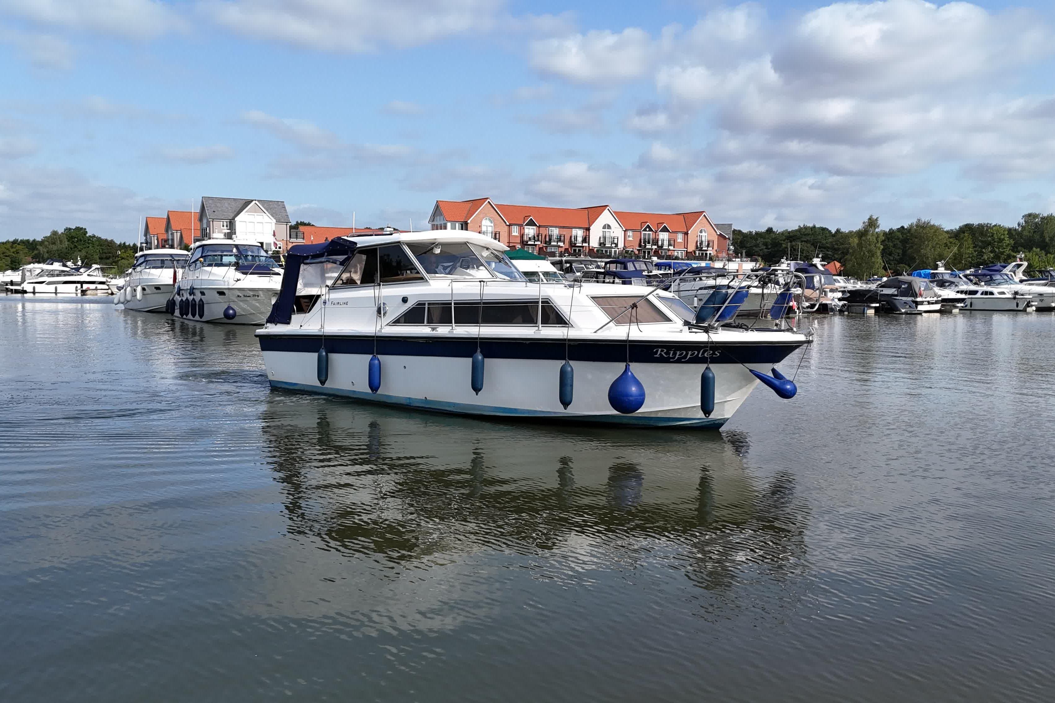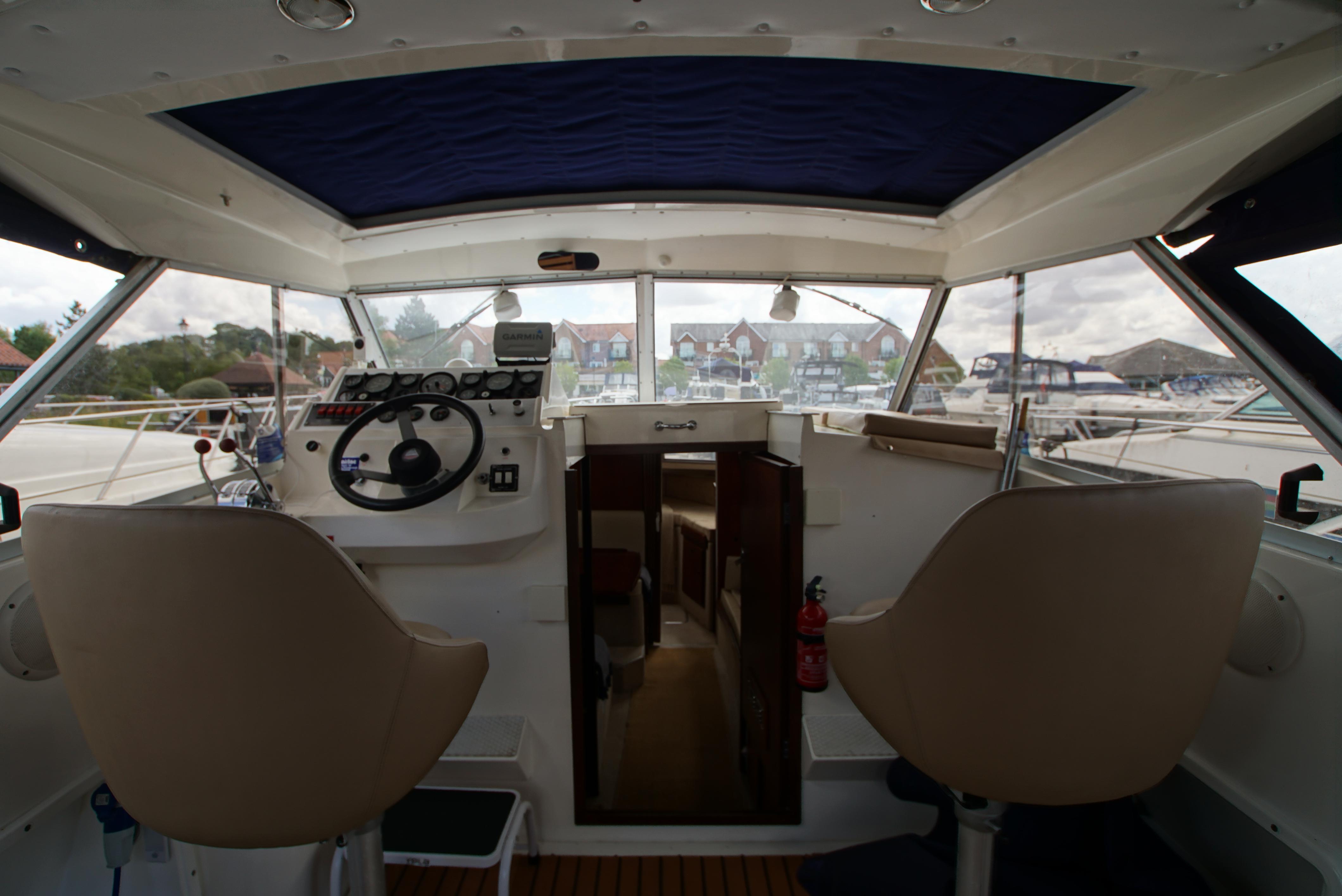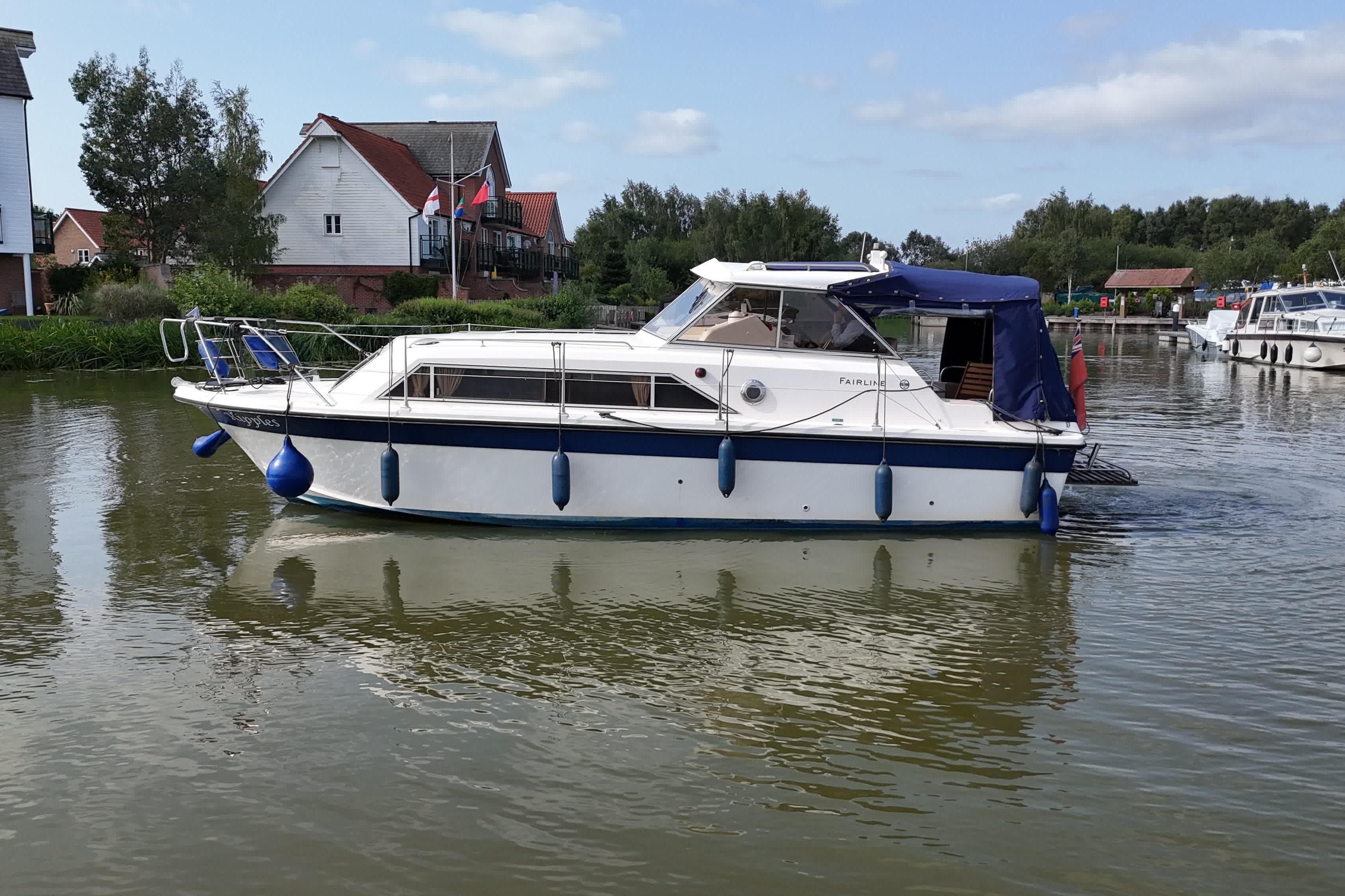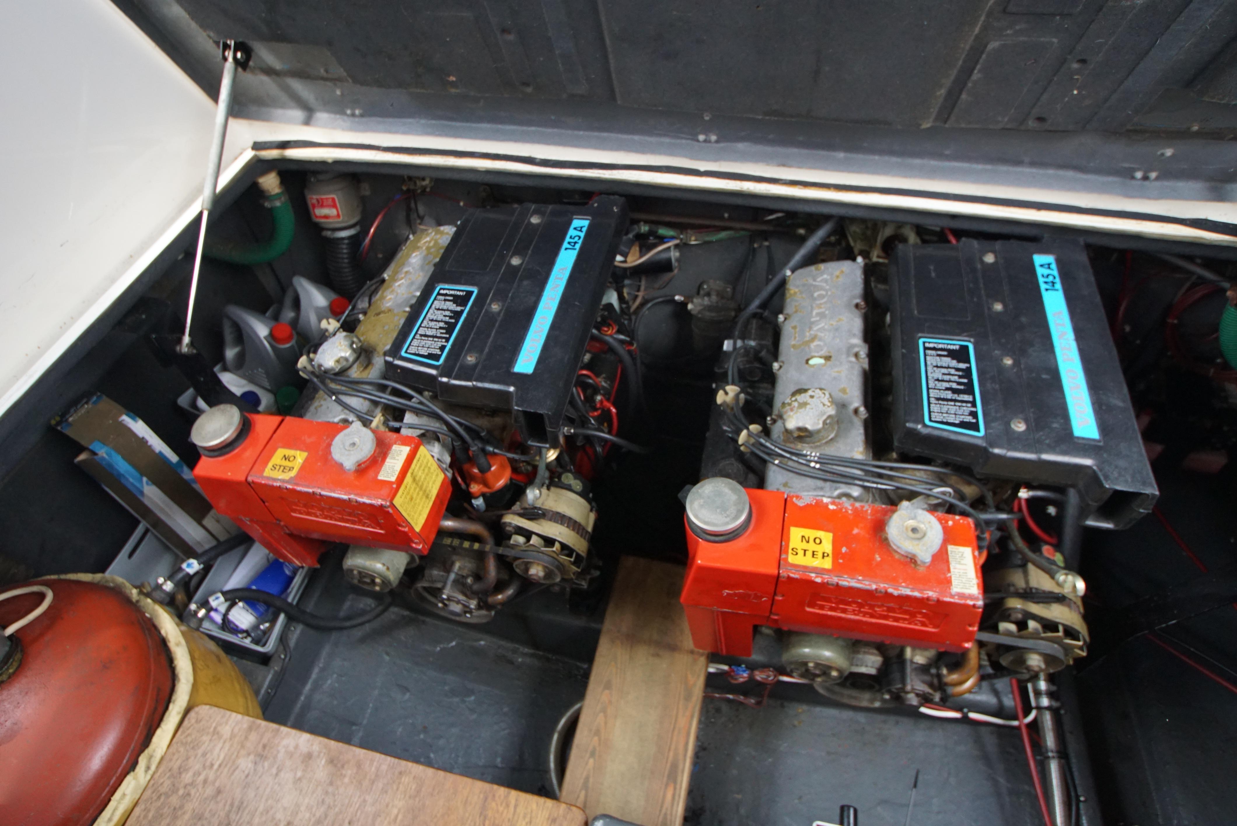 1983 Fairline Mirage 29 with twin Volvo Penta 145A petrol engines. Very well presented example of this popular model from the British marque. The cockpit is partially covered with a GRP hardtop and with a canopy surround in place to fully enclose the area it doesn’t compromise the usability in poor weather. The cockpit upholstery has been replaced in Silvertex fabric for a more modern look and cockpit floor finished in synthetic teak. The helm position is well laid out and gives all crucial engine information as houses a Garmin plotter and Trim tab control. The interior is very well appointed with many amenities including: Microwave (replaced 2021) inverter (Fitted 2021) Fridge (replaced 2021) Calorifier and immersion for hot water, electric heater in saloon and more. Available to view 7 days a week at Burton Waters Boat Sales in Lincoln, Boat Safety certificate valid until February 2026