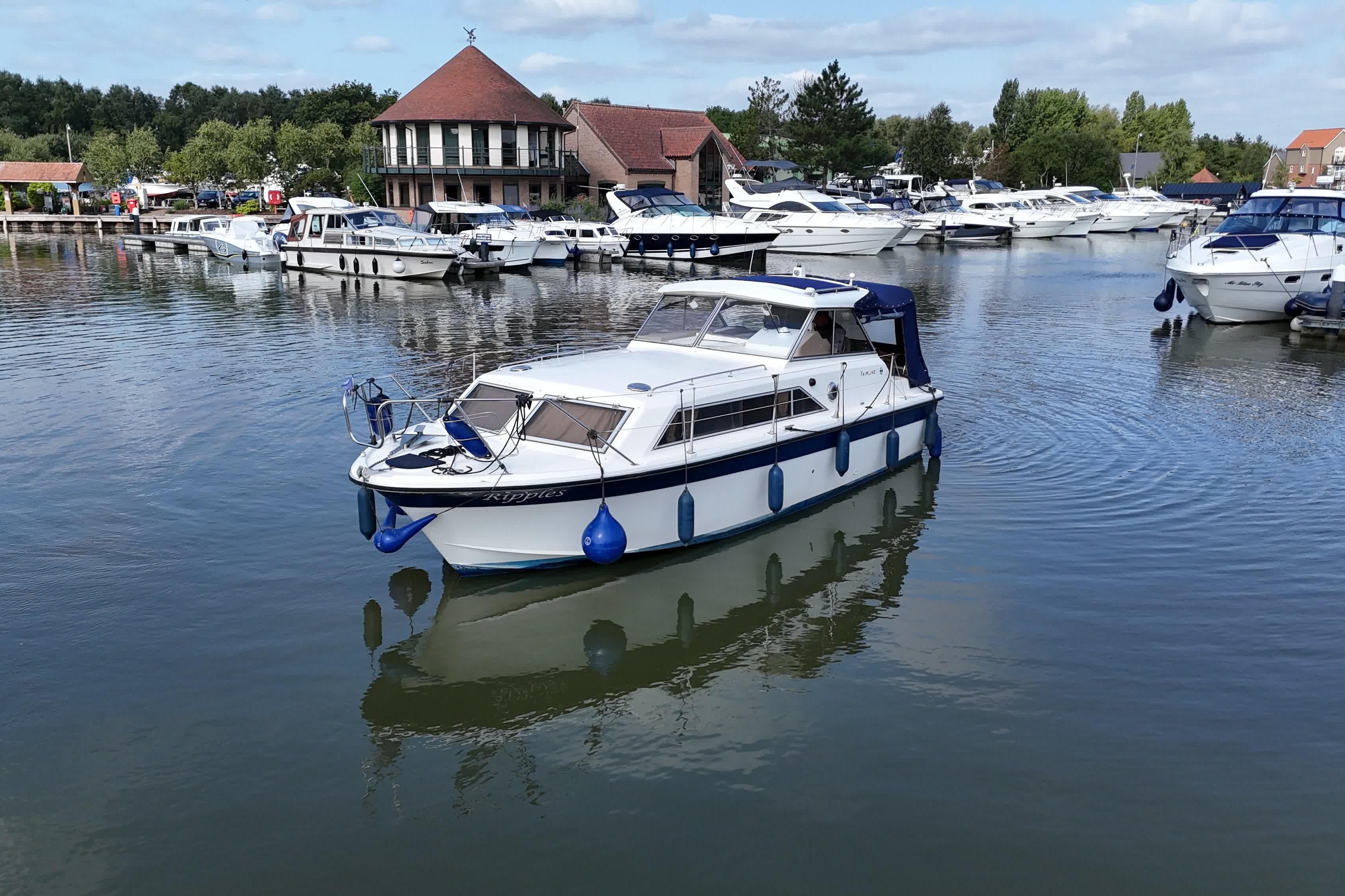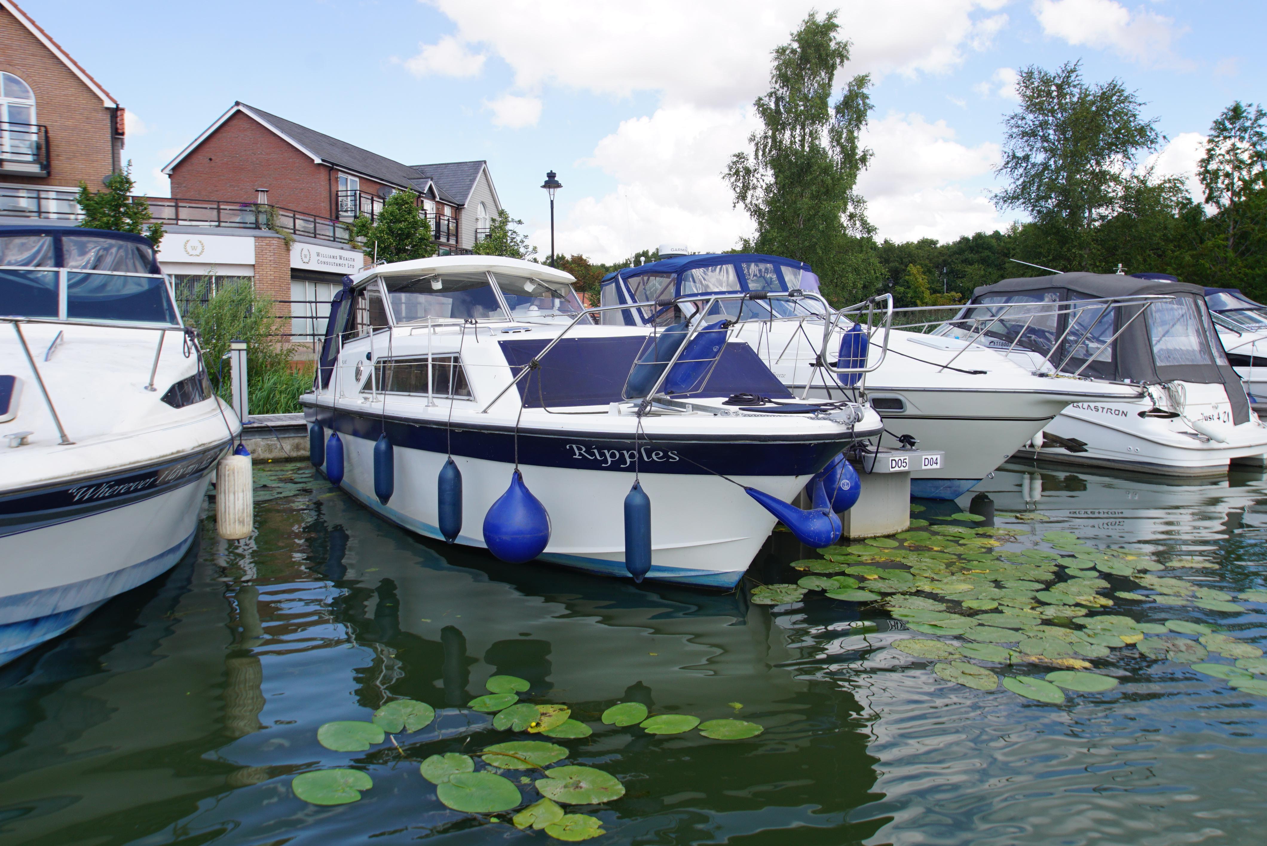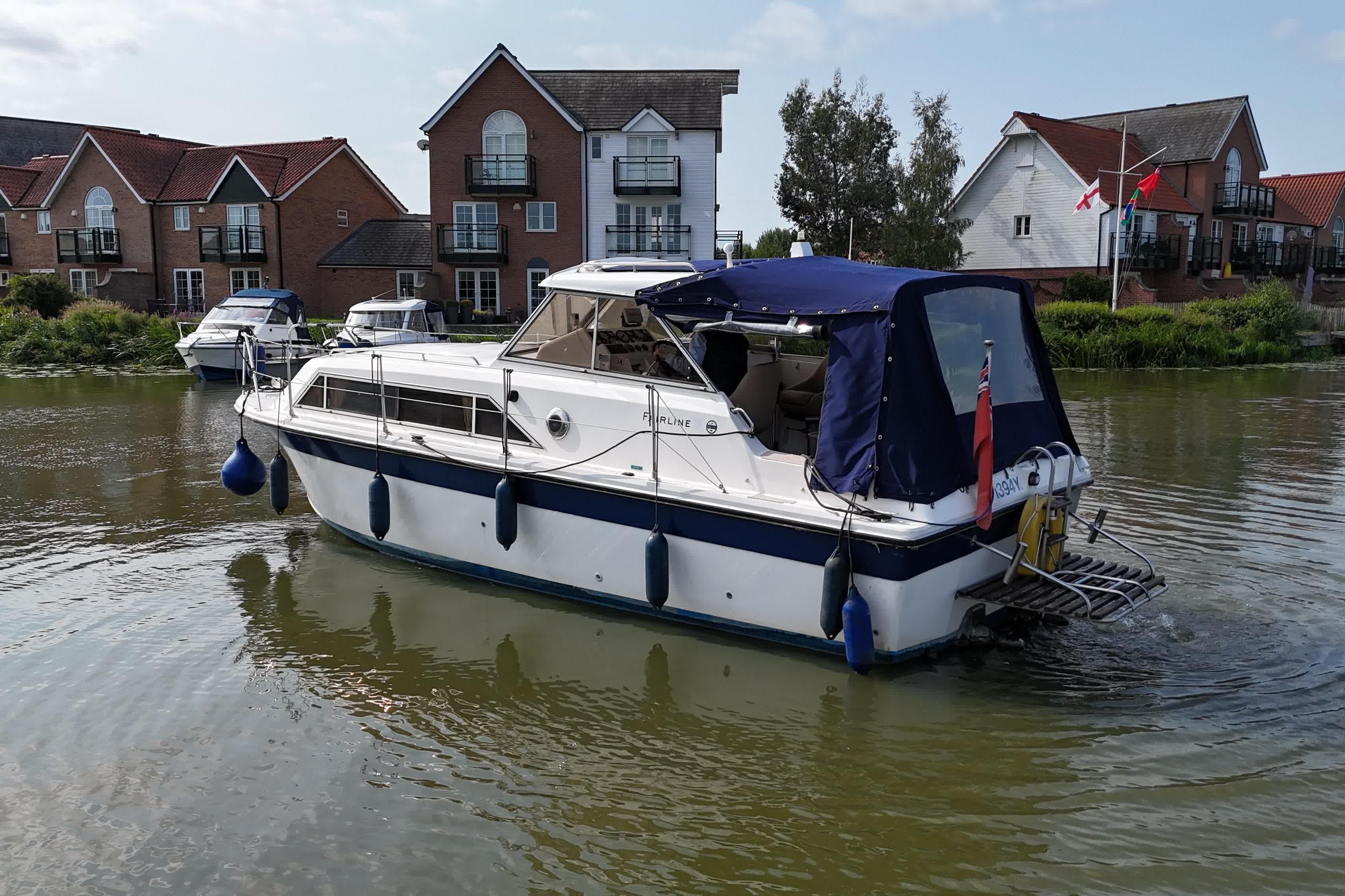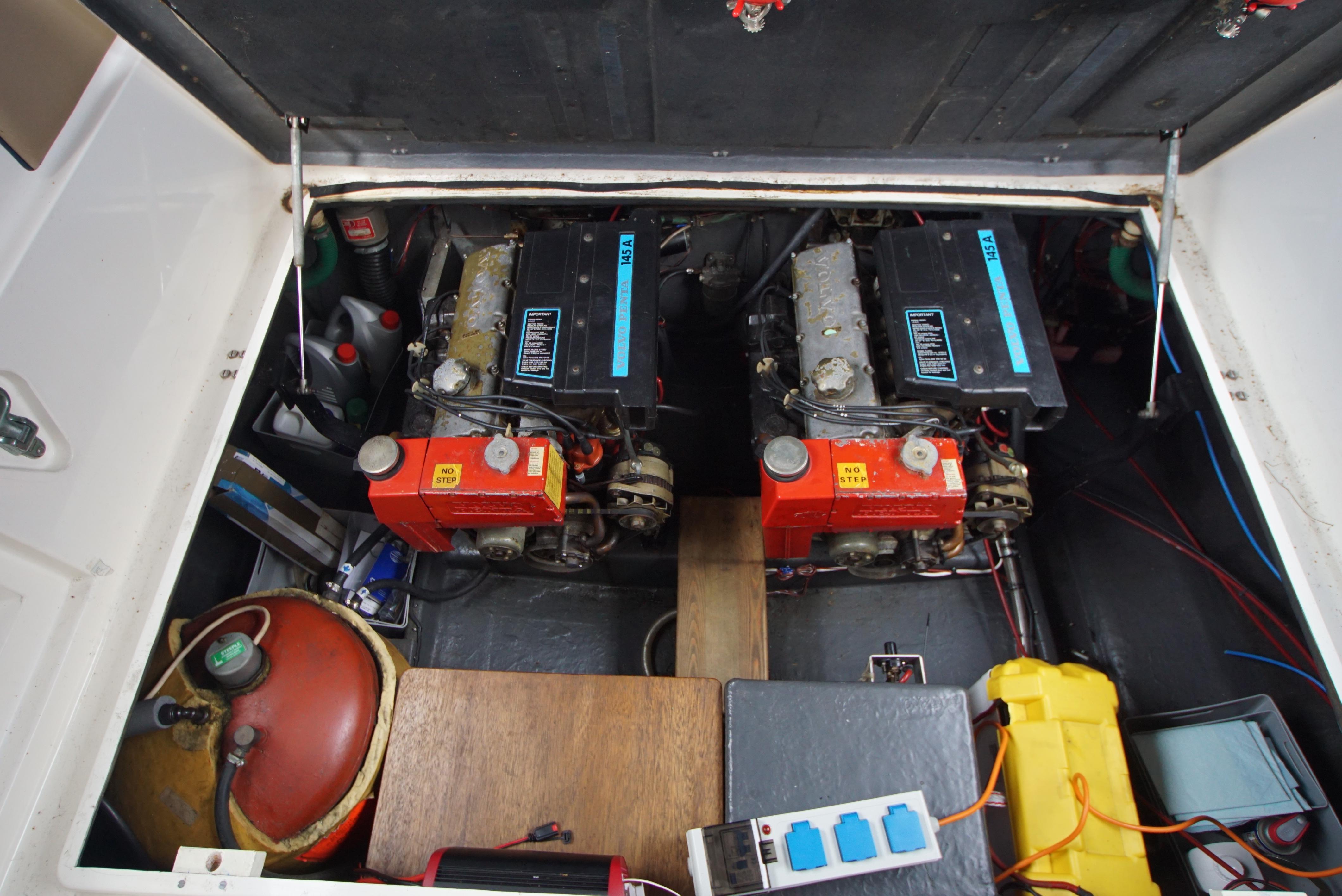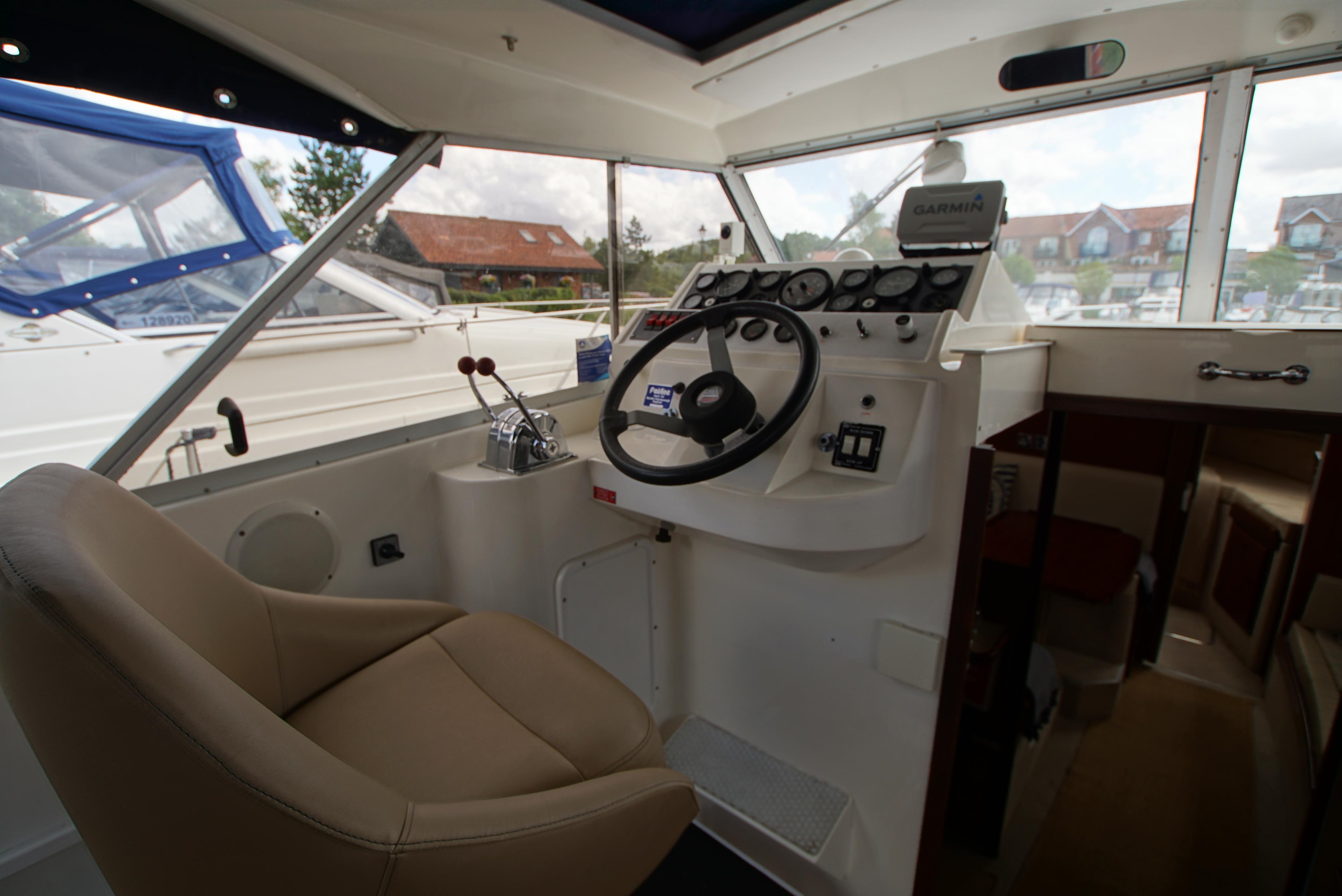 1983 Fairline Mirage 29 with twin Volvo Penta 145A petrol engines. Very well presented example of this popular model from the British marque. The cockpit is partially covered with a GRP hardtop and with a canopy surround in place to fully enclose the area it doesn’t compromise the usability in poor weather. The cockpit upholstery has been replaced in Silvertex fabric for a more modern look and cockpit floor finished in synthetic teak. The helm position is well laid out and gives all crucial engine information as houses a Garmin plotter and Trim tab control. The interior is very well appointed with many amenities including: Microwave (replaced 2021) inverter (Fitted 2021) Fridge (replaced 2021) Calorifier and immersion for hot water, electric heater in saloon and more. Available to view 7 days a week at Burton Waters Boat Sales in Lincoln, Boat Safety certificate valid until February 2026