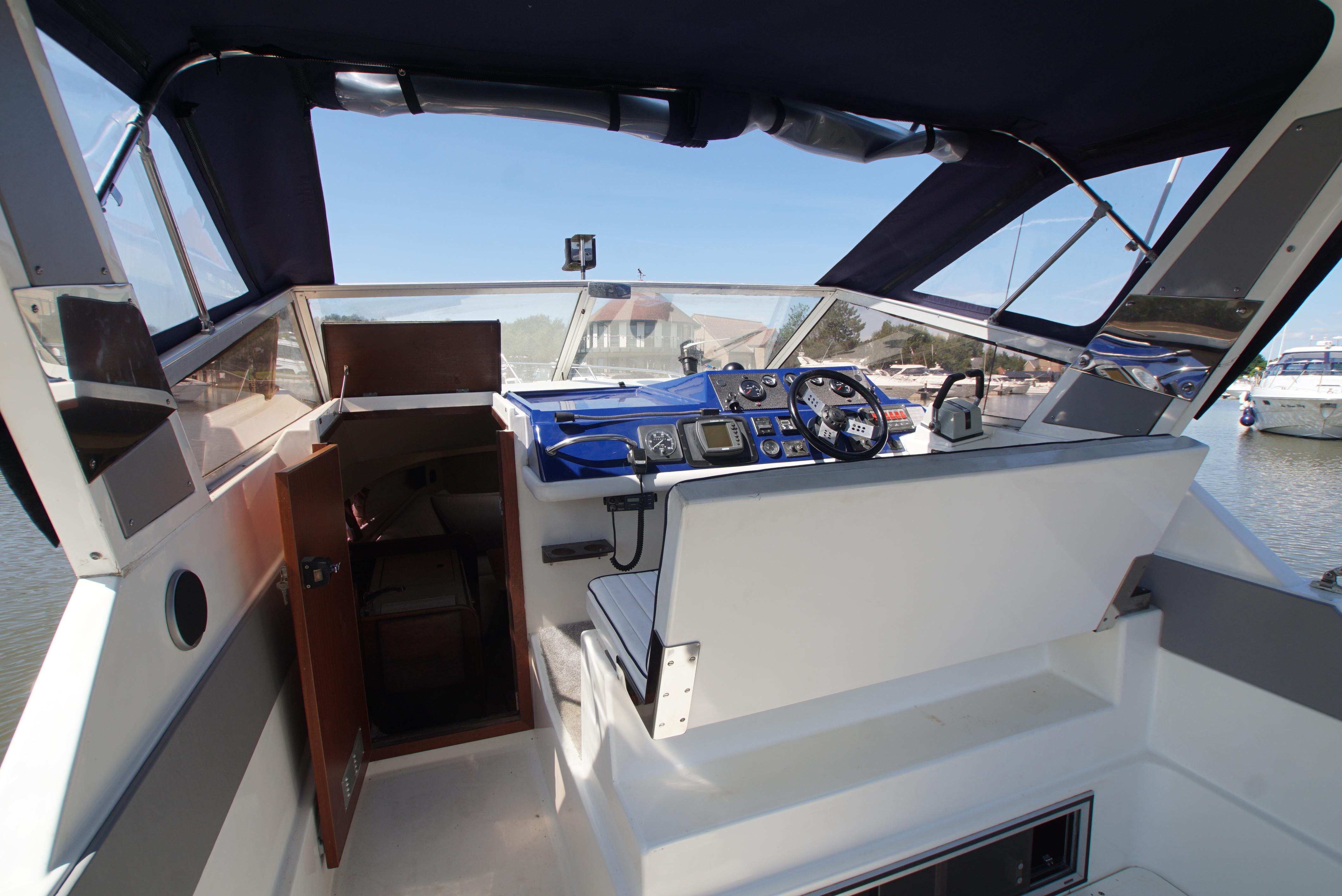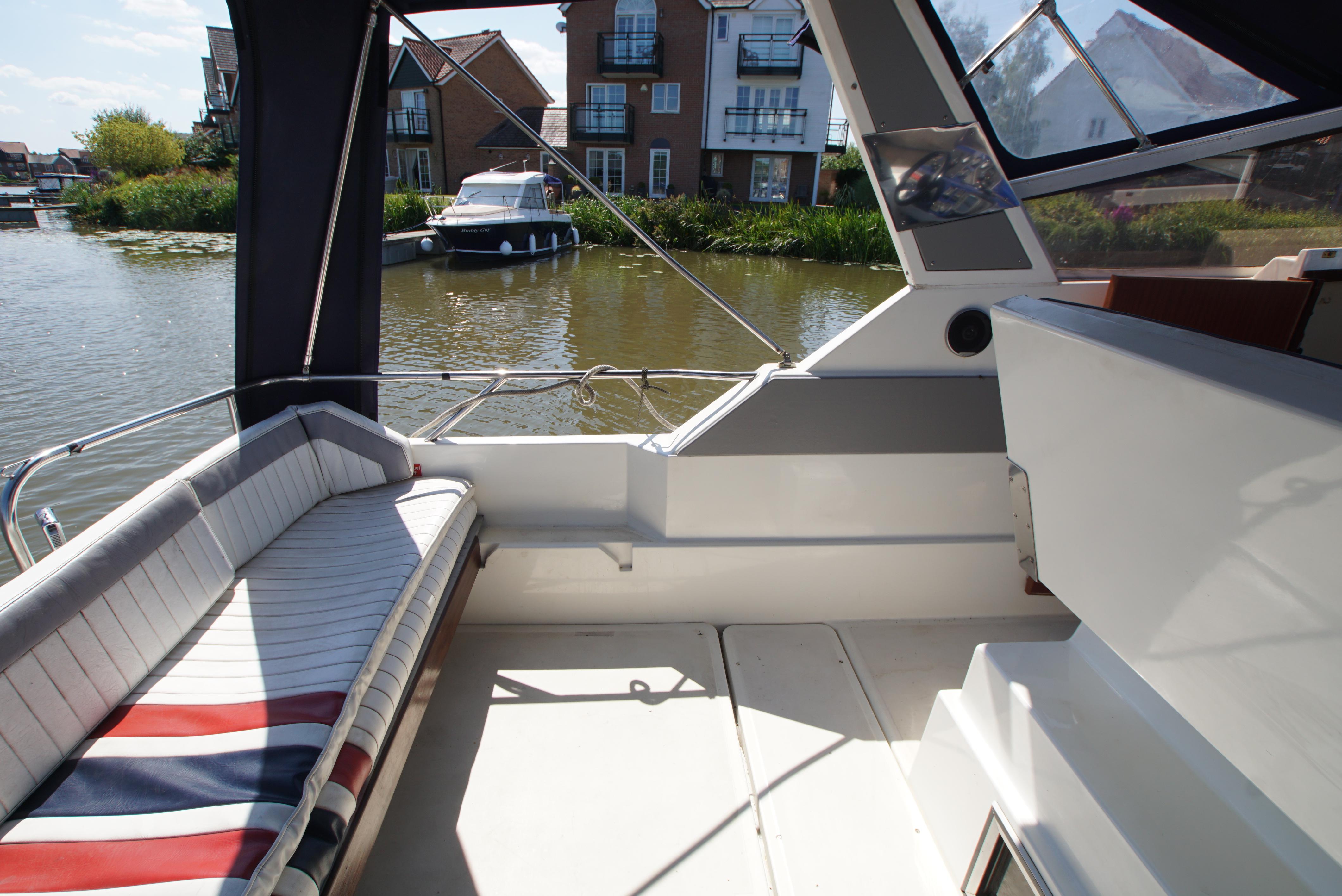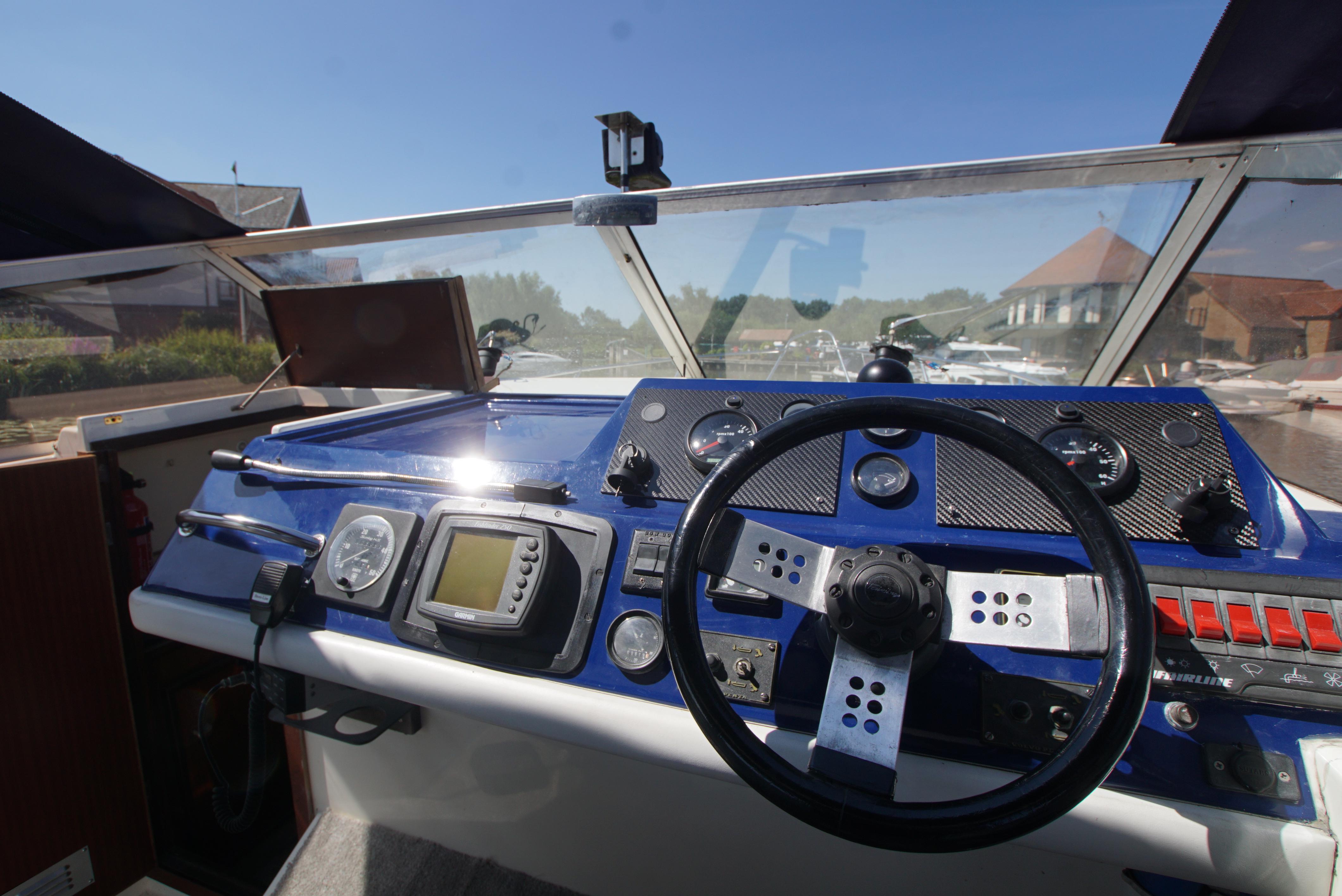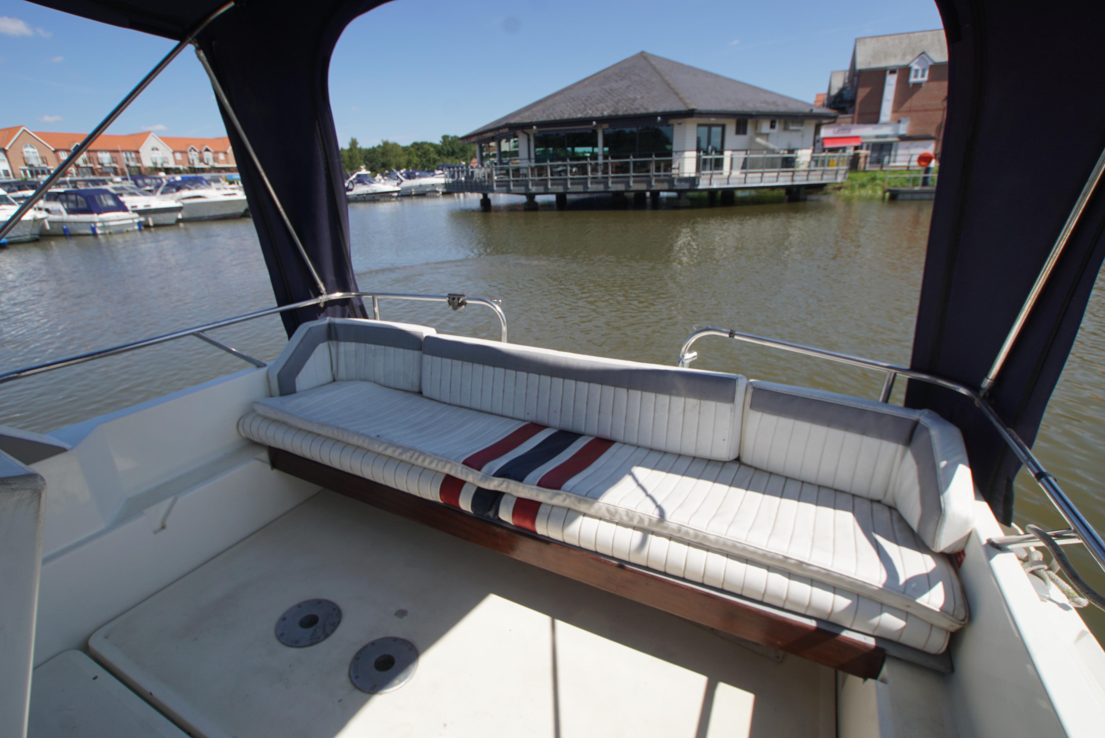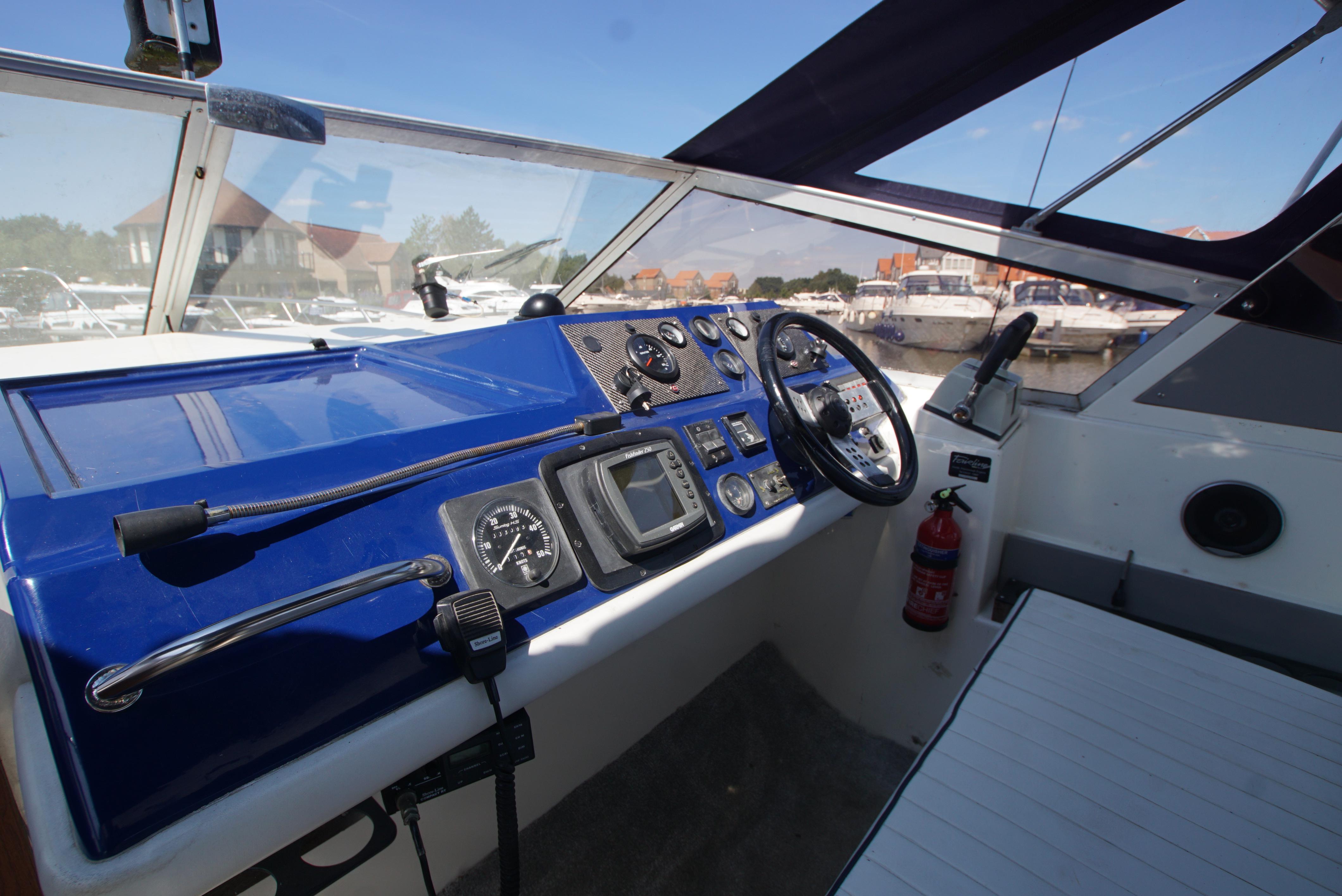 1989 Fairline Sunfury 26, with twin Diesel engines. British built sports cruiser with large cockpit area. The cockpit canopy can be completely removed to make the most of the sun or remain fully enclosed for milder days. There is a separate rear cabin with single berth or dinette conversion in the central saloon. Further Specification includes: extended bathing platform, wide side decks for access, gas hob and oven, fridge, shorepower, manual toilet, VHF radio, Garmin Fishfinder 250, FM radio and more. Recent works include new interior carpets and cushions, new canopy fitted in 2023. Lying at our Burton Waters branch in Lincoln, has a current Boat Safety certificate. Viewing by appointment only. Call us on 01522 567404.