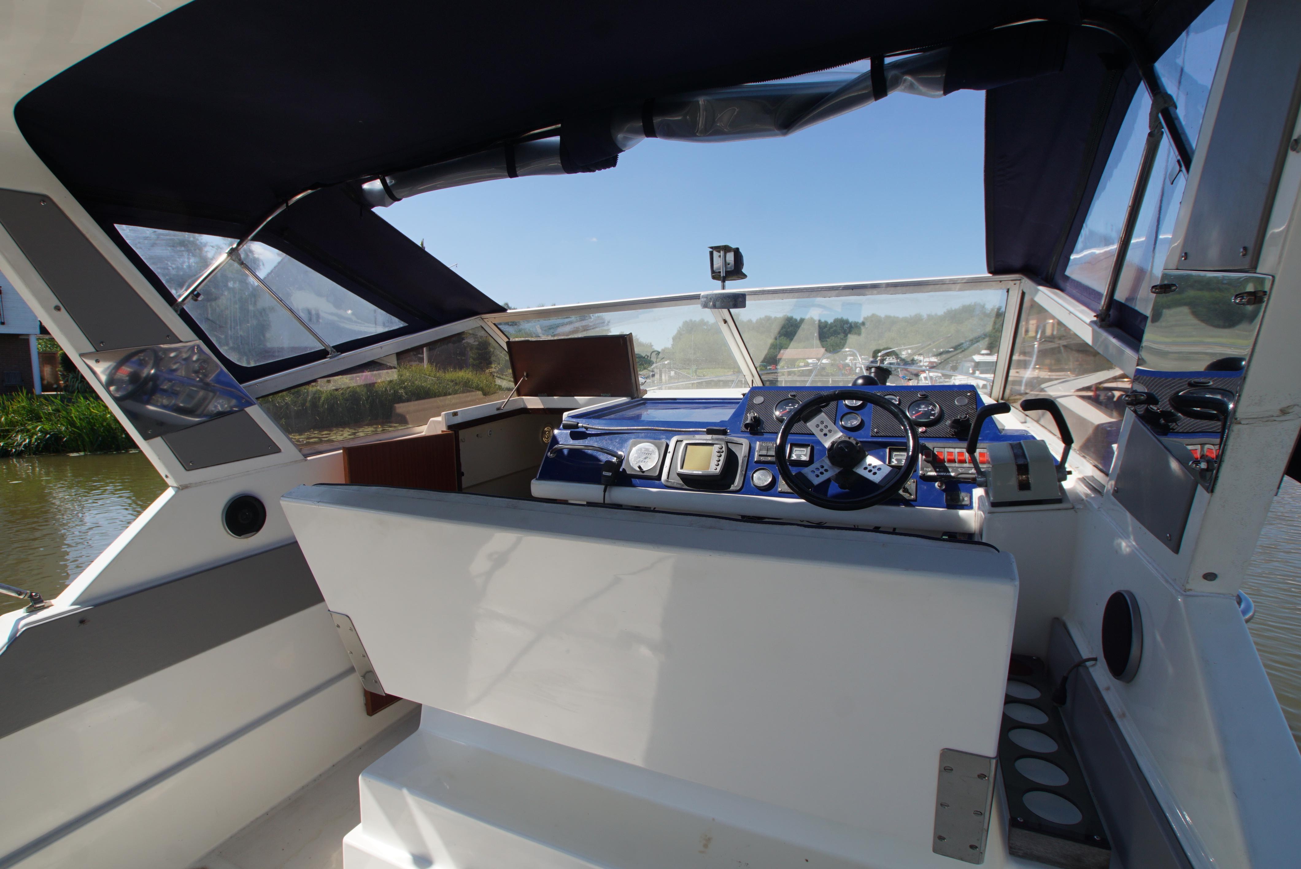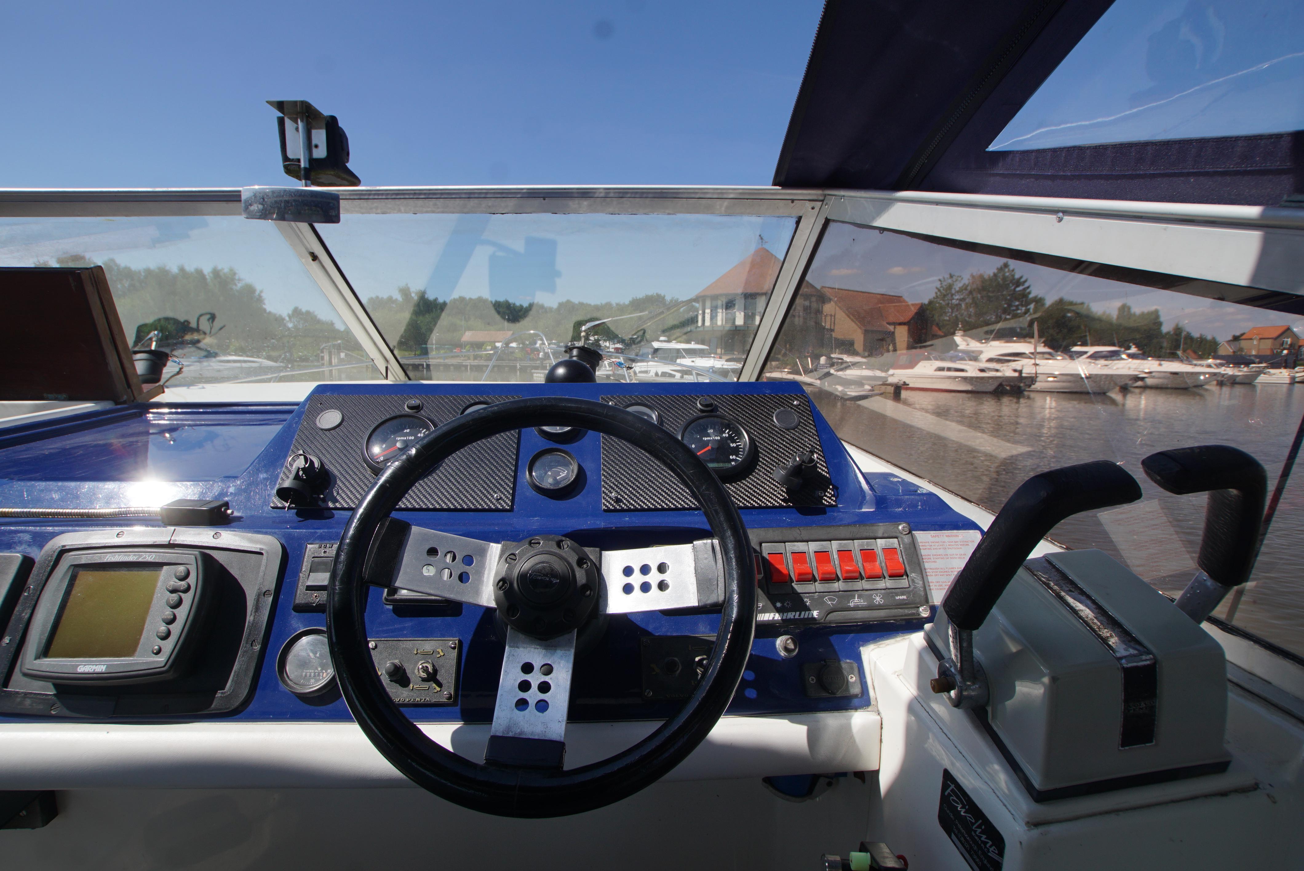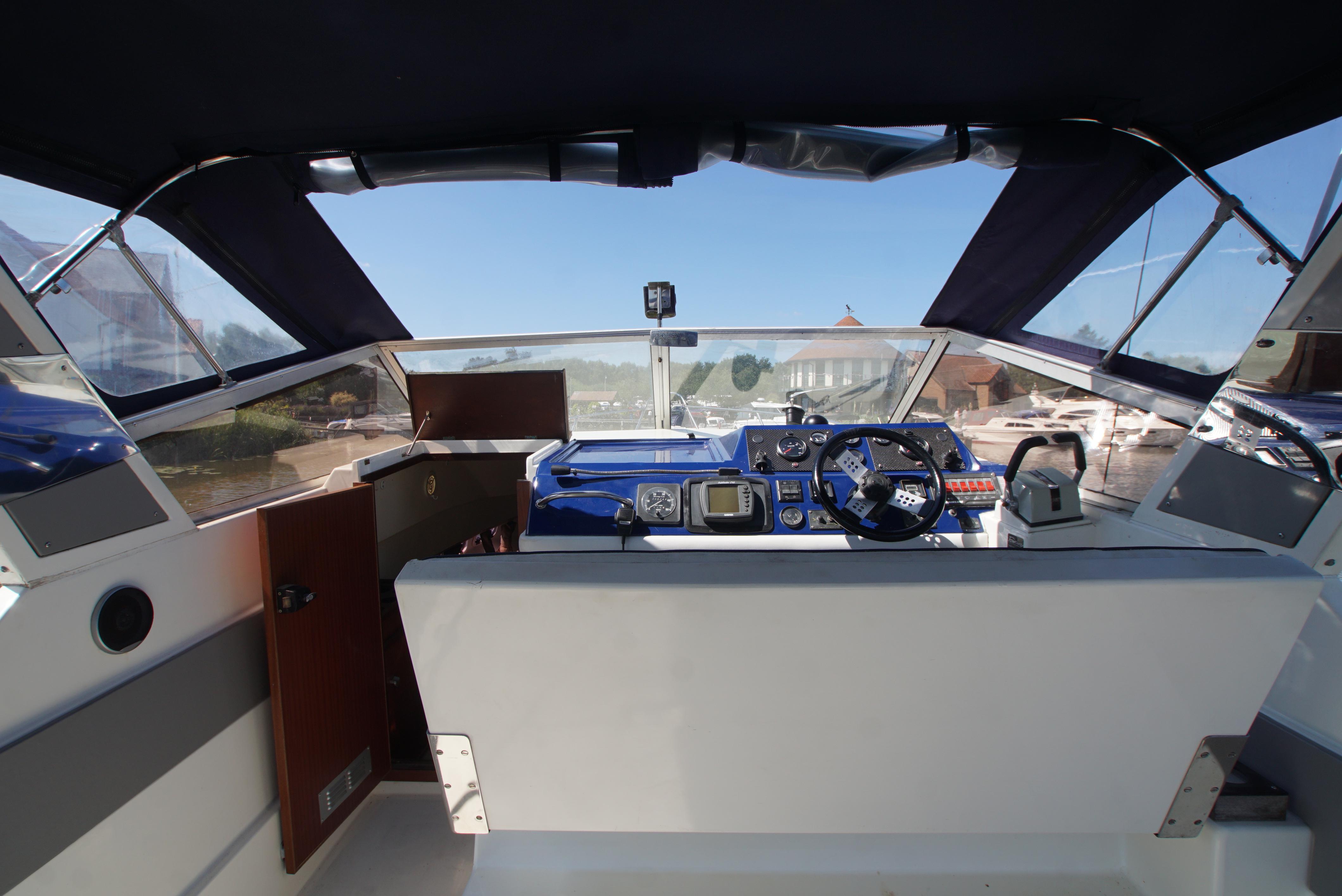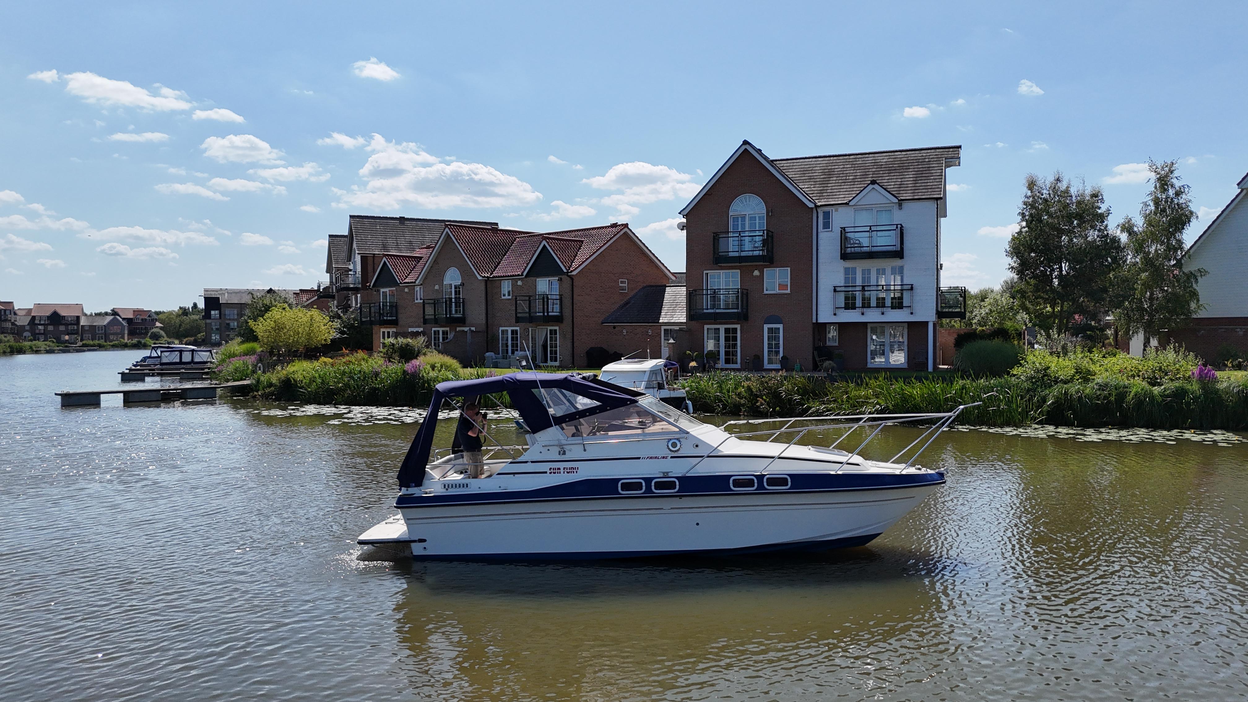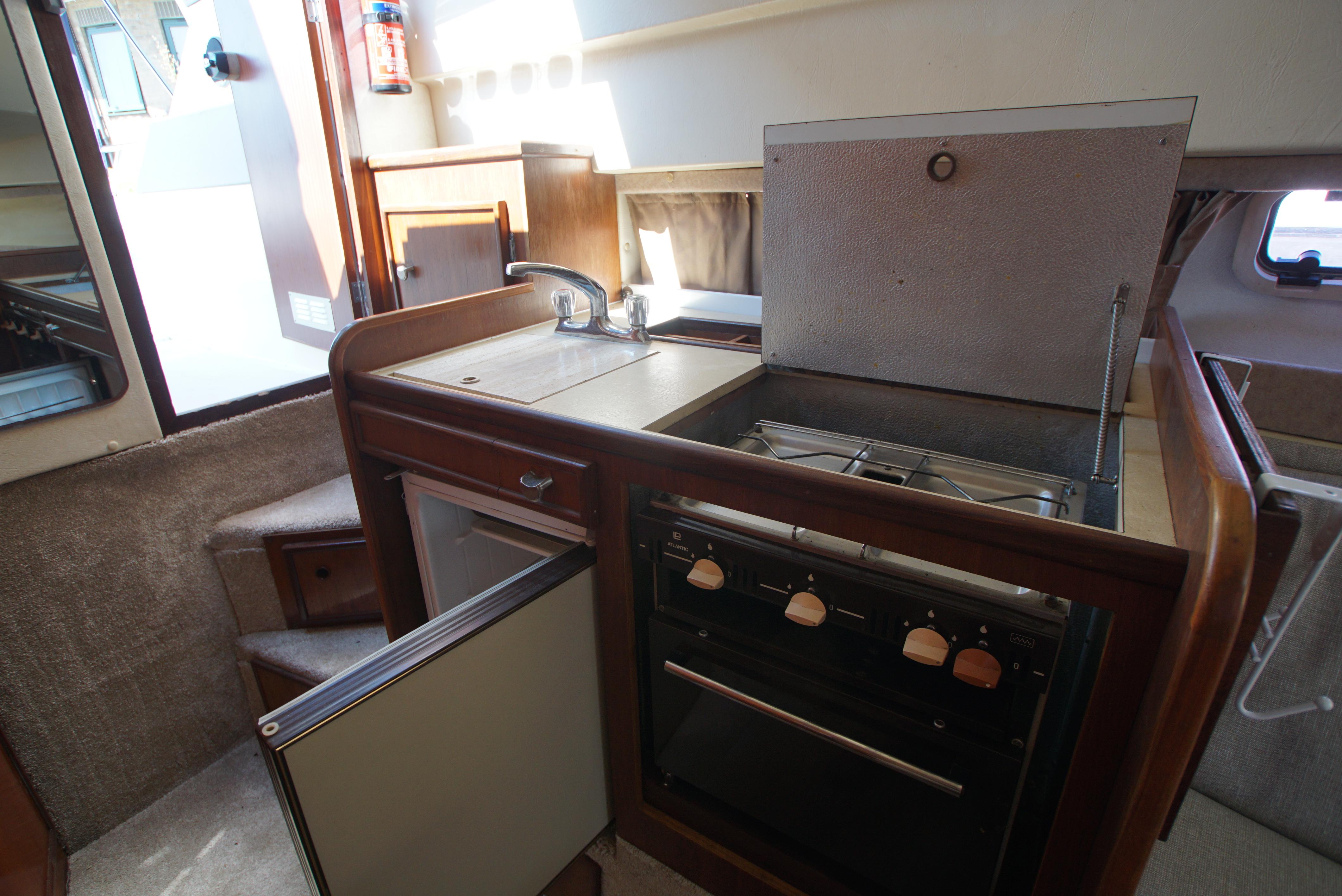 1989 Fairline Sunfury 26, with twin Diesel engines. British built sports cruiser with large cockpit area. The cockpit canopy can be completely removed to make the most of the sun or remain fully enclosed for milder days. There is a separate rear cabin with single berth or dinette conversion in the central saloon. Further Specification includes: extended bathing platform, wide side decks for access, gas hob and oven, fridge, shorepower, manual toilet, VHF radio, Garmin Fishfinder 250, FM radio and more. Recent works include new interior carpets and cushions, new canopy fitted in 2023. Lying at our Burton Waters branch in Lincoln, has a current Boat Safety certificate. Viewing by appointment only. Call us on 01522 567404.