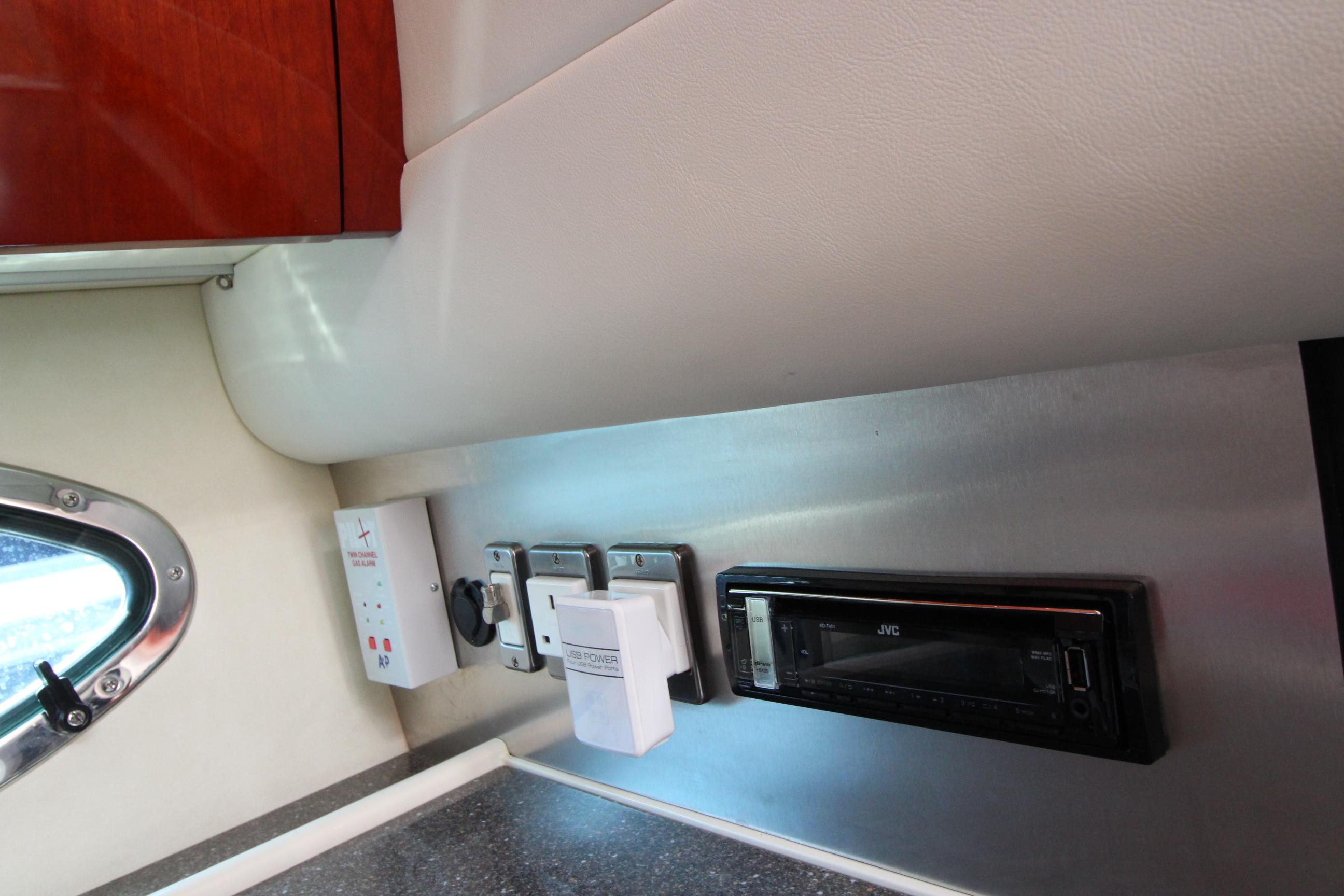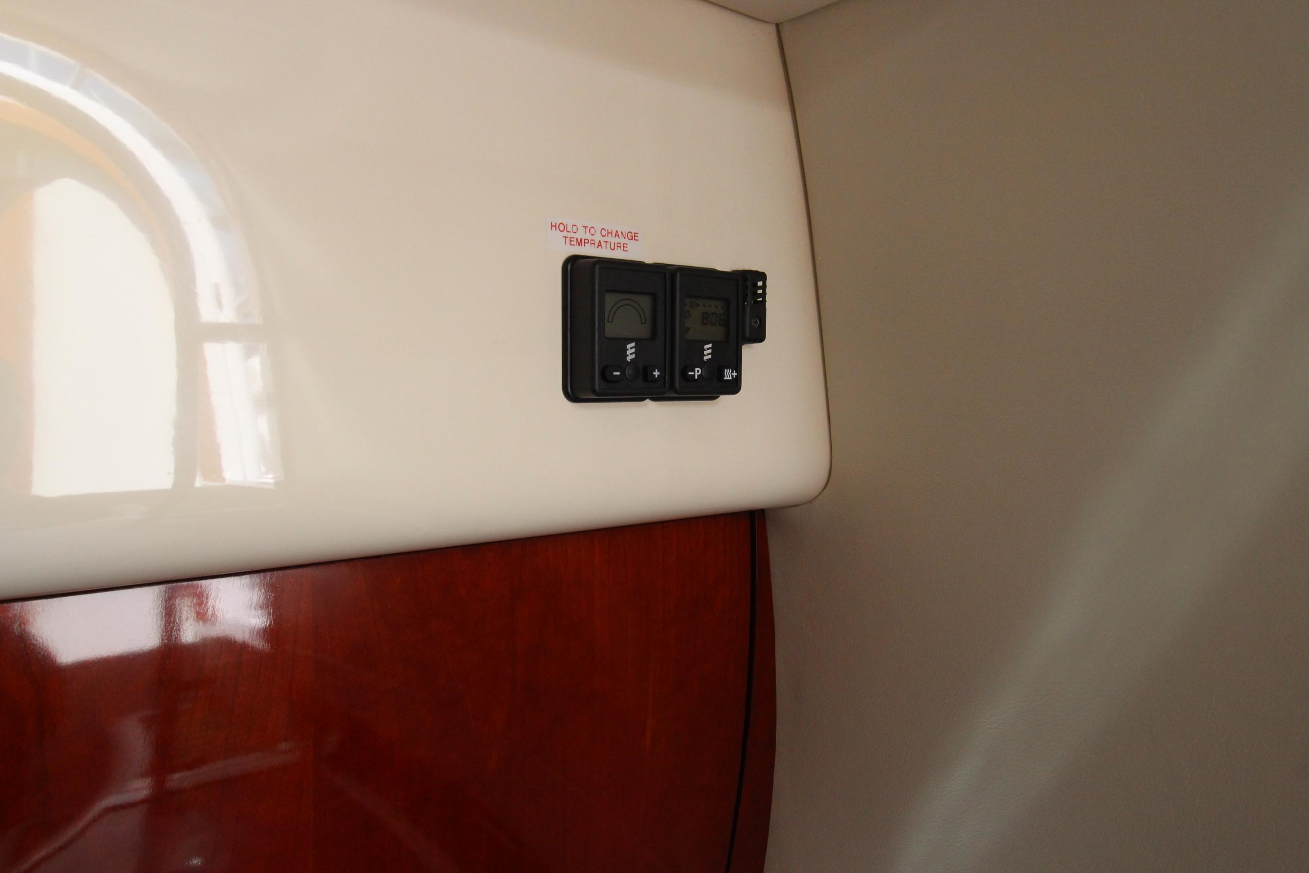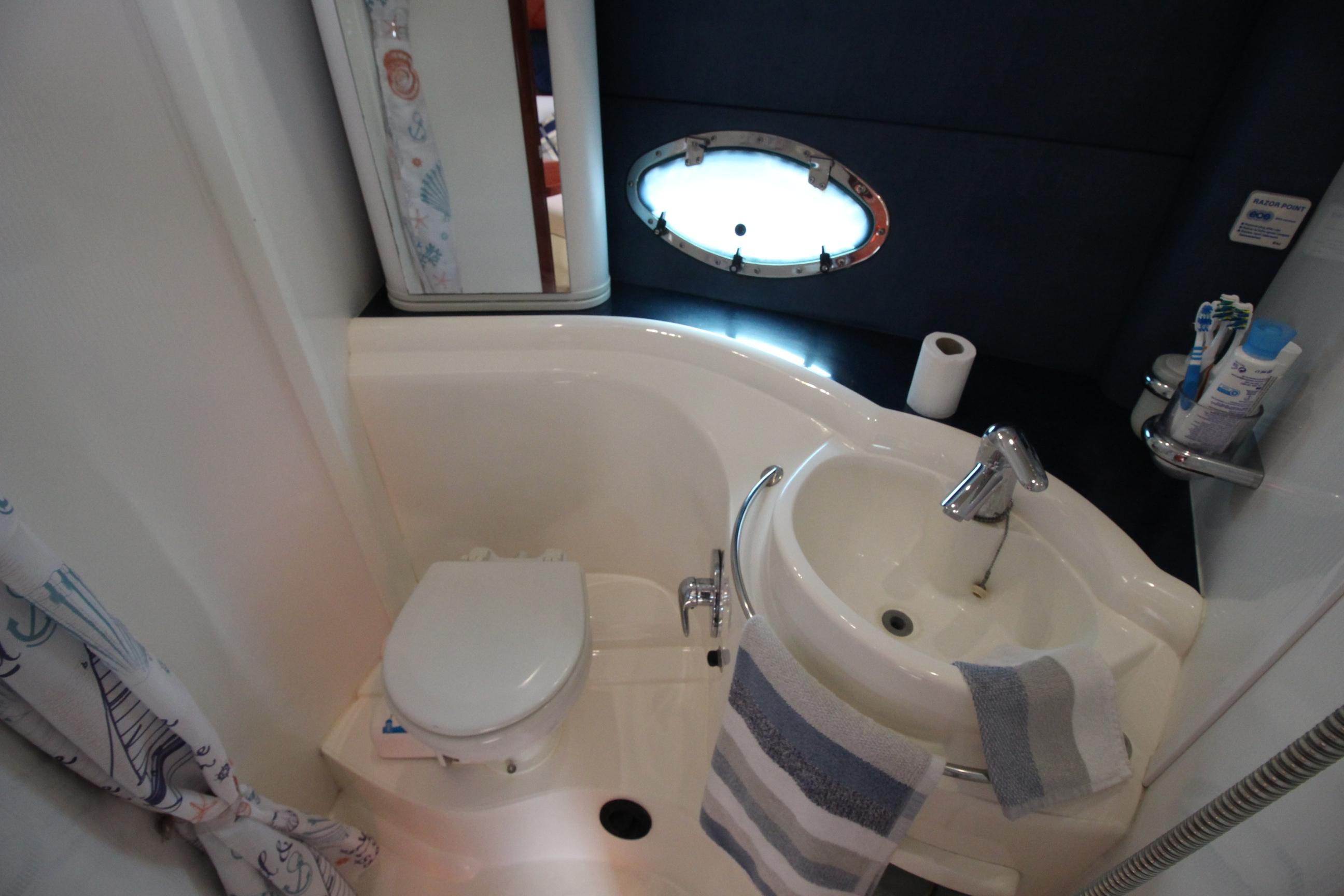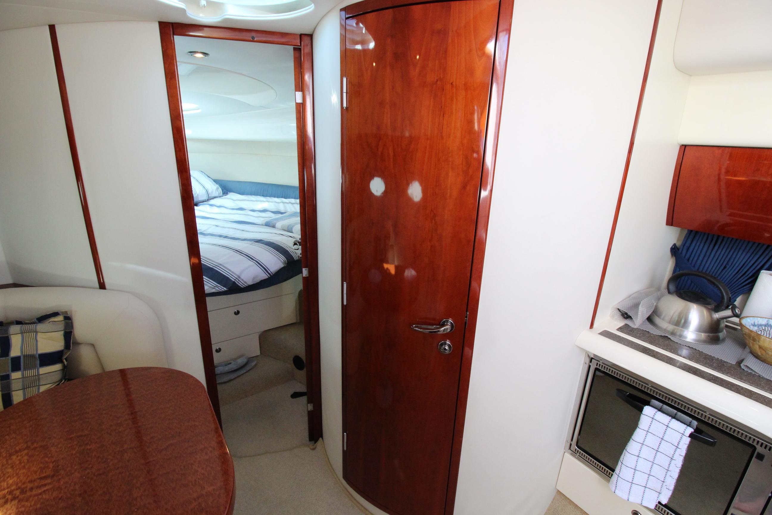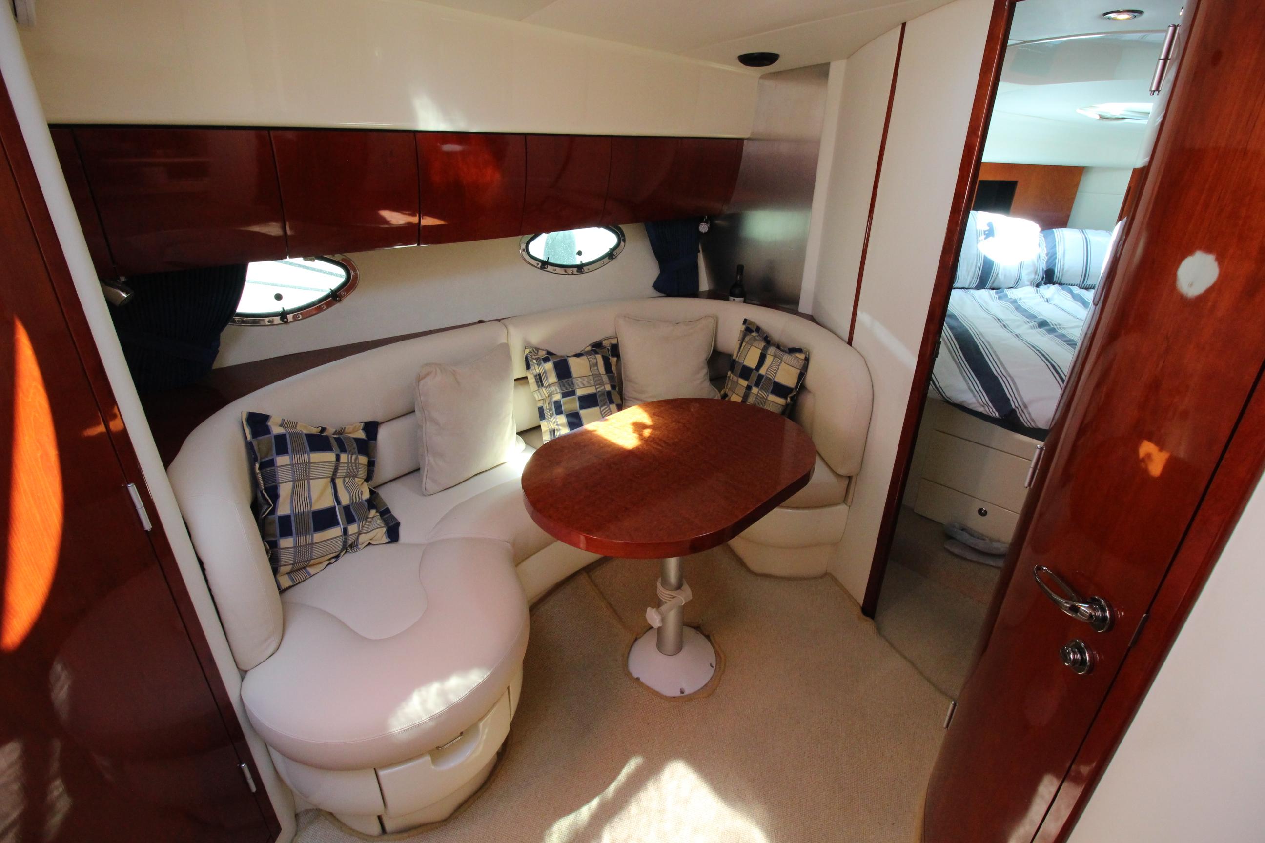 U-shaped open-plan saloon with settee (upholstered in cream leather) that converts to a double berth as required. Saloon table and joinery in American cherry wood