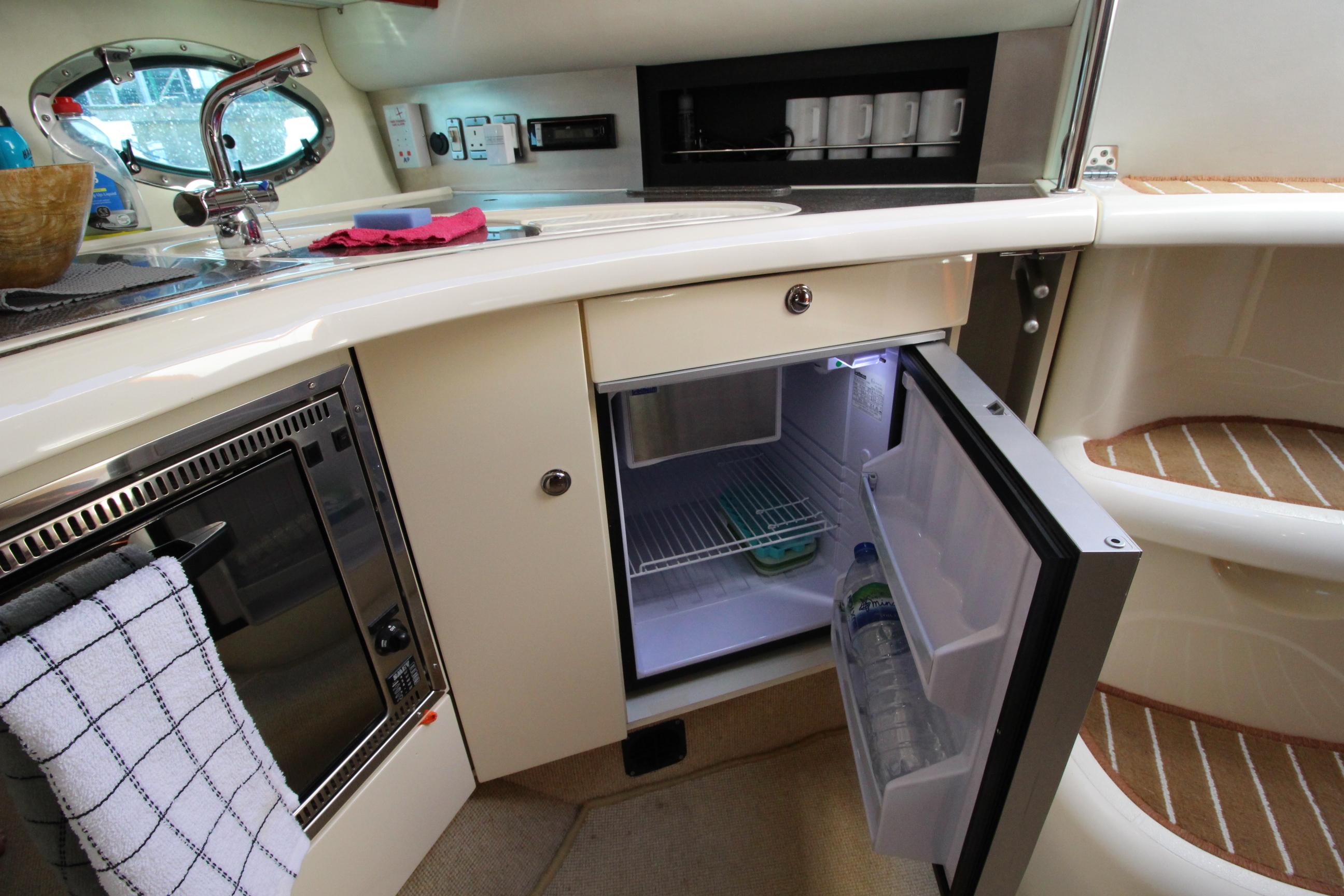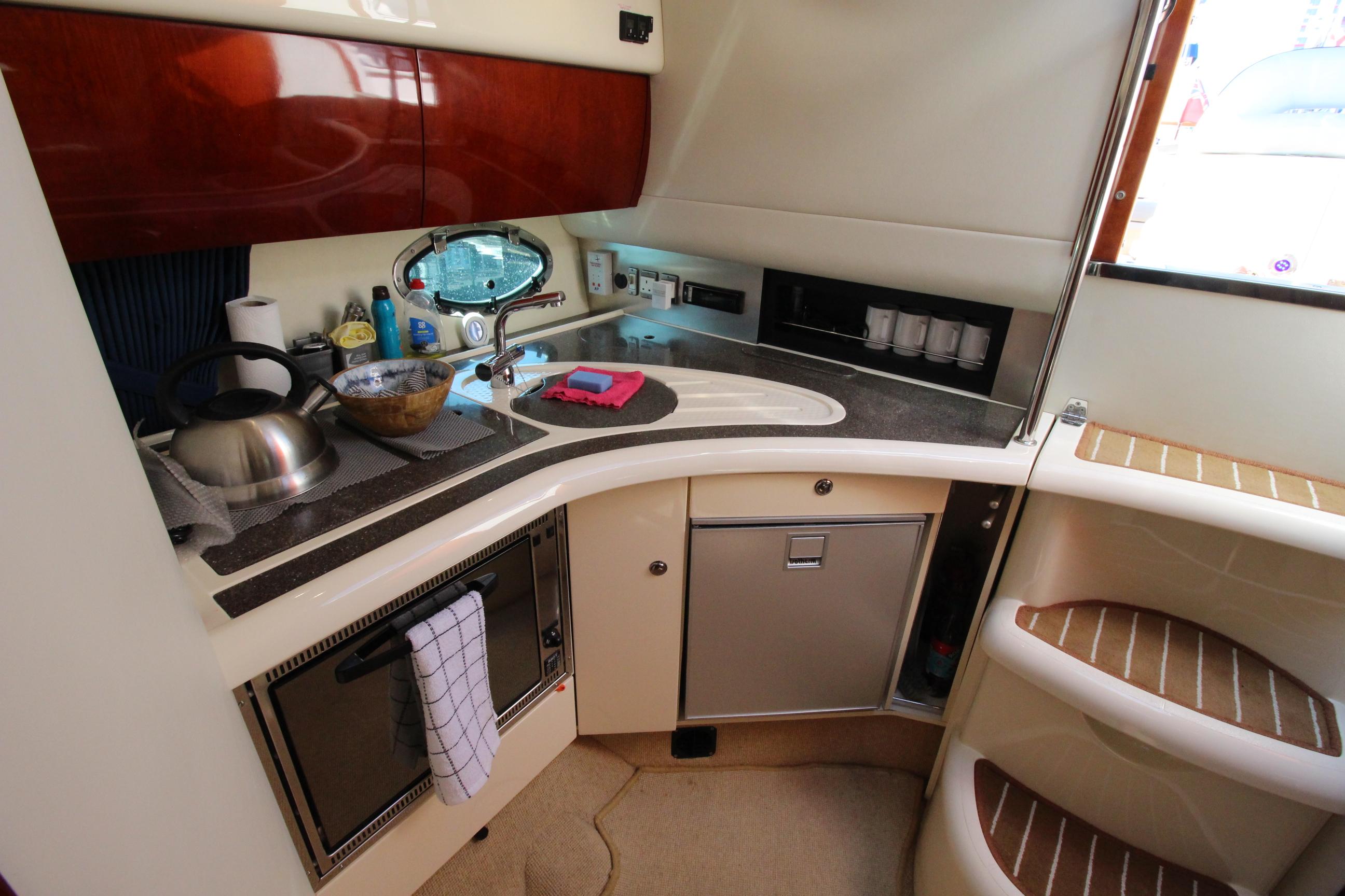 Well-equipped galley area with twin gas burner and oven with grill, stainless steel sink, fridge
