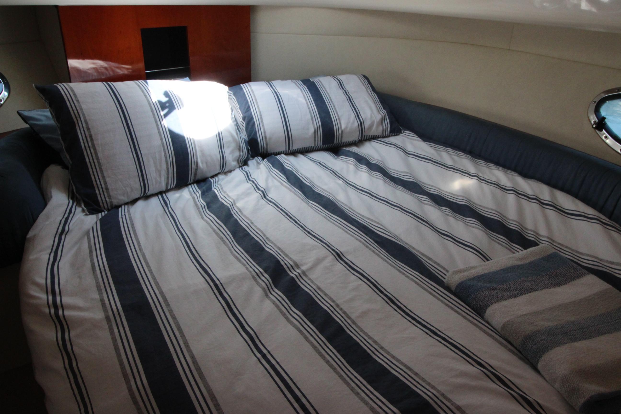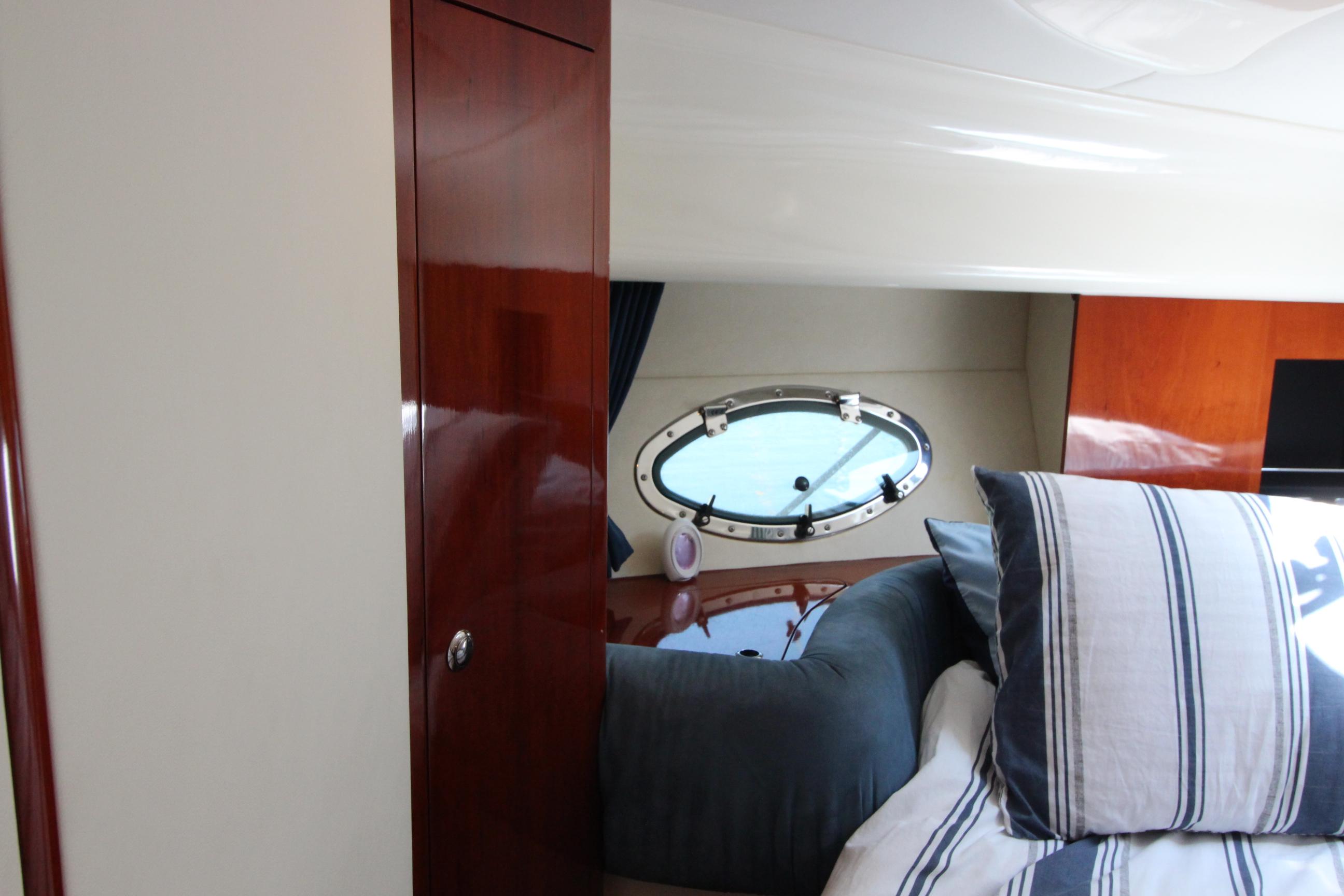Large offset double berth with drawer underneath, storage lockers and hanging space