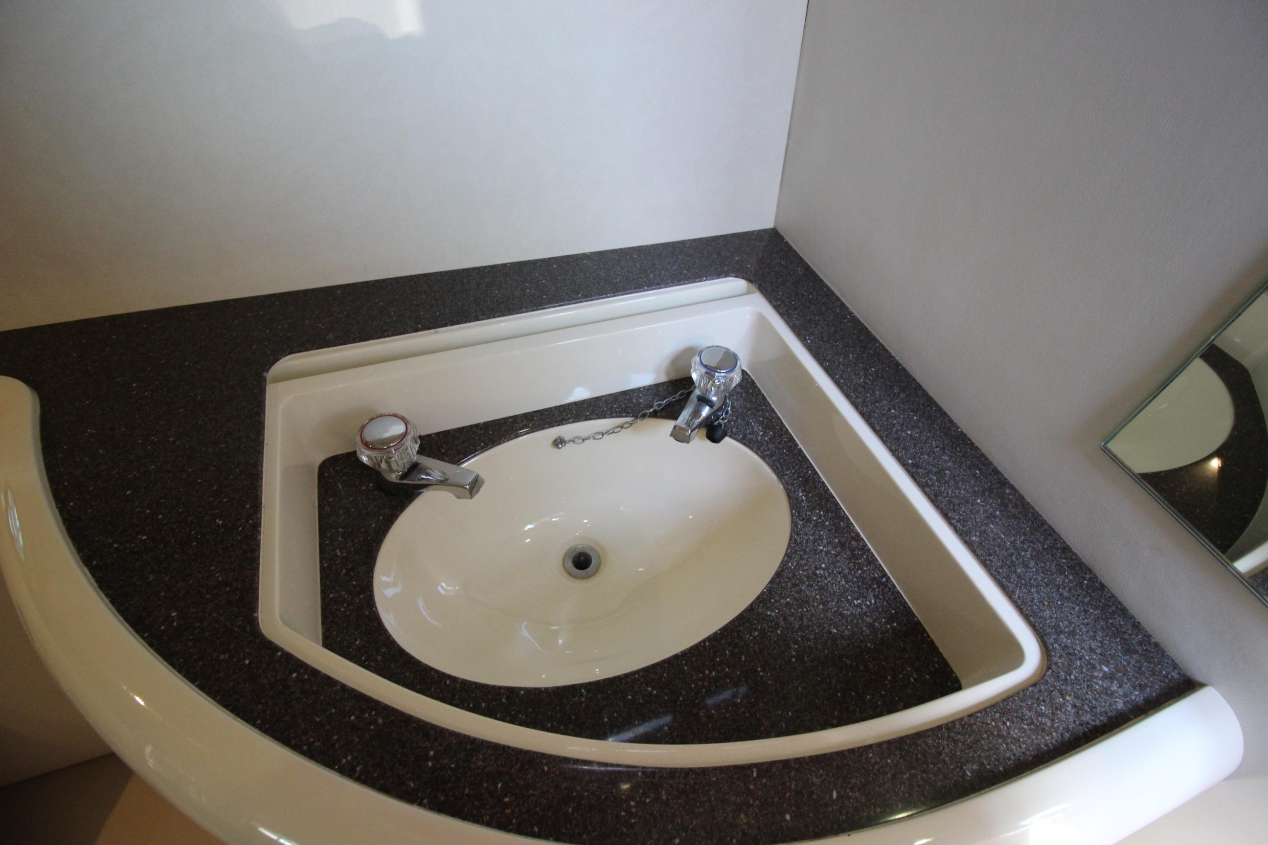 Good sized twin beds that can convert to a double as and when required, small settee (upholstered in cream leather), storage with additional wash basin plus TV