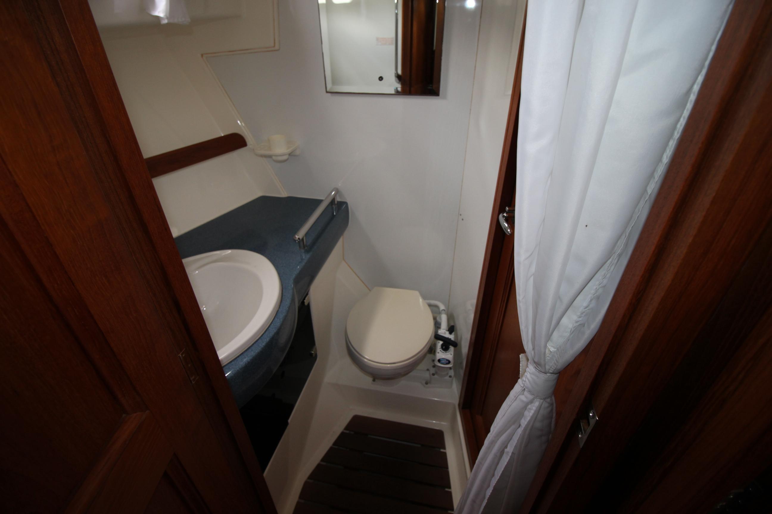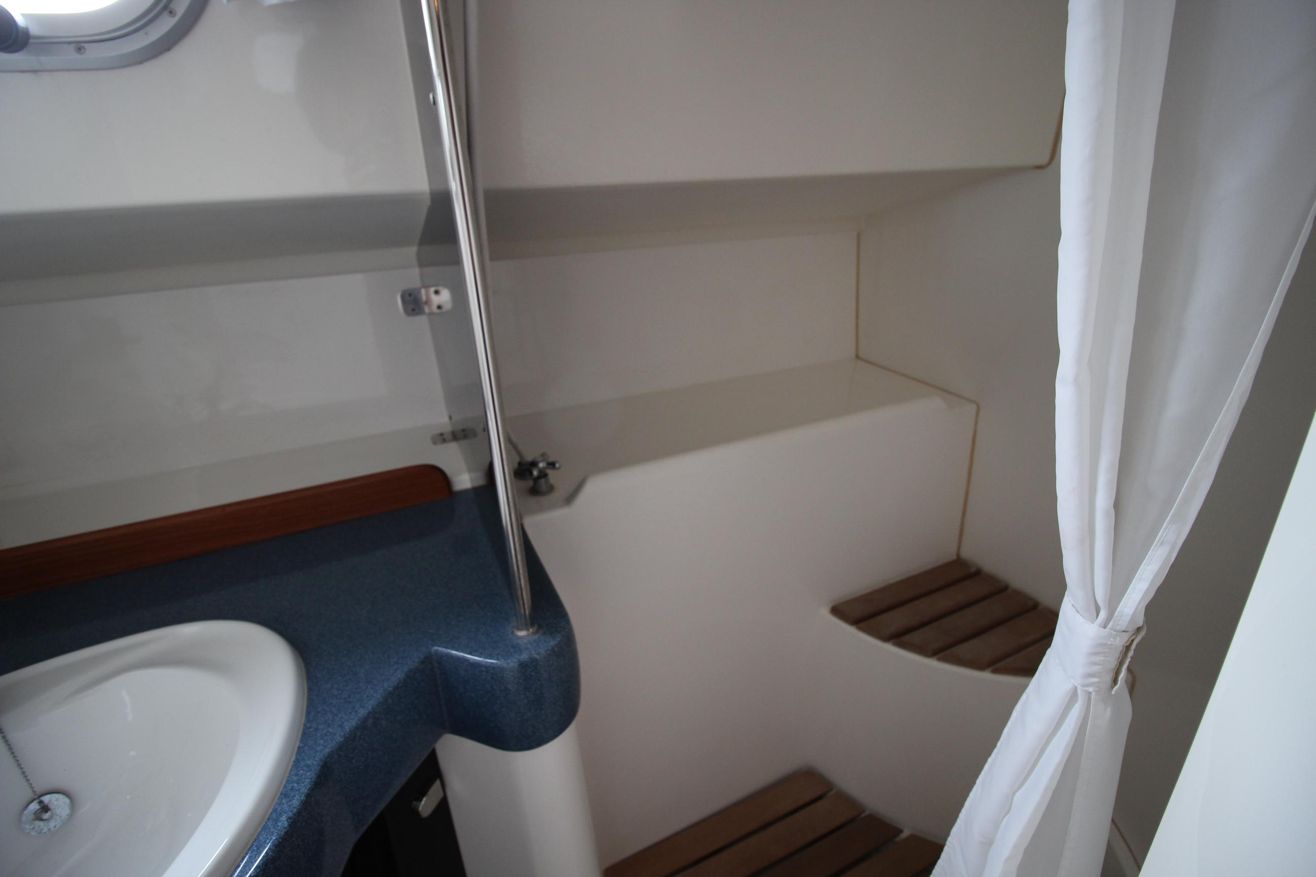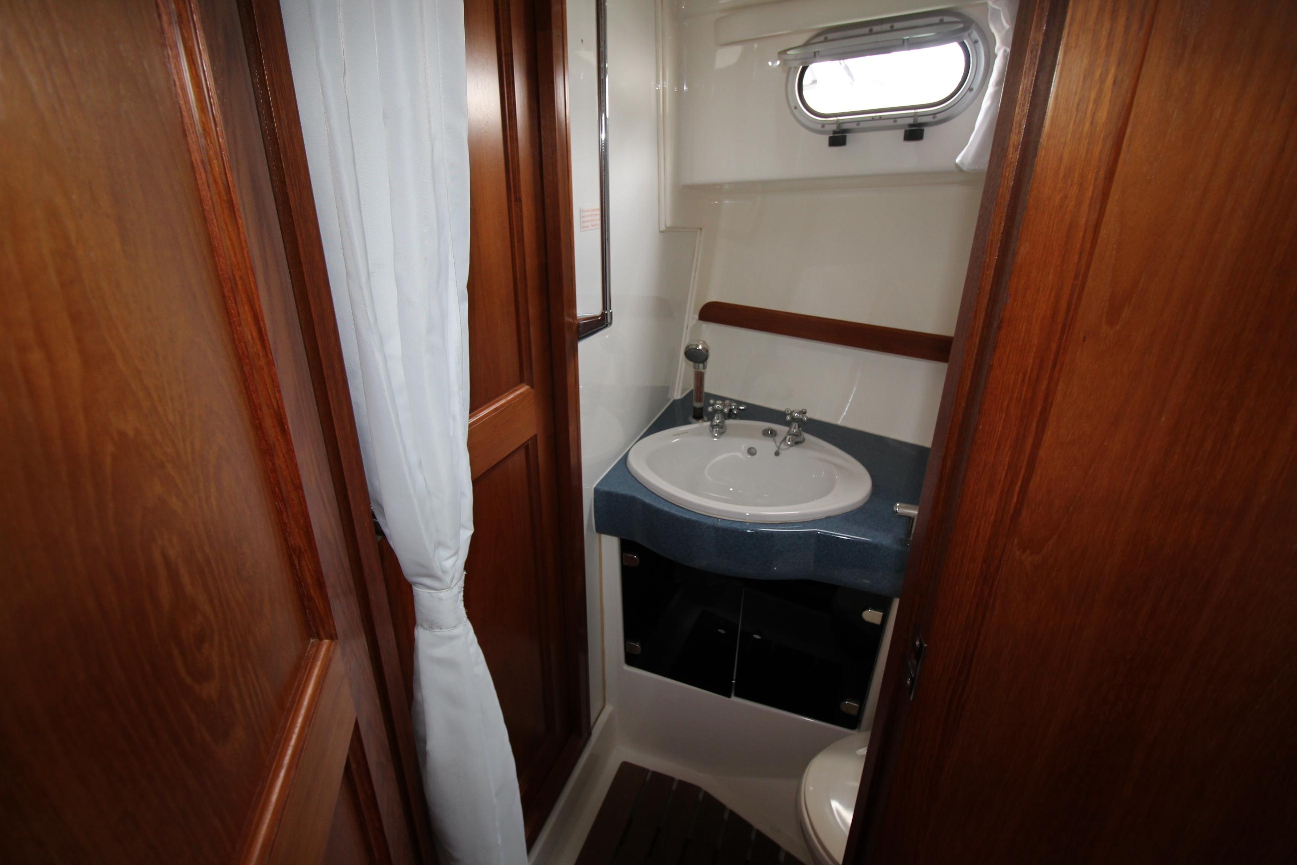 En suite heads with basin inset in vanity unit, marine toilet with macerator and shower