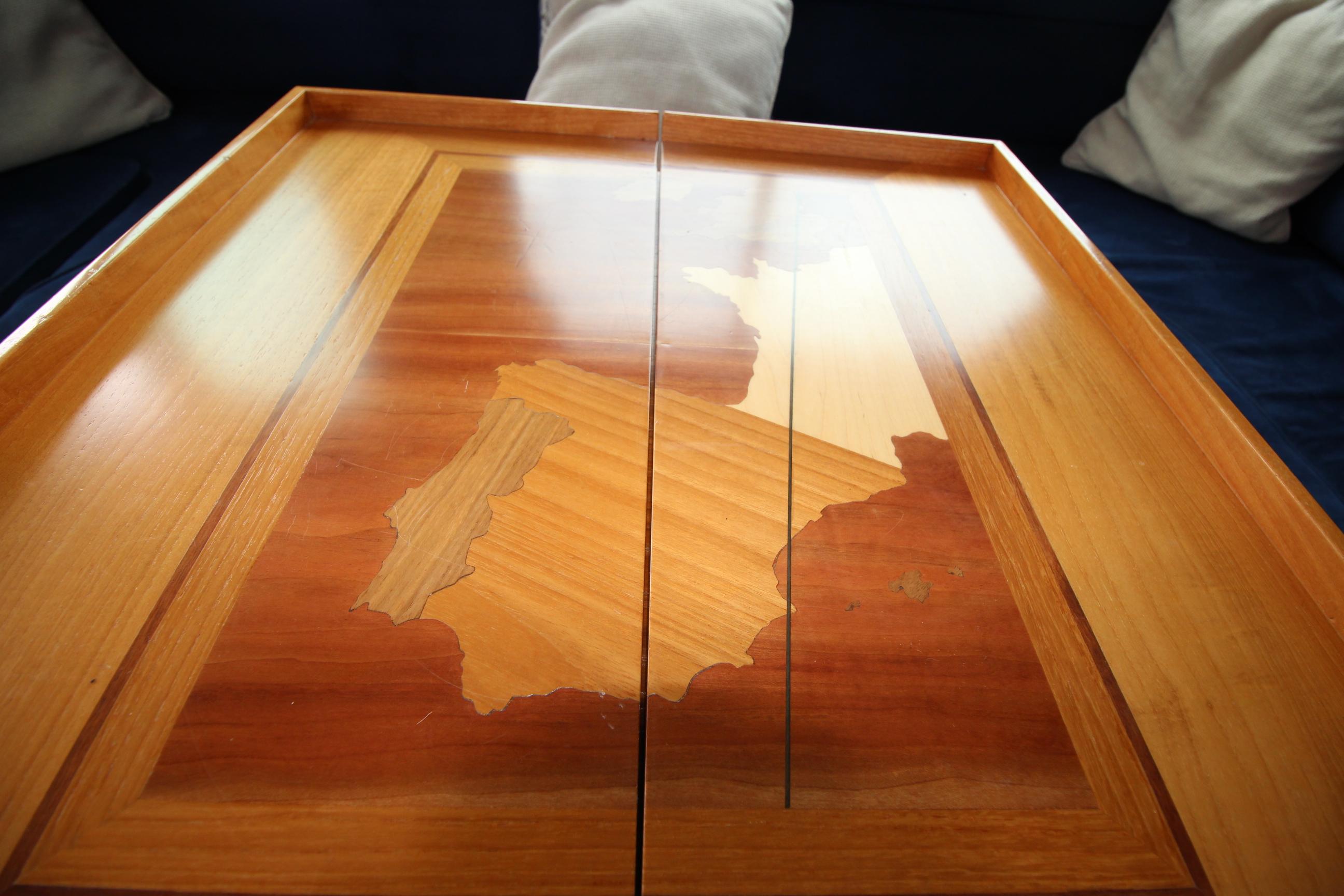 Teak interior joinery – free standing coffee table with floor access hatch to engine room
