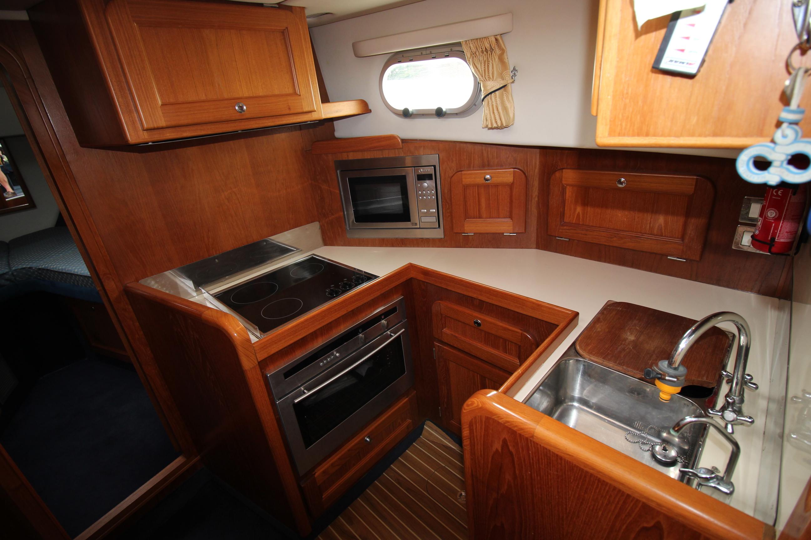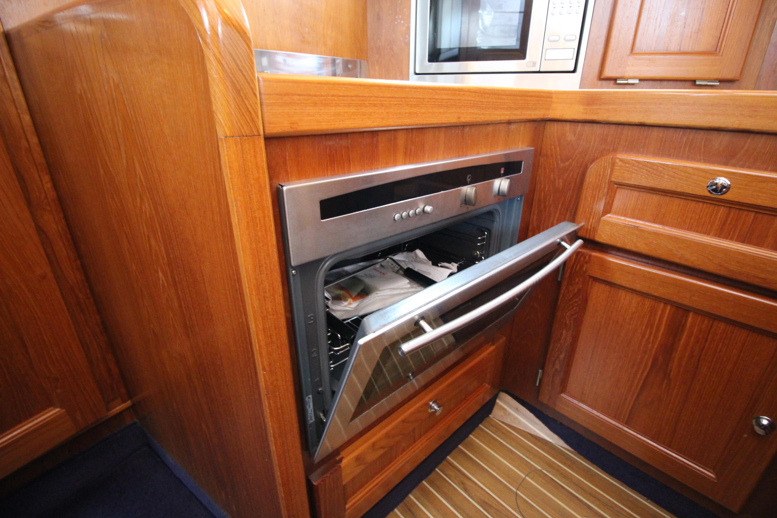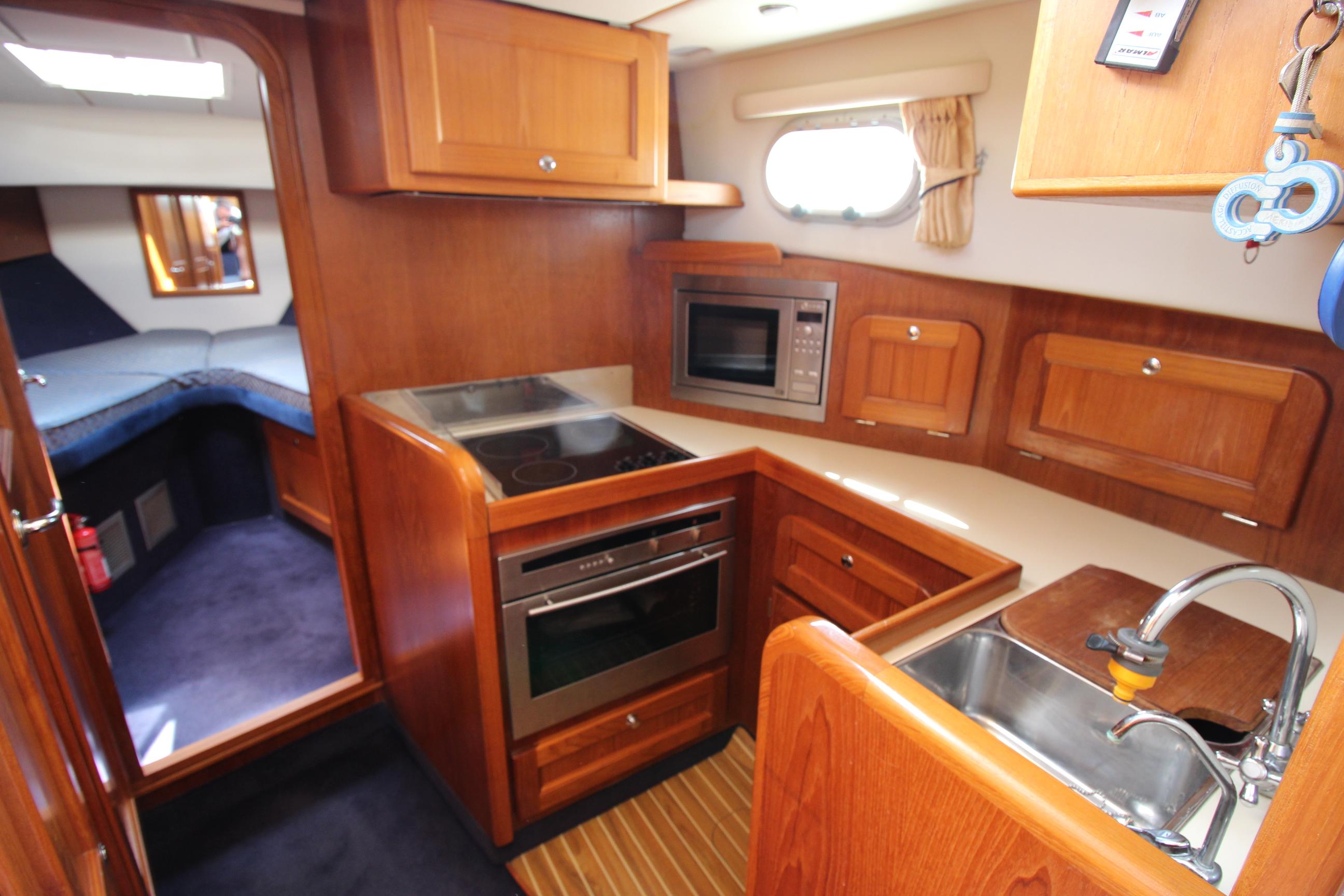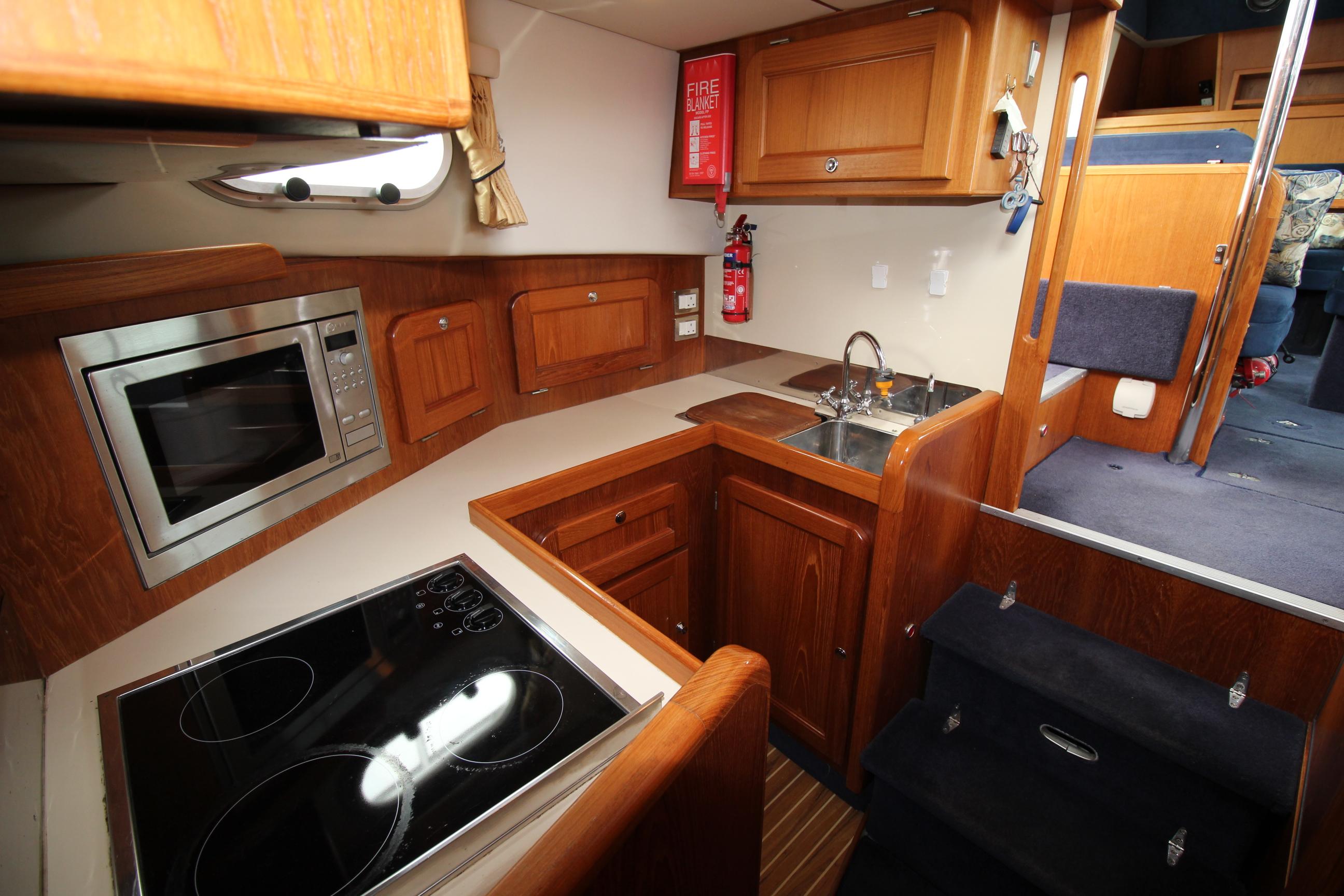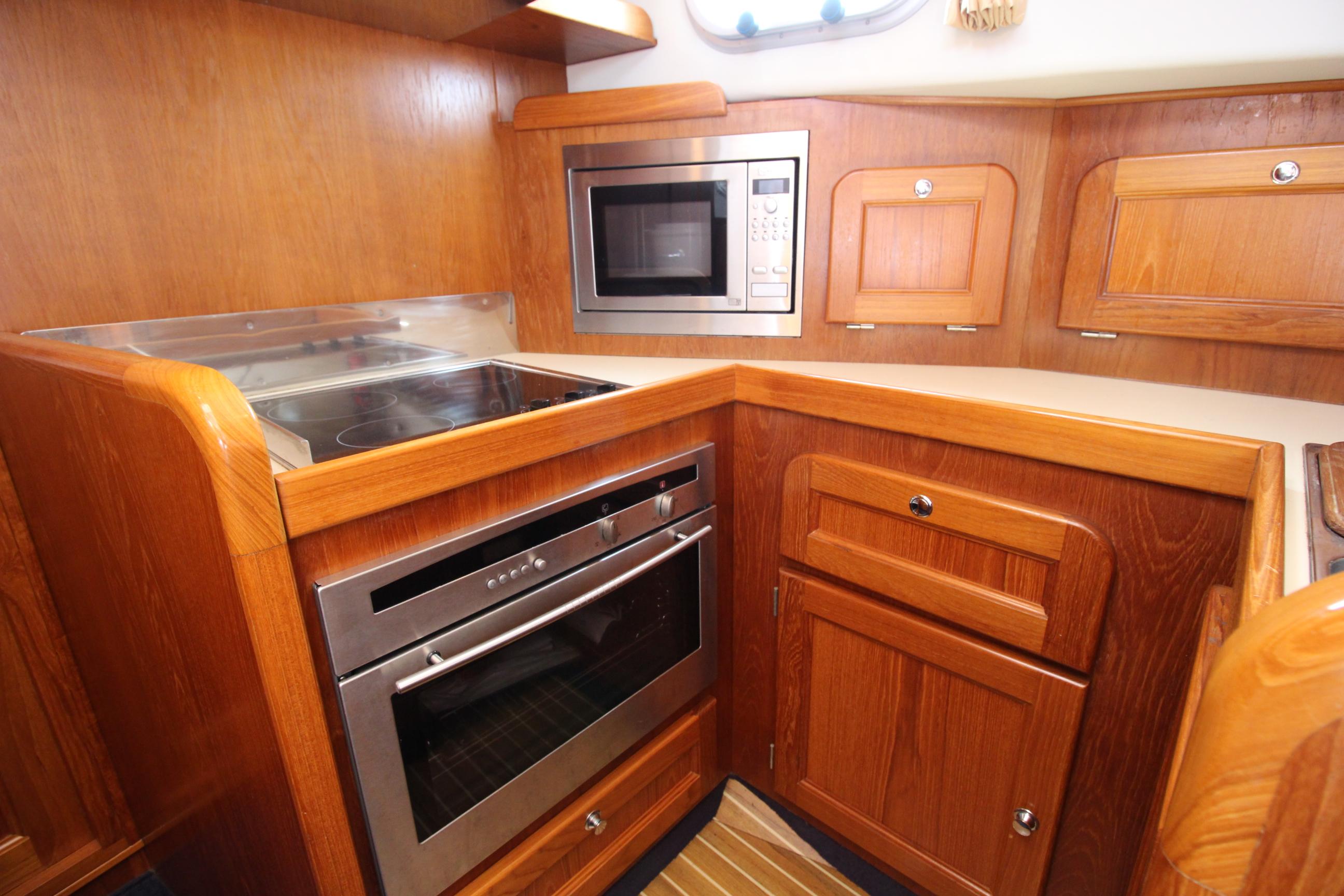 Electric cooker with oven and hob, electric fridge upper deck cold chests, Lockers in fore and aft cabins with fitted shelving