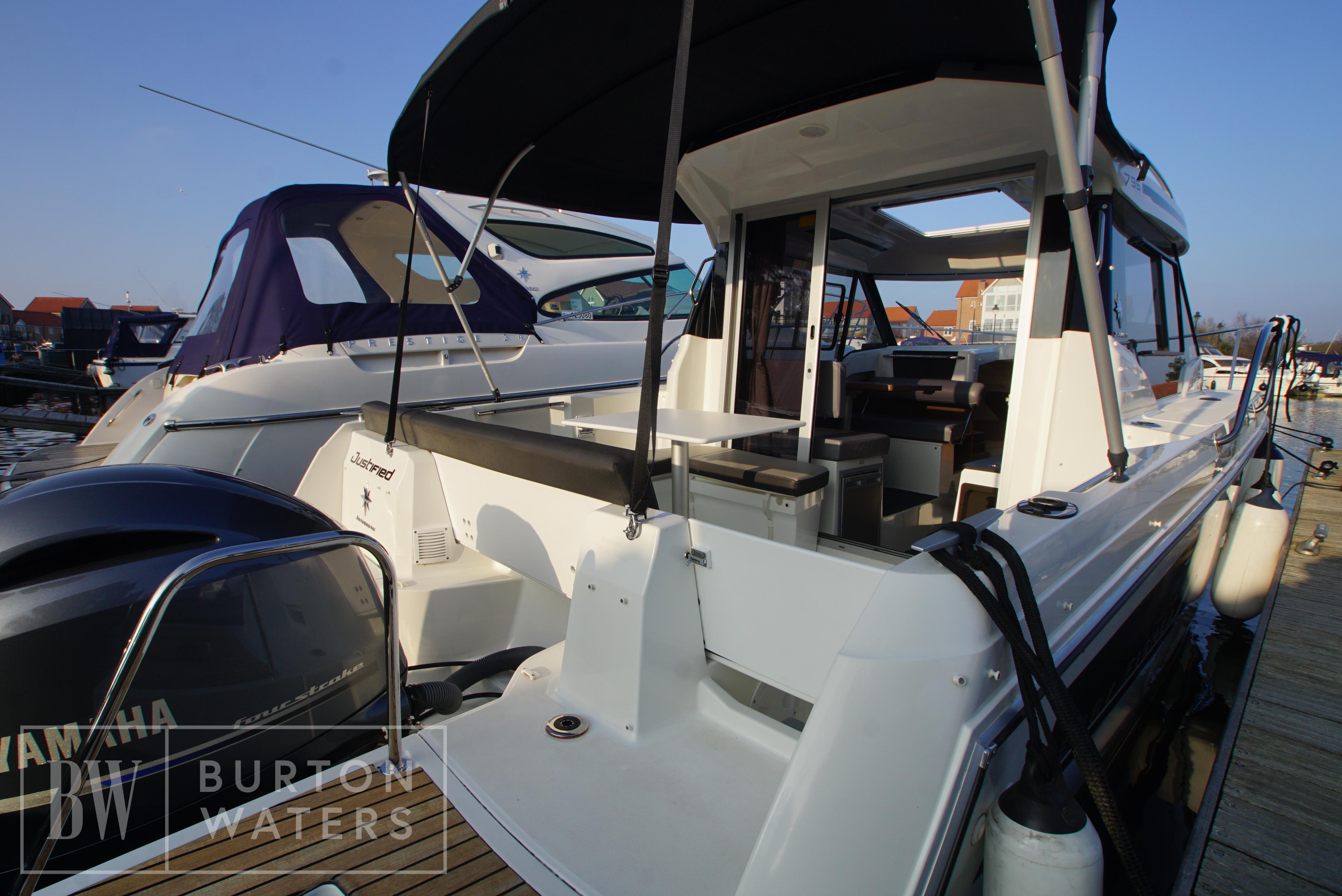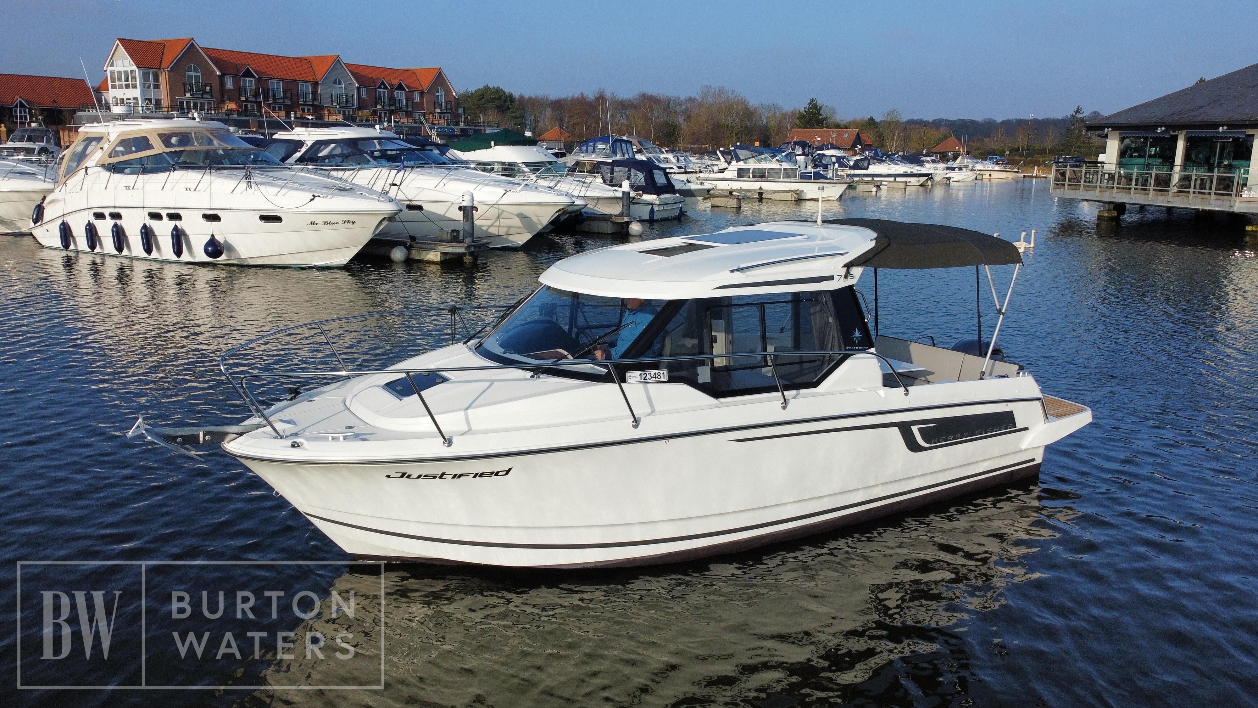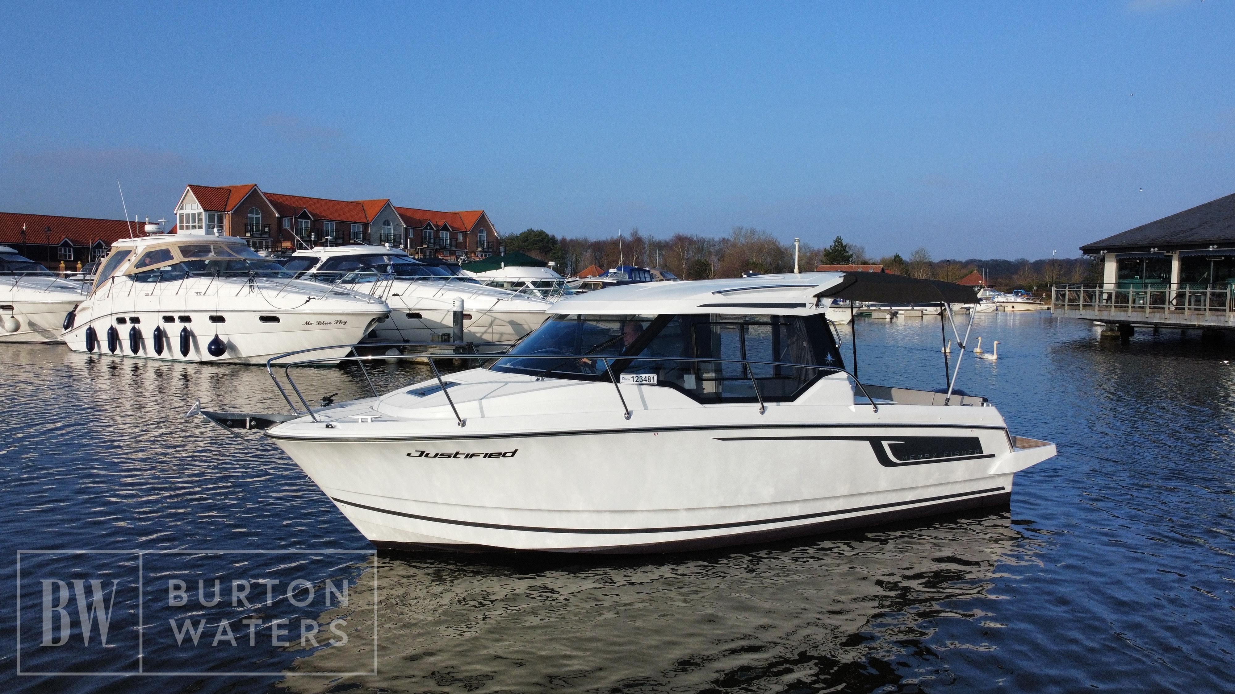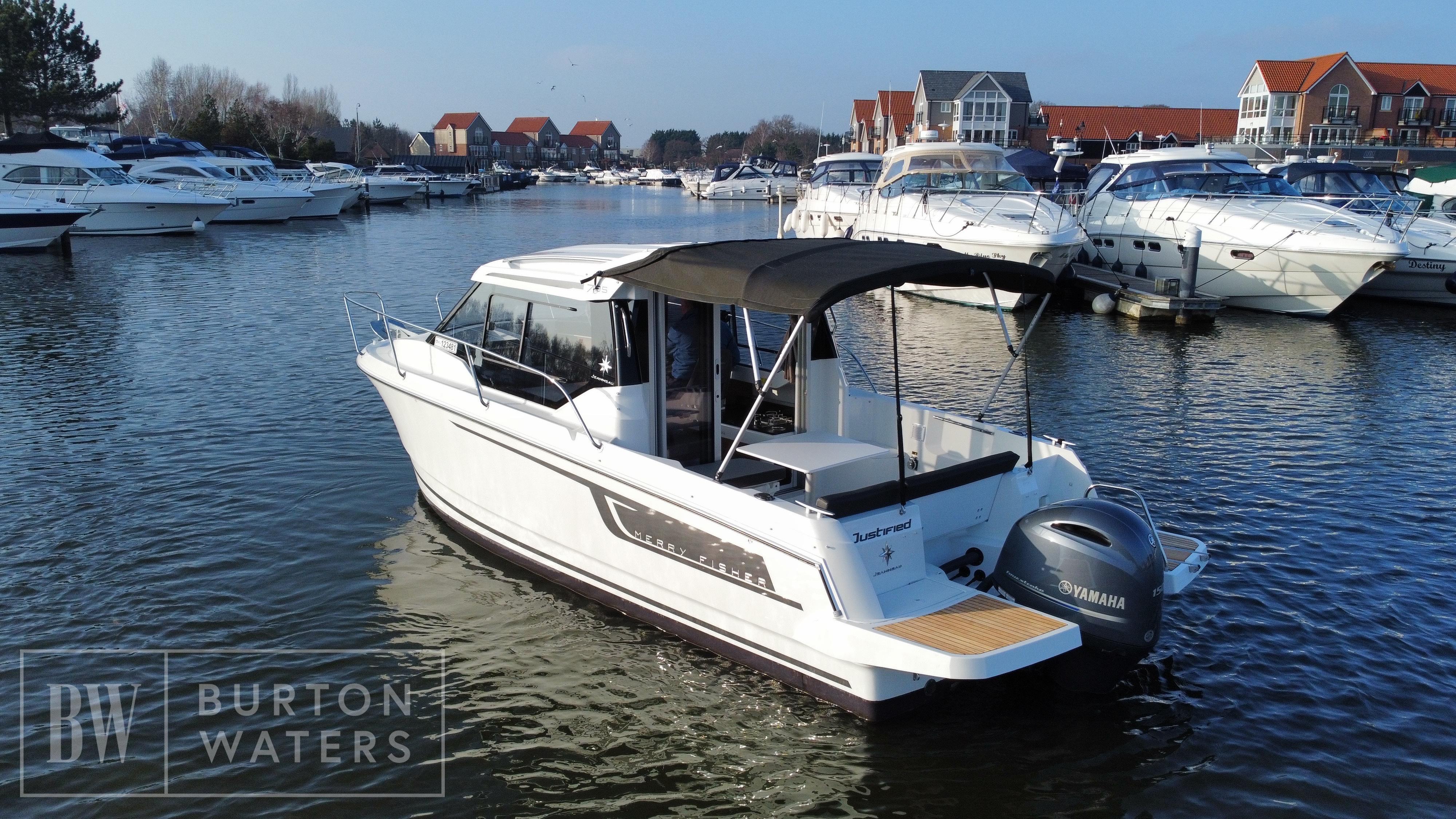 Jeanneau Merry Fisher 795, 2019 build and model year, equipped with a single Yamaha 150 hp outboard with only 130 hours completed. ‘Justified’ is presented in excellent condition and boasts a huge specification which includes: trim level Premier Pack*, electric windlass, U-shape cockpit saloon sundeck, cockpit sun awning and enclosure, teak bathing platforms, bow & stern thrusters on a remote, Webasto diesel heating with cockpit outlet, Fusion audio system, luxury galley, 40L Waeco fridge, marine toilet to holding tank, Garmin touchscreen plotter, carpets and more. This ever-popular model has had two owners from new and supplied each time by Burton Waters. Boat Safety Certificate valid until August 2027 so ready to cruise the inland or coastal waters. Available to view 7 days a week at Burton Waters in Lincoln. A recent SBS 3500 roller trailer is available with the boat by separate negotiation.