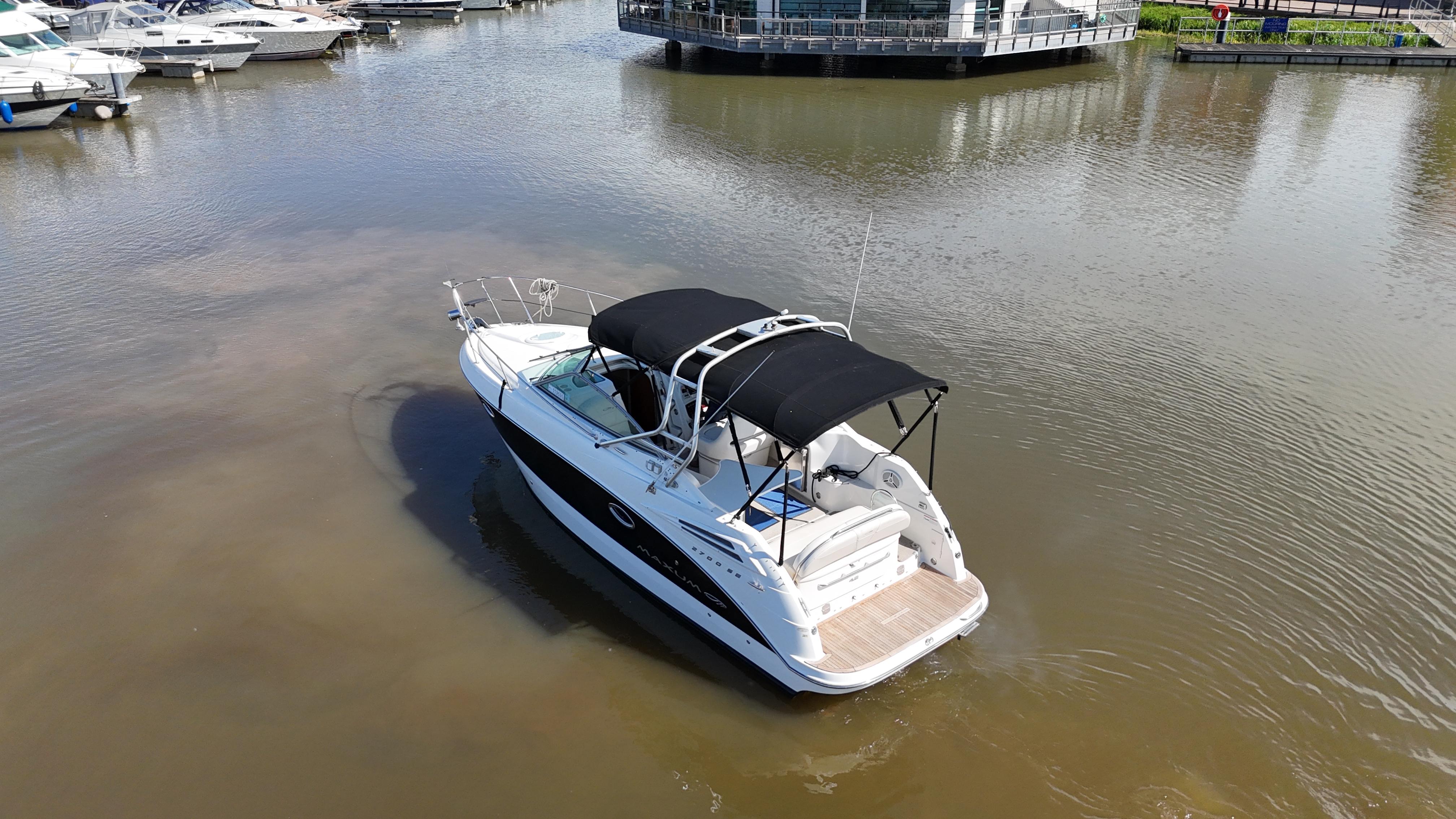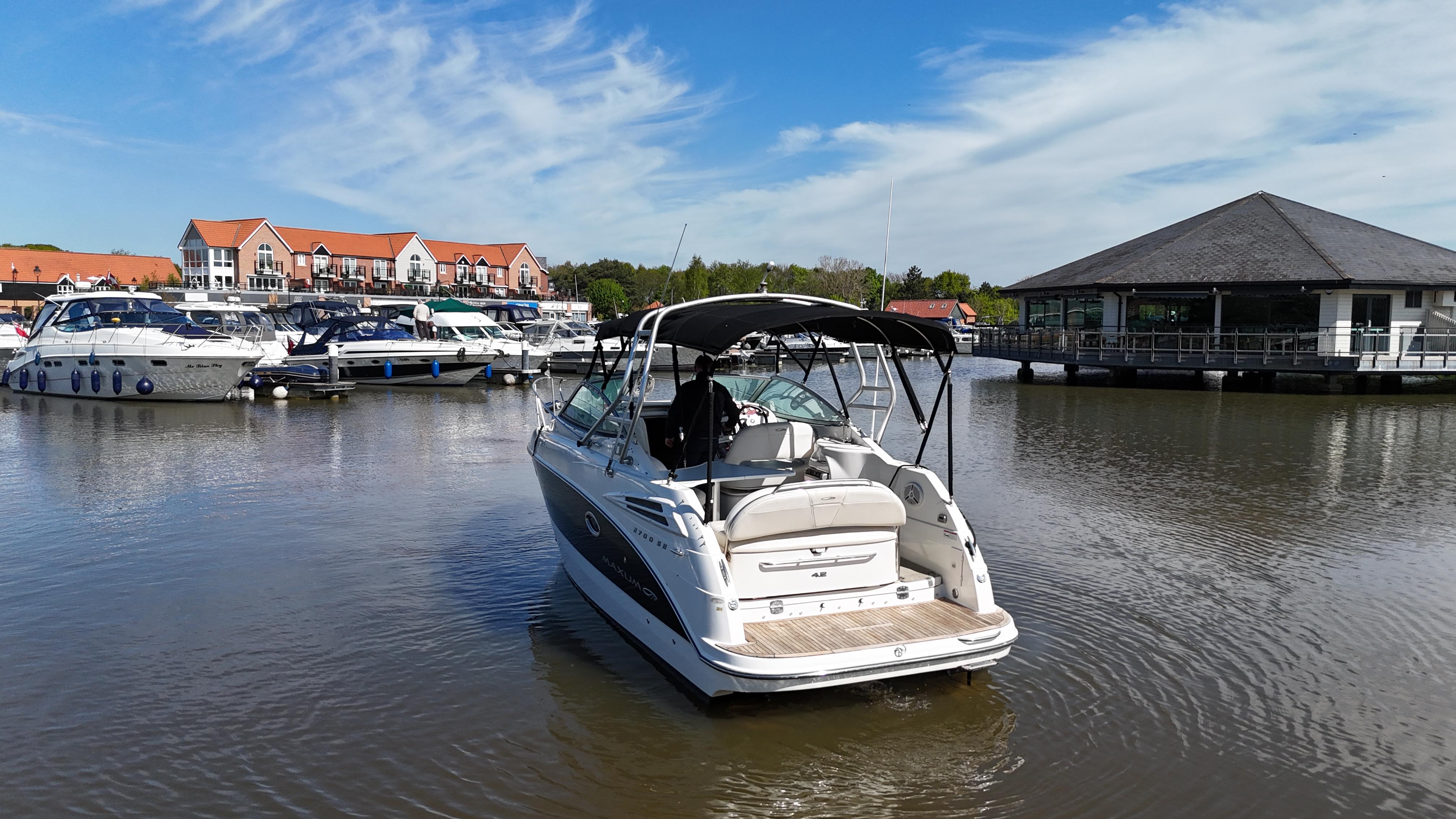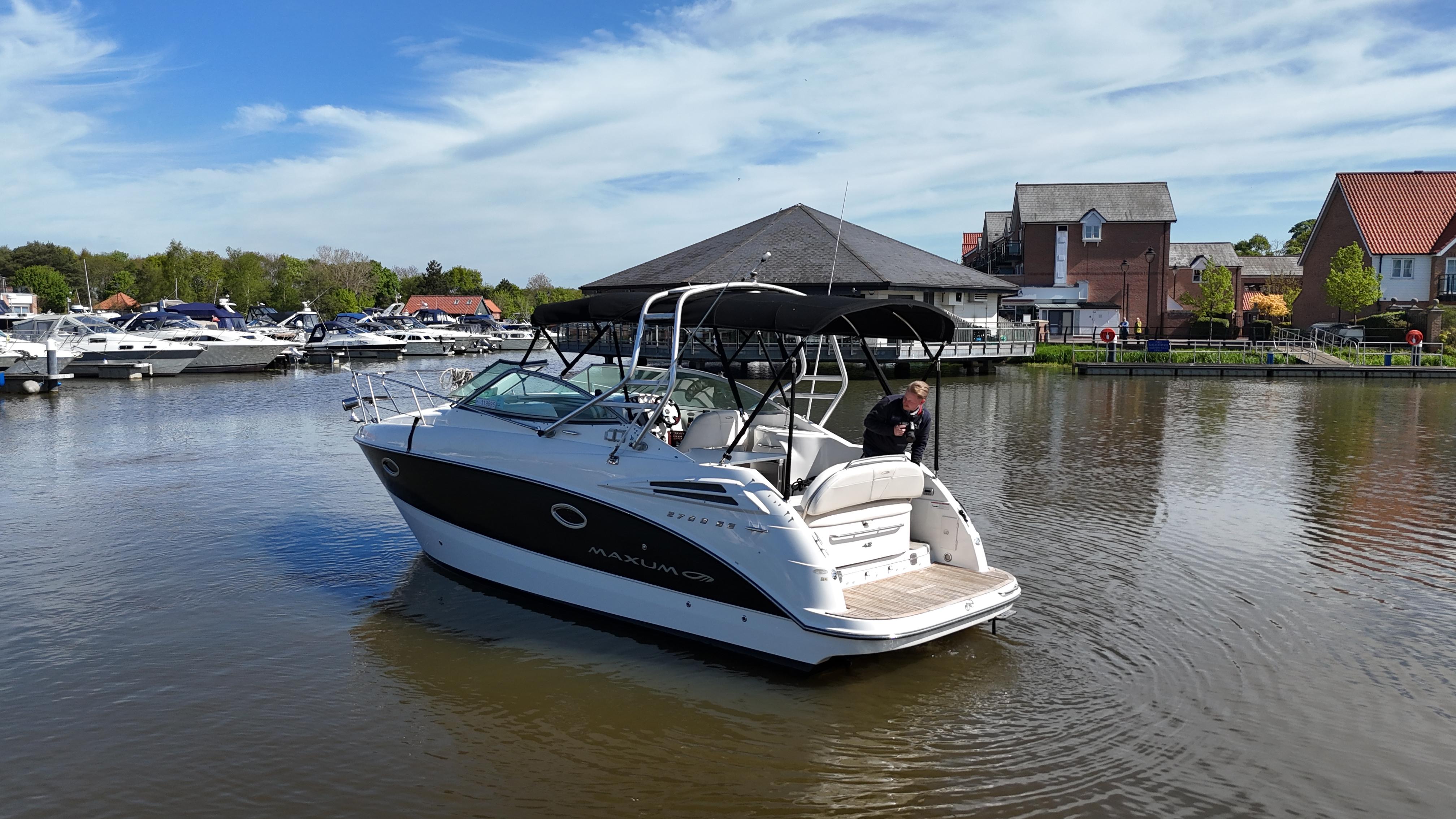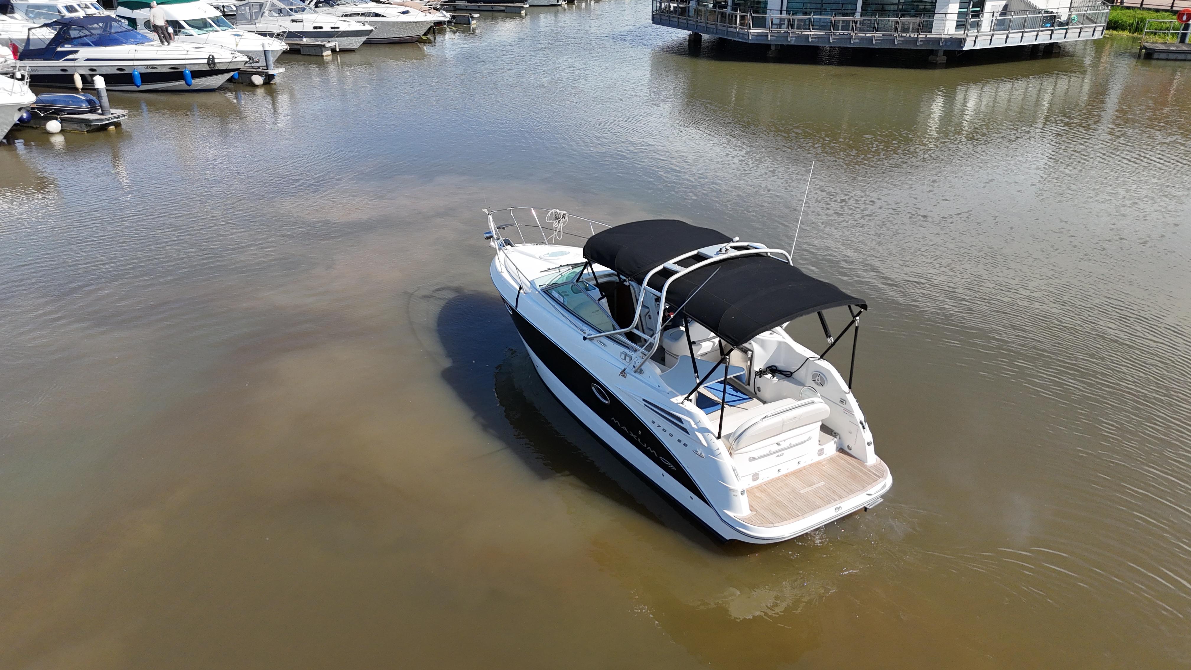 2008/09 Maxum 2700 SE sports cruiser with single Mercruiser 4.2L Diesel engine (250hp) Offering a large sociable and versatile cockpit space, this nicely presented cruiser offers a specification that includes: teak effect bathing platform, full cockpit cover with new perspex windows, wetbar, cockpit fridge, cockpit carpet, Radar/sports arch, Bowthruster, Northstar explorer plotter, VHF radio, electric hob, microwave. She has just been power polished, antifouled and is good to go for the season! Boat safety certificate valid until 2028.