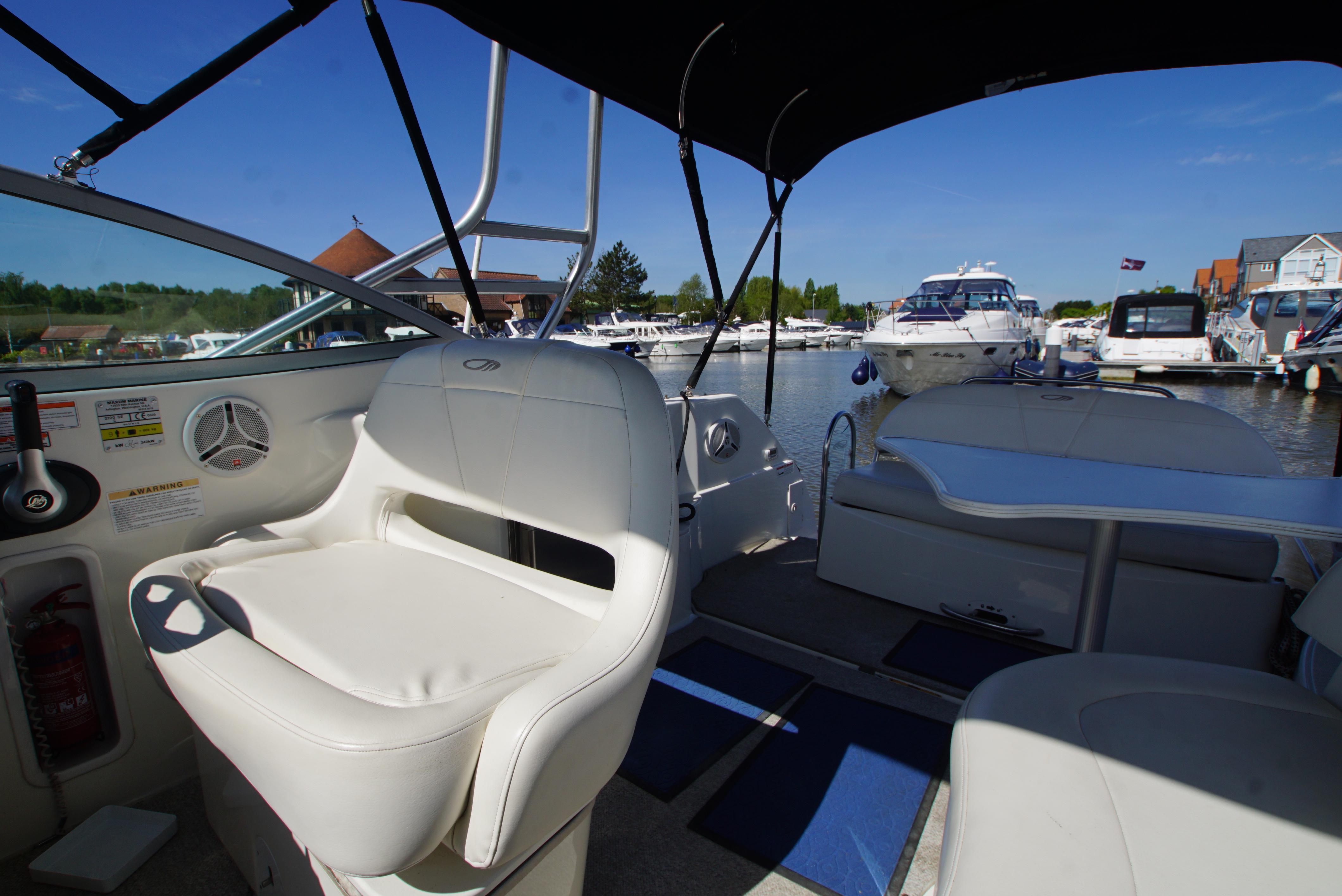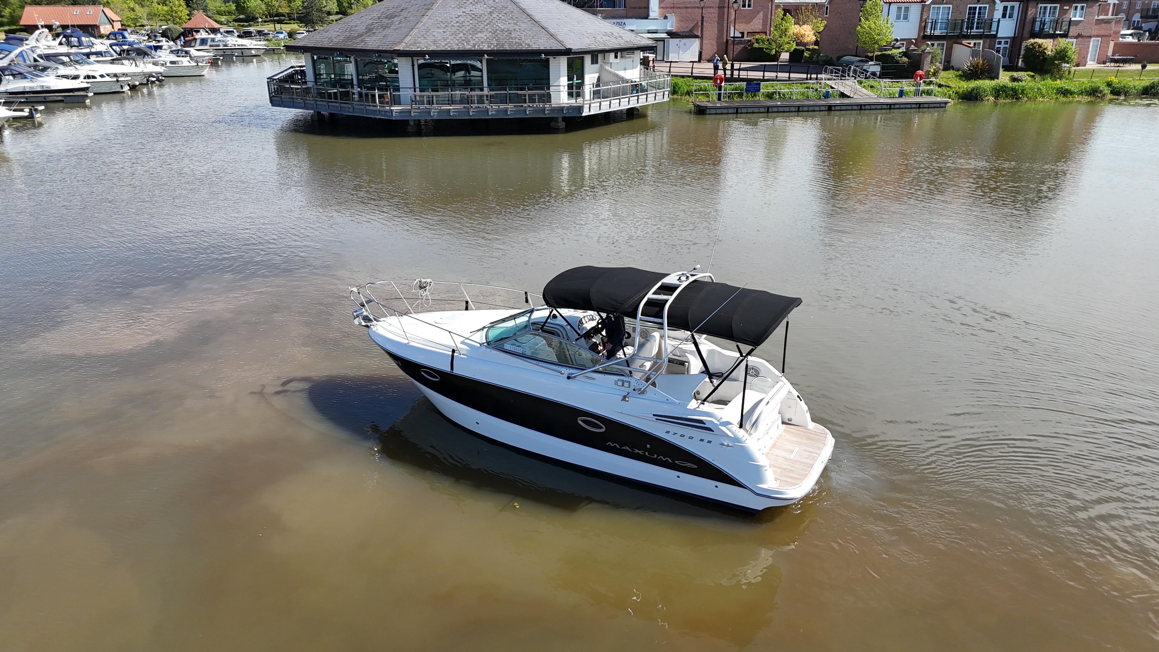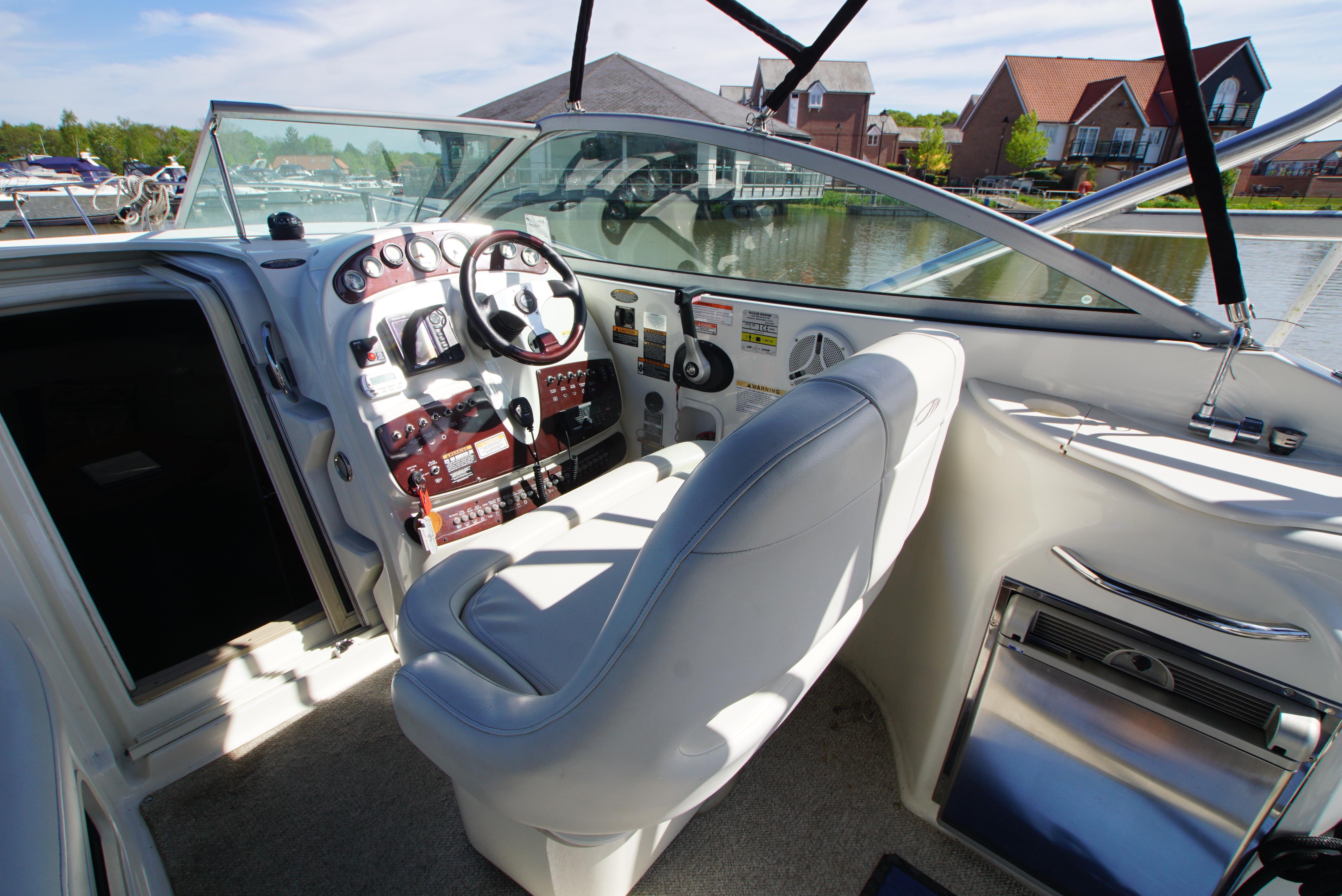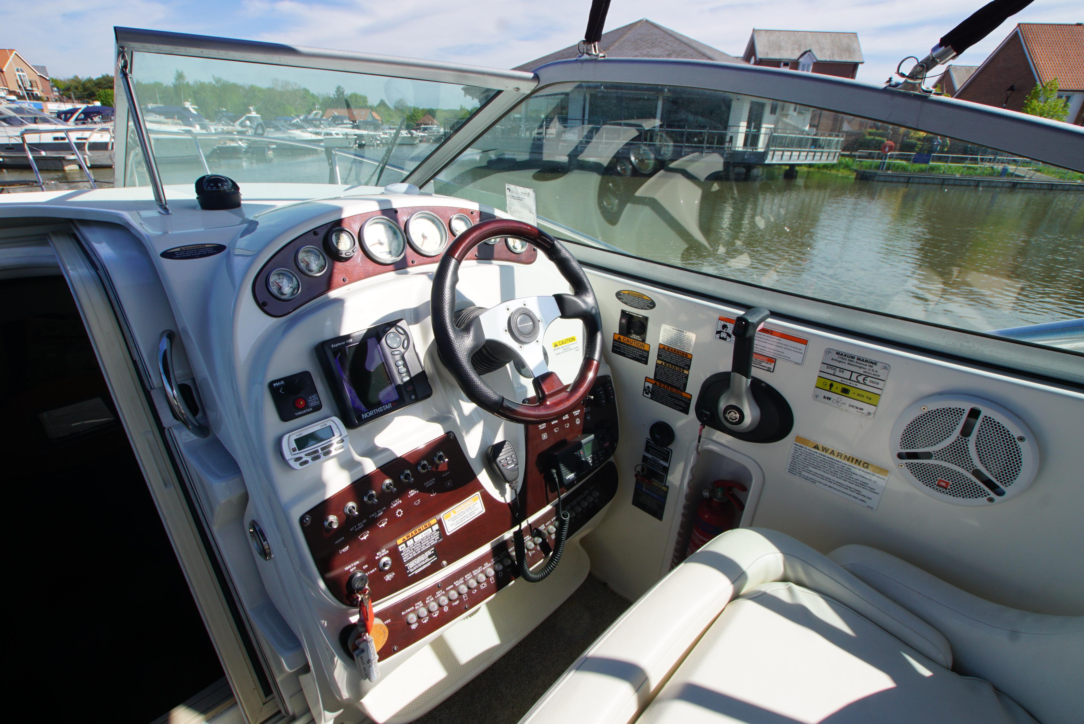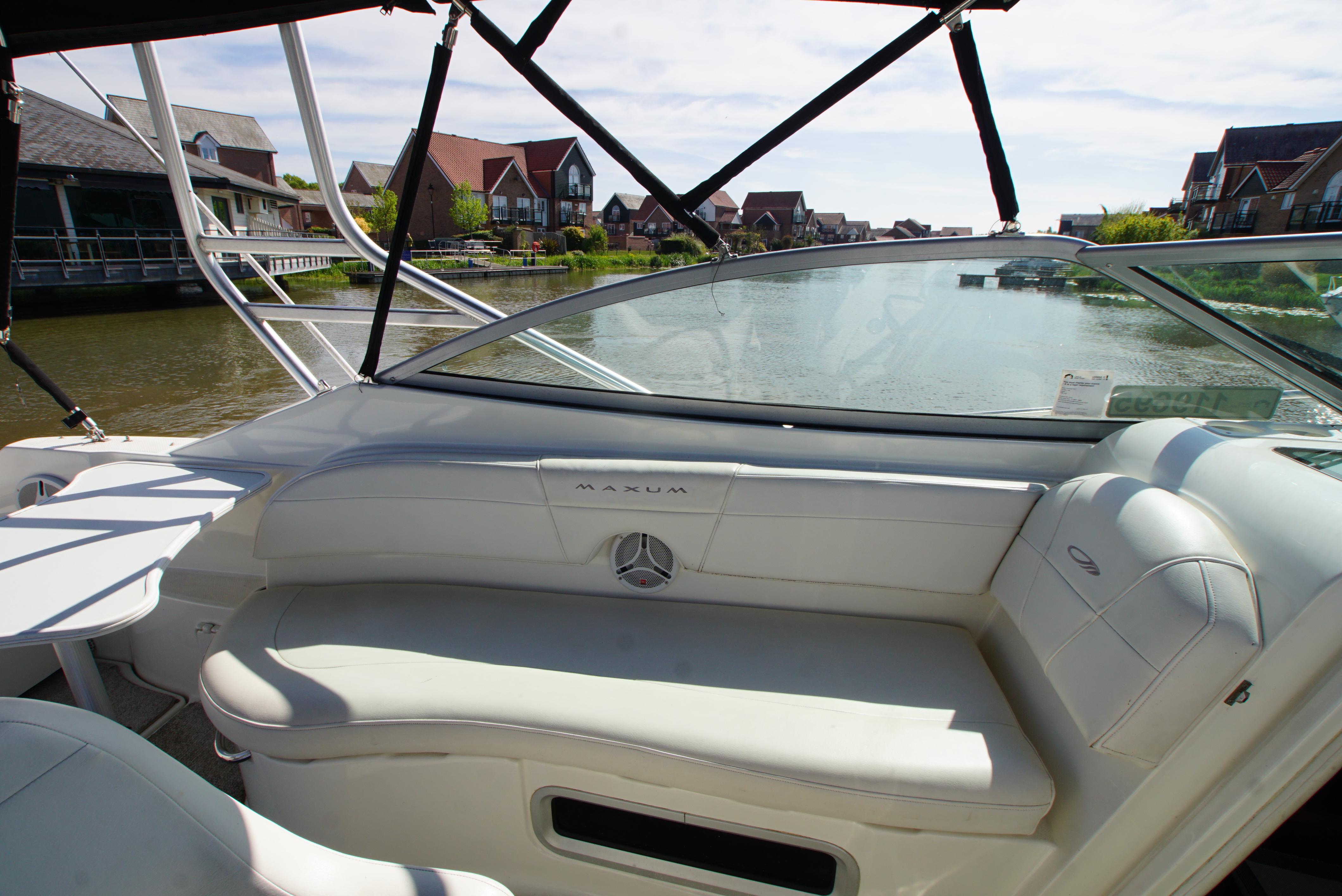 2008/09 Maxum 2700 SE sports cruiser with single Mercruiser 4.2L Diesel engine (250hp) Offering a large sociable and versatile cockpit space, this nicely presented cruiser offers a specification that includes: teak effect bathing platform, full cockpit cover with new perspex windows, wetbar, cockpit fridge, cockpit carpet, Radar/sports arch, Bowthruster, Northstar explorer plotter, VHF radio, electric hob, microwave. She has just been power polished, antifouled and is good to go for the season! Boat safety certificate valid until 2028.