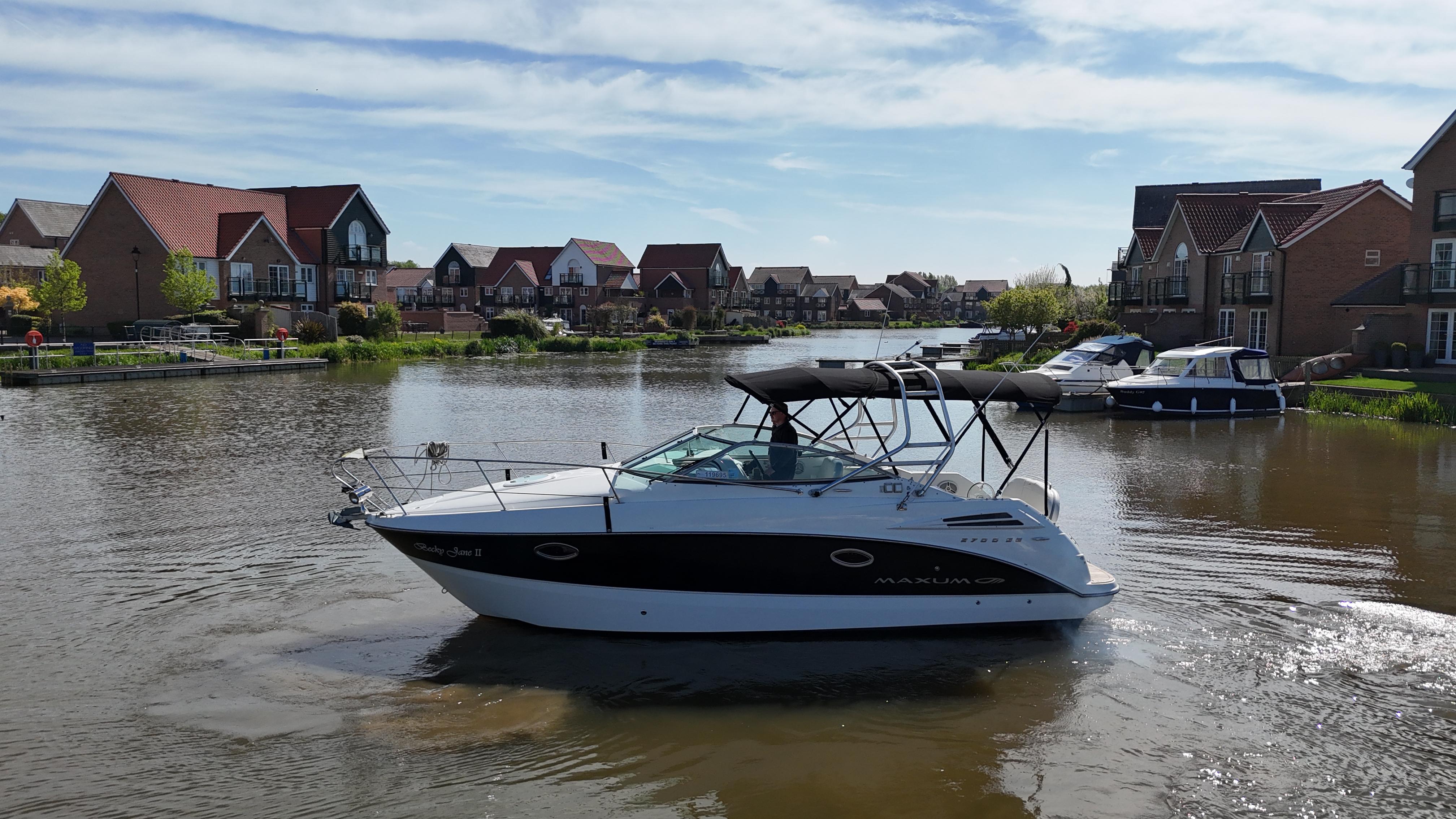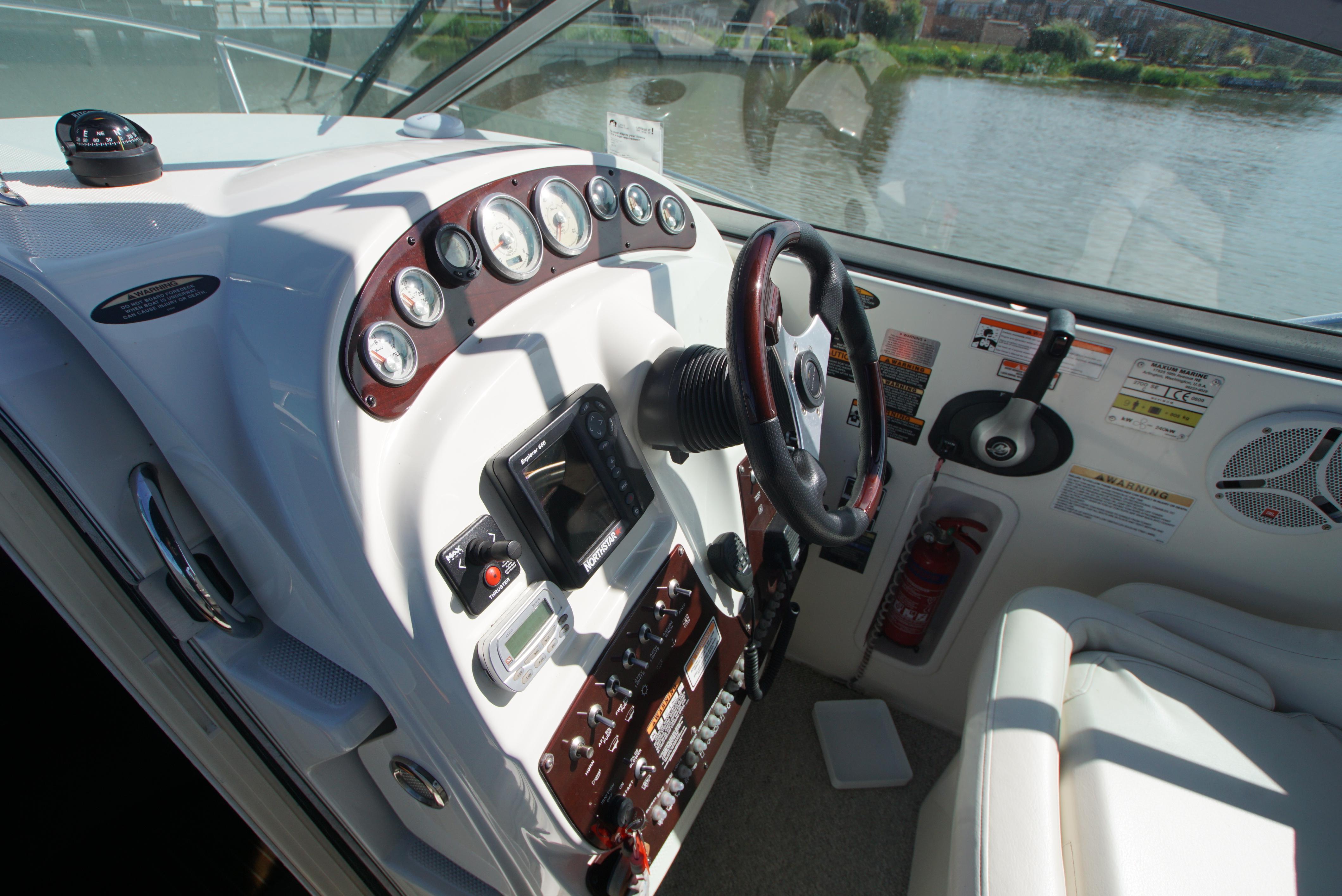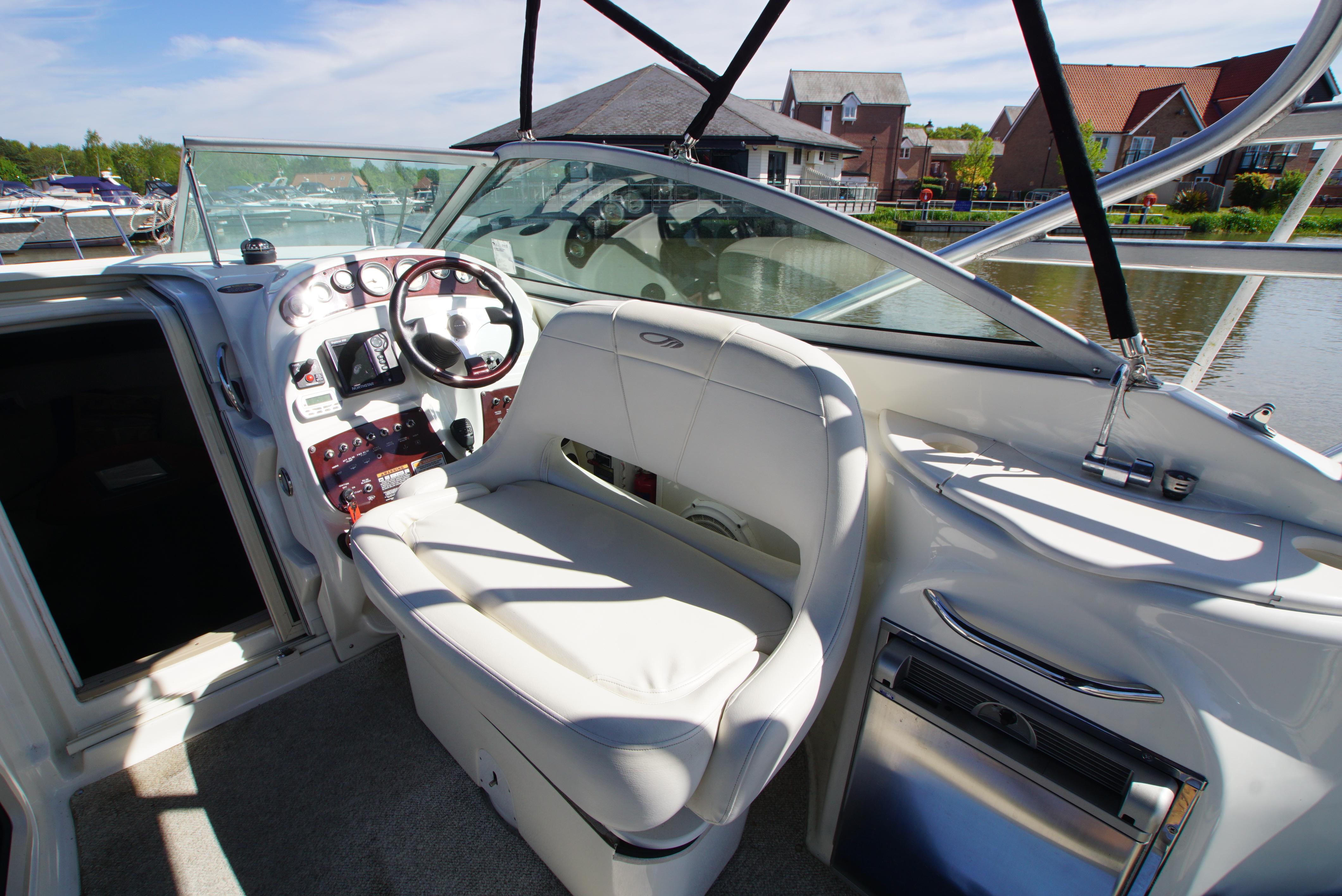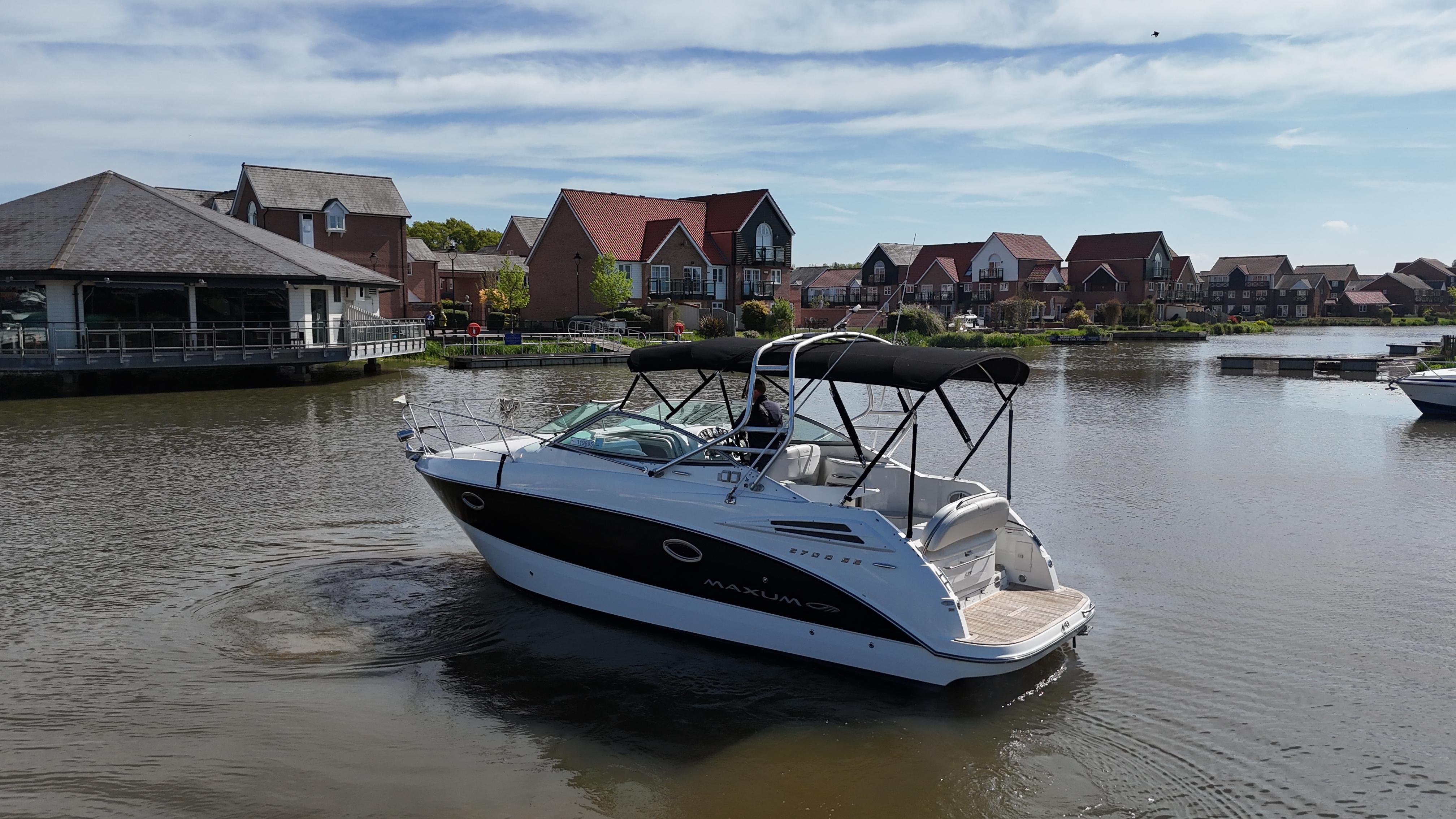 2008/09 Maxum 2700 SE sports cruiser with single Mercruiser 4.2L Diesel engine (250hp) Offering a large sociable and versatile cockpit space, this nicely presented cruiser offers a specification that includes: teak effect bathing platform, full cockpit cover with new perspex windows, wetbar, cockpit fridge, cockpit carpet, Radar/sports arch, Bowthruster, Northstar explorer plotter, VHF radio, electric hob, microwave. She has just been power polished, antifouled and is good to go for the season! Boat safety certificate valid until 2028.