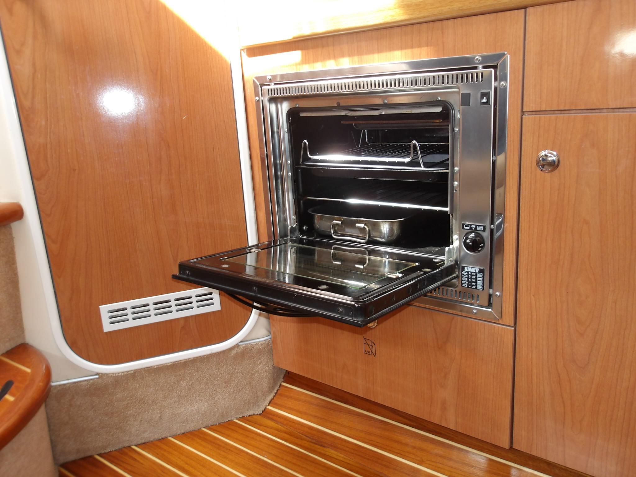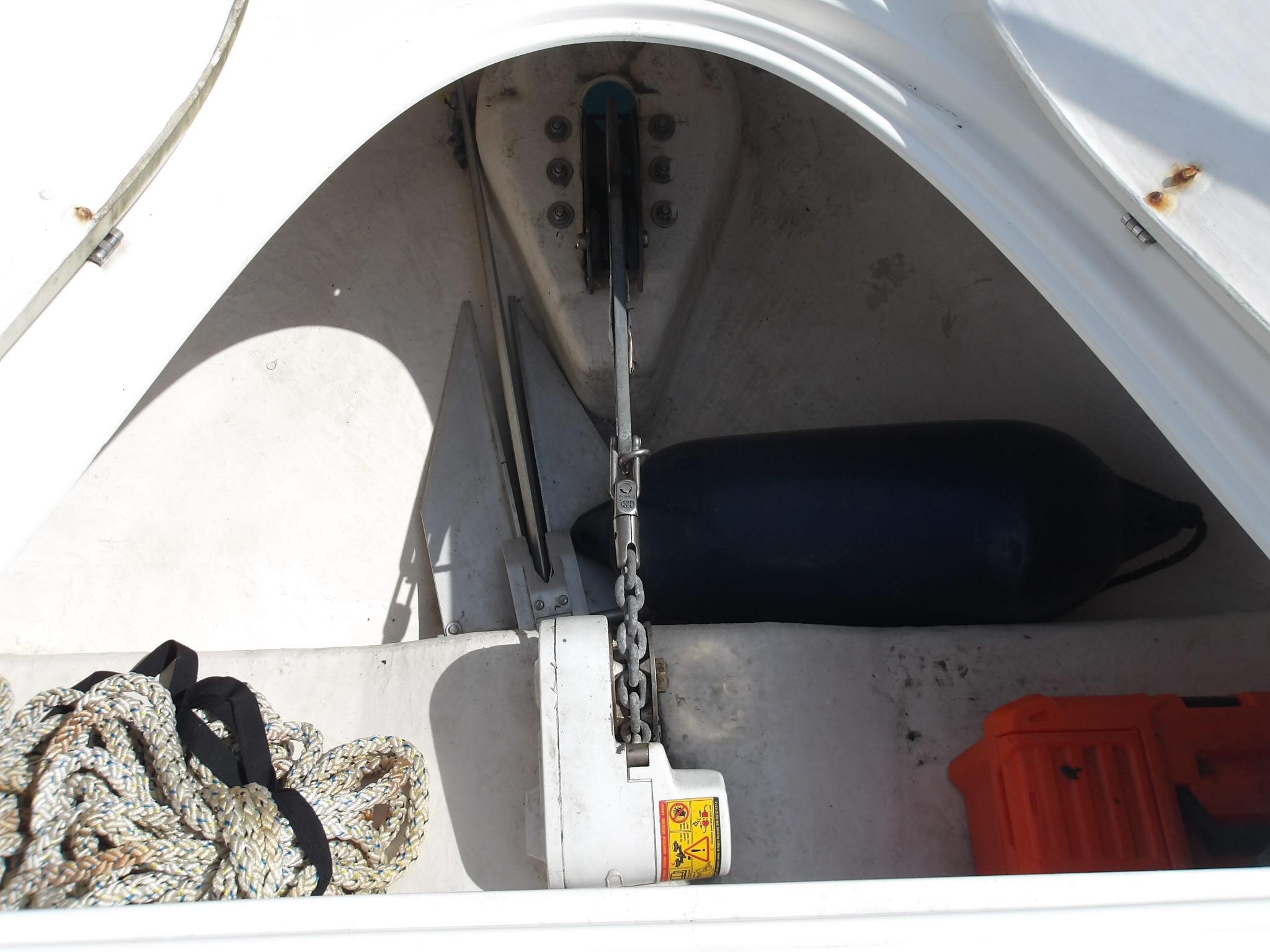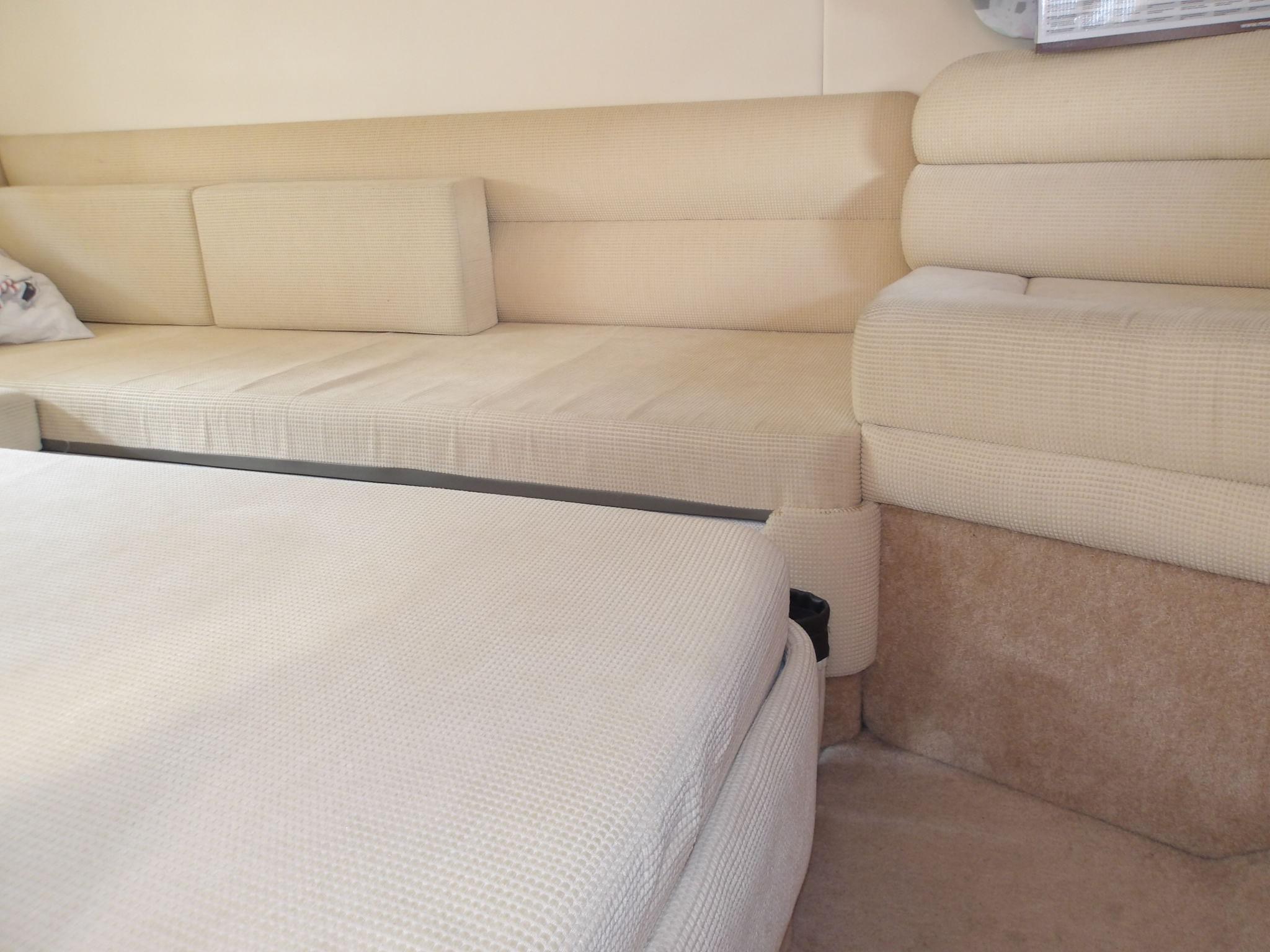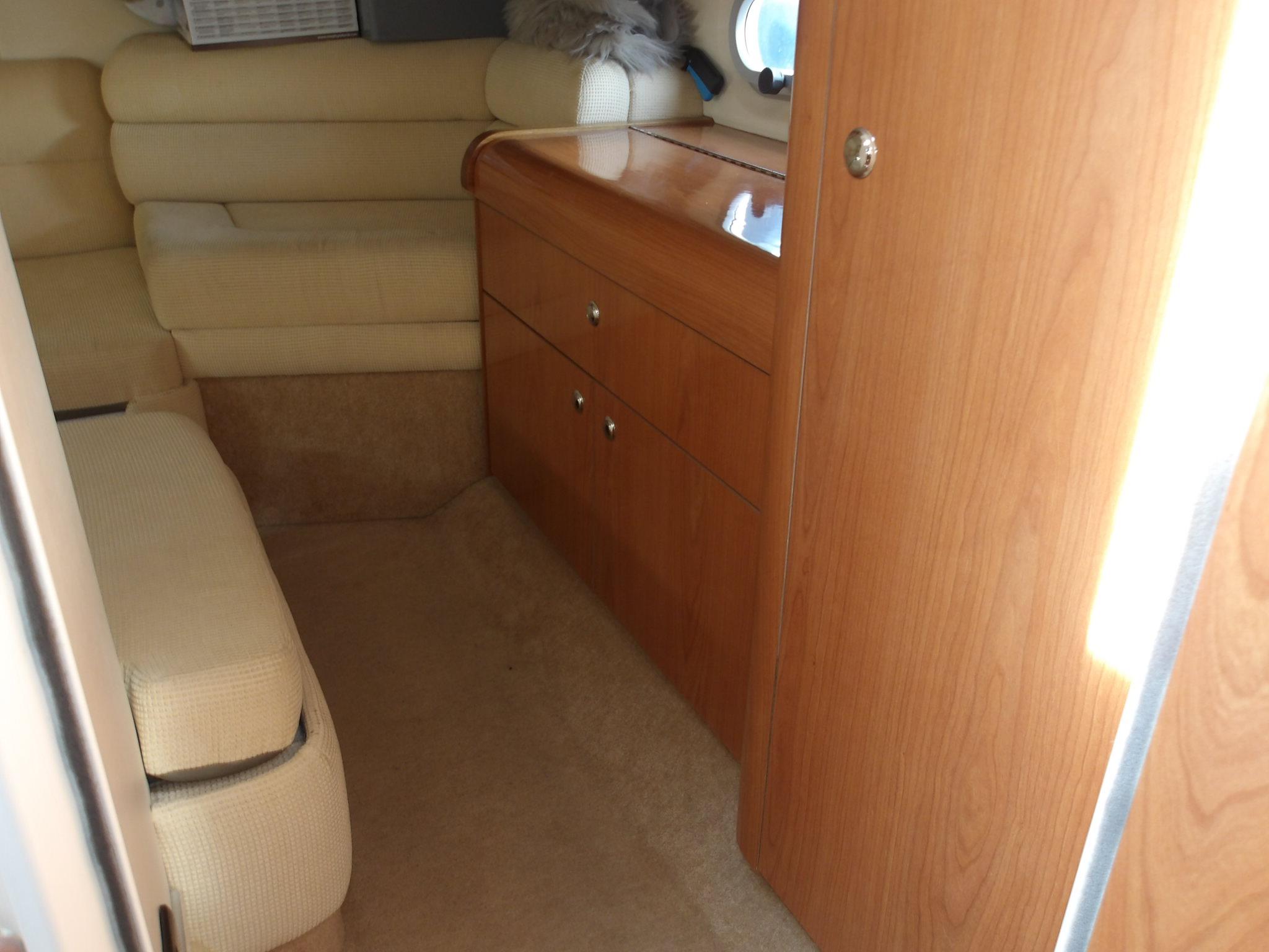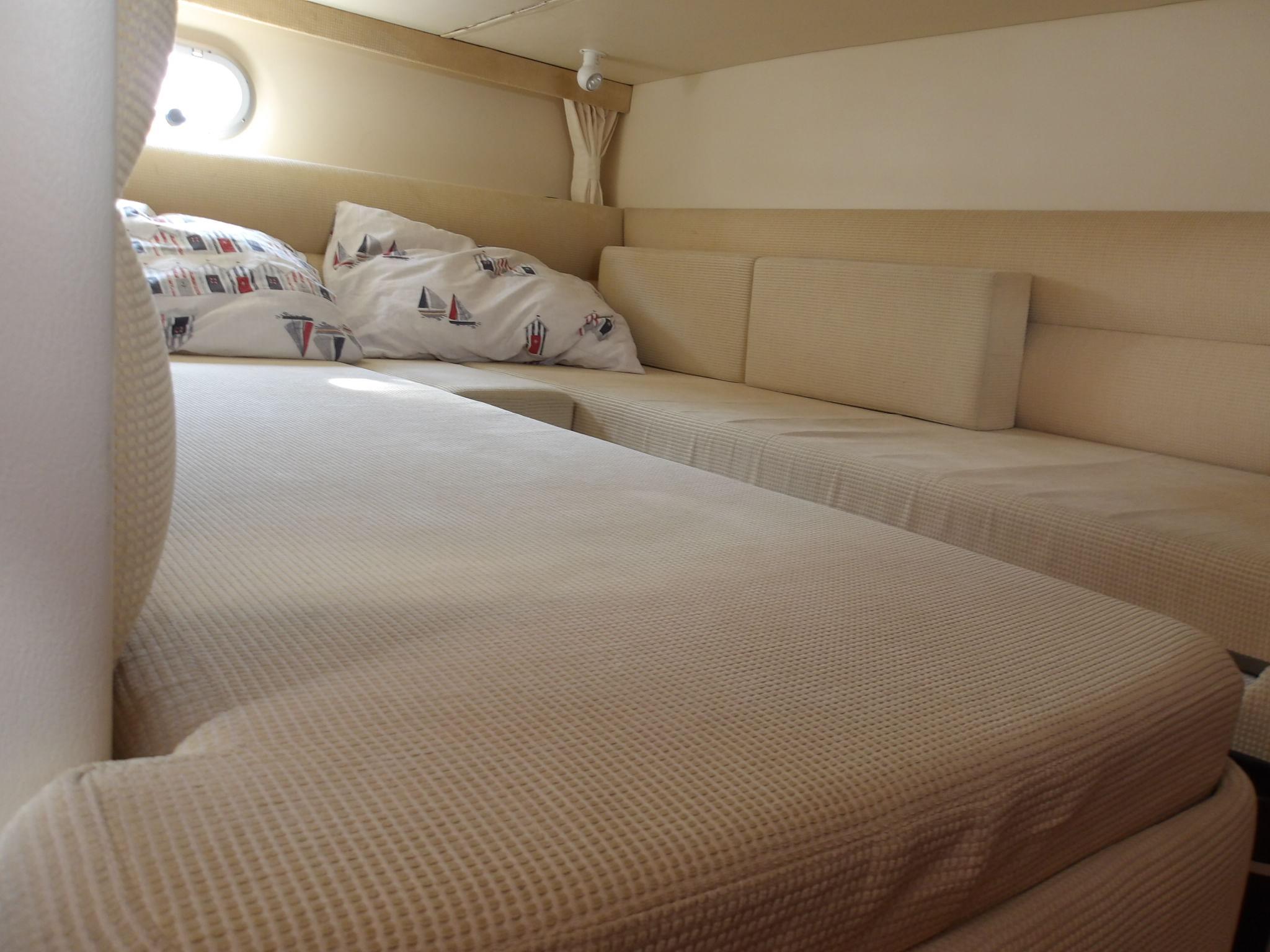 • Fully lined throughout • Carpet and curtains • Large fully upholstered double berth with storage below • Hanging wardrobes with shelves • Vanity unit with mirror • Storage drawers • Mirror on forward bulkhead • 220v sockets • Opening windows • Opening hatch to deck