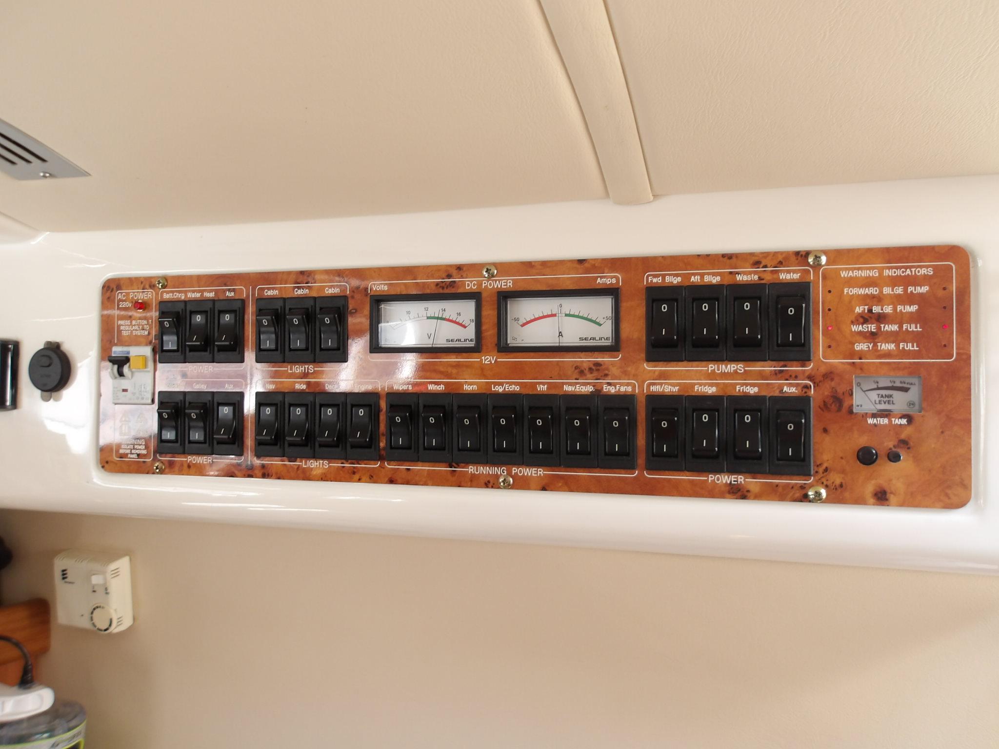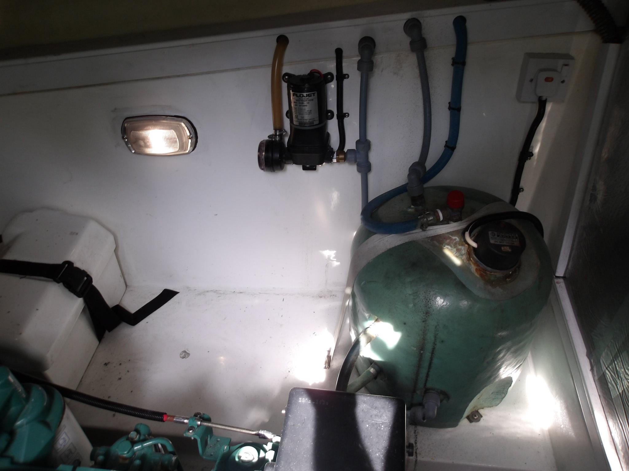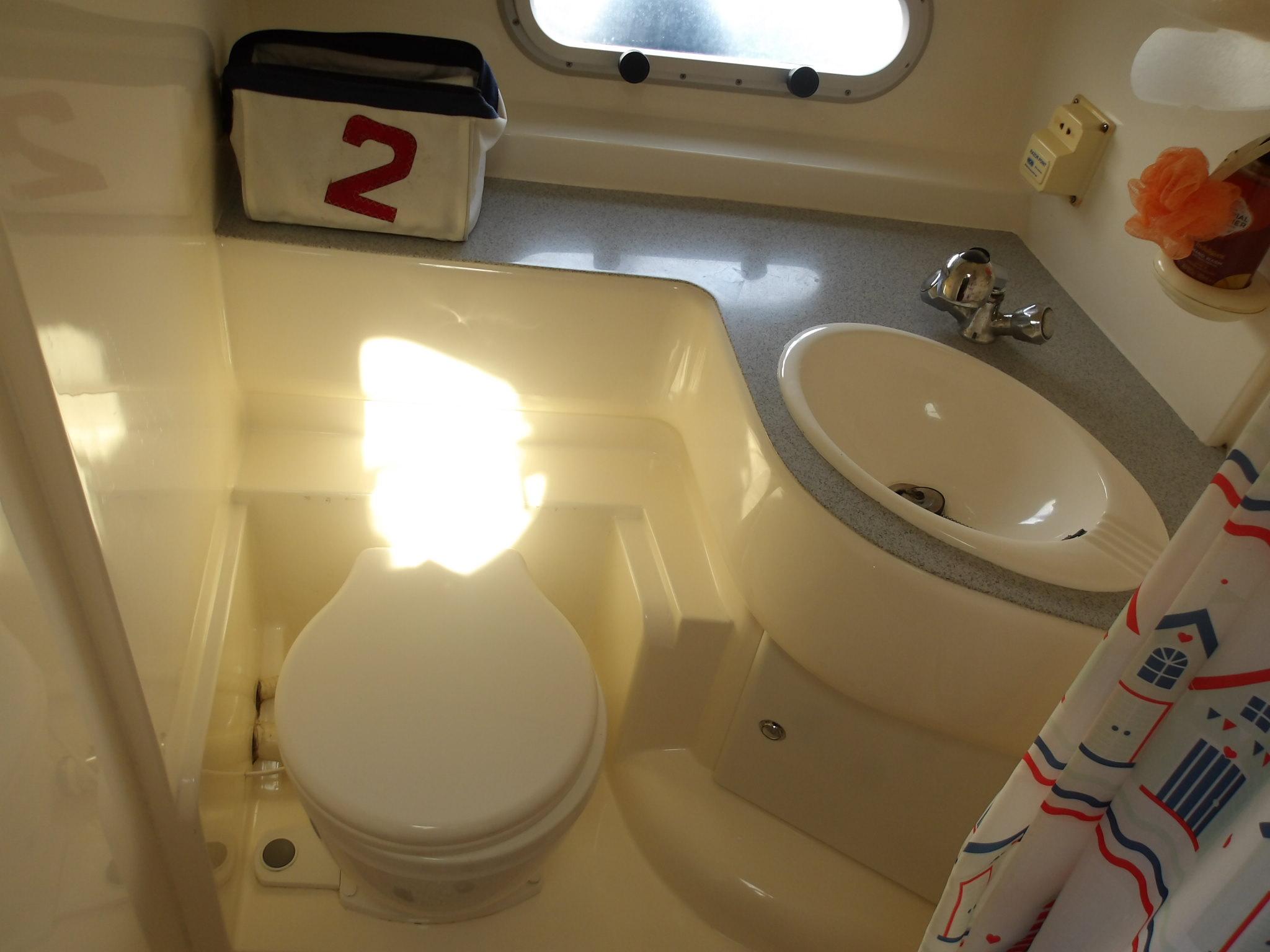 • Toilet / shower compartment with door to saloon and ensuite facility to saloon and forward cabin • Sea toilet • Hand basin • Mixer / shower tap with pressurised hot and cold water • Vanity unit with storage compartments • Shower drain with automatic pump • Towel rail, toilet roll and toothbrush holders • Overhead lighting • Two mirrors • Shaver socket