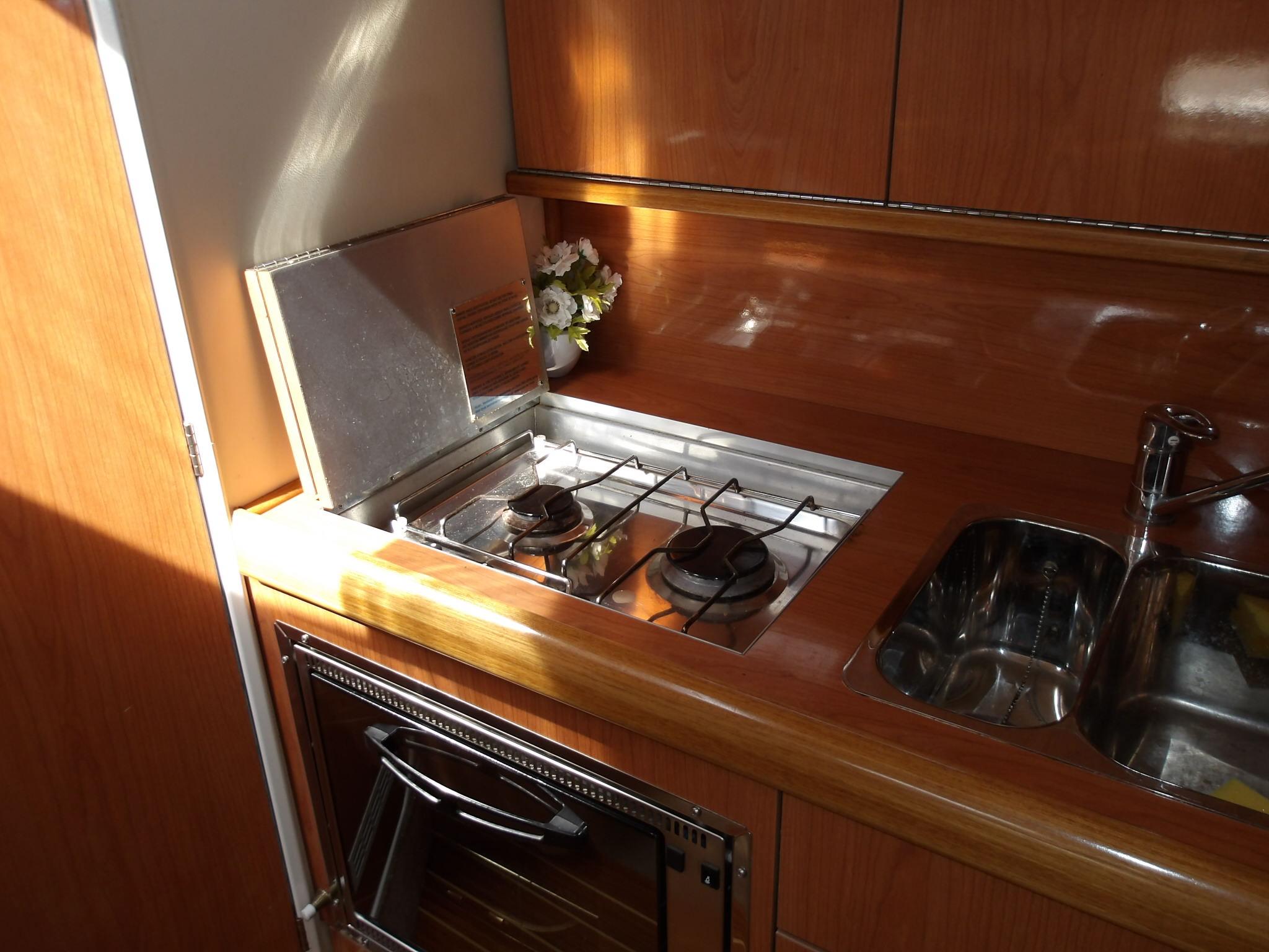 • Two deep stainless steel sinks • Mixer tap, pressurised hot and cold water • Two burner hob with hinged cover • Oven and grill • Fridge • Low level storage cupboards • High level storage cupboards • Overhead lighting • Opening window • Fire extinguisher • 220v socket
