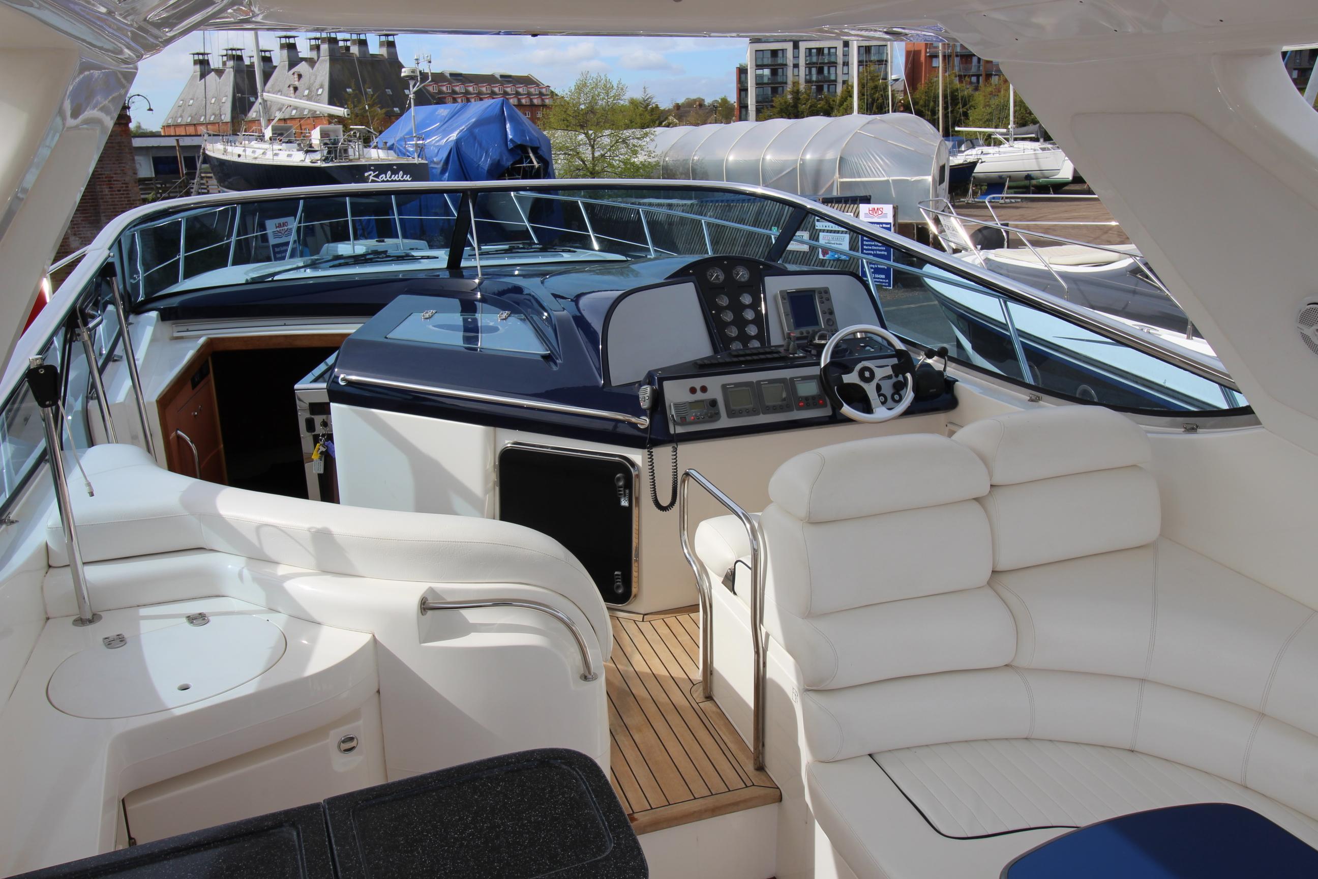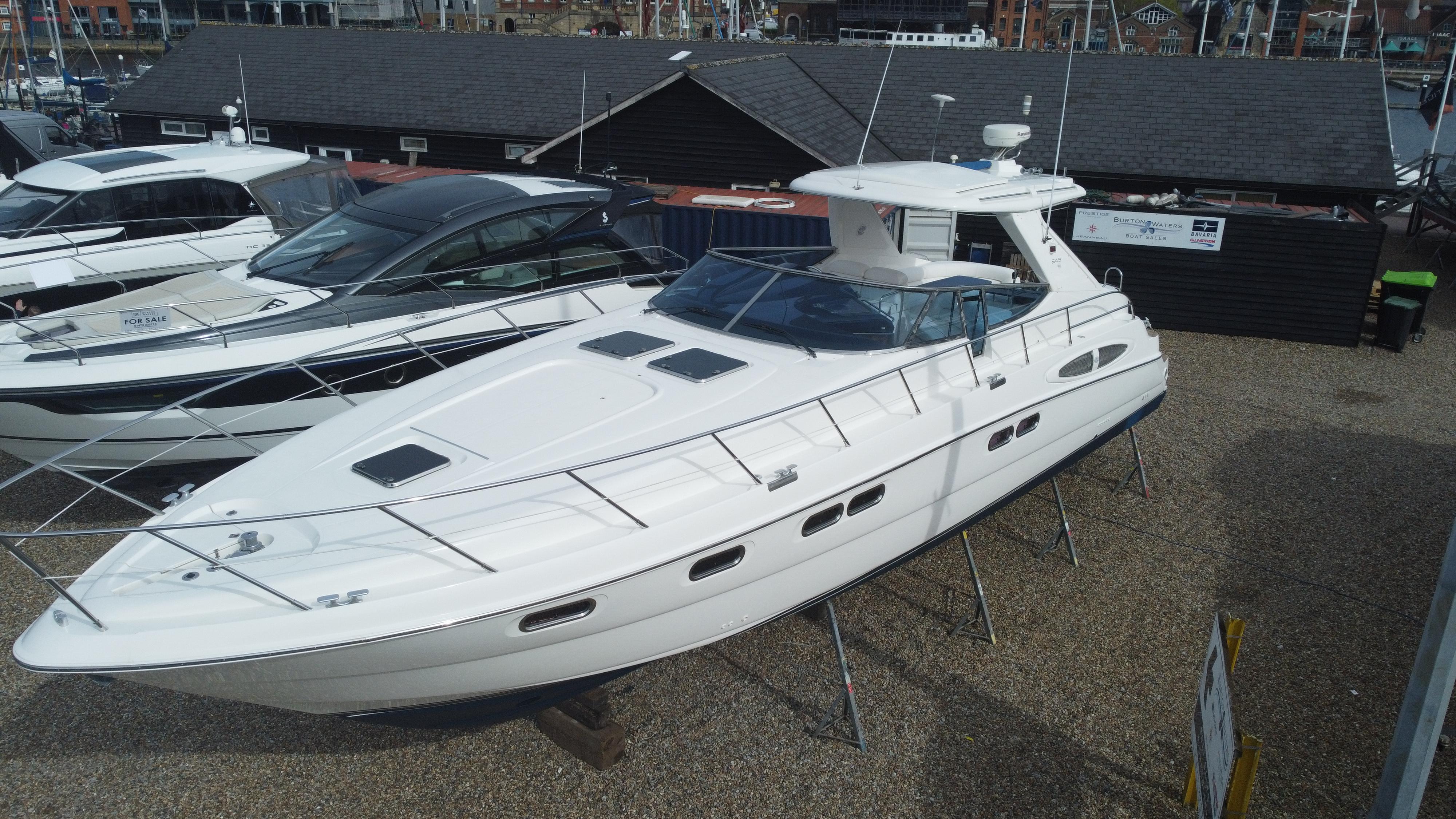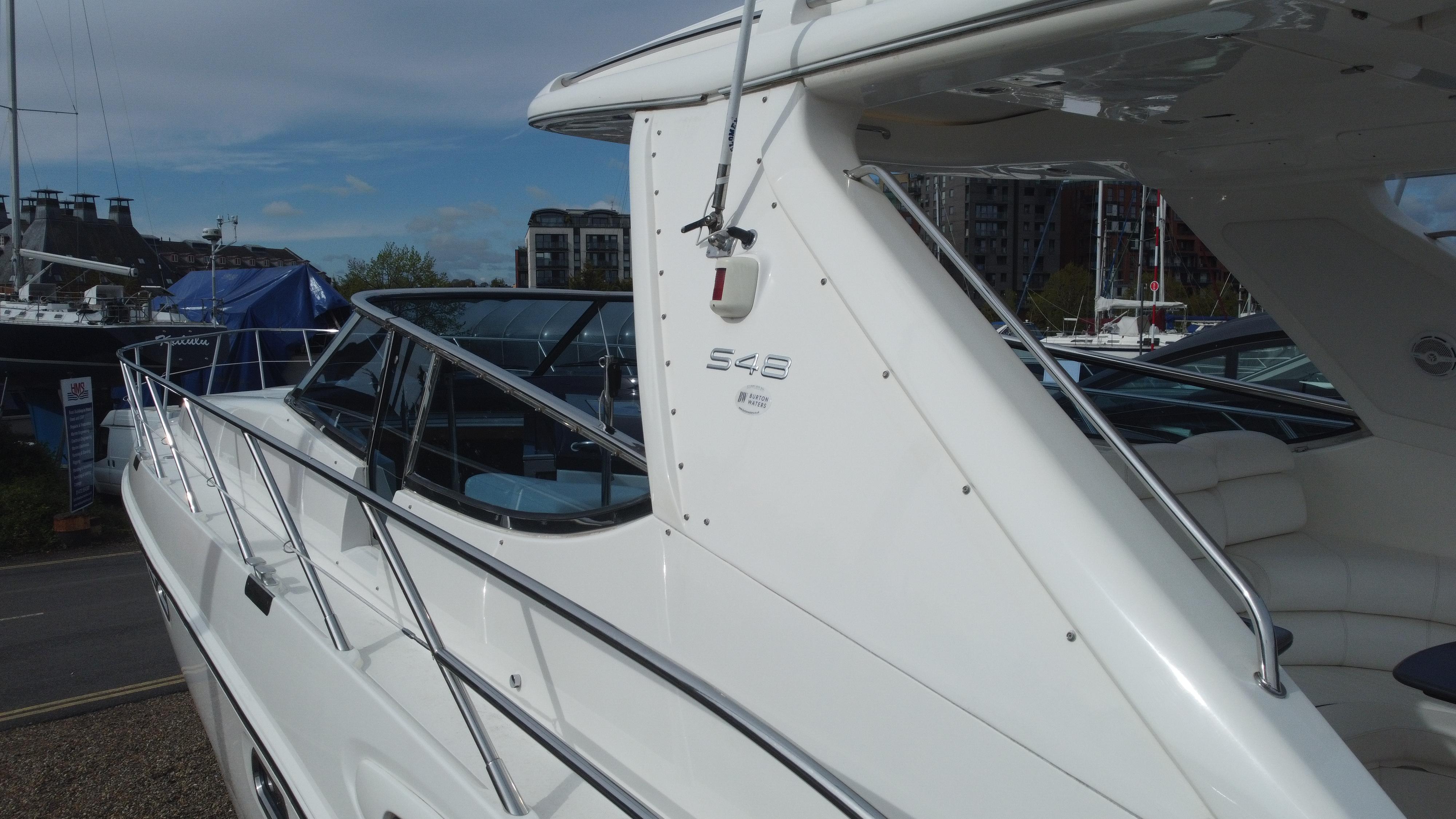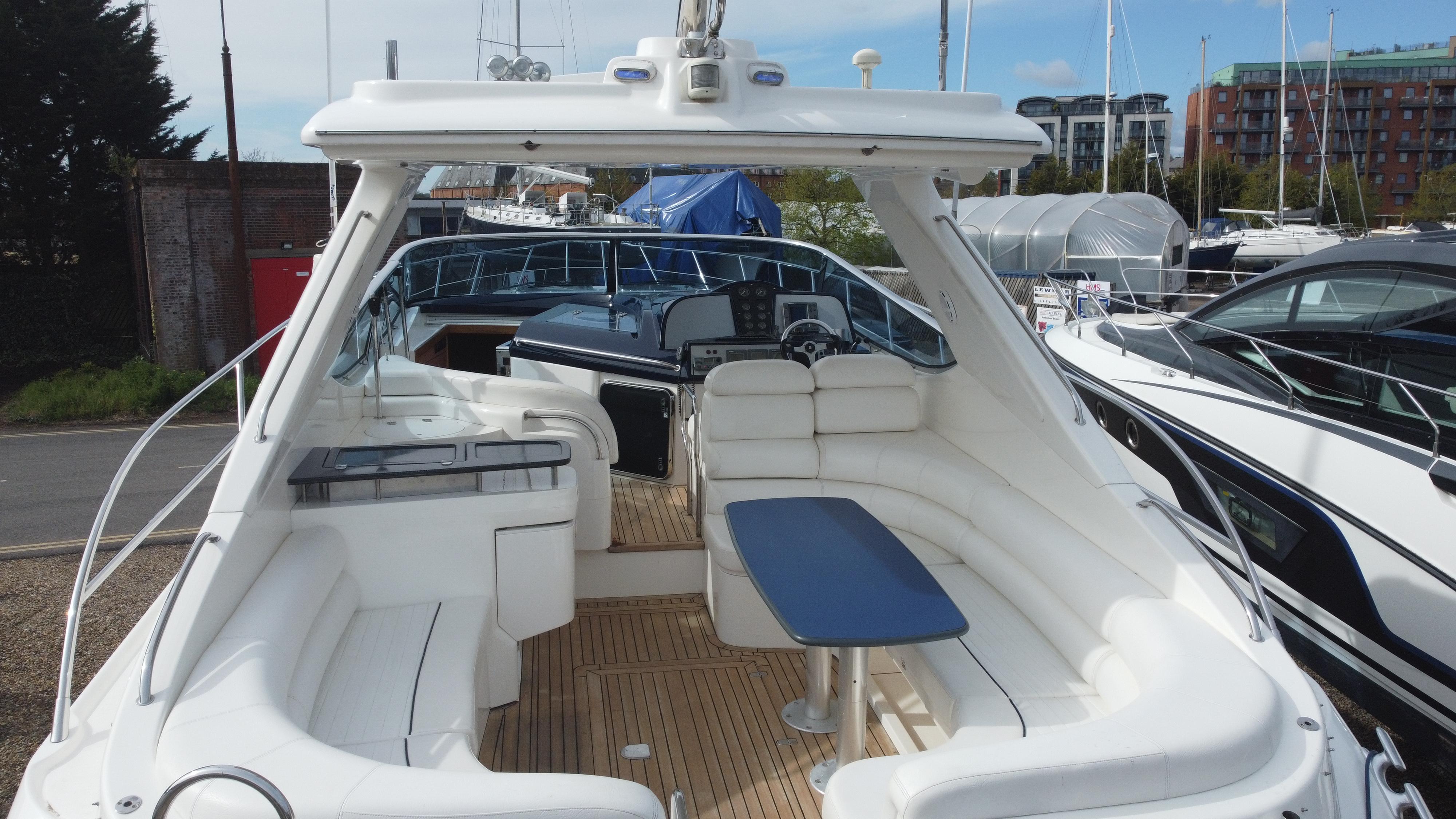 Sealine S48 2003 model, 2002 build and equipped with twin Volvo Penta TAMD75 on electronic throttles. The vessel also benefits from having a bow and stern thruster, making her a very easy boat to manoeuvre in confined quarters, especially with the remote. The vessel offers 6 berths in two cabins with a convertible saloon. A very highly specified example of this offshore sports cruiser which offers good seagoing qualities and handling. This combines with an excellent accommodation package which offers 2 x double cabins with a midships master with an en-suite toilet and a separate shower room. The forward cabin en suite also has saloon dayboat access. A fully equipped electric galley, ample cockpit space for entertaining with a wet bar, fridge, and BBQ, all covered by the electric sliding hardtop roof. The aft retractable watersports platform with chocks that can take a tender and lower it into the water. The vessel is also equipped with air conditioning, diesel heating and a generator. Part exchange considered and viewings 6 days a week.