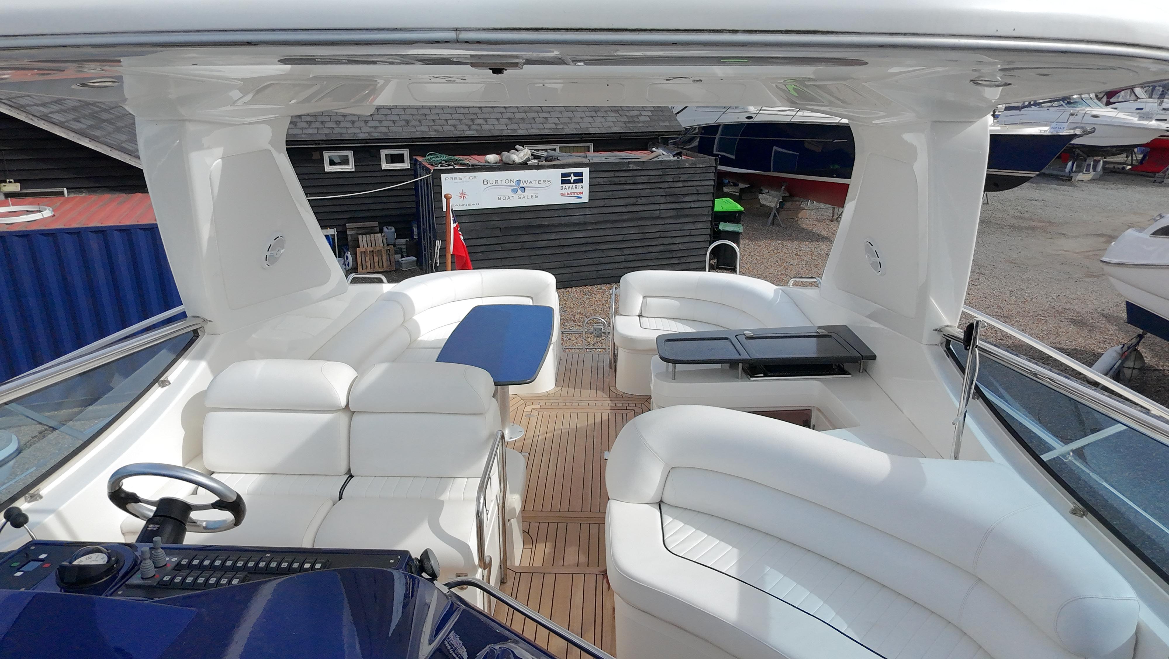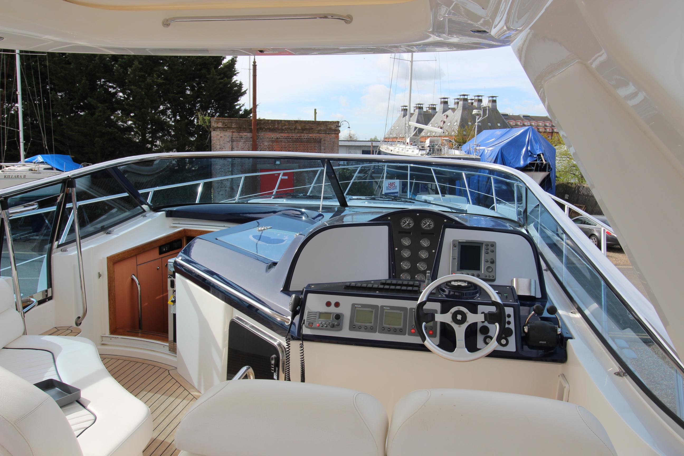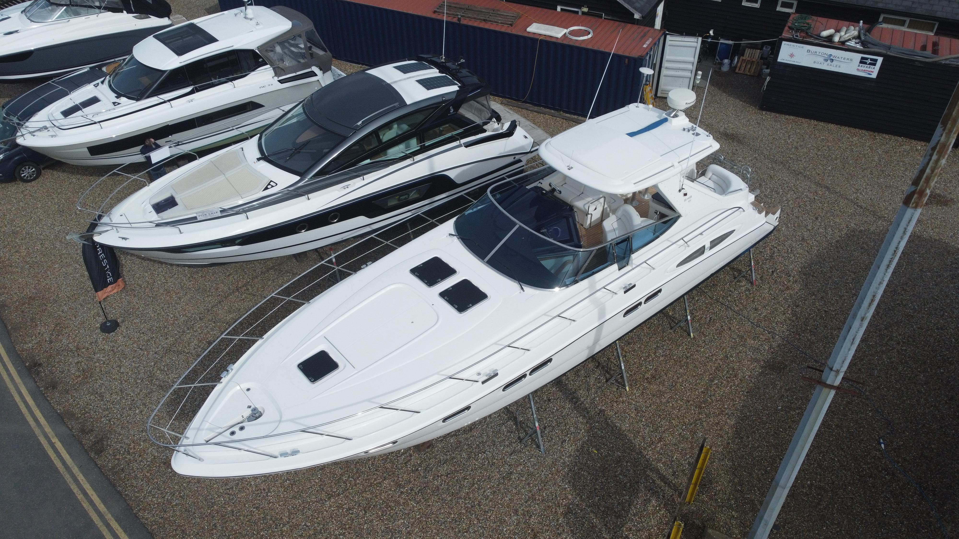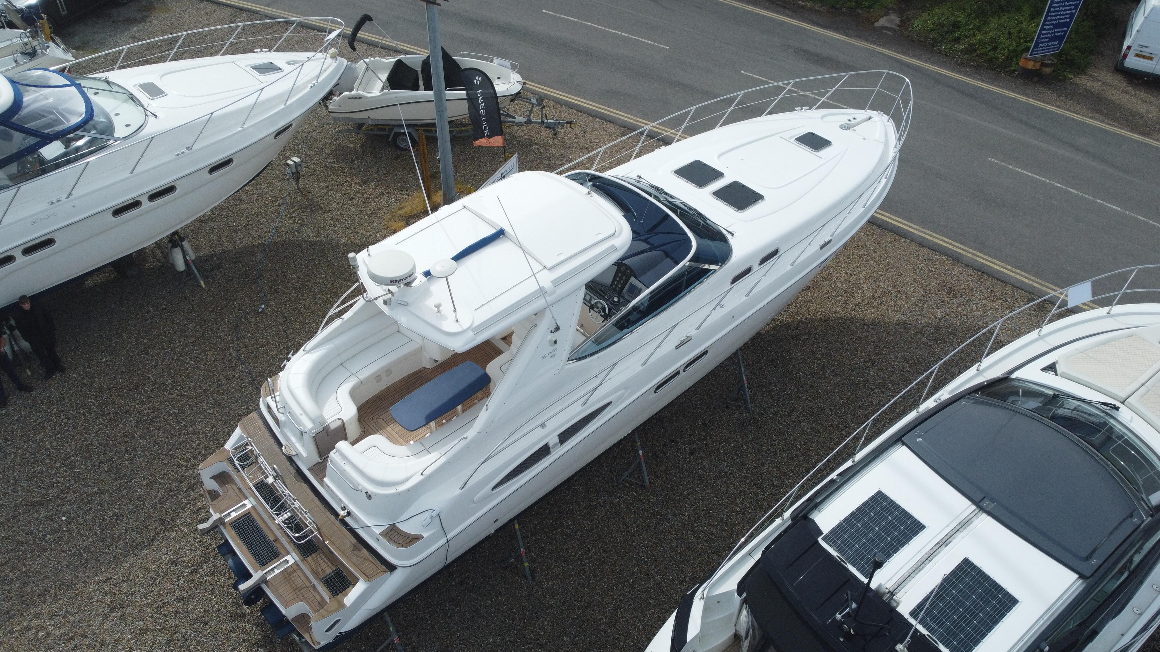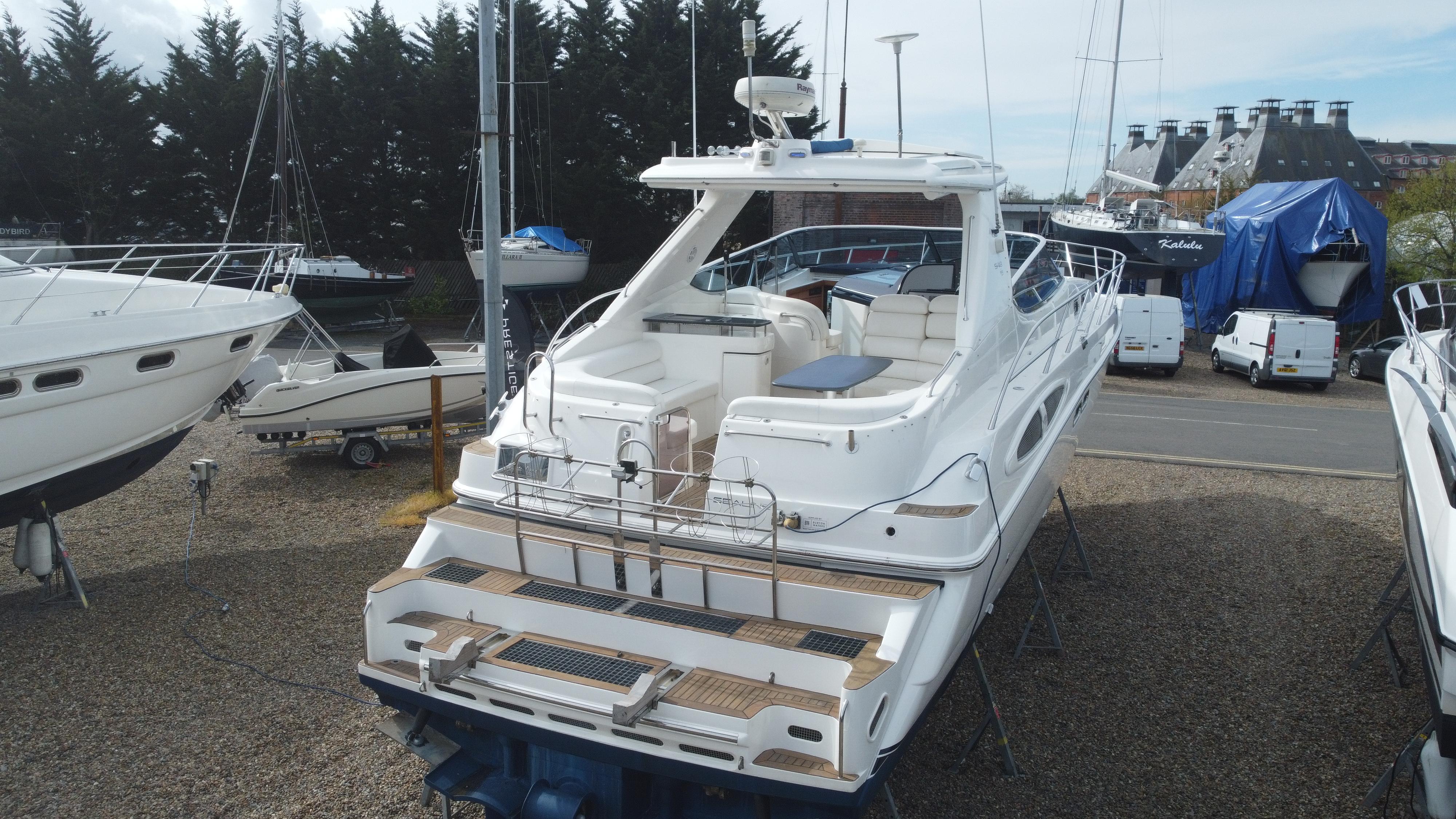 Sealine S48 2003 model, 2002 build and equipped with twin Volvo Penta TAMD75 on electronic throttles. The vessel also benefits from having a bow and stern thruster, making her a very easy boat to manoeuvre in confined quarters, especially with the remote. The vessel offers 6 berths in two cabins with a convertible saloon. A very highly specified example of this offshore sports cruiser which offers good seagoing qualities and handling. This combines with an excellent accommodation package which offers 2 x double cabins with a midships master with an en-suite toilet and a separate shower room. The forward cabin en suite also has saloon dayboat access. A fully equipped electric galley, ample cockpit space for entertaining with a wet bar, fridge, and BBQ, all covered by the electric sliding hardtop roof. The aft retractable watersports platform with chocks that can take a tender and lower it into the water. The vessel is also equipped with air conditioning, diesel heating and a generator. Part exchange considered and viewings 6 days a week.
