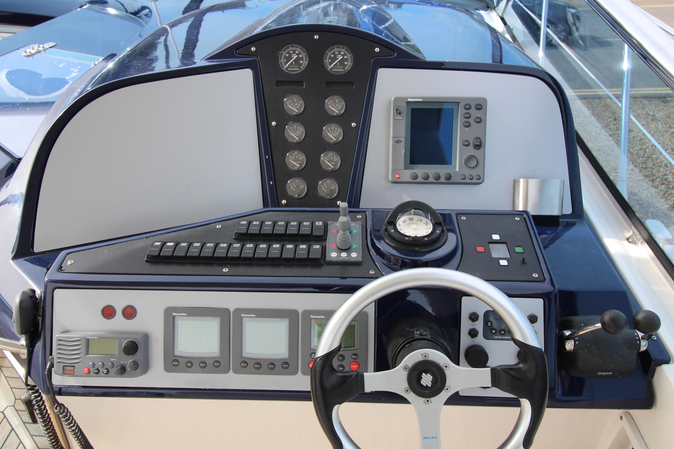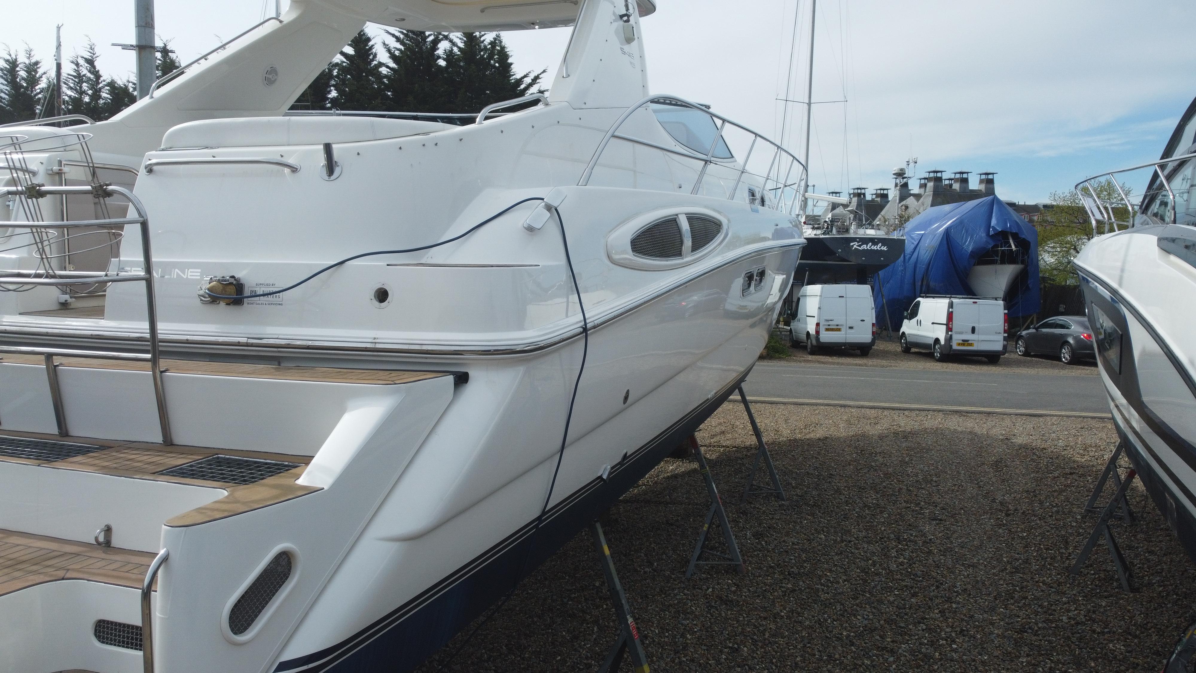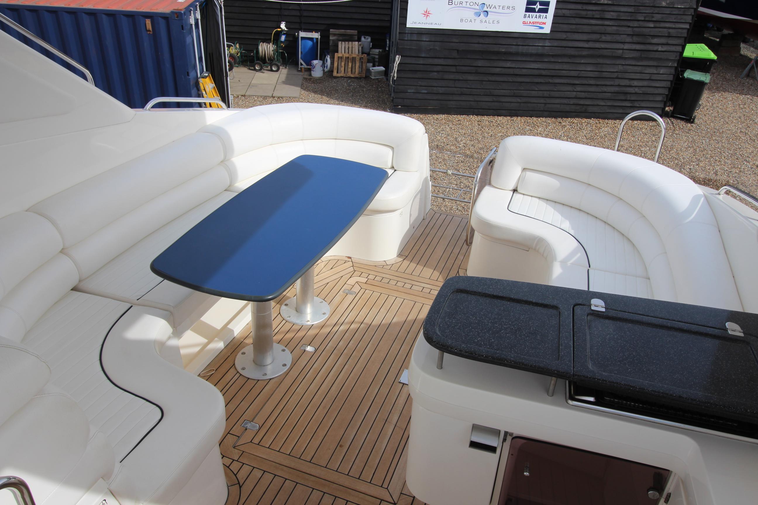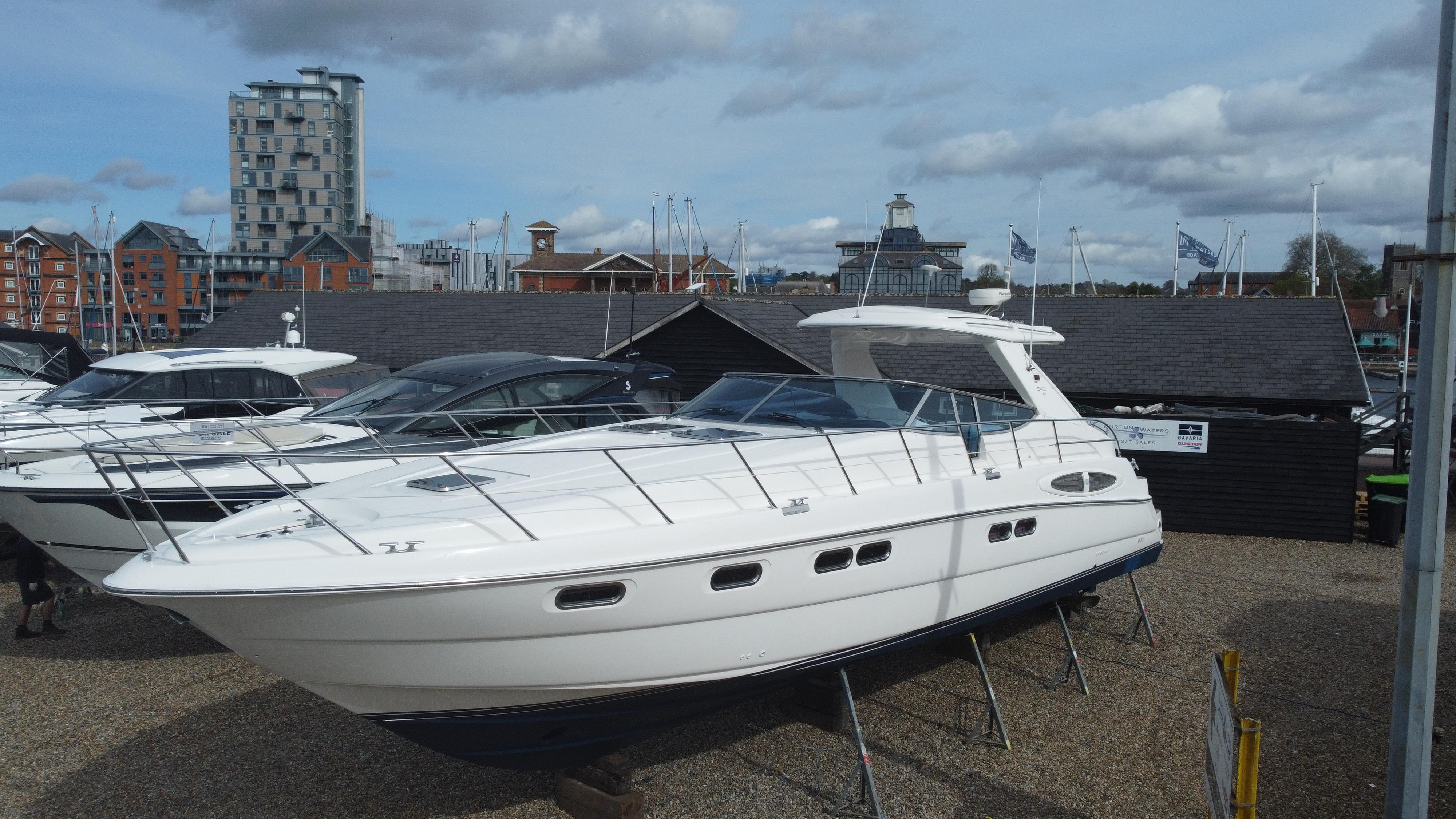 Sealine S48 2003 model, 2002 build and equipped with twin Volvo Penta TAMD75 on electronic throttles. The vessel also benefits from having a bow and stern thruster, making her a very easy boat to manoeuvre in confined quarters, especially with the remote. The vessel offers 6 berths in two cabins with a convertible saloon. A very highly specified example of this offshore sports cruiser which offers good seagoing qualities and handling. This combines with an excellent accommodation package which offers 2 x double cabins with a midships master with an en-suite toilet and a separate shower room. The forward cabin en suite also has saloon dayboat access. A fully equipped electric galley, ample cockpit space for entertaining with a wet bar, fridge, and BBQ, all covered by the electric sliding hardtop roof. The aft retractable watersports platform with chocks that can take a tender and lower it into the water. The vessel is also equipped with air conditioning, diesel heating and a generator. Part exchange considered and viewings 6 days a week.