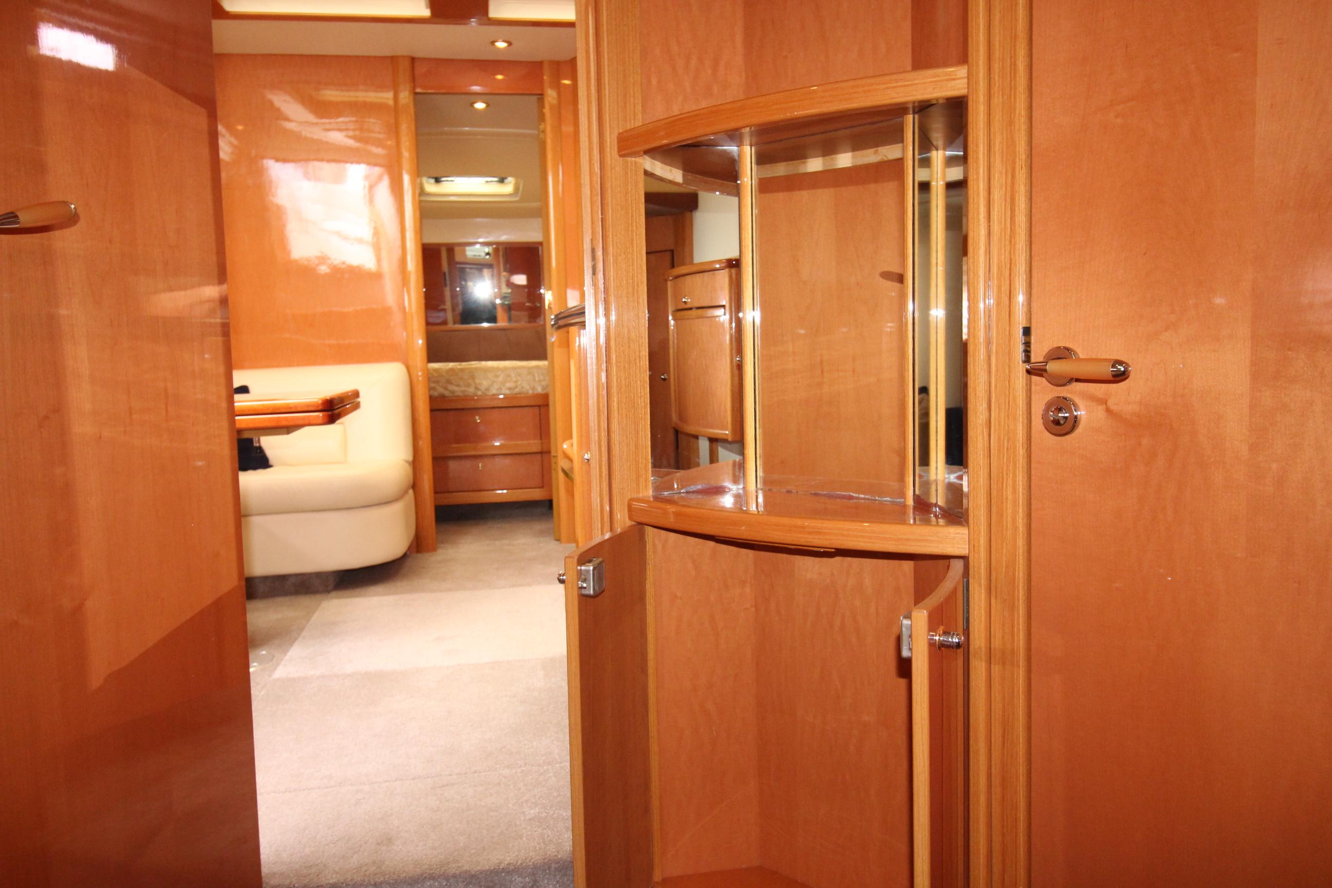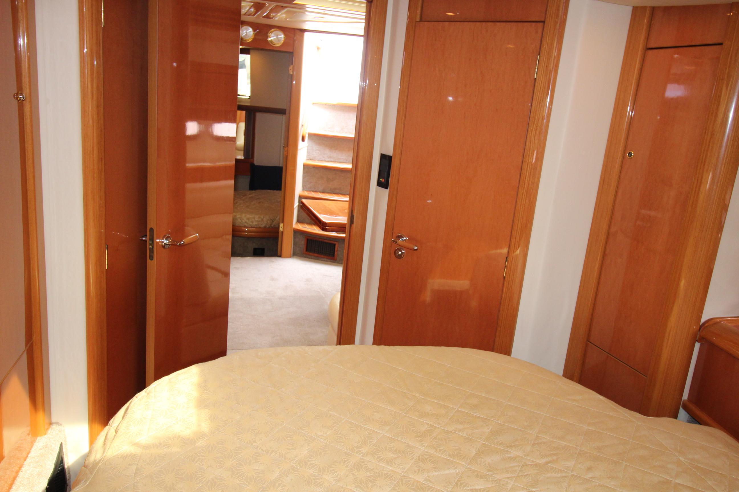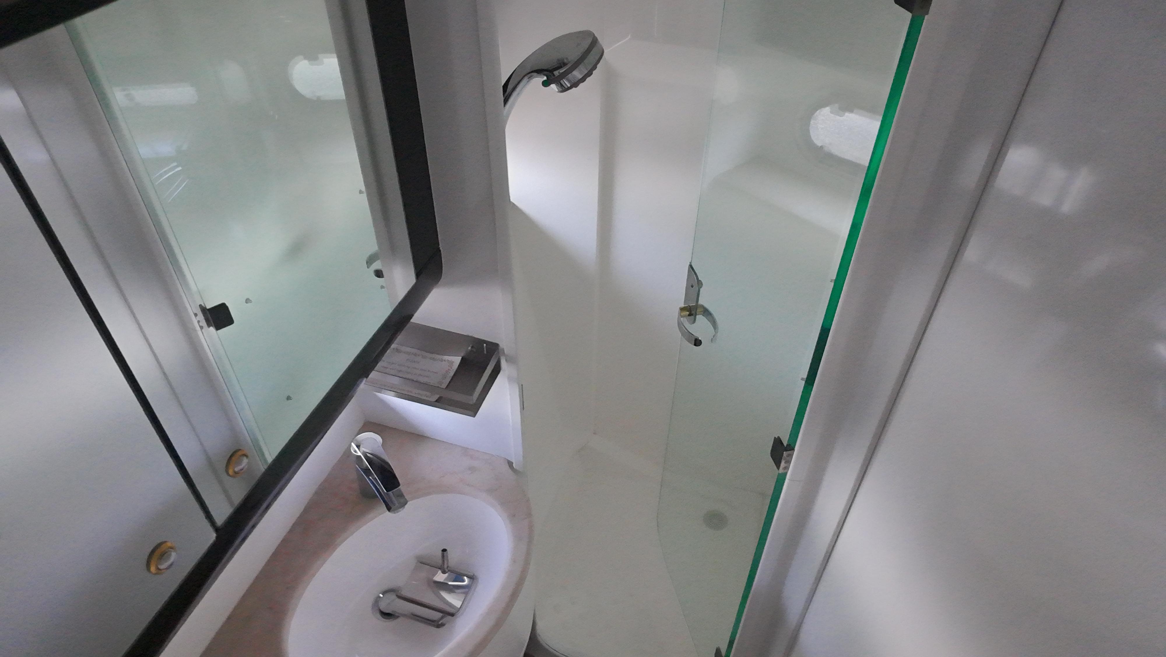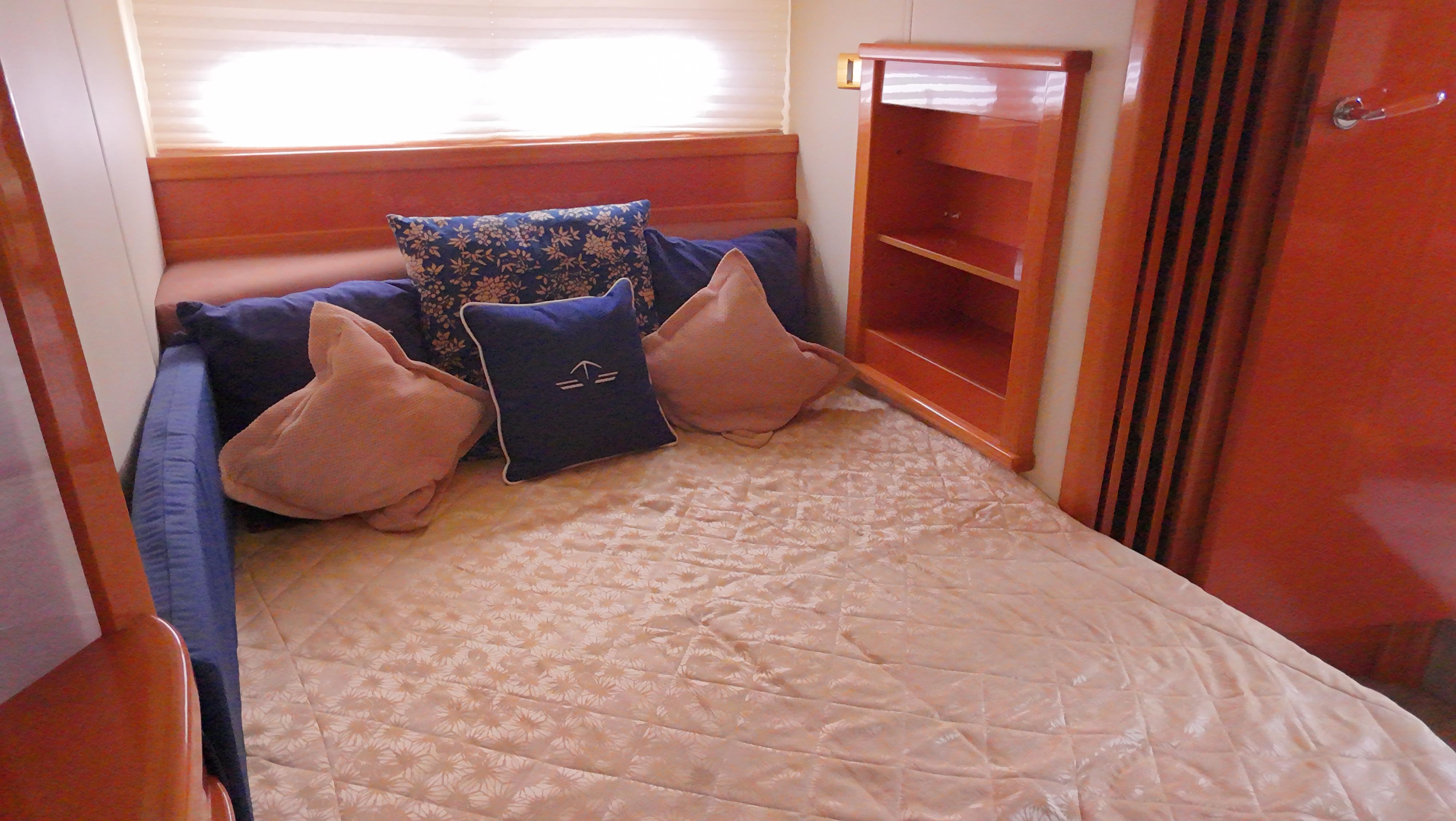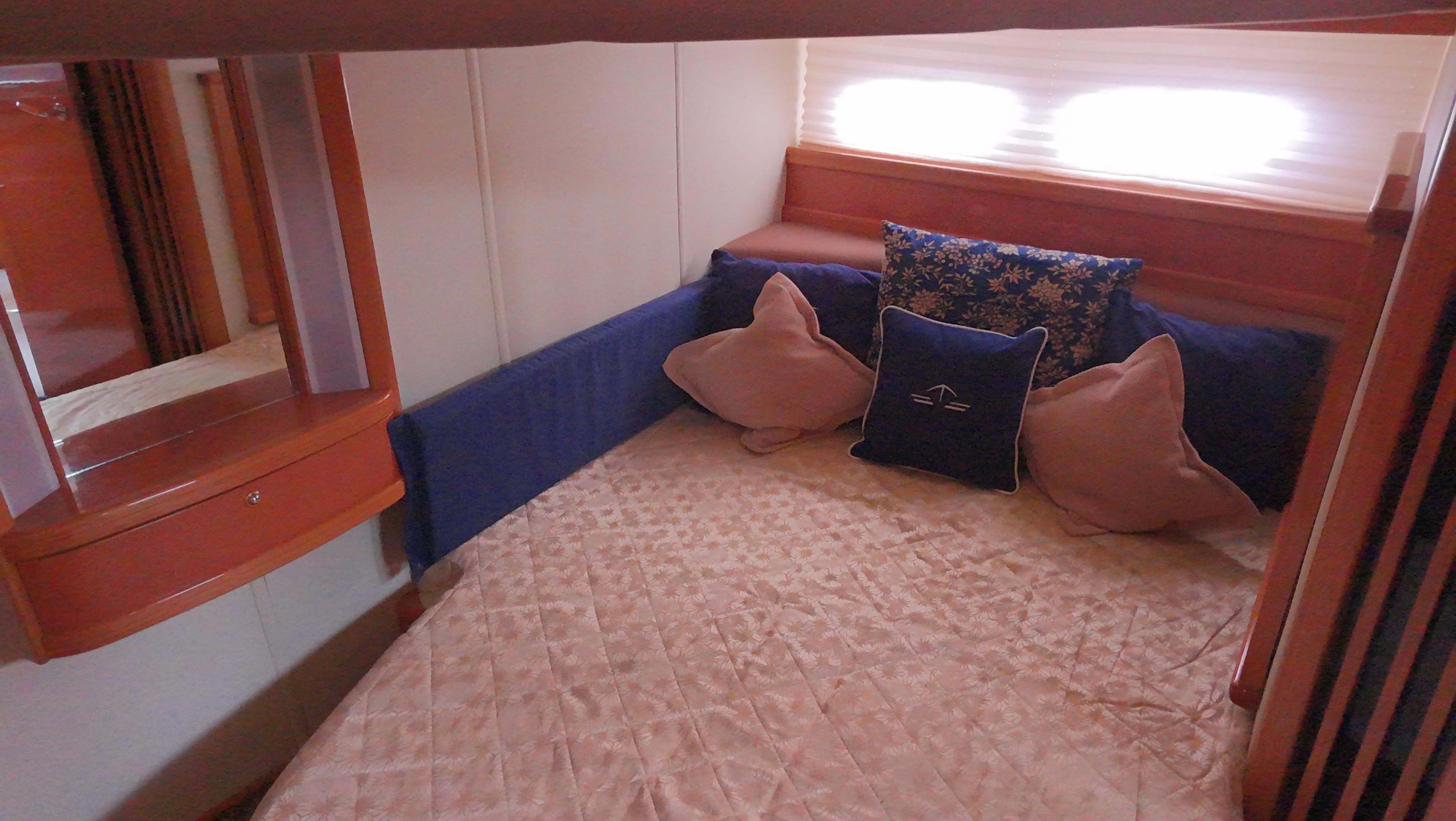 The aft master cabin has a double island berth with ensuite heads with a shower cubicle and glass partition. Vanity area with a sizeable wardrobe in each corner.