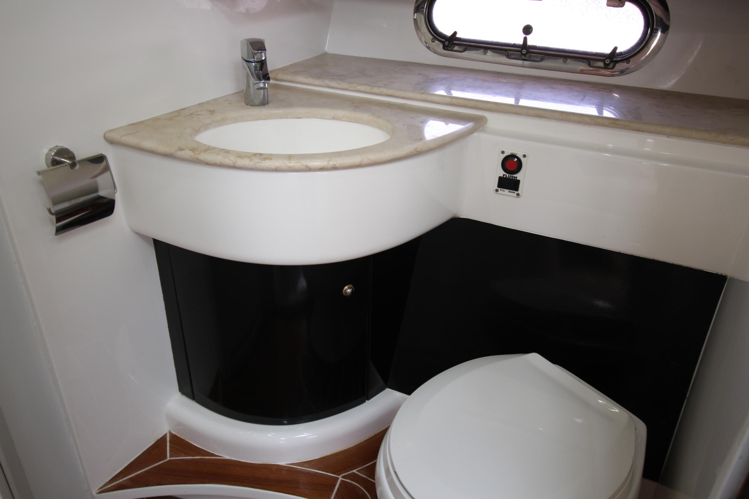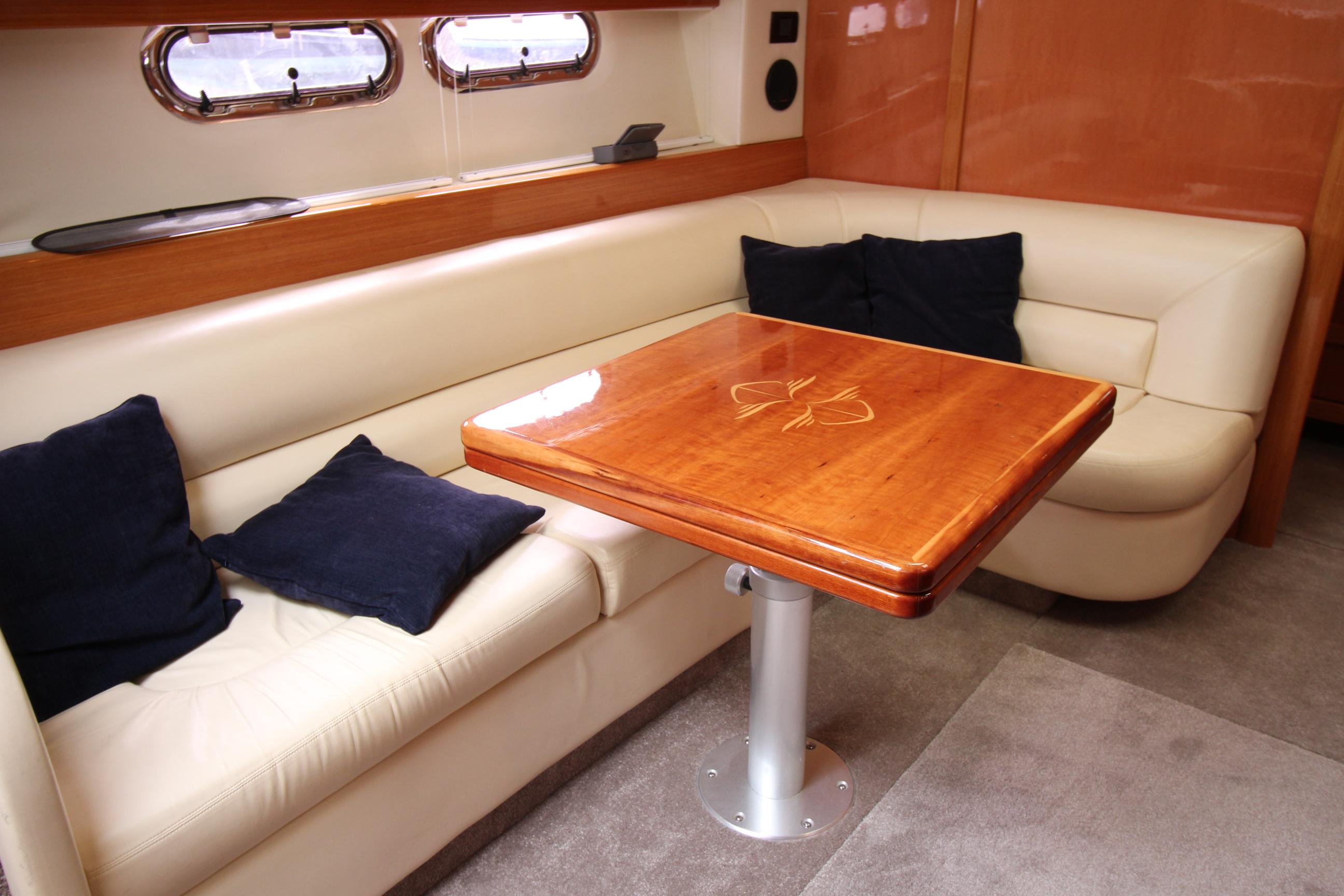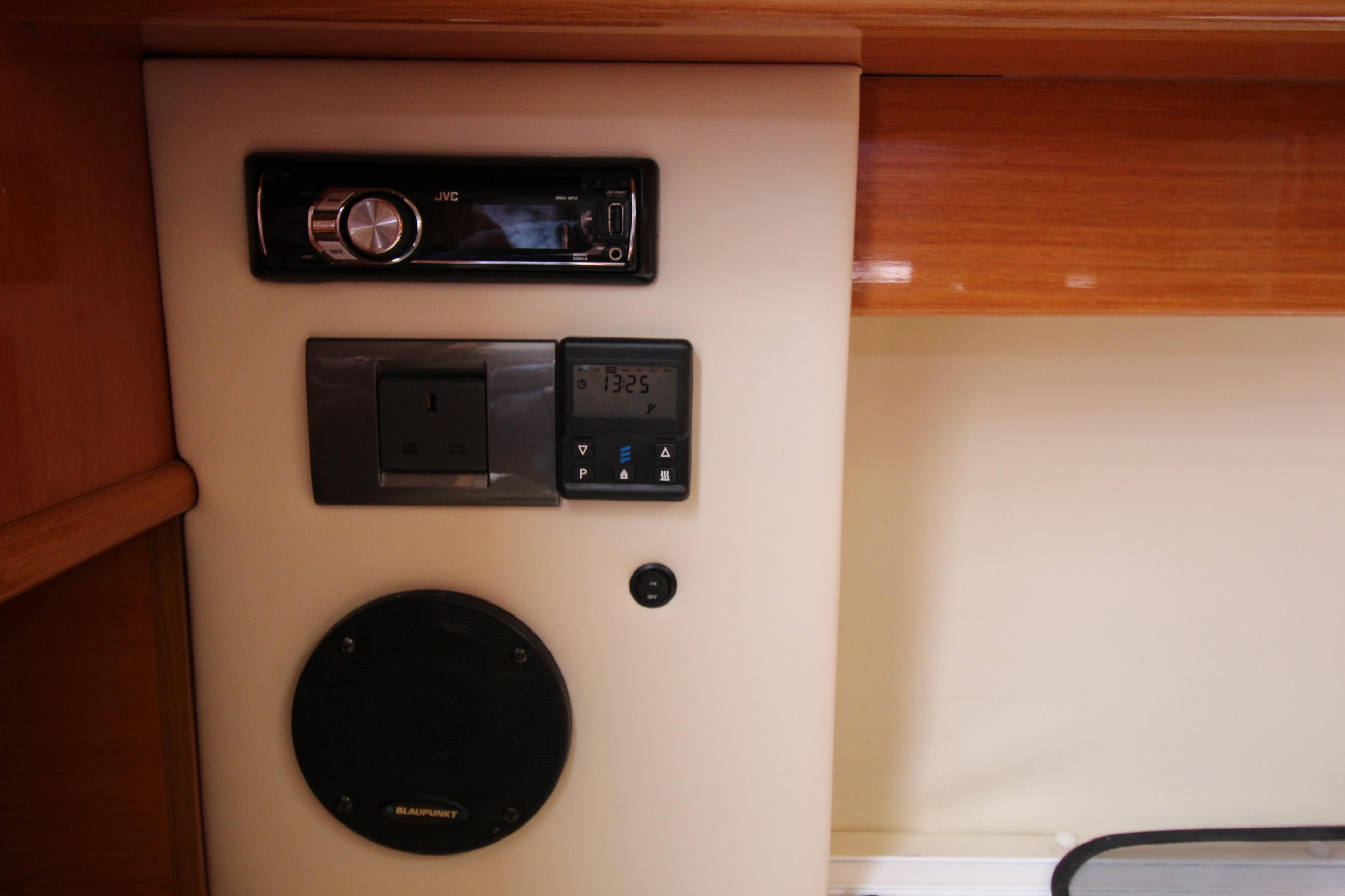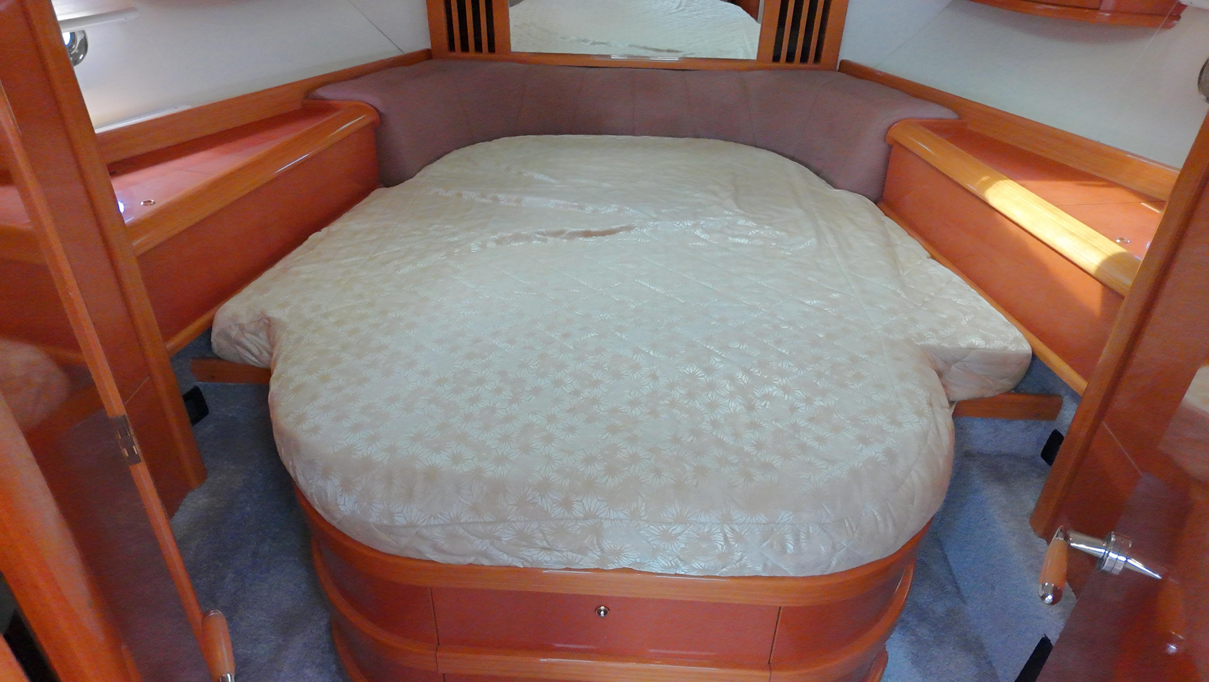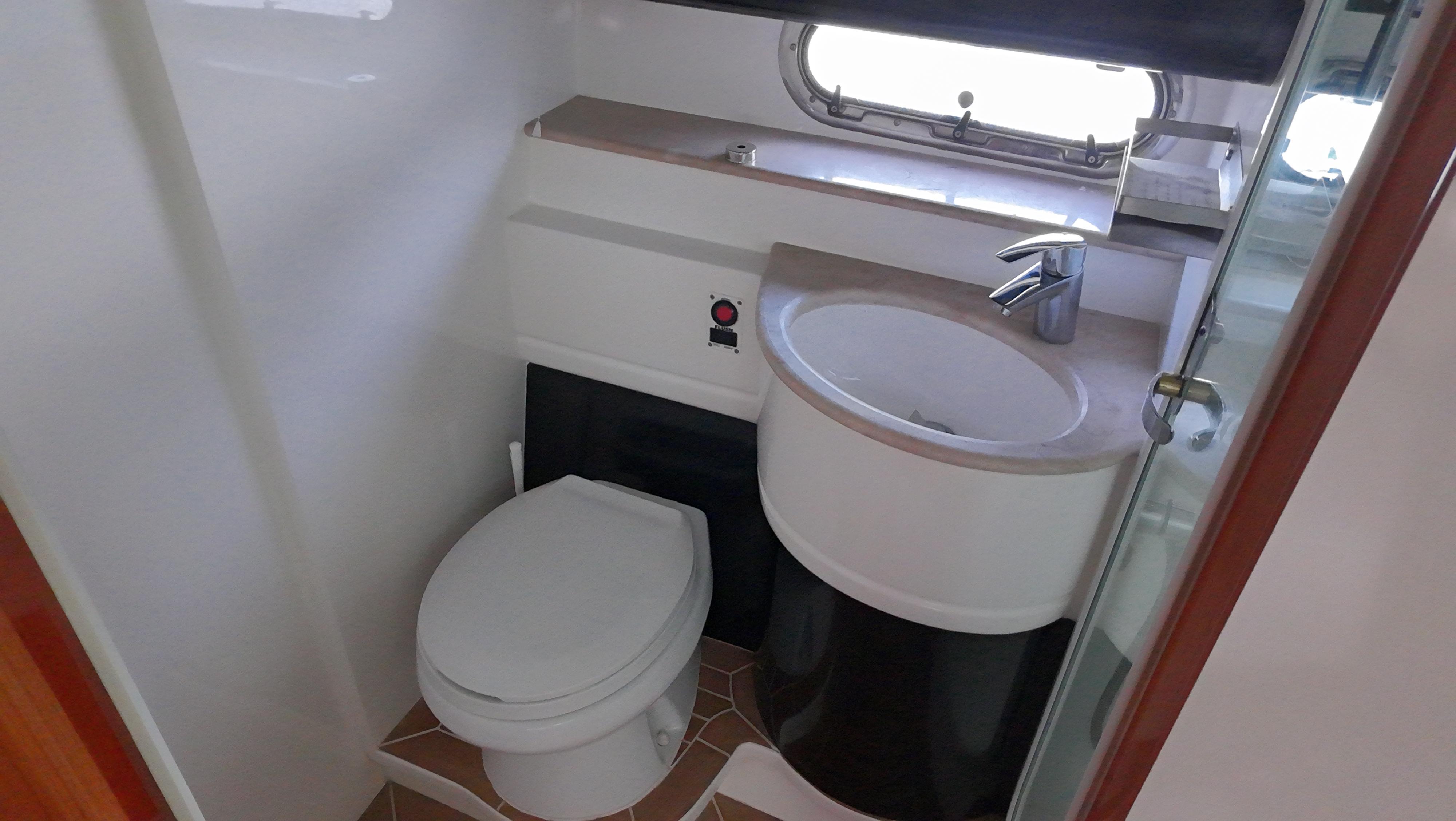 The forward cabin has a double island berth, a sprung mattress with heads accessible from the saloon with a separate shower compartment. Electric Jabsco heads.