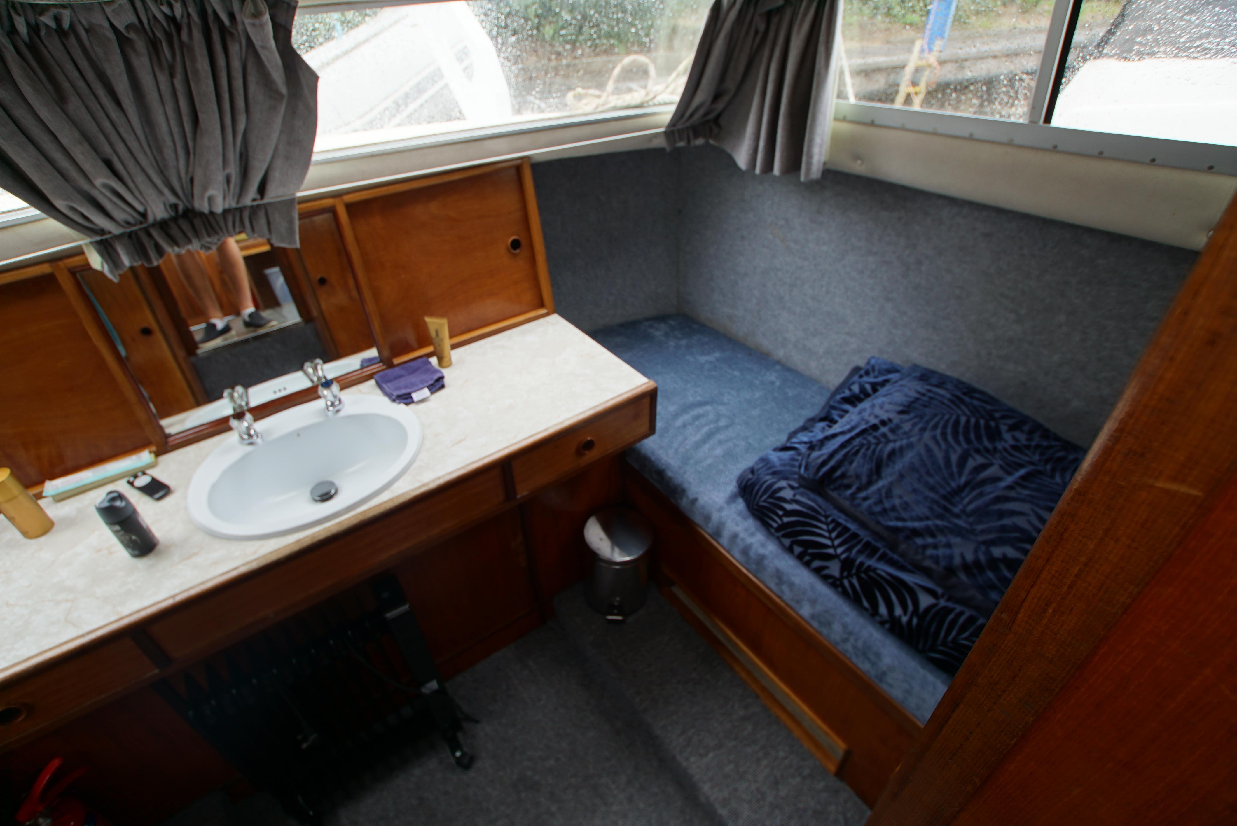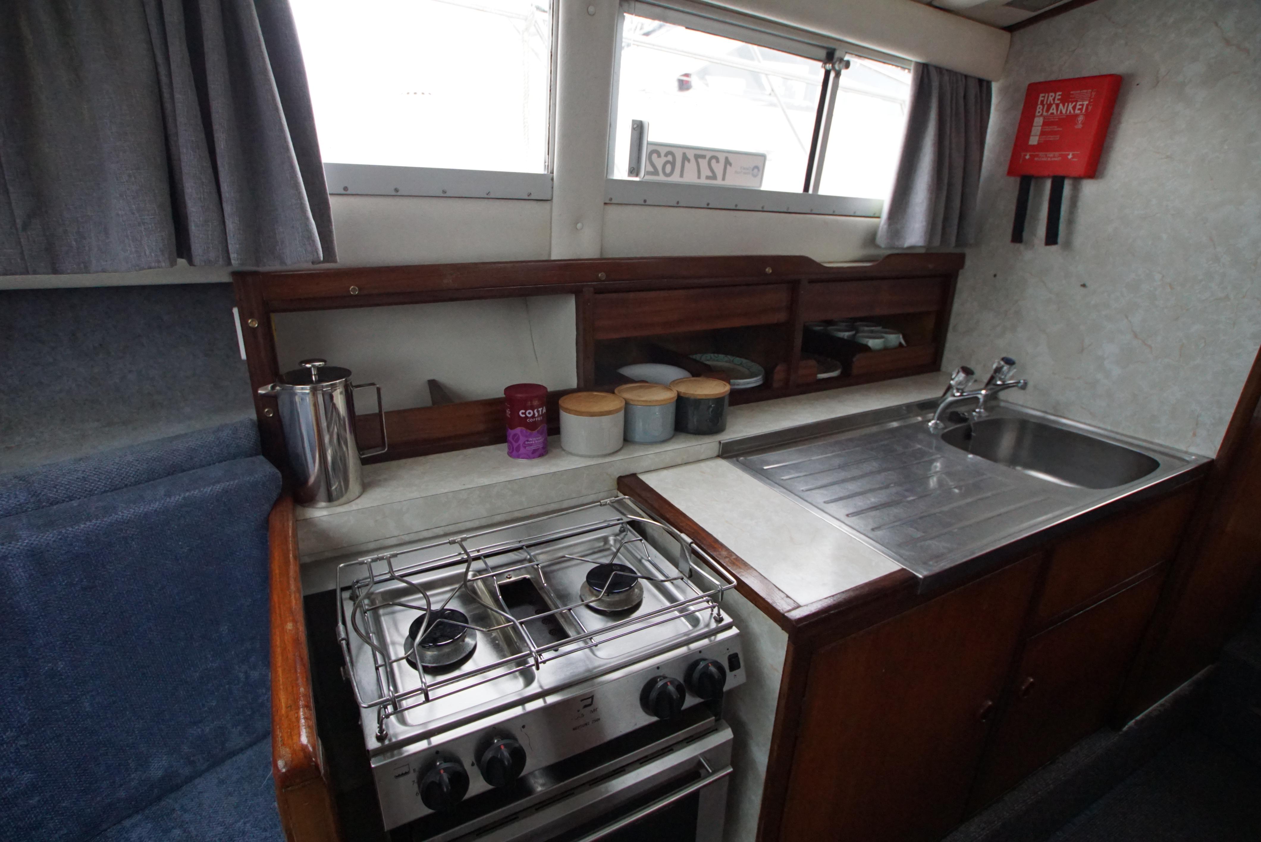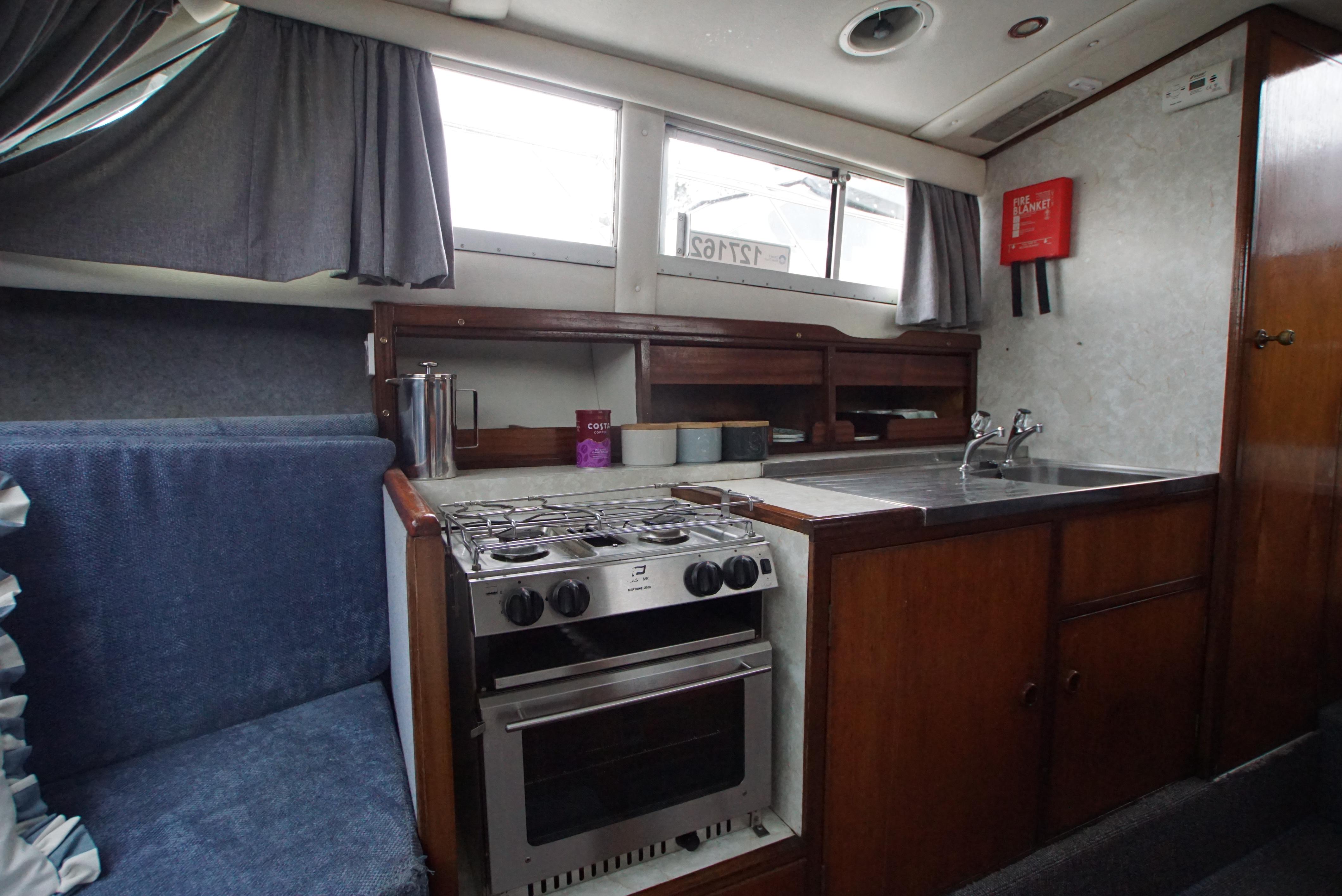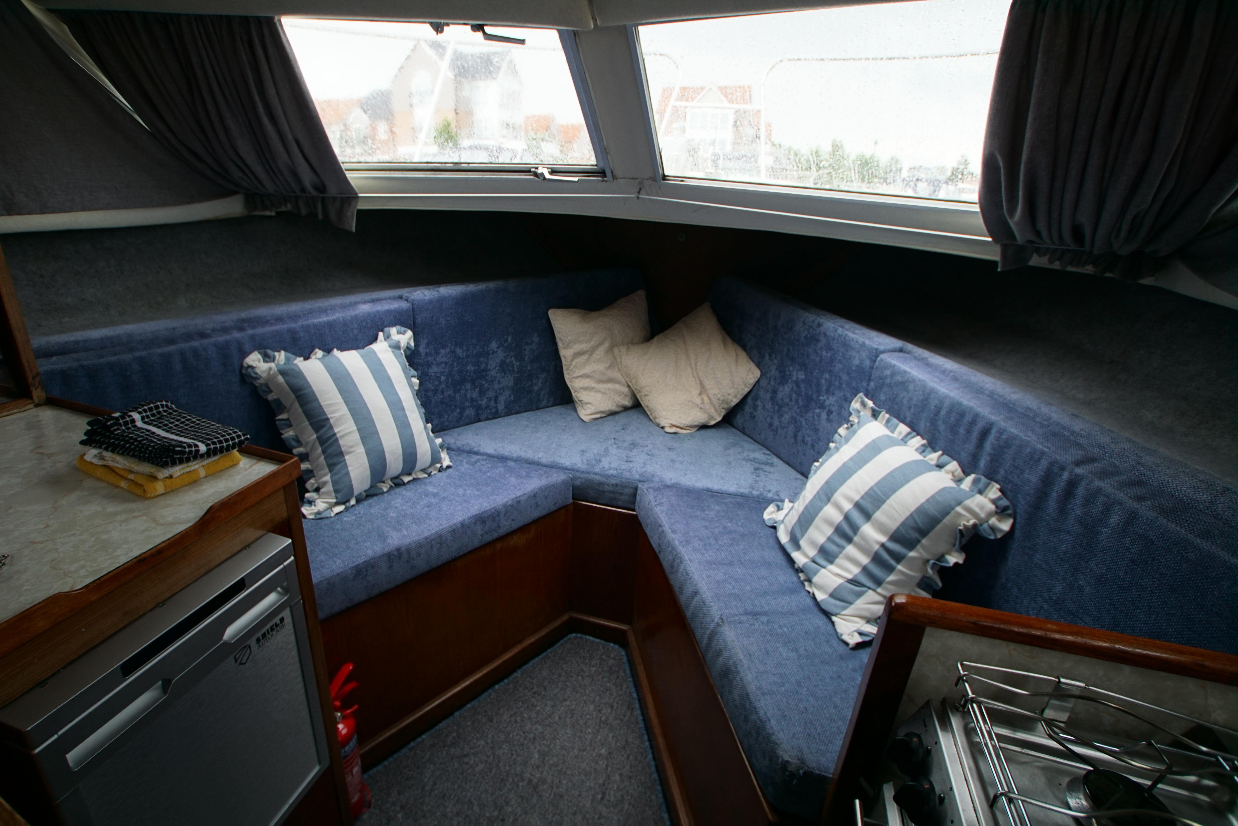 Accommodation – The aft cabin provides twin berths, with a wash basin and a vanity unit and also provides twin berths in the forepeak. Throughout the boat, there is plenty of storage located onboard, making it ideal for trips away. The saloon offers an excellent space for dining as well as relaxing with the saloon table and the forward seating. The galley is also well equipped with a fridge, gas cooker & hob,