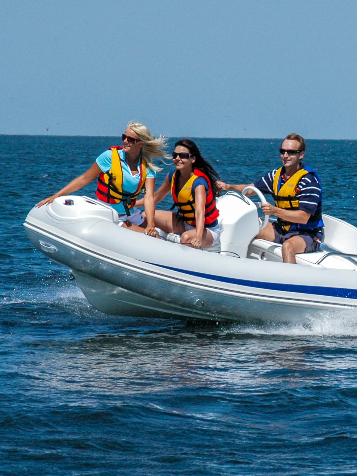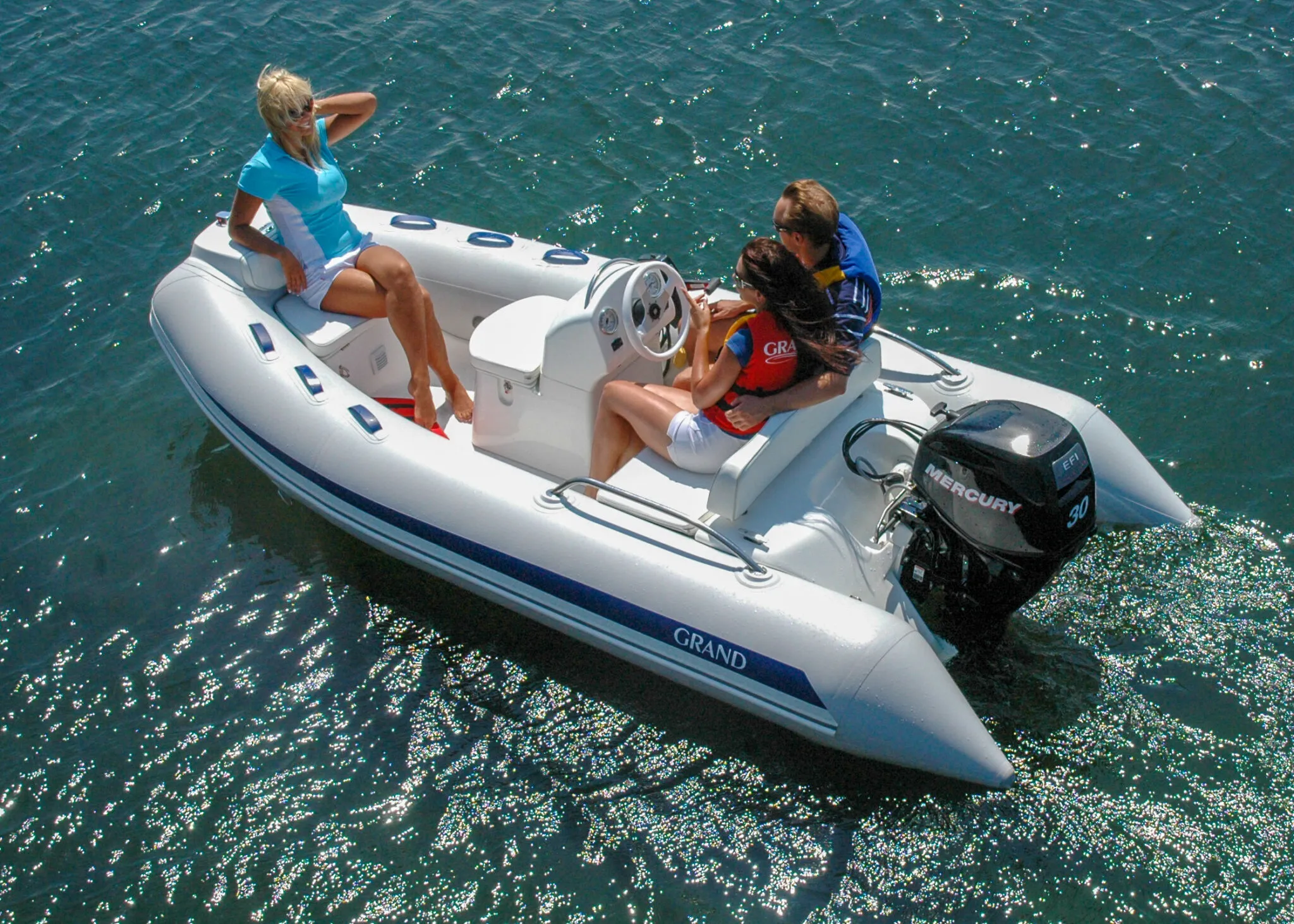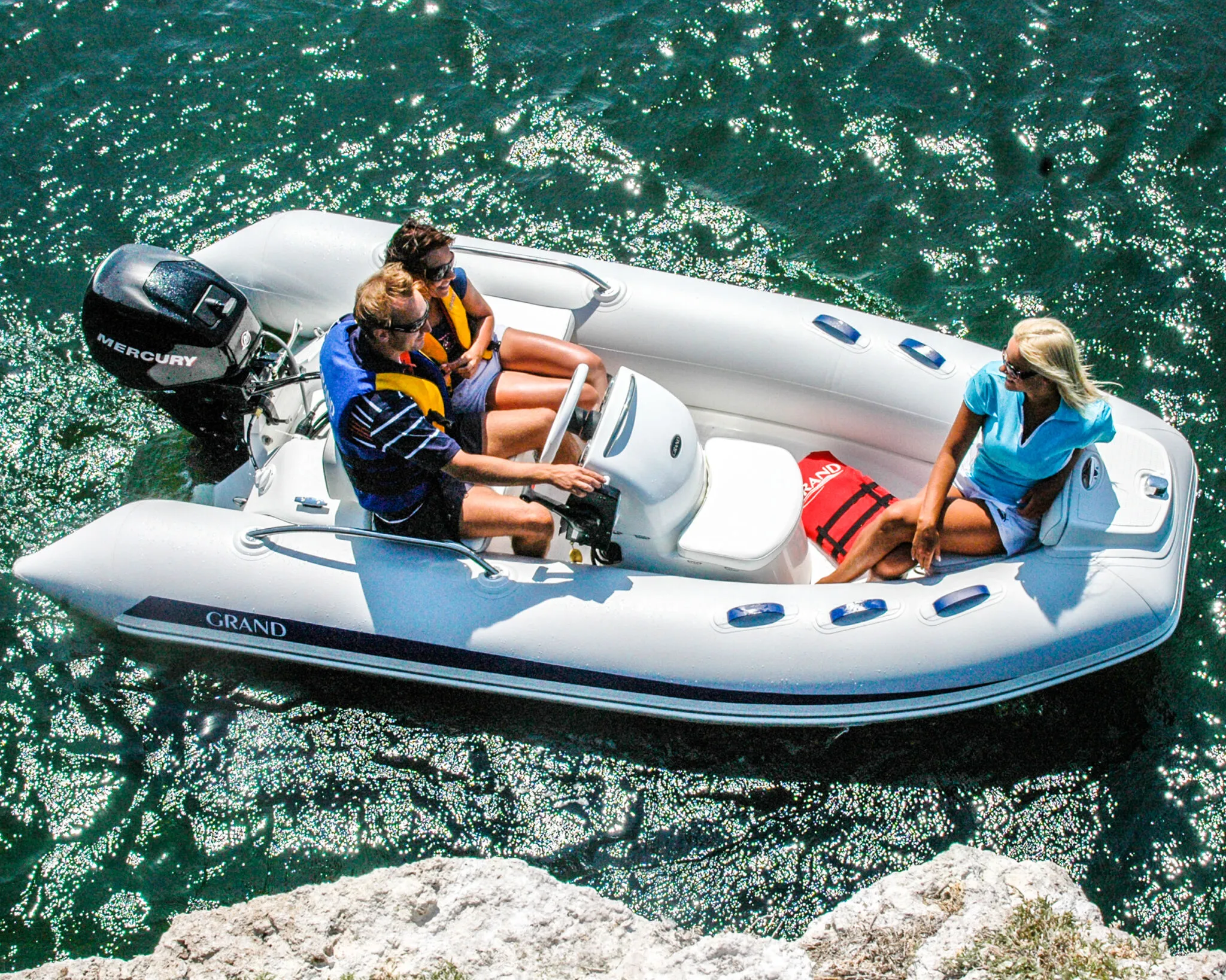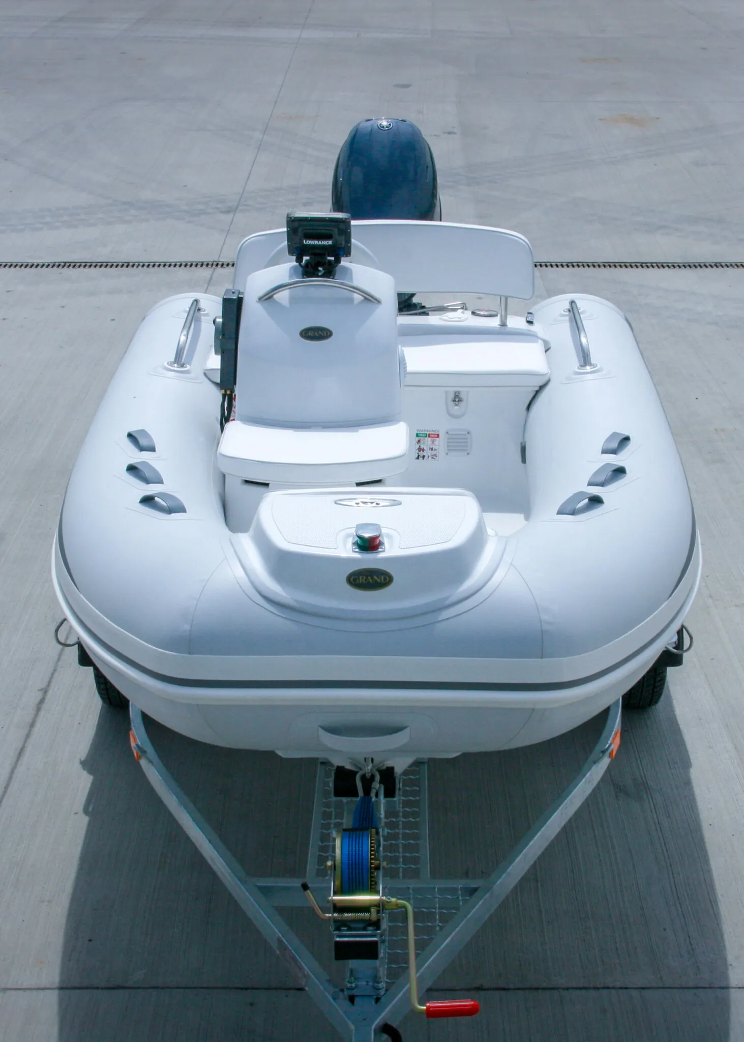 Other standard features include an extended bow step plate with pull-up cleat, navigation lights and soft seat back; A mechanical steering system with steering wheel with a low profile console including a handrail, folding back and front seat with removal cushion, A molded in lockable bow stowage with cushion, A molded in rear lockable seat with cushion and seat back, A bow grab handle and onboard safety grab handles. The Rib also has two rear safety handrails, three towing bow eyes, two front, two rear lifting eyes, two rear cleats, a cockpit draining system with one-way drain value and a full Maintenance and Electric package with a high efficiency foot pump, two paddles, User’s manual, Electric package with navigation lights, a bilge pump, electric horn, general and battery switches and complete wiring.