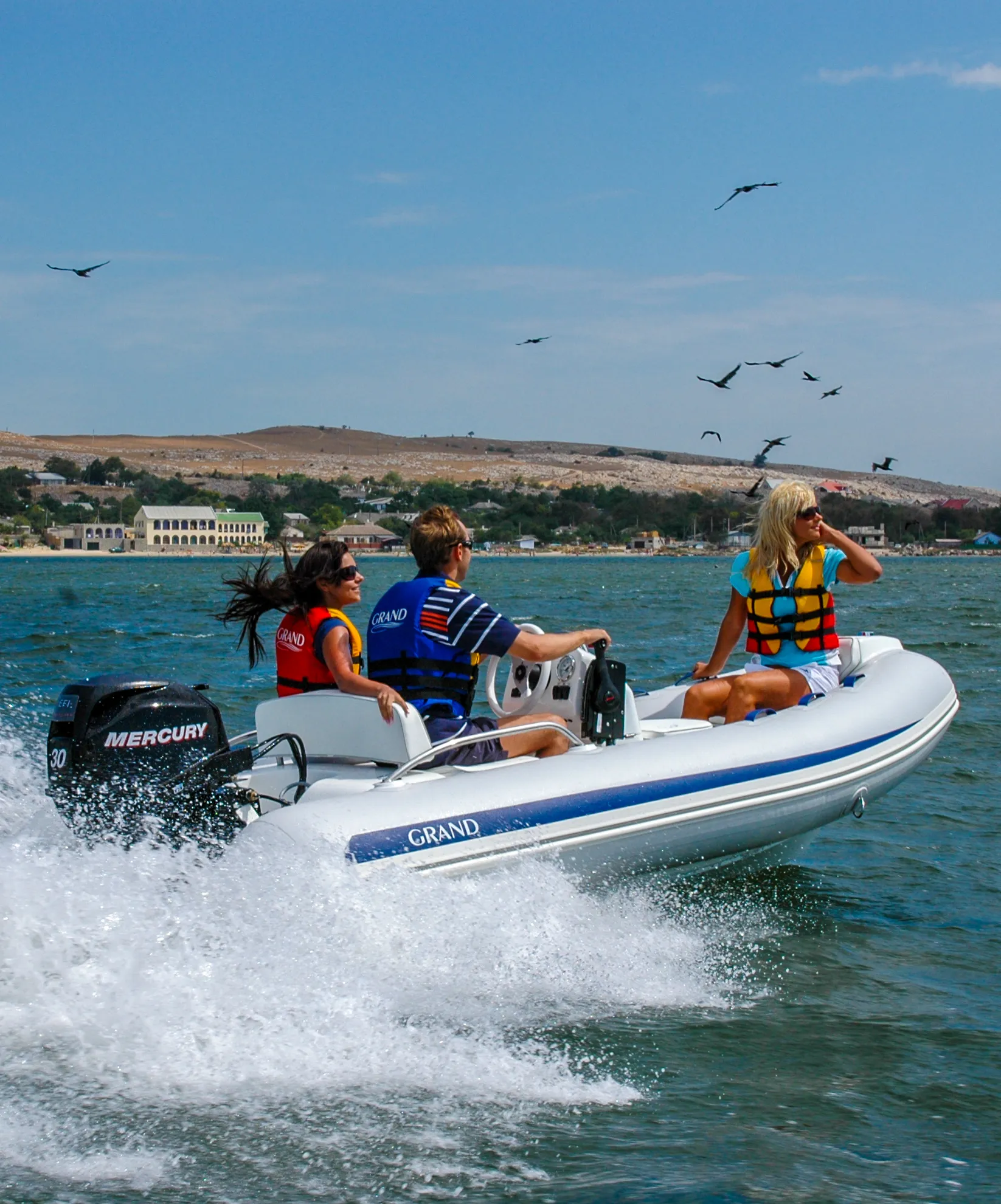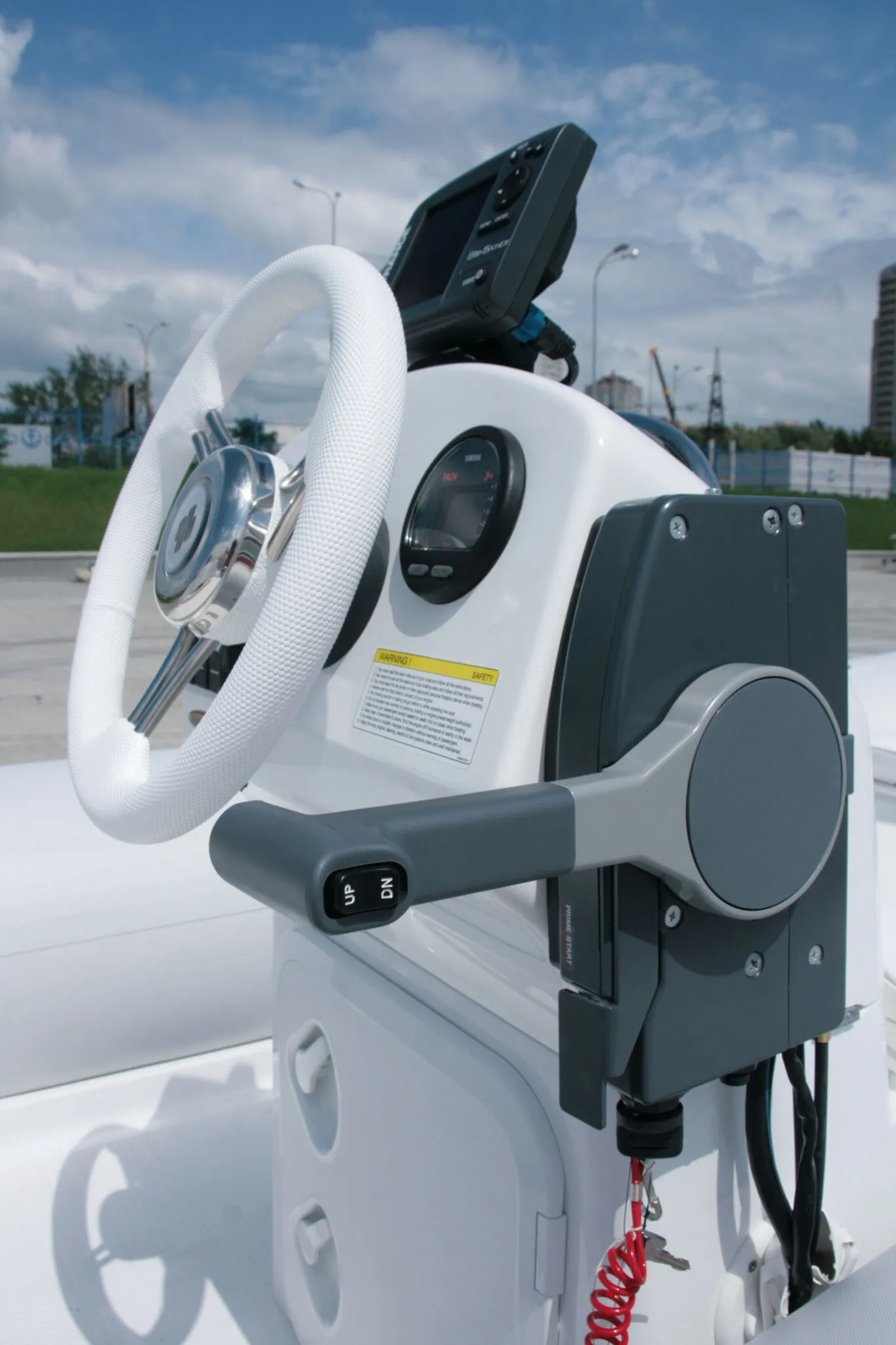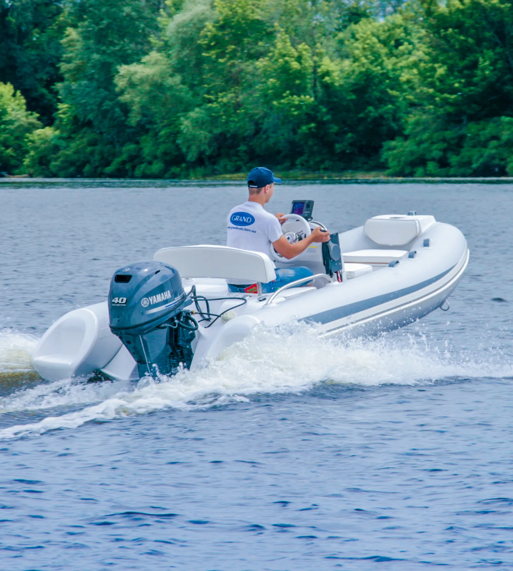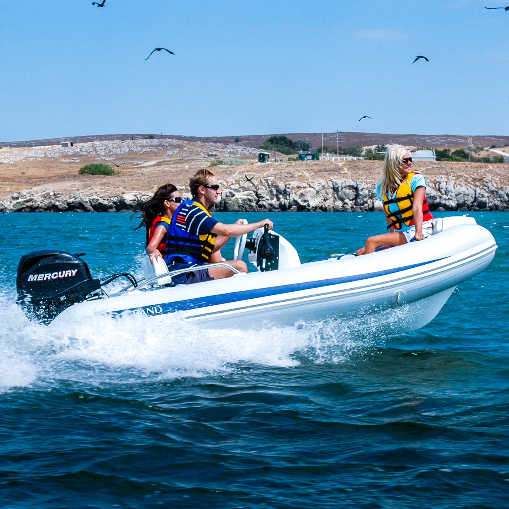 Other standard features include an extended bow step plate with pull-up cleat, navigation lights and soft seat back; A mechanical steering system with steering wheel with a low profile console including a handrail, folding back and front seat with removal cushion, A molded in lockable bow stowage with cushion, A molded in rear lockable seat with cushion and seat back, A bow grab handle and onboard safety grab handles. The Rib also has two rear safety handrails, three towing bow eyes, two front, two rear lifting eyes, two rear cleats, a cockpit draining system with one-way drain value and a full Maintenance and Electric package with a high efficiency foot pump, two paddles, User’s manual, Electric package with navigation lights, a bilge pump, electric horn, general and battery switches and complete wiring.
