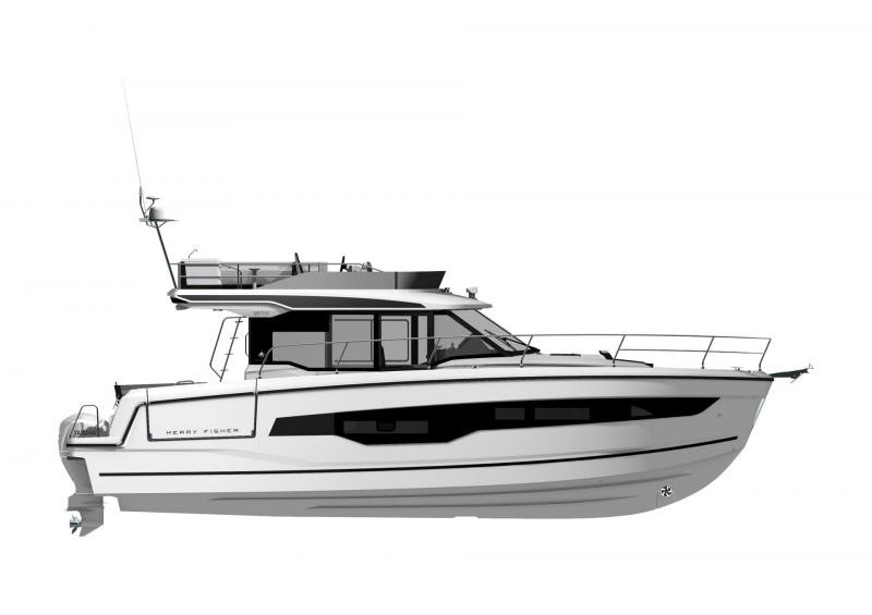 Large flybridge, Large glass window surfaces: a lot of brightness, Electric terrace (standard), Large hull windows (Merry Fisher identity), XXL lateral door, Side boarding door (on portside), 3-leaf bay-window opening to port or starboard, Swimming platforms (standard), Hydraulic gangway.