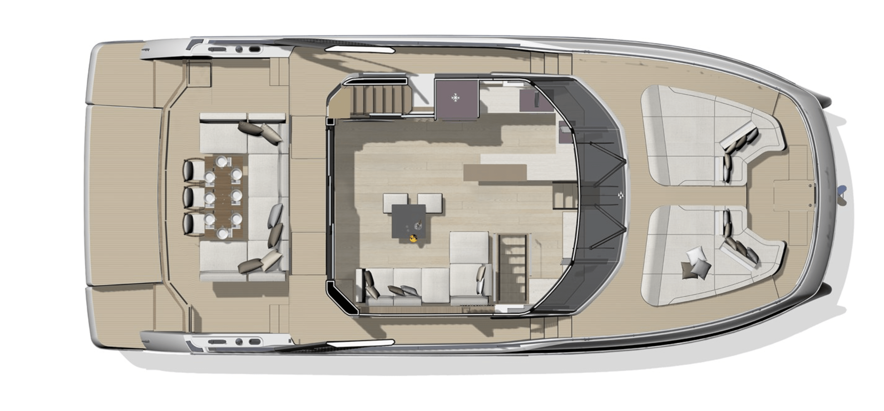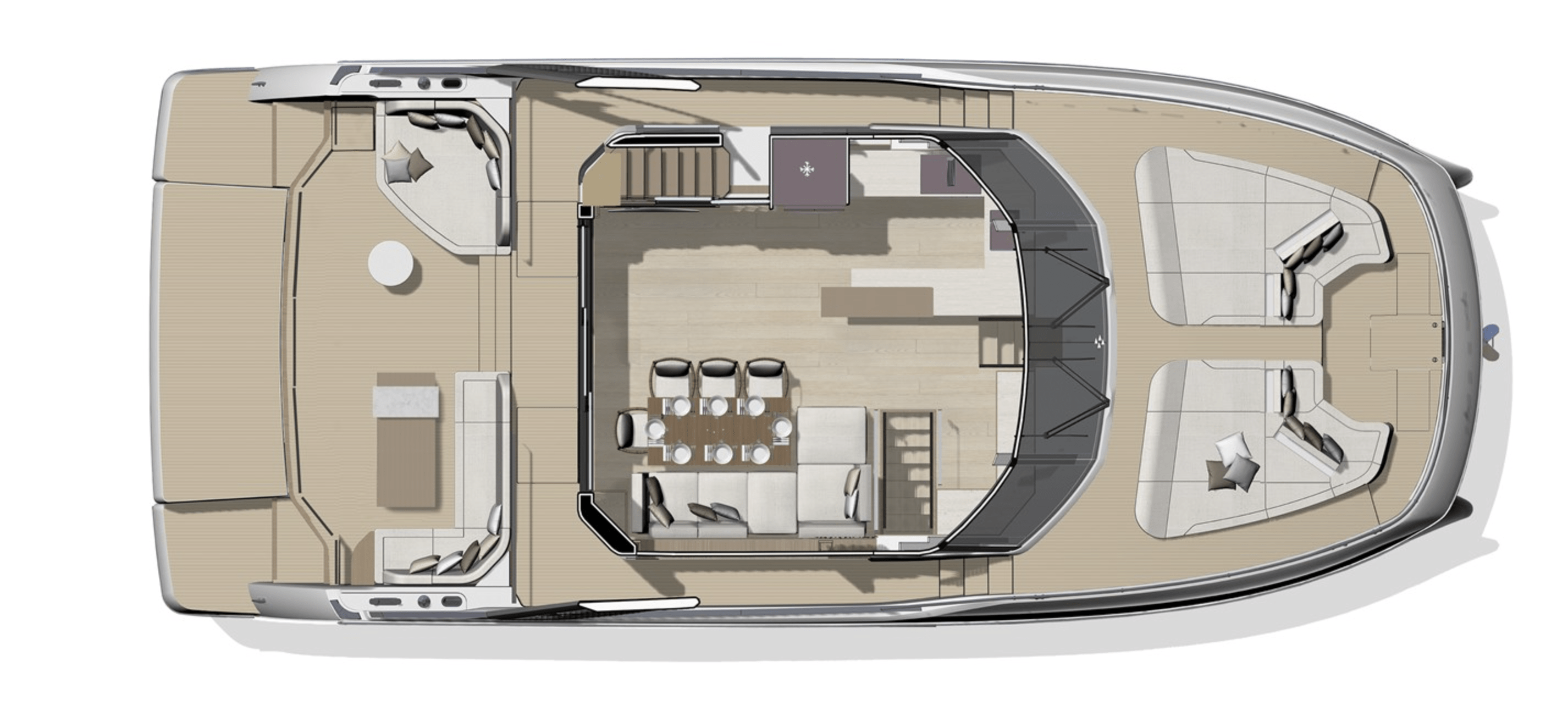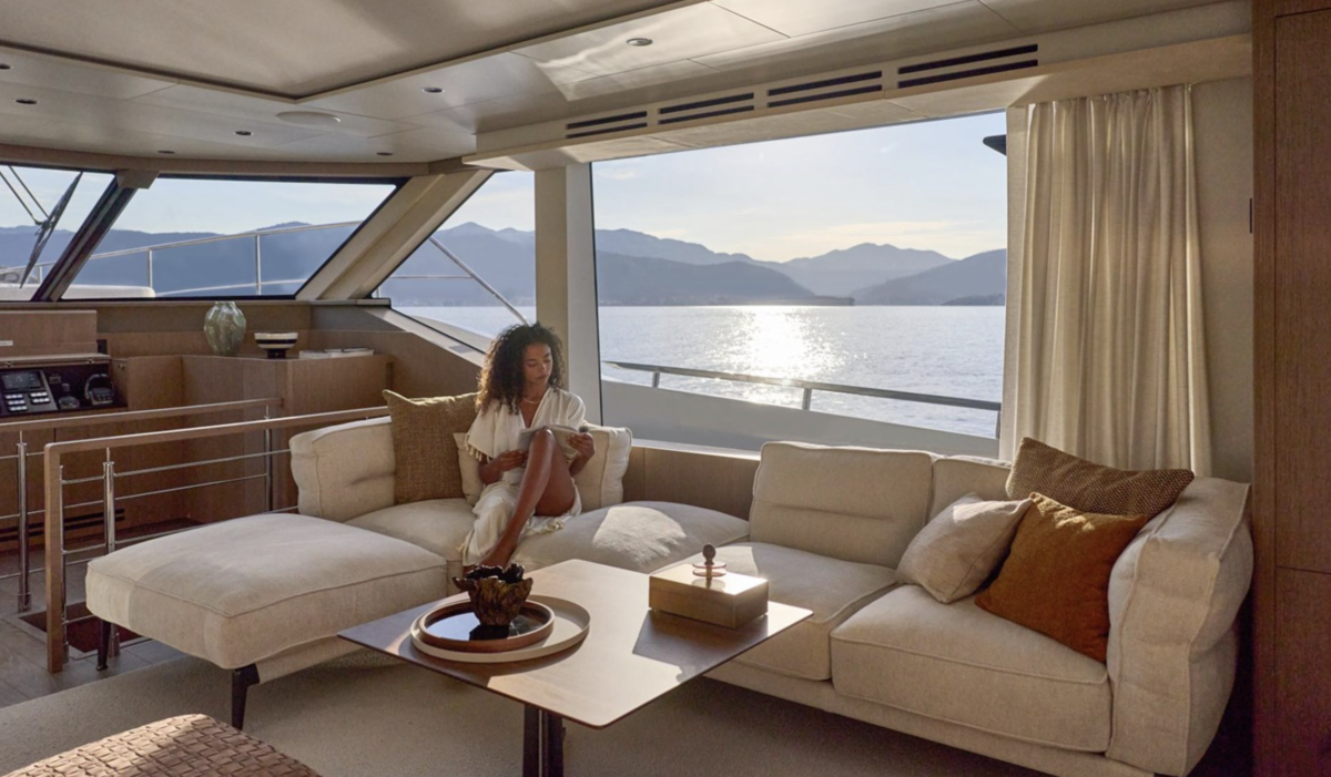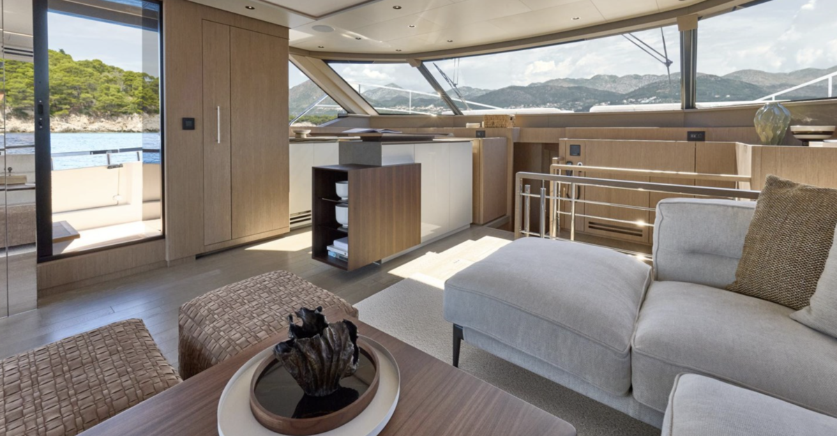 Exterior living spaces are optimized to ensure irreproachable safety for all o board: the side door leads directly to the sidedeck, while the integrated ladder to the upper deck provides secure access to the flybridge, which is also sheltered with the Skylounge option.