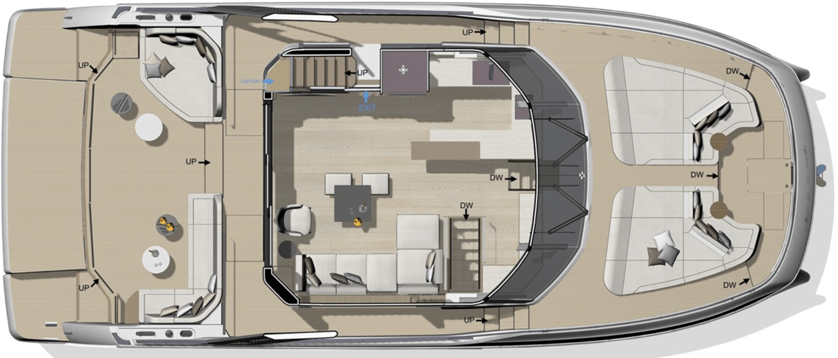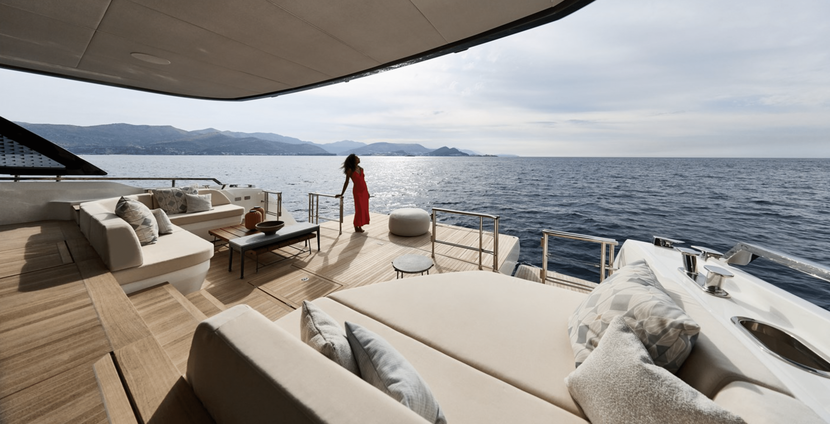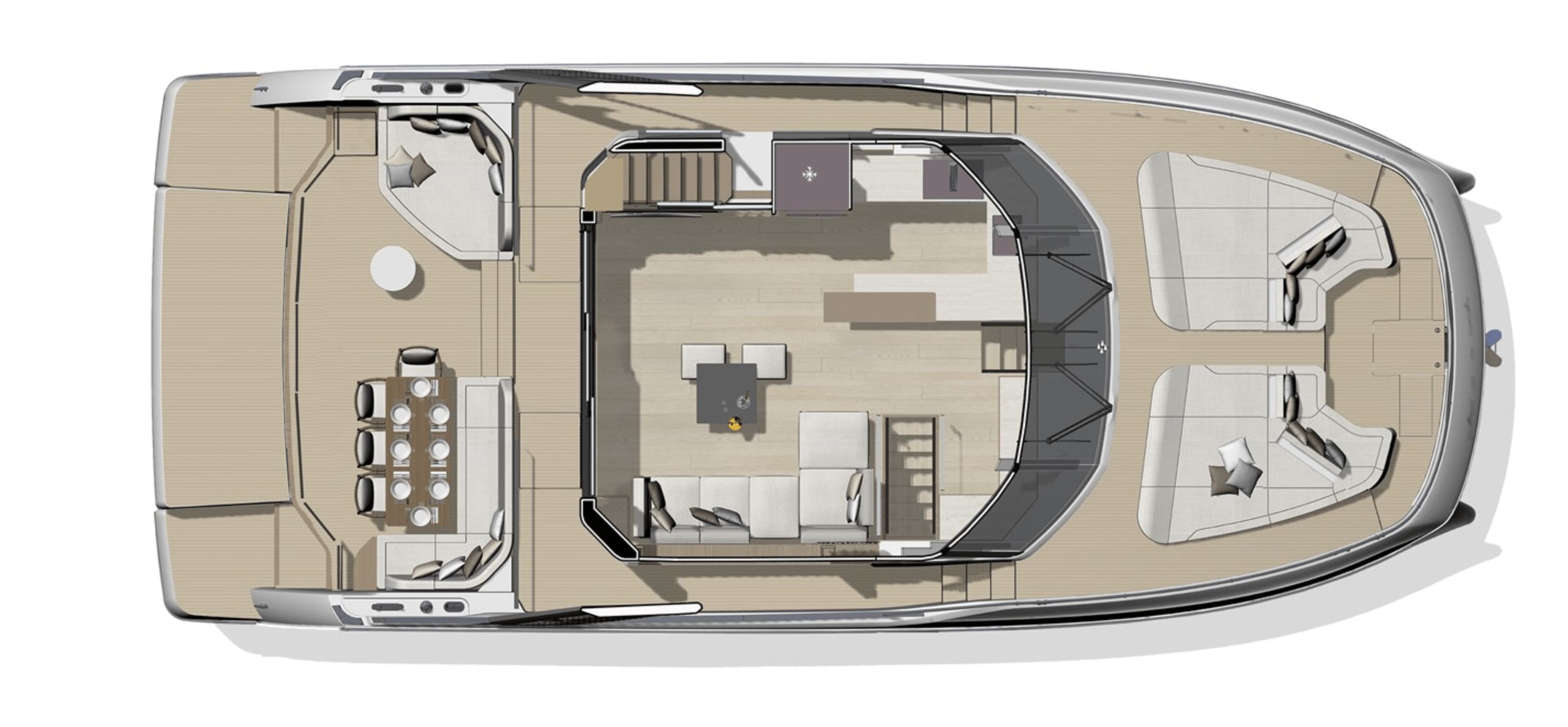 Exterior living spaces are optimized to ensure irreproachable safety for all o board: the side door leads directly to the sidedeck, while the integrated ladder to the upper deck provides secure access to the flybridge, which is also sheltered with the Skylounge option.