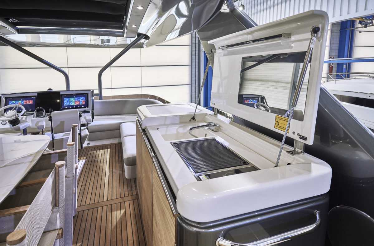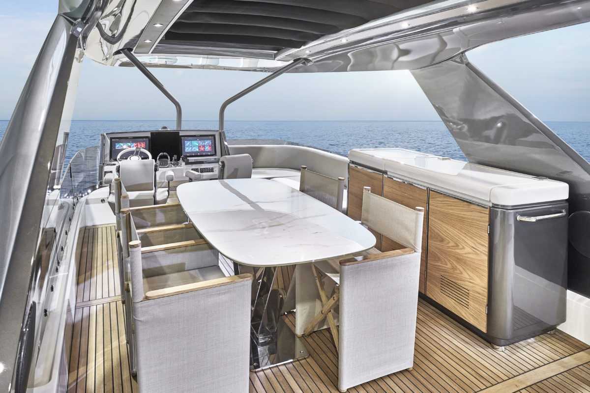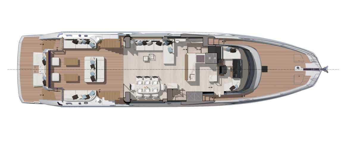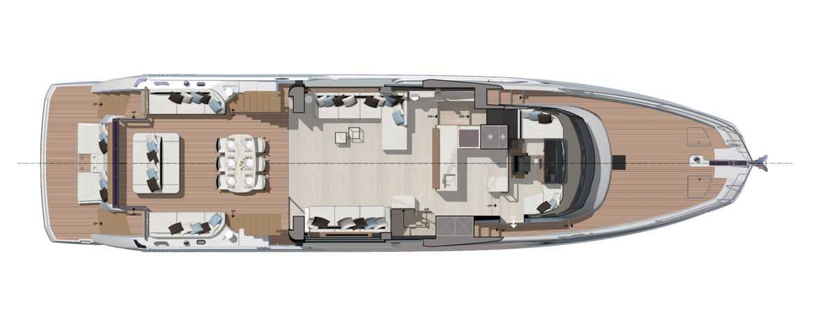 A unique architecture and layout by Prestige Yachts & Garroni Design Redistribution and blending together of interior and exterior living spaces by greatly increasing the cockpit size Moving the side decks to the flybridge: optimize space on the main deck and single storey volumes Connecting the flybridge with the foredeck for ease of movement and increased comfort Integrated a full Beach Club into the a4 platform providing additional entertaining space and a proximity to the water