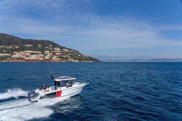 Generously sized open aft cockpit with three bench seats that fold up to provide more open space. Wheelhouse has aft and starboard sliding doors, forward double berth cabin and separate toilet compartment. Bow thruster and roof storage rack for a paddleboard or kayak. This Merry Fisher 795 Sport is powered by a Yamaha200hp outboard.
