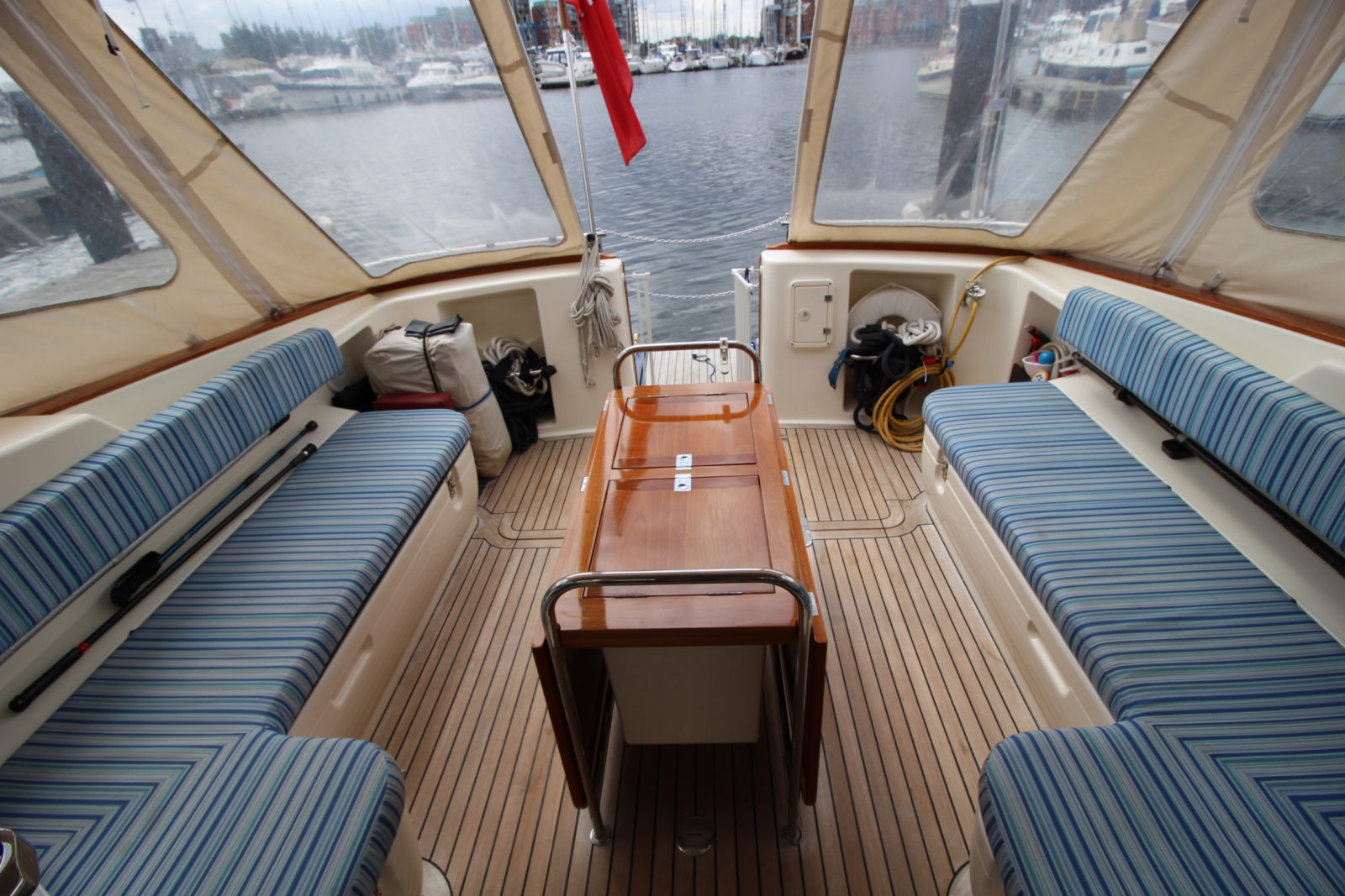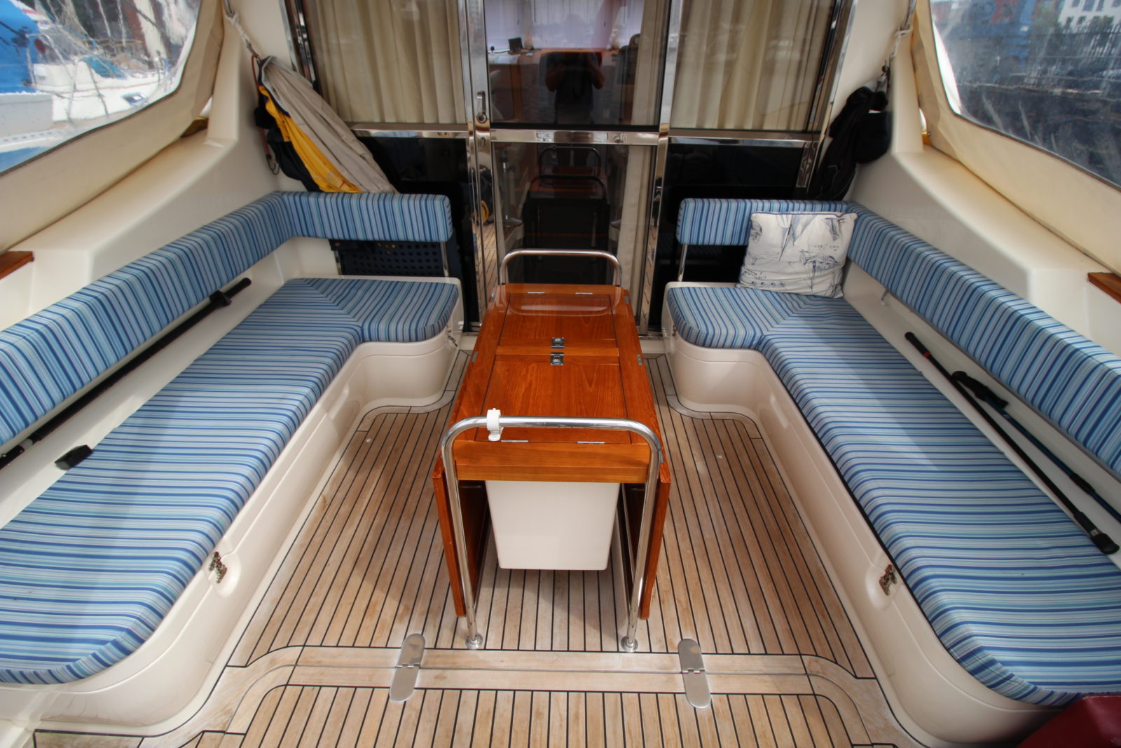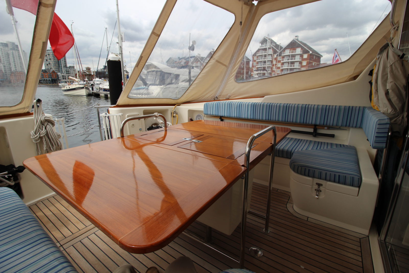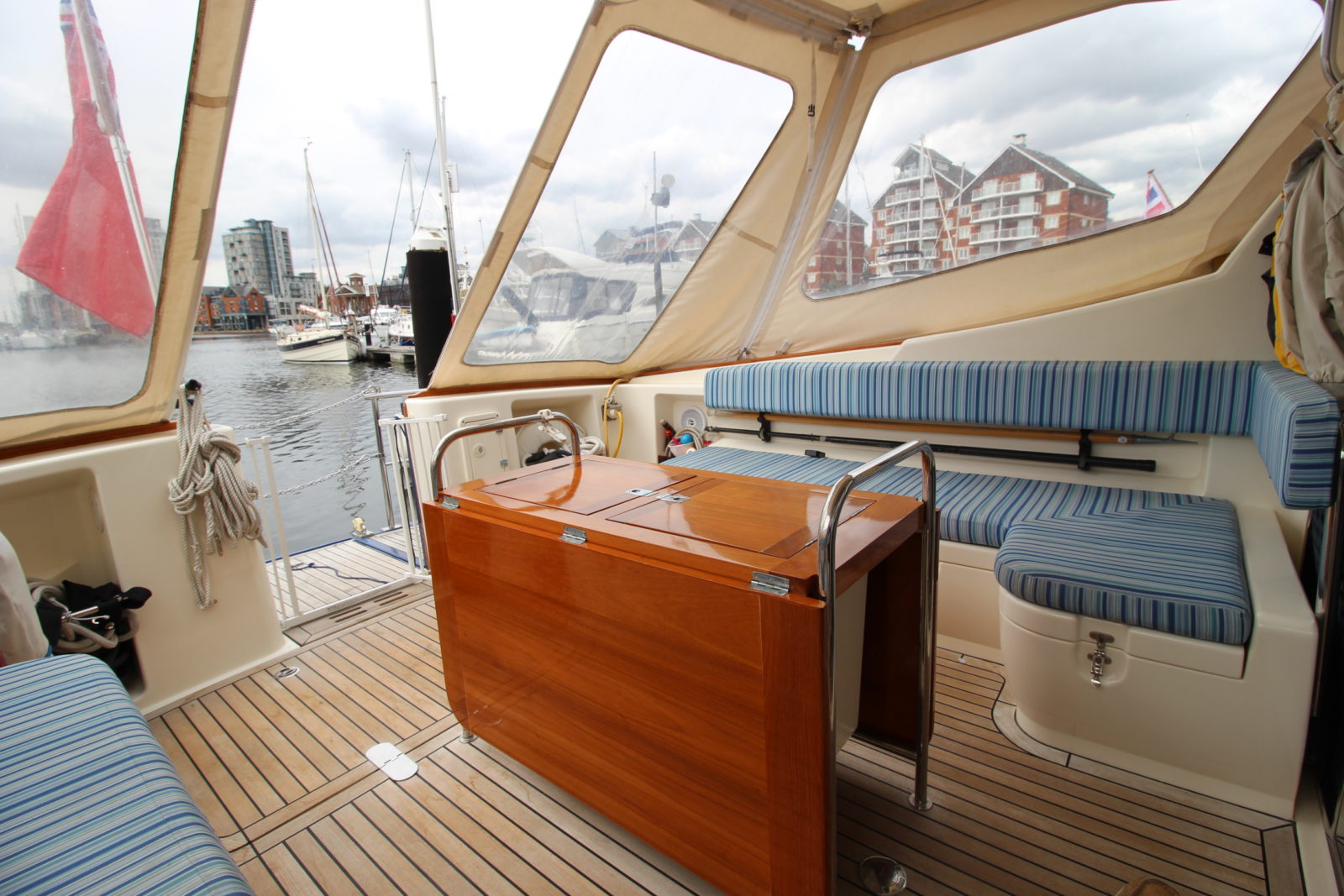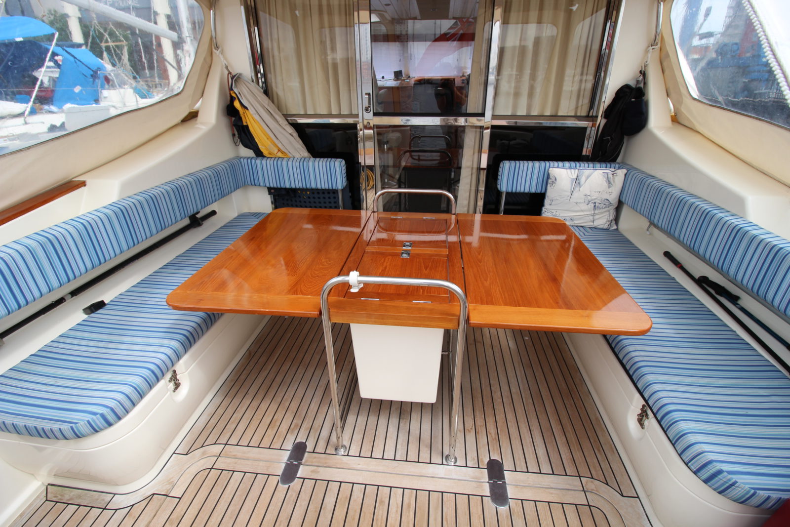 The aft cockpit has ample seating space to port and starboard with storage underneath and a large varnished teak steel table with a refrigerated interior.