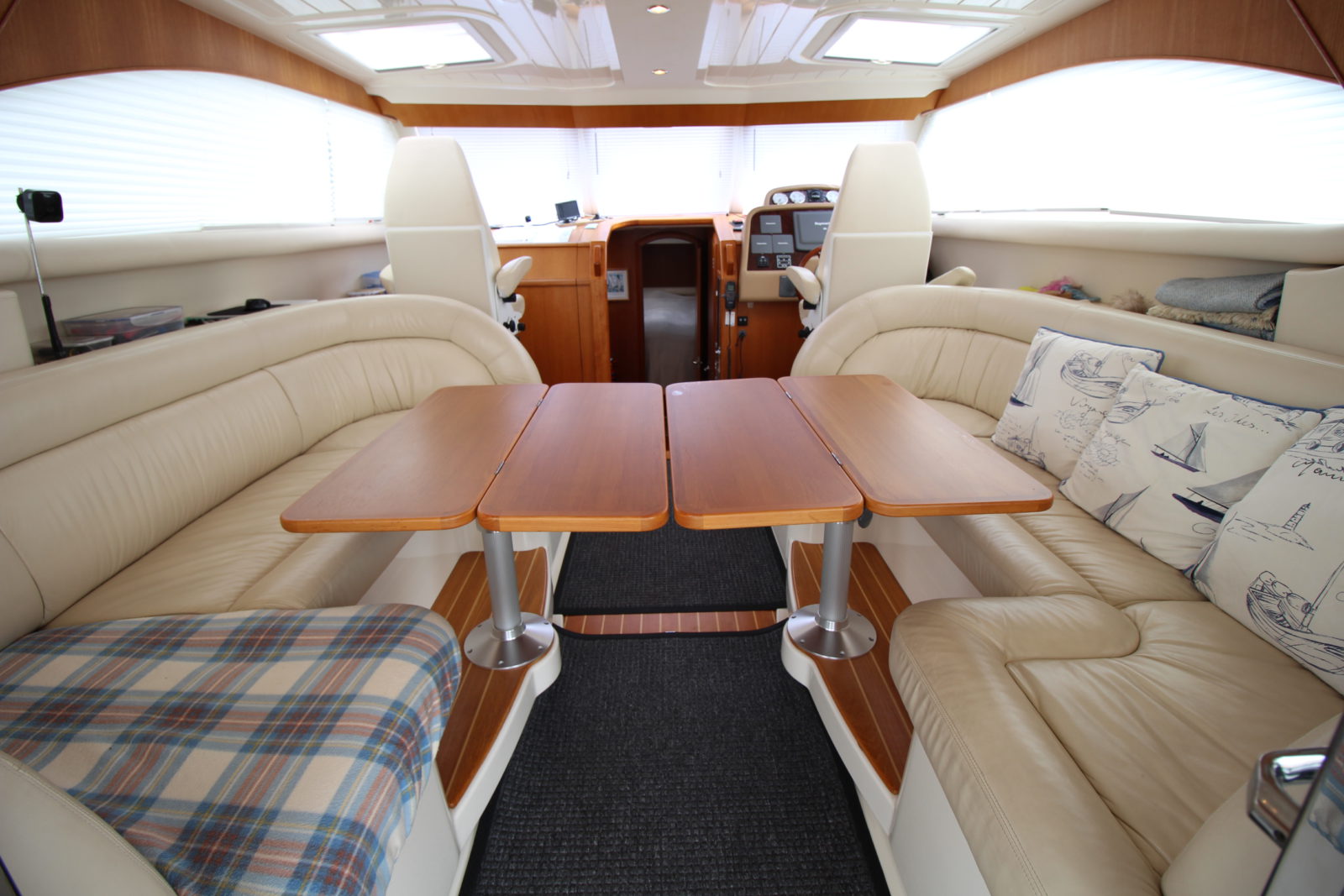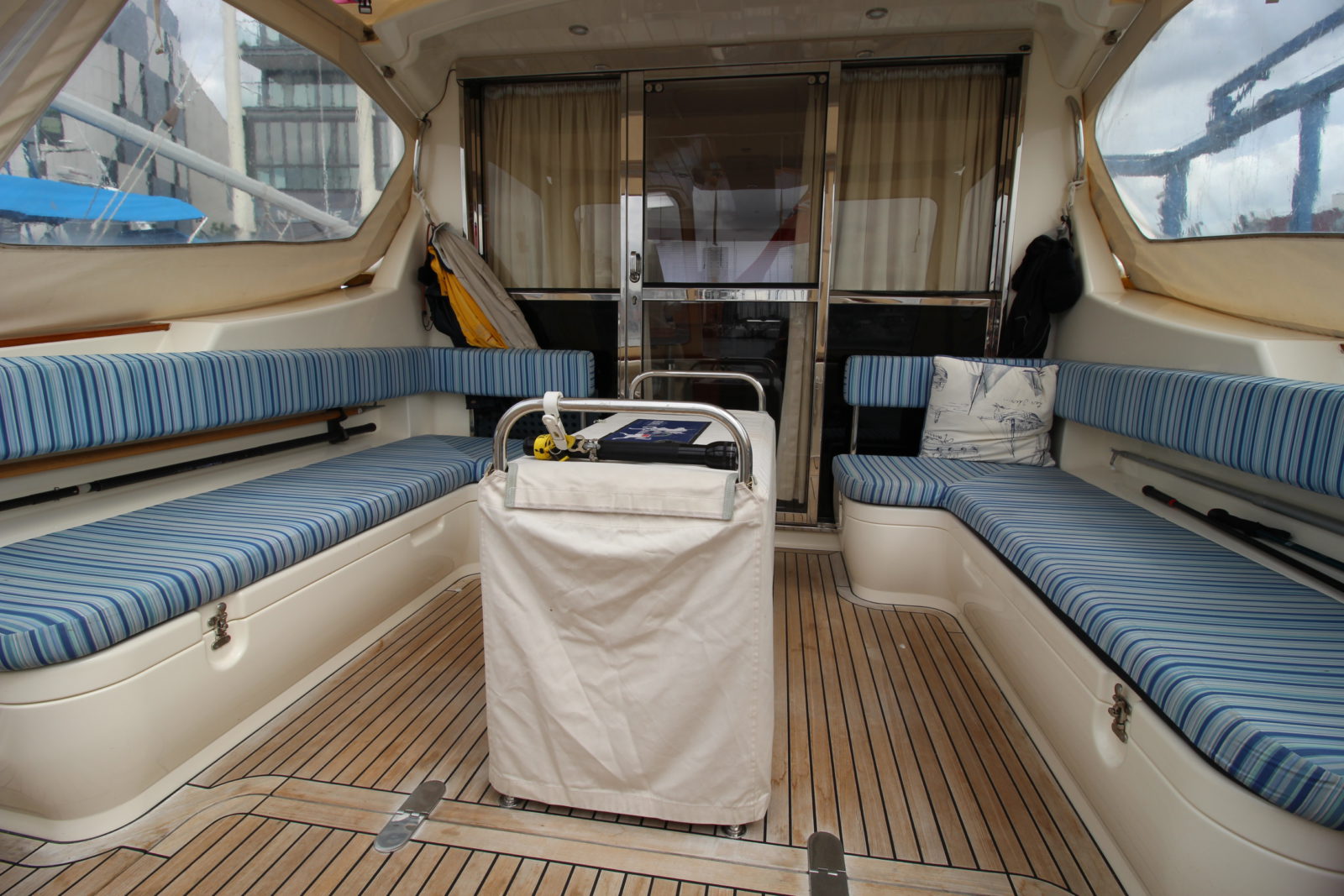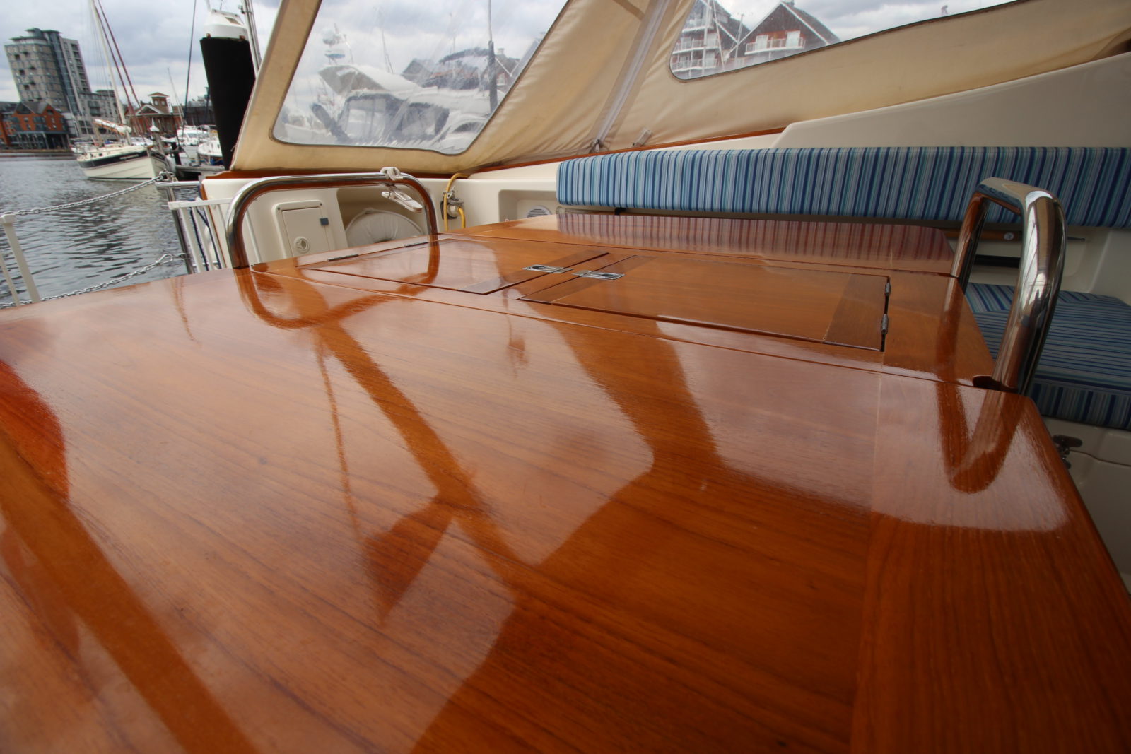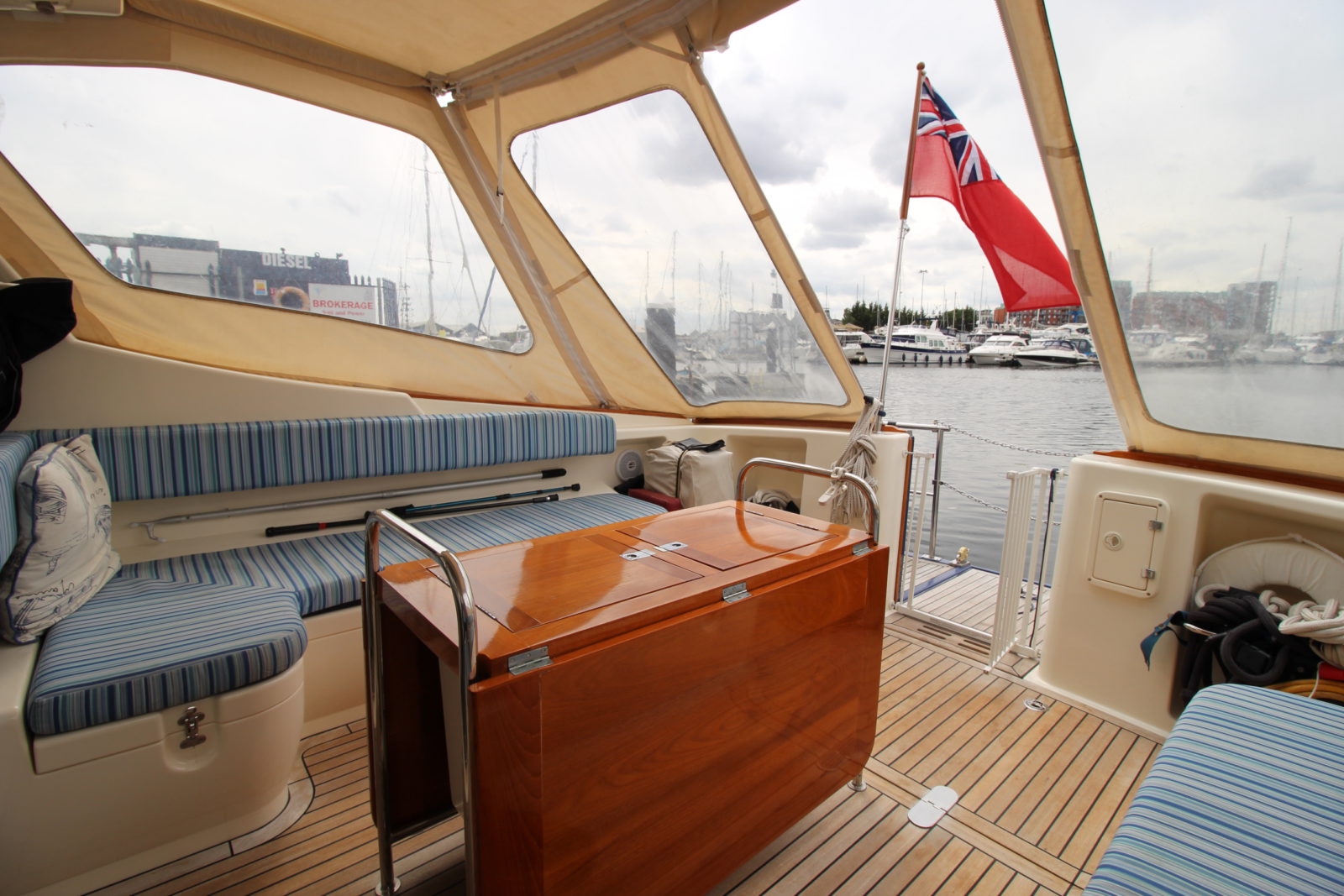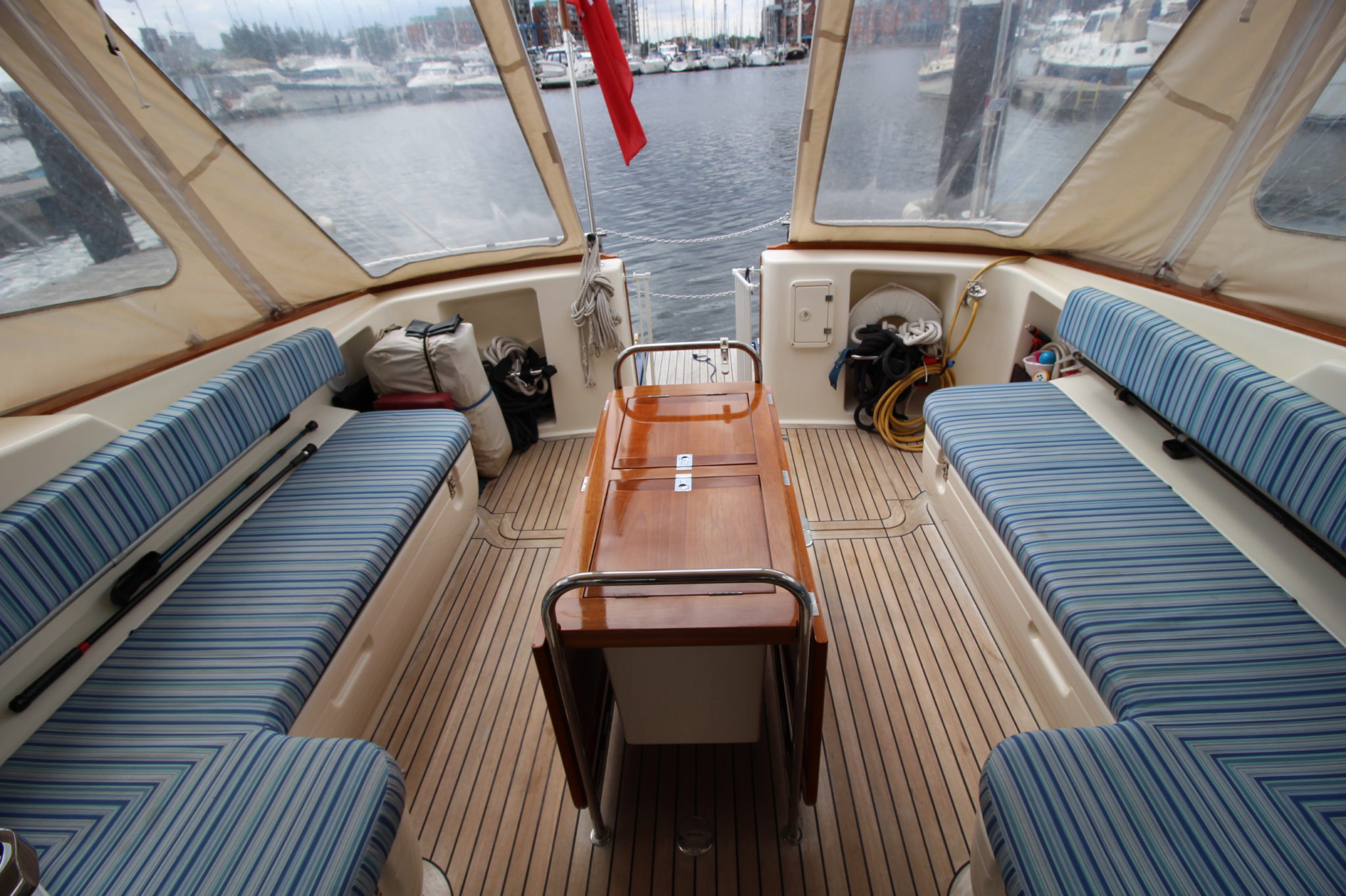 The aft cockpit has ample seating space to port and starboard with storage underneath and a large varnished teak steel table with a refrigerated interior.