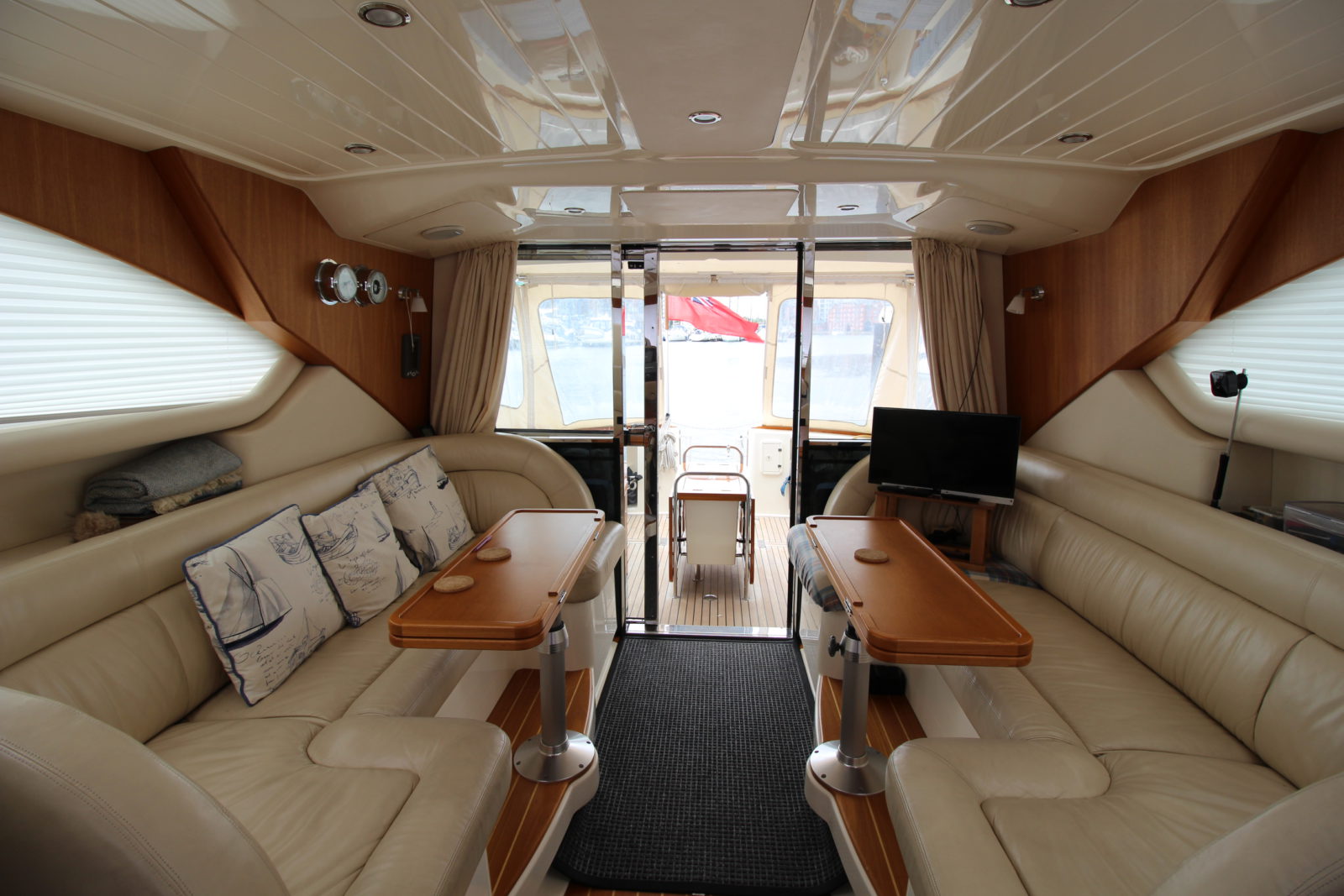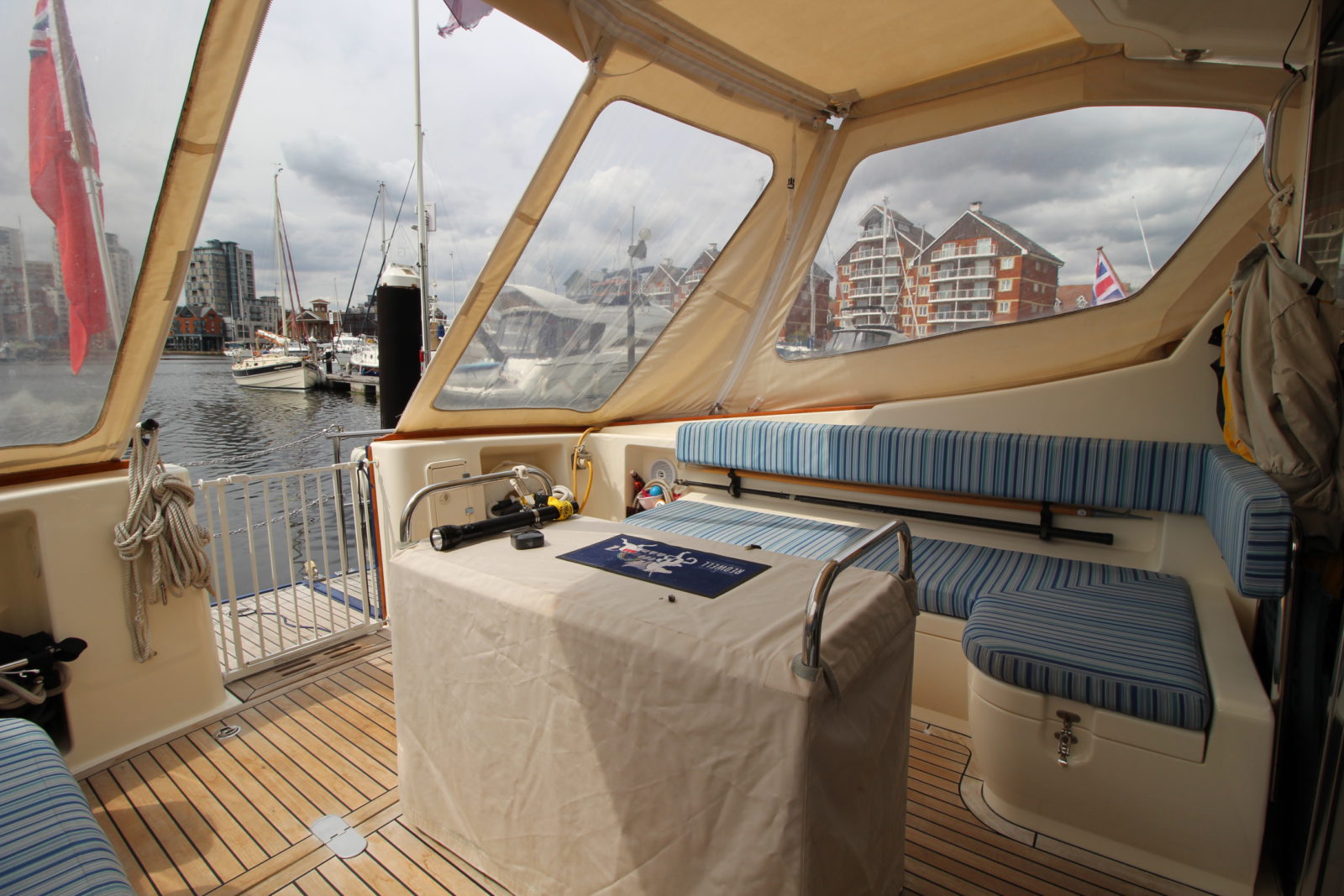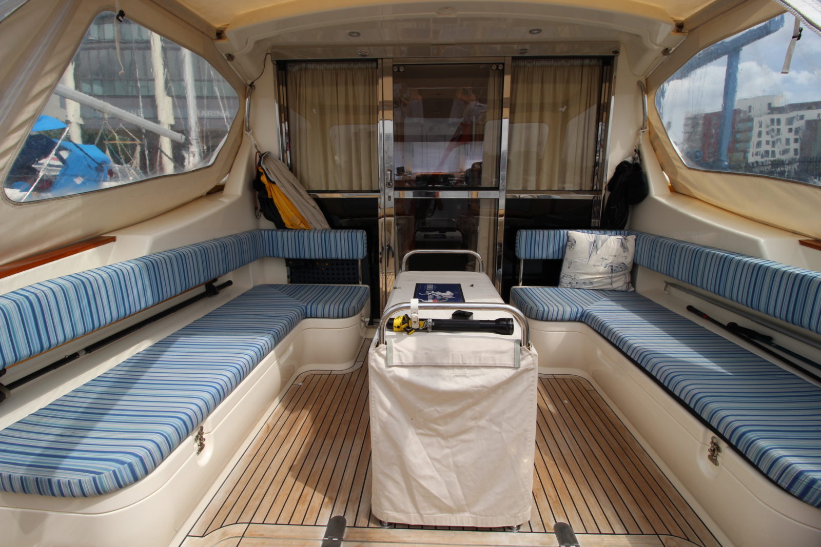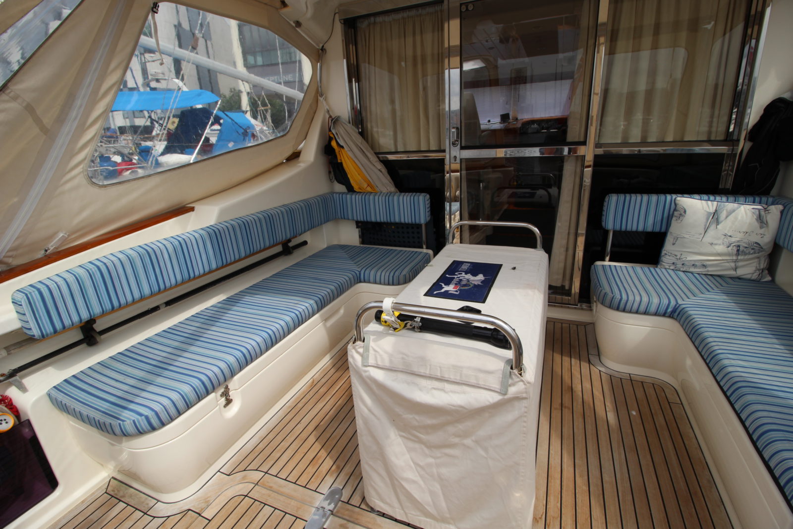 The aft cockpit has ample seating space to port and starboard with storage underneath and a large varnished teak steel table with a refrigerated interior.