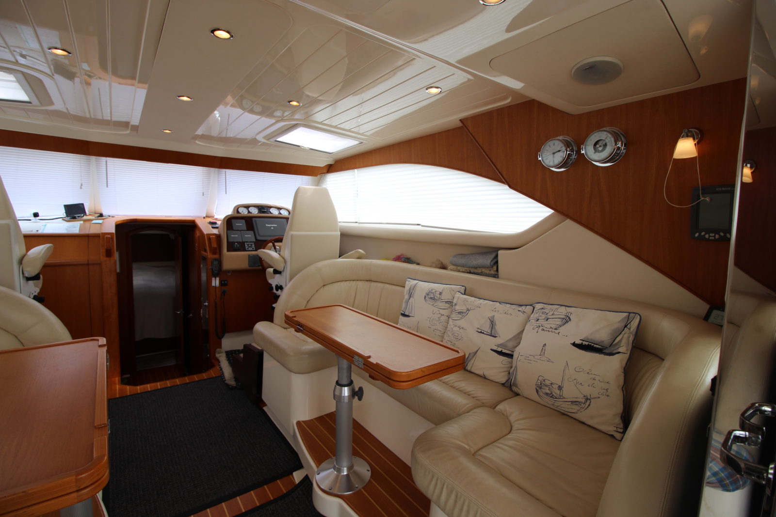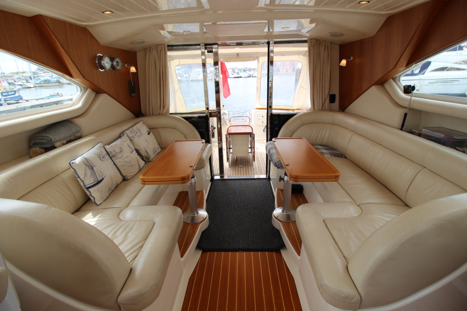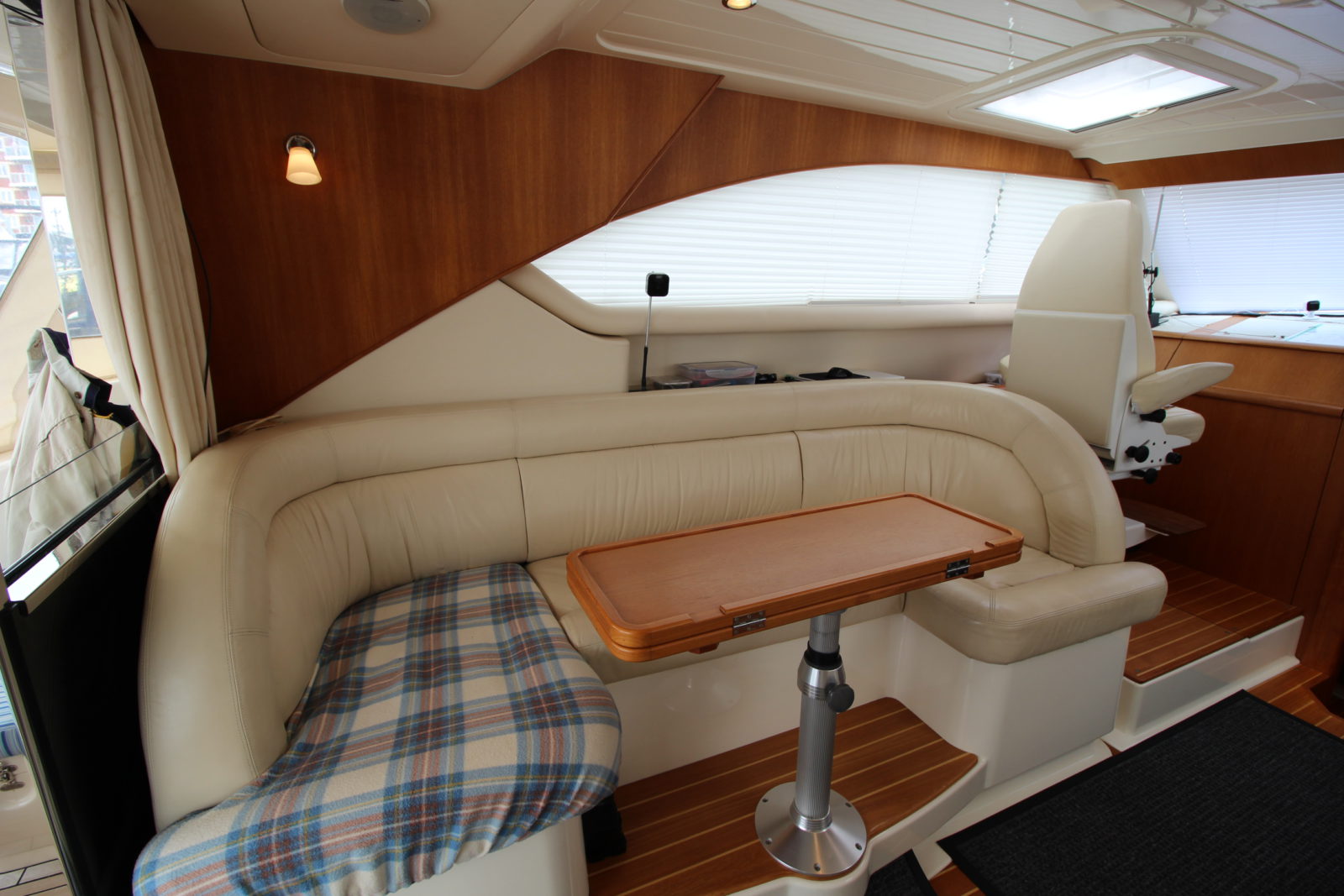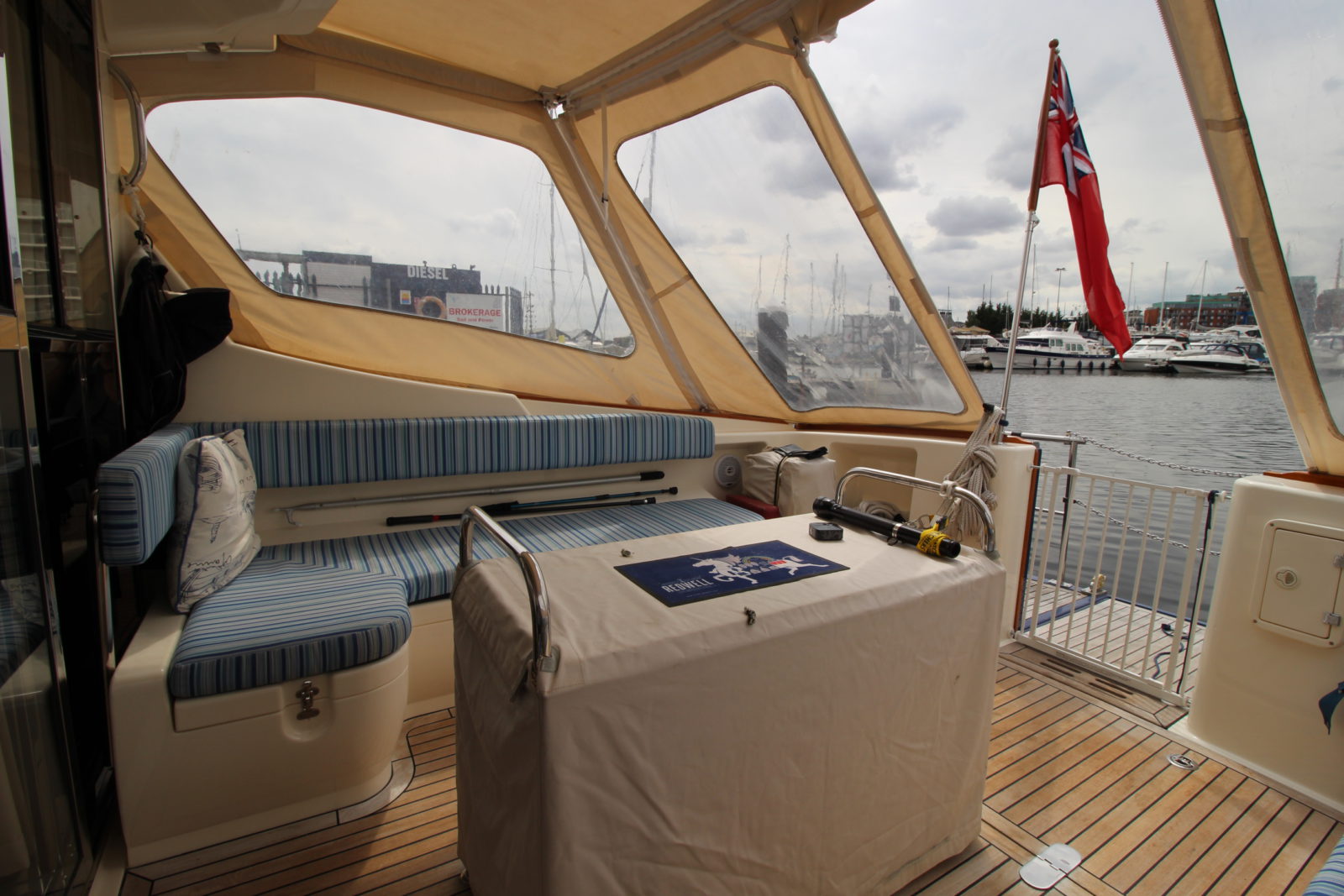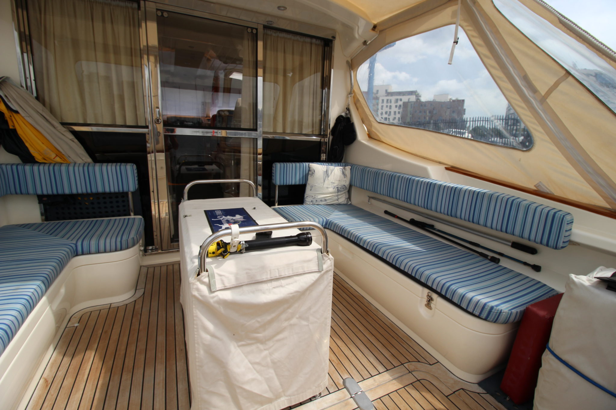 The aft cockpit has ample seating space to port and starboard with storage underneath and a large varnished teak steel table with a refrigerated interior.