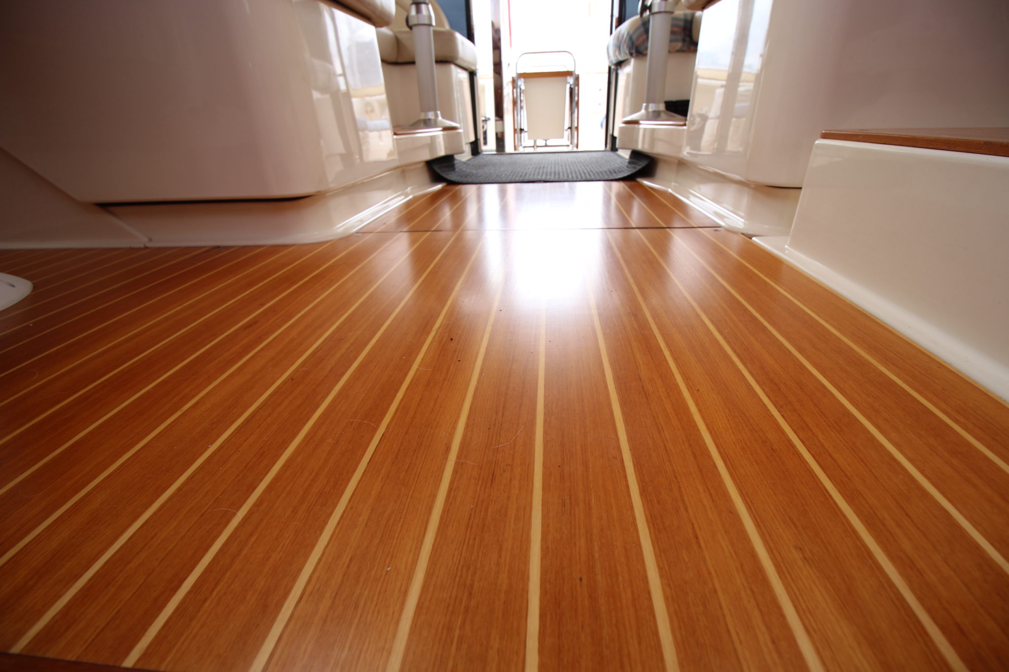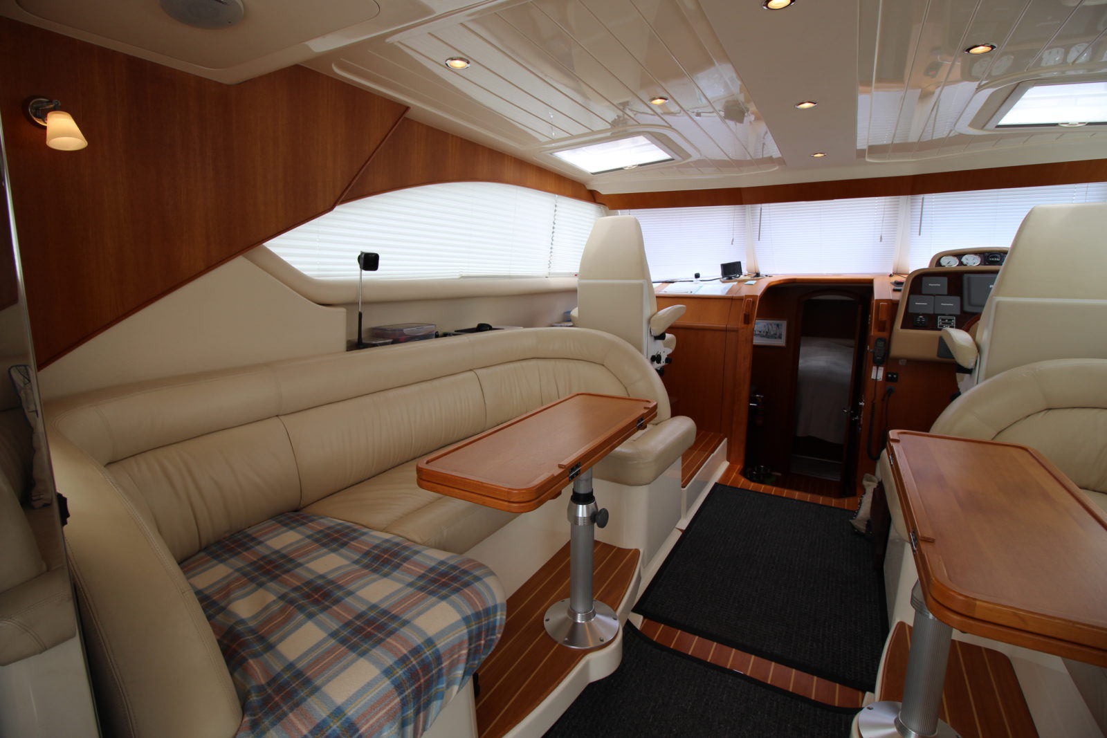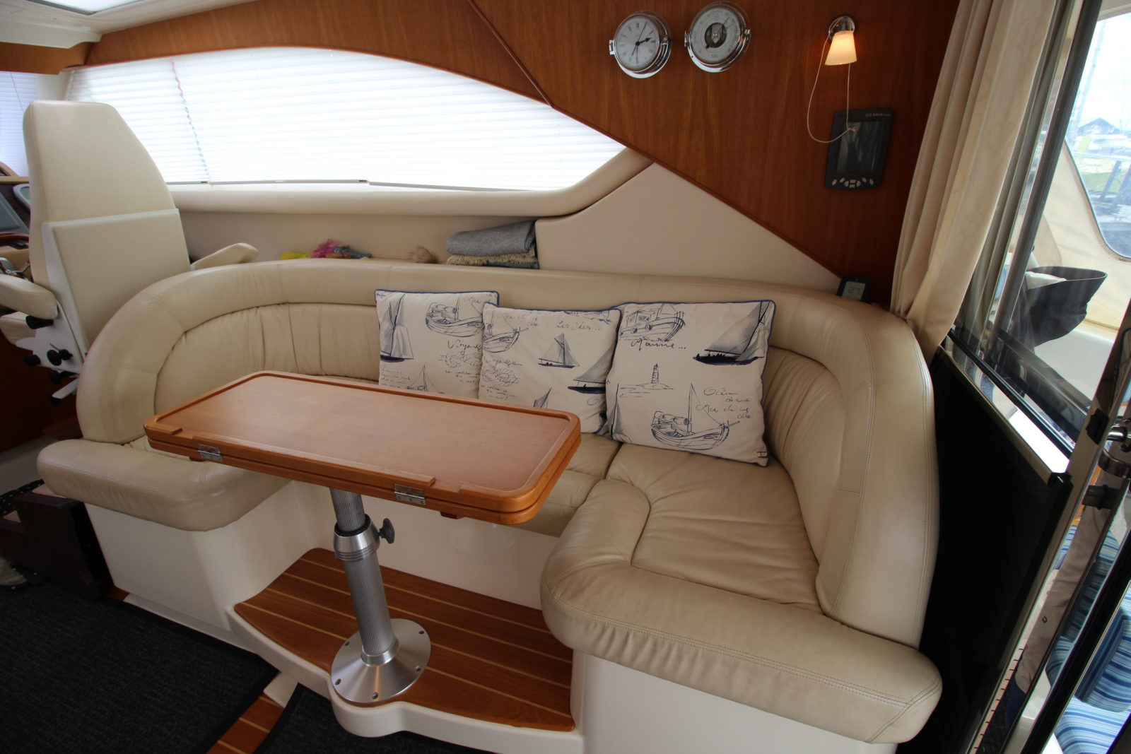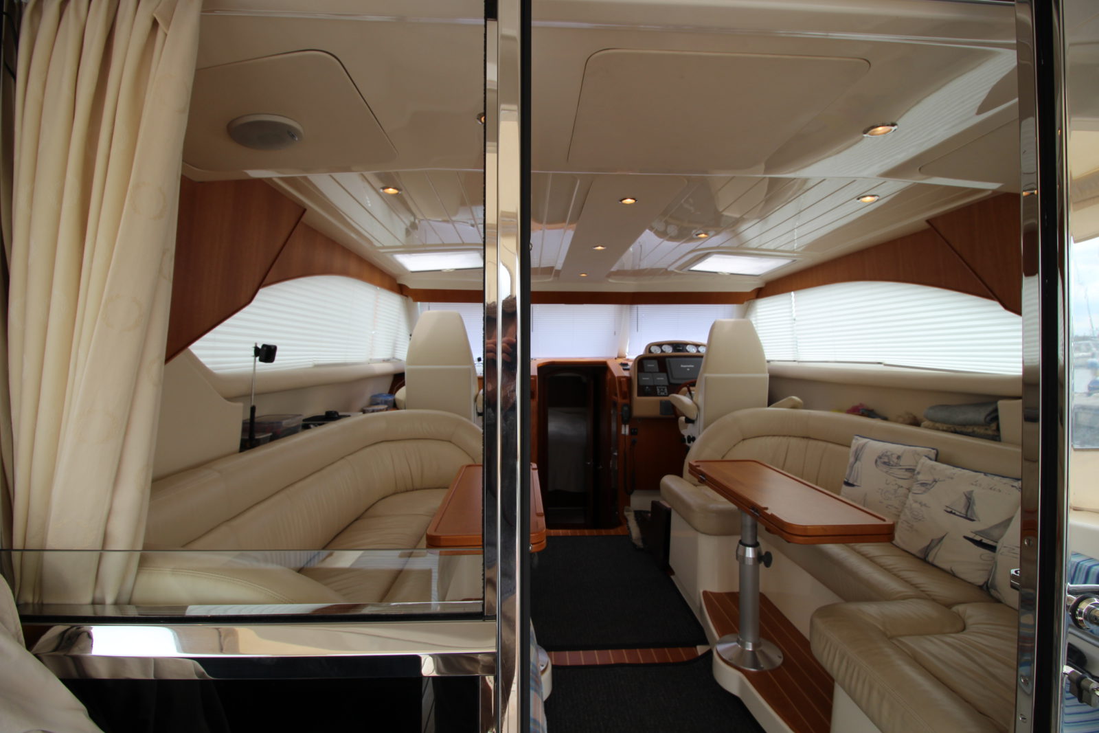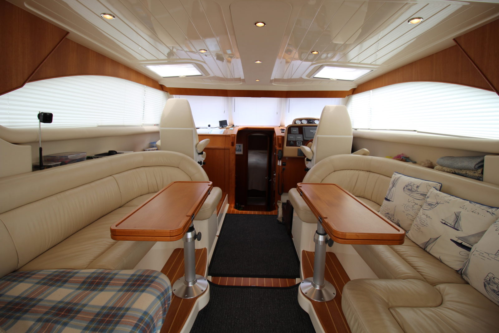 The aft cockpit has ample seating space to port and starboard with storage underneath and a large varnished teak steel table with a refrigerated interior.