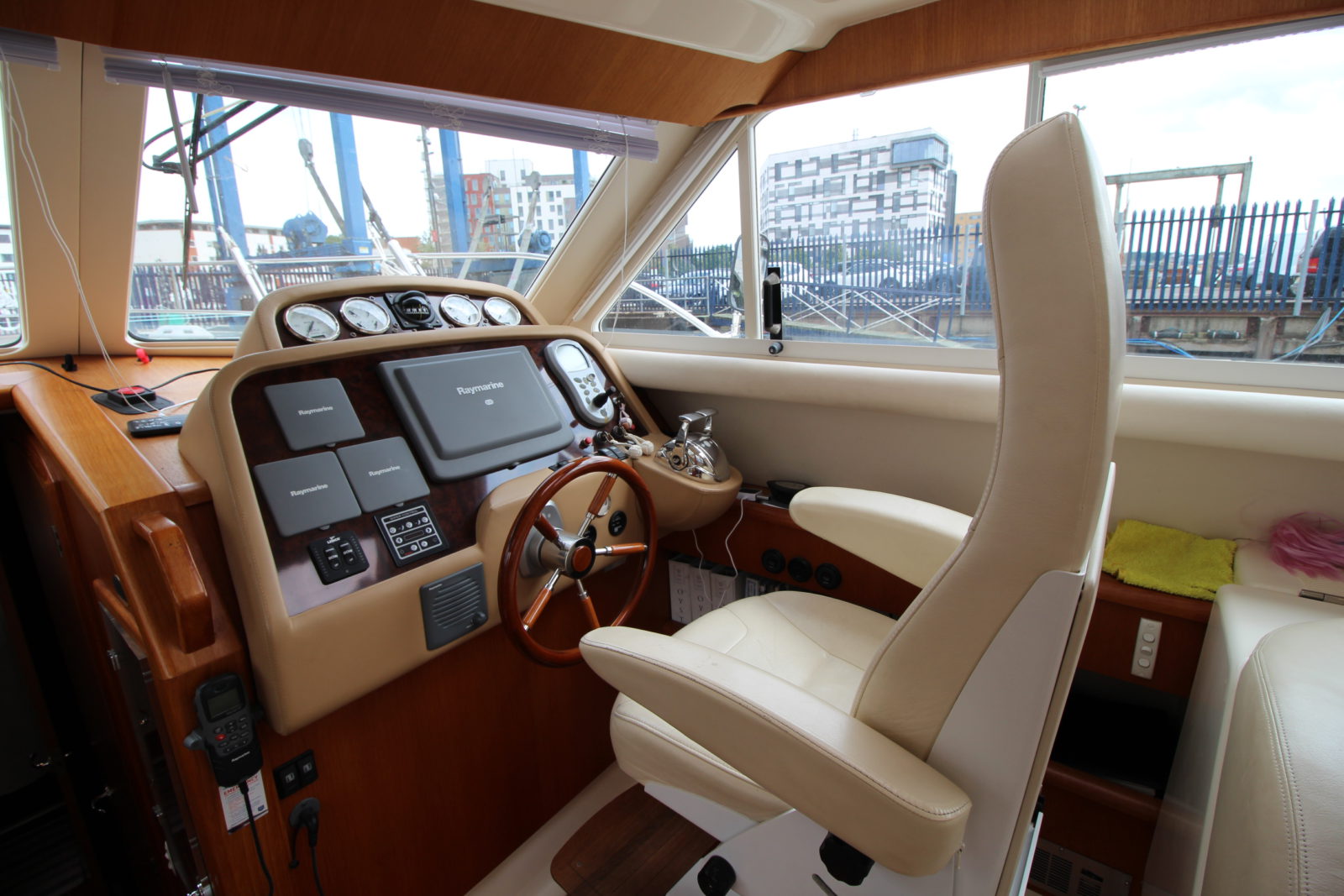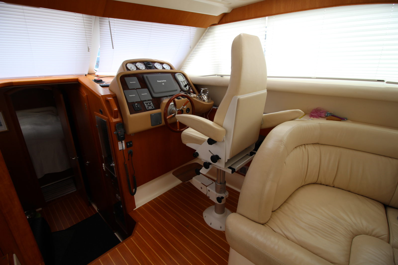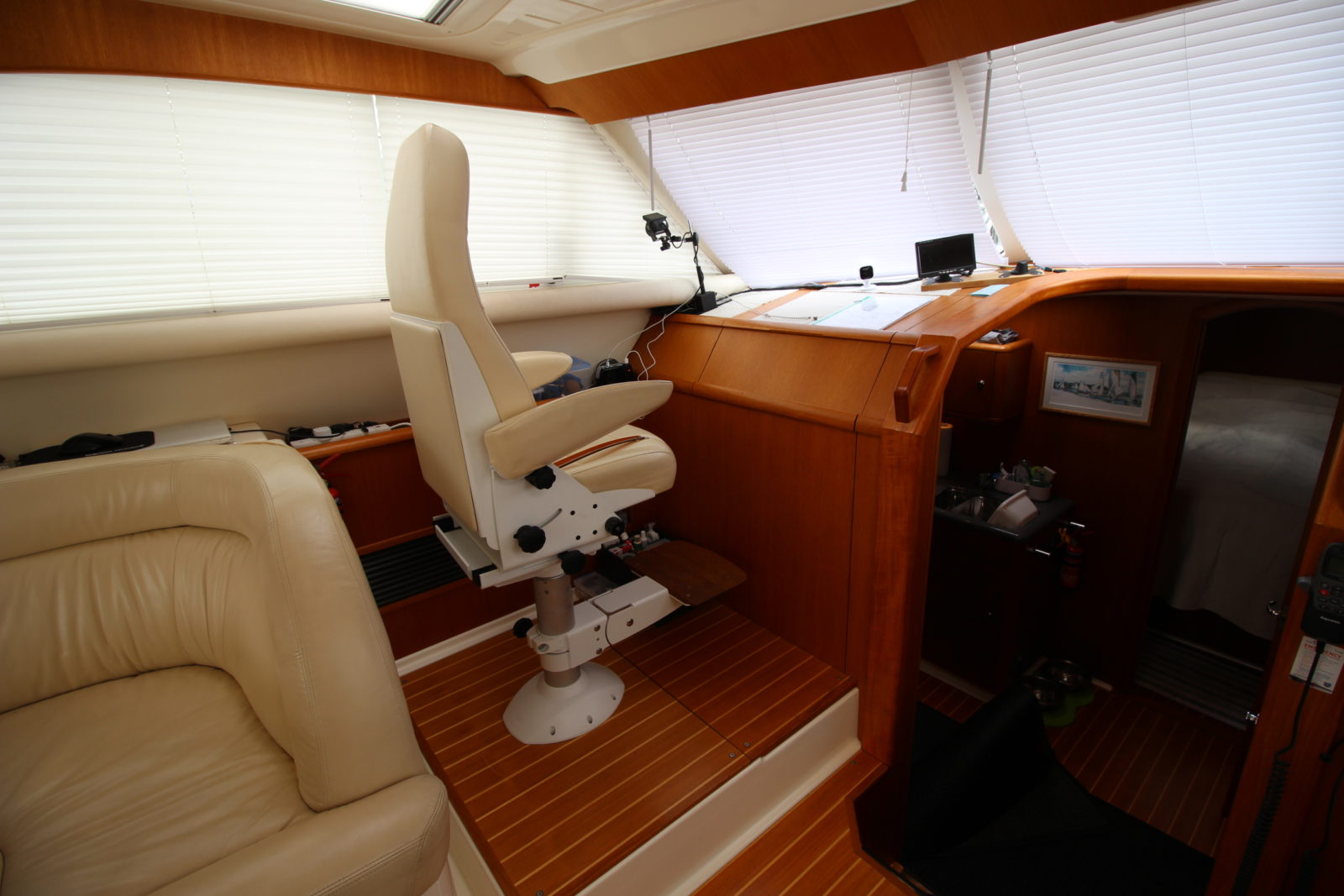 The helm and navigation consoles both feature shock dampened adjustable pilot seats with footrests for helmsman and pilot.