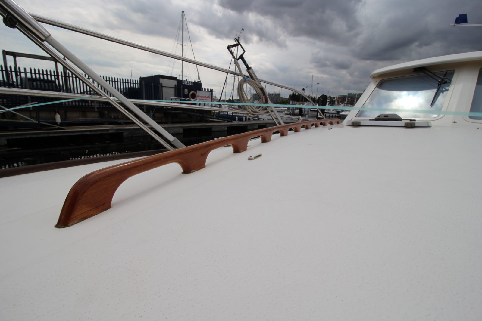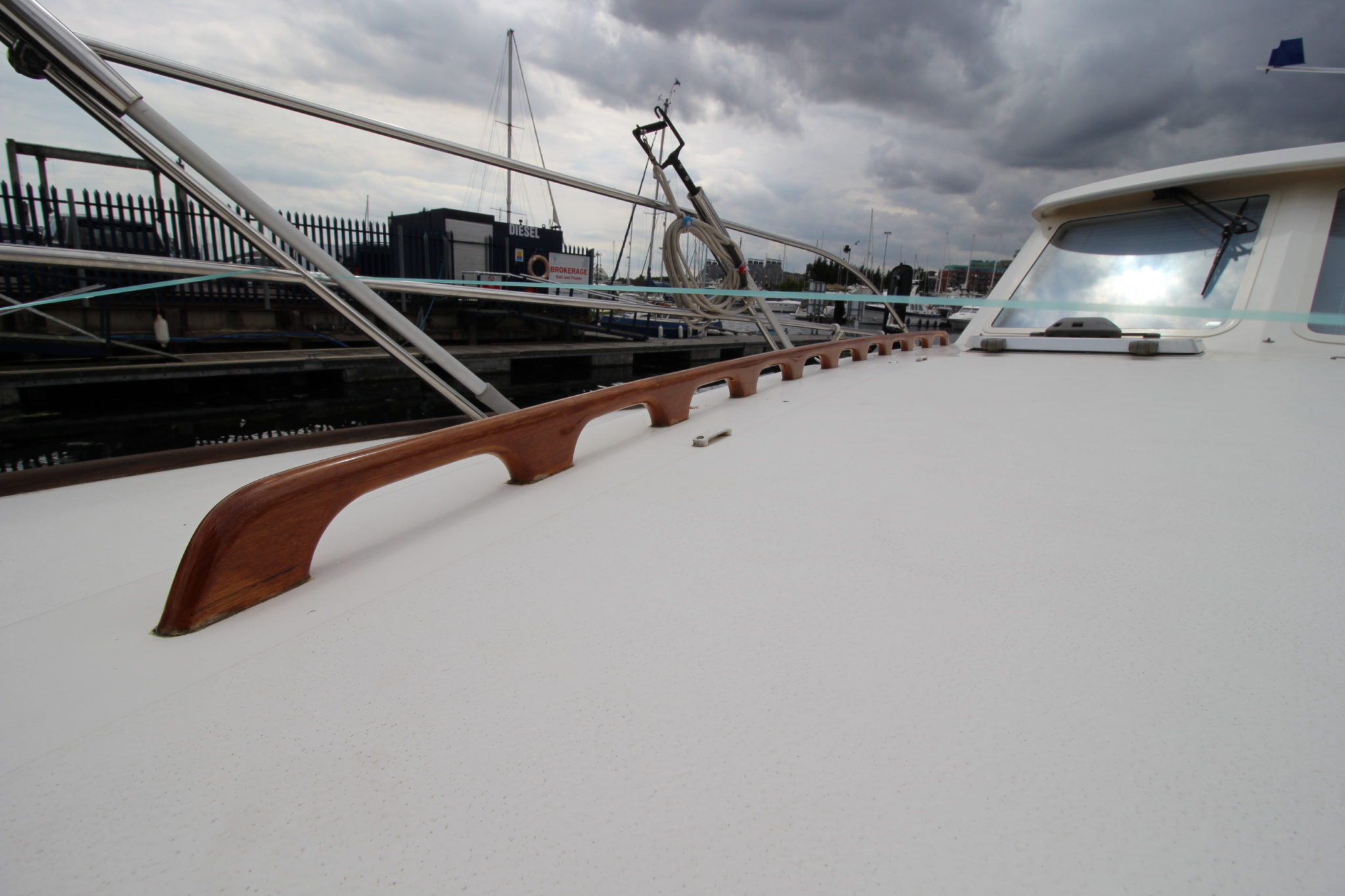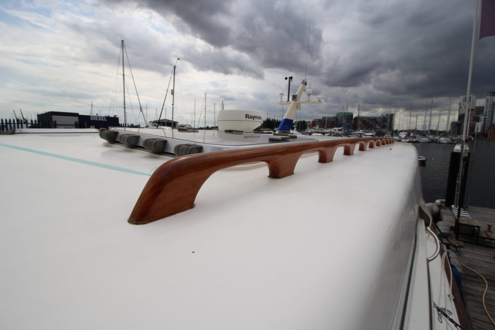 Highly–polished stainless steel pulpit and bow rails, with extra teak varnished grab rails to the foredeck and the cabin roof..