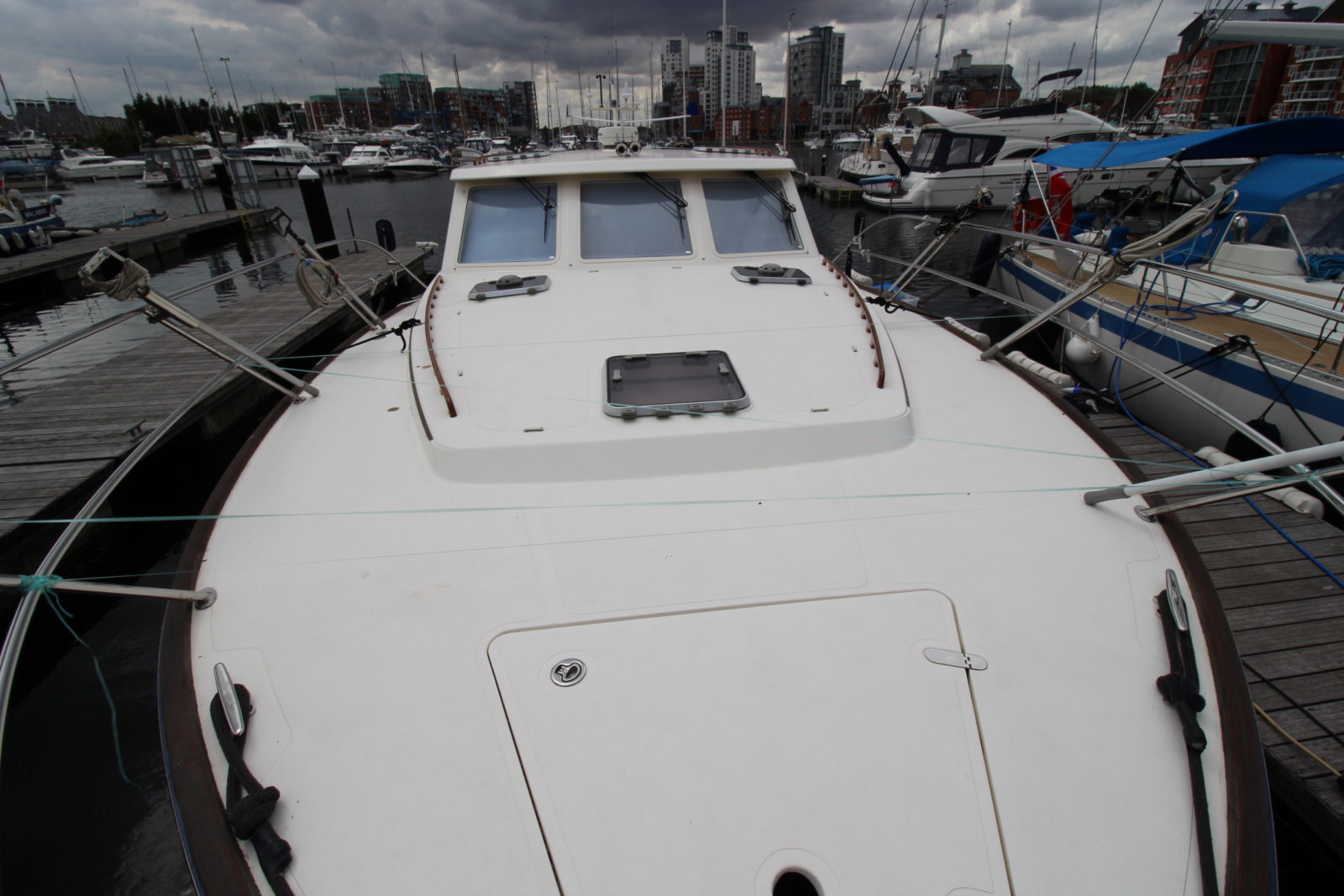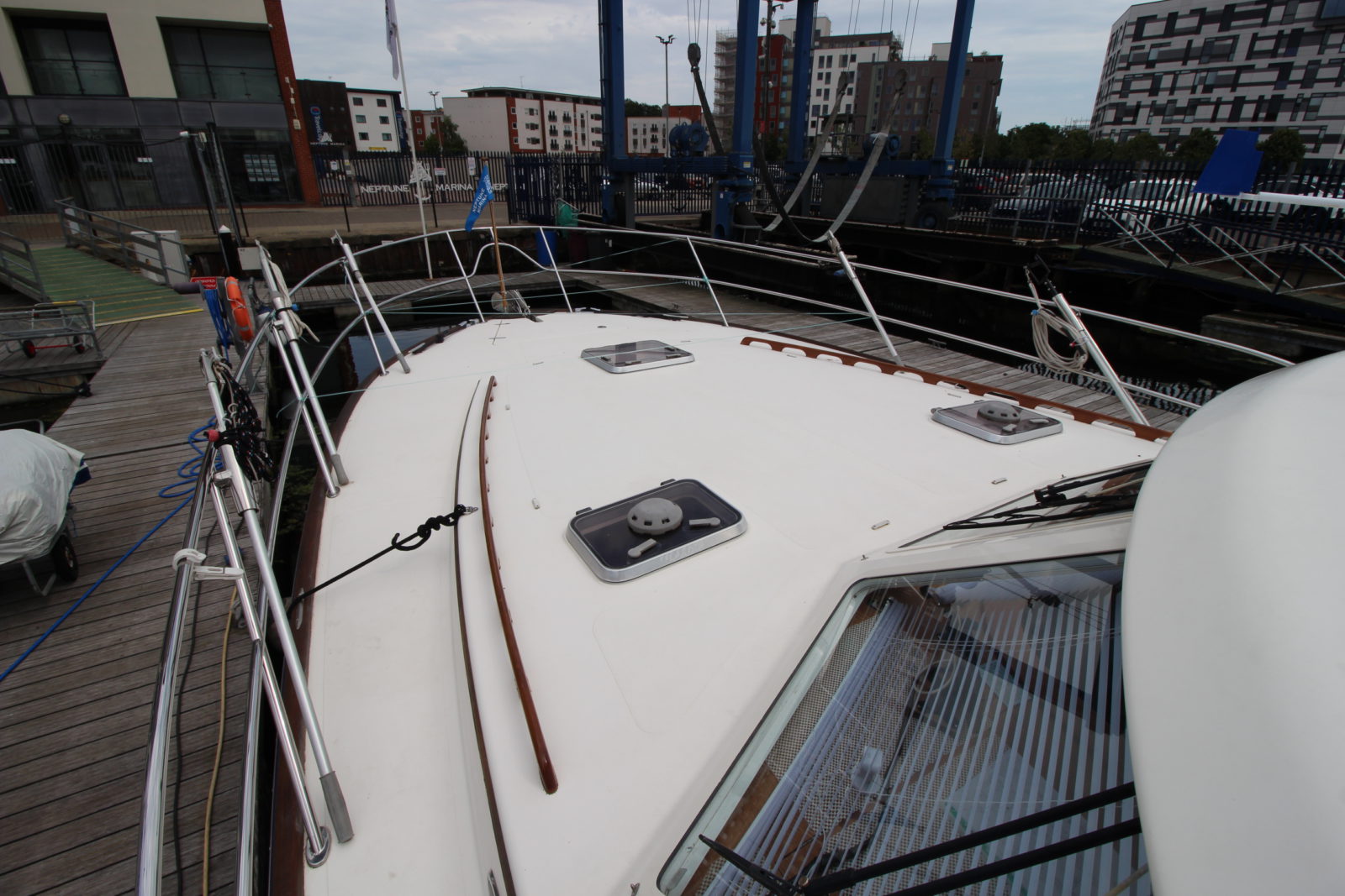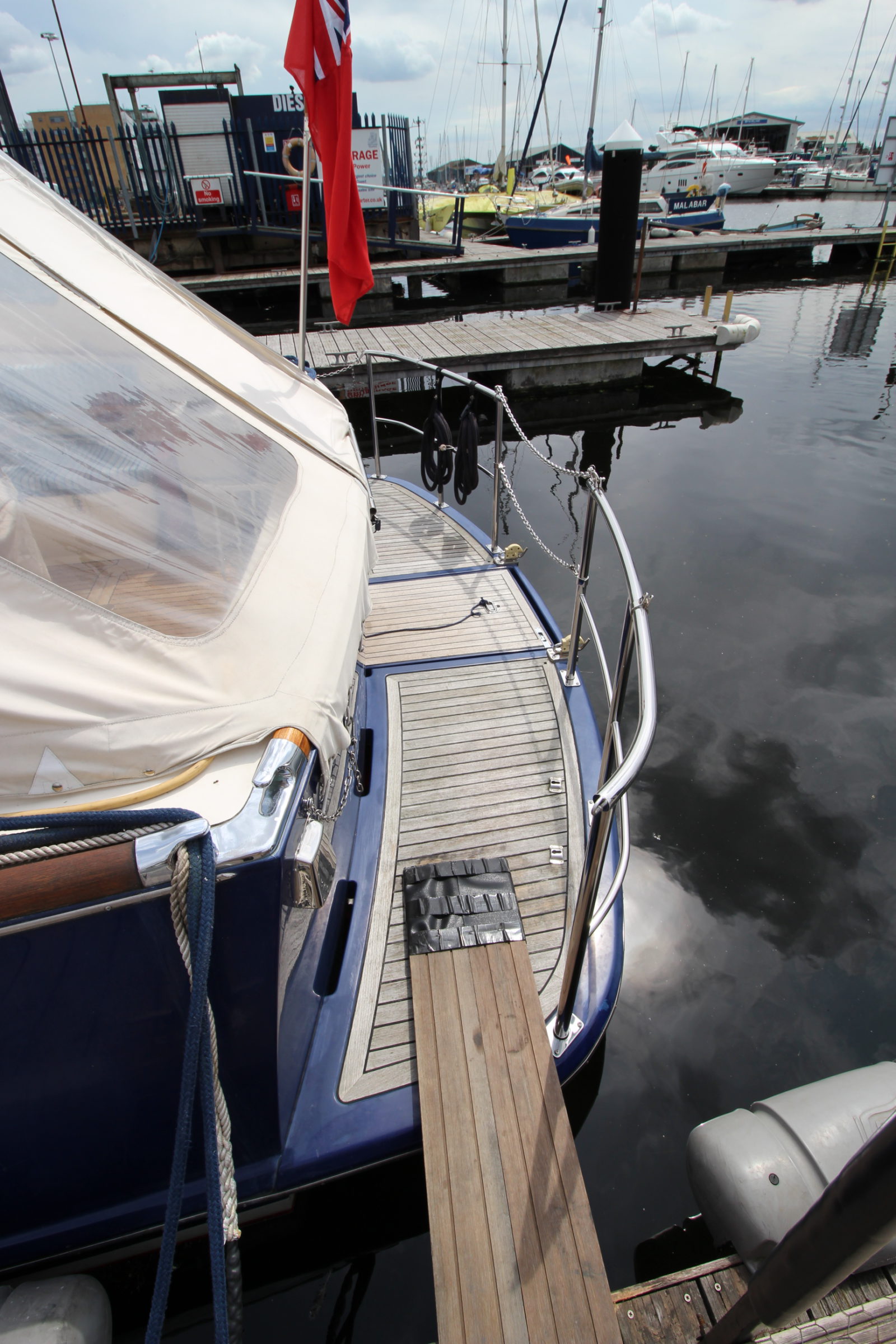 Highly–polished stainless steel pulpit and bow rails, with extra teak varnished grab rails to the foredeck and the cabin roof..