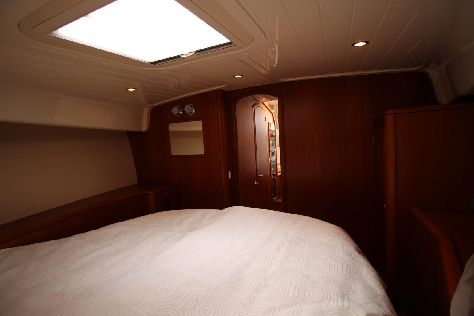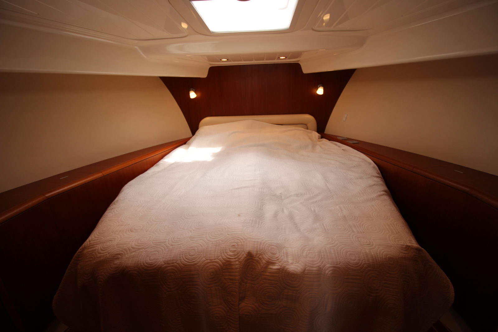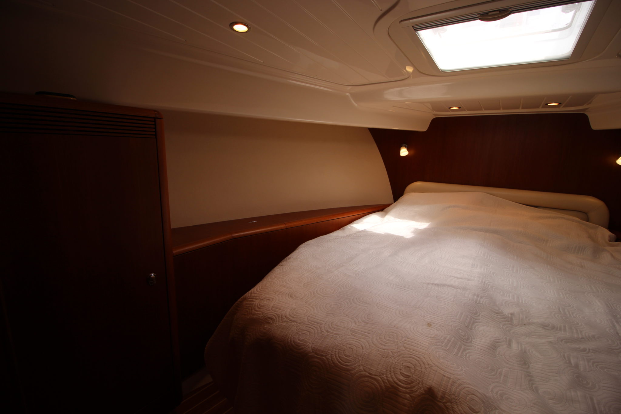 The forward cabin has a large double berth with custom mattress on a base that hinges to give access to large under berth storage.