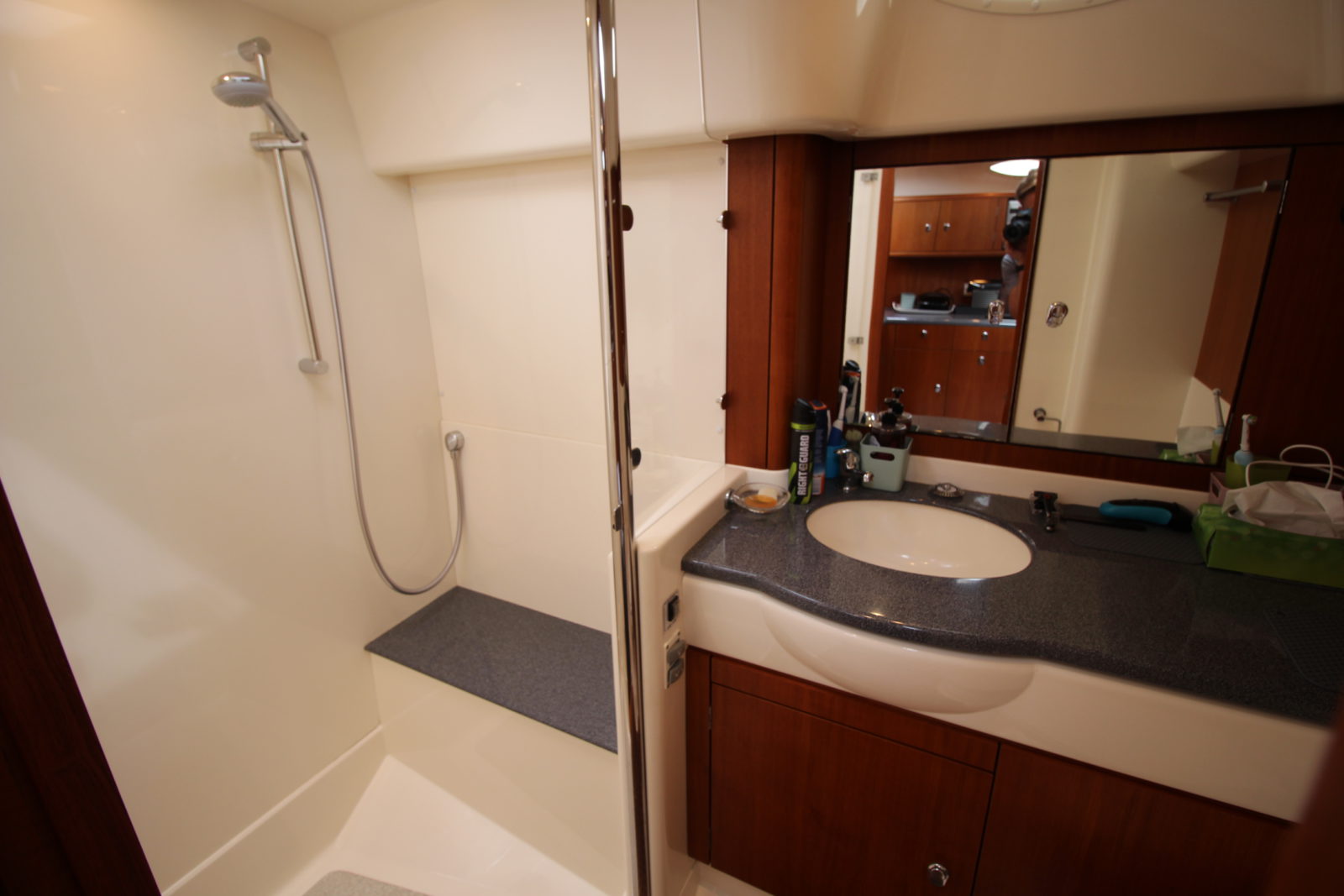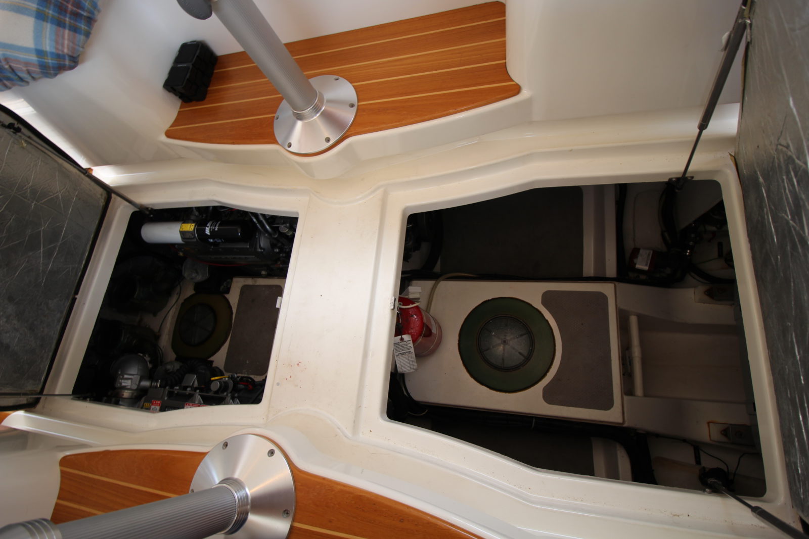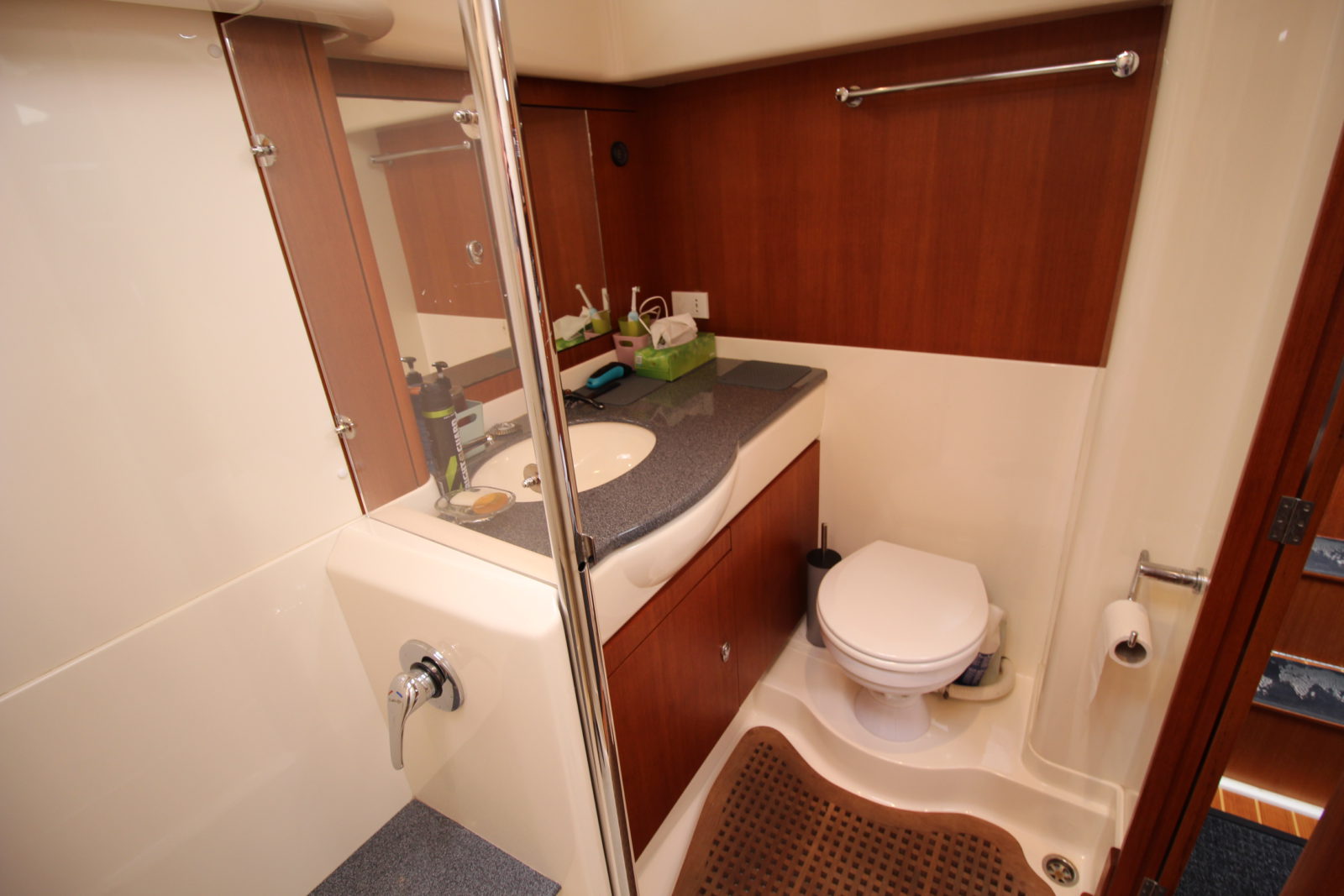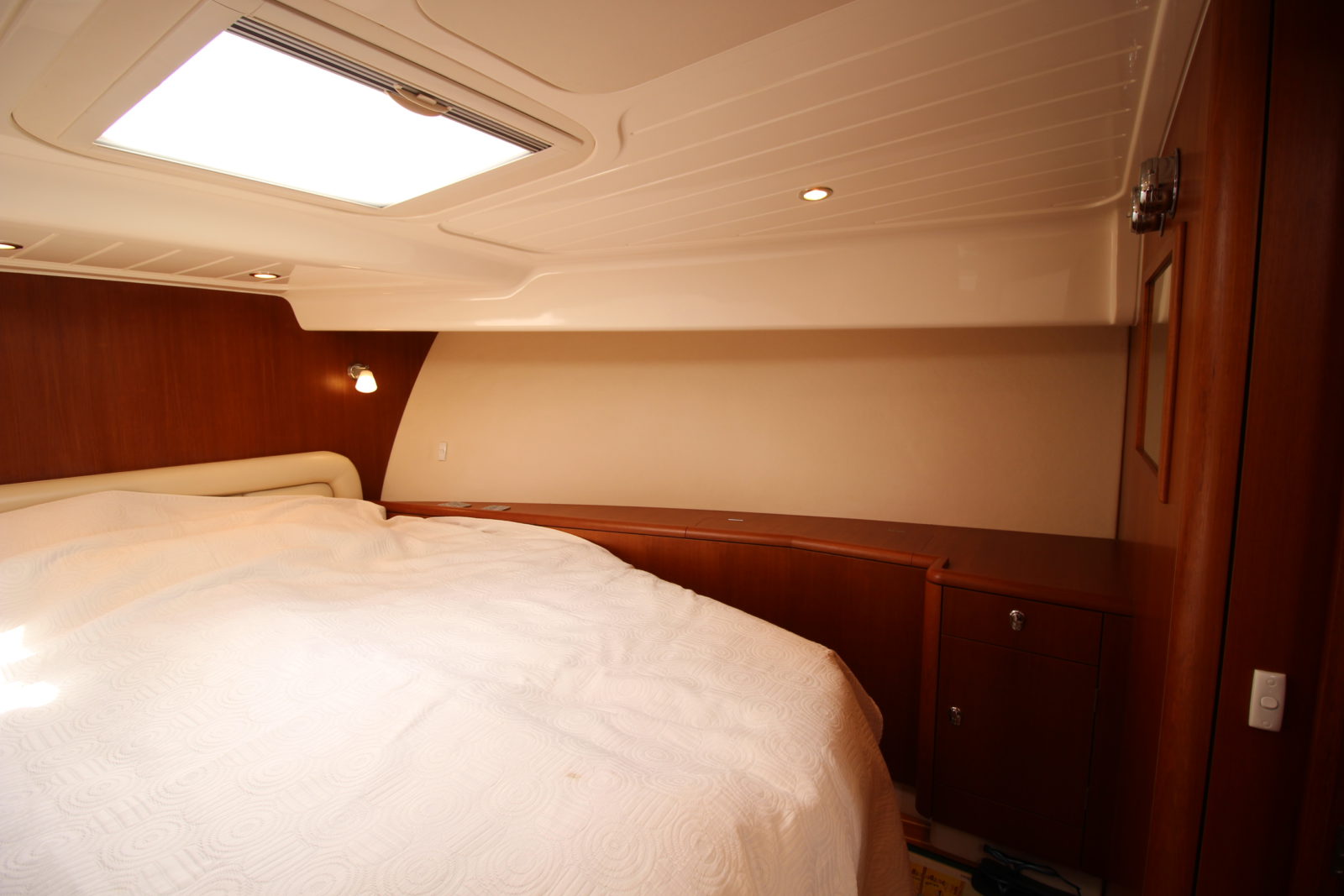 The forward cabin has a large double berth with custom mattress on a base that hinges to give access to large under berth storage.