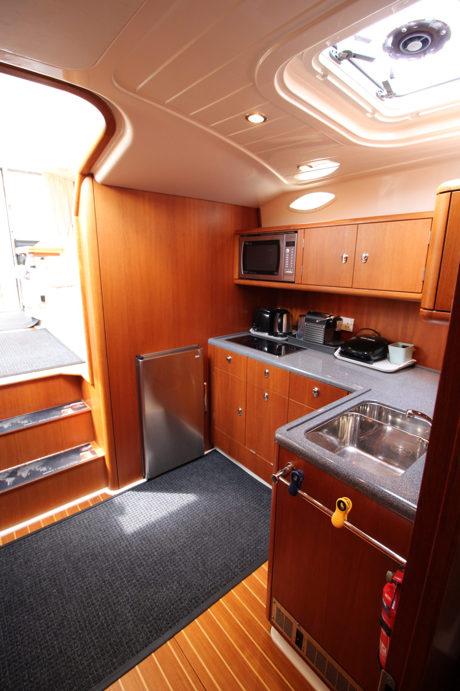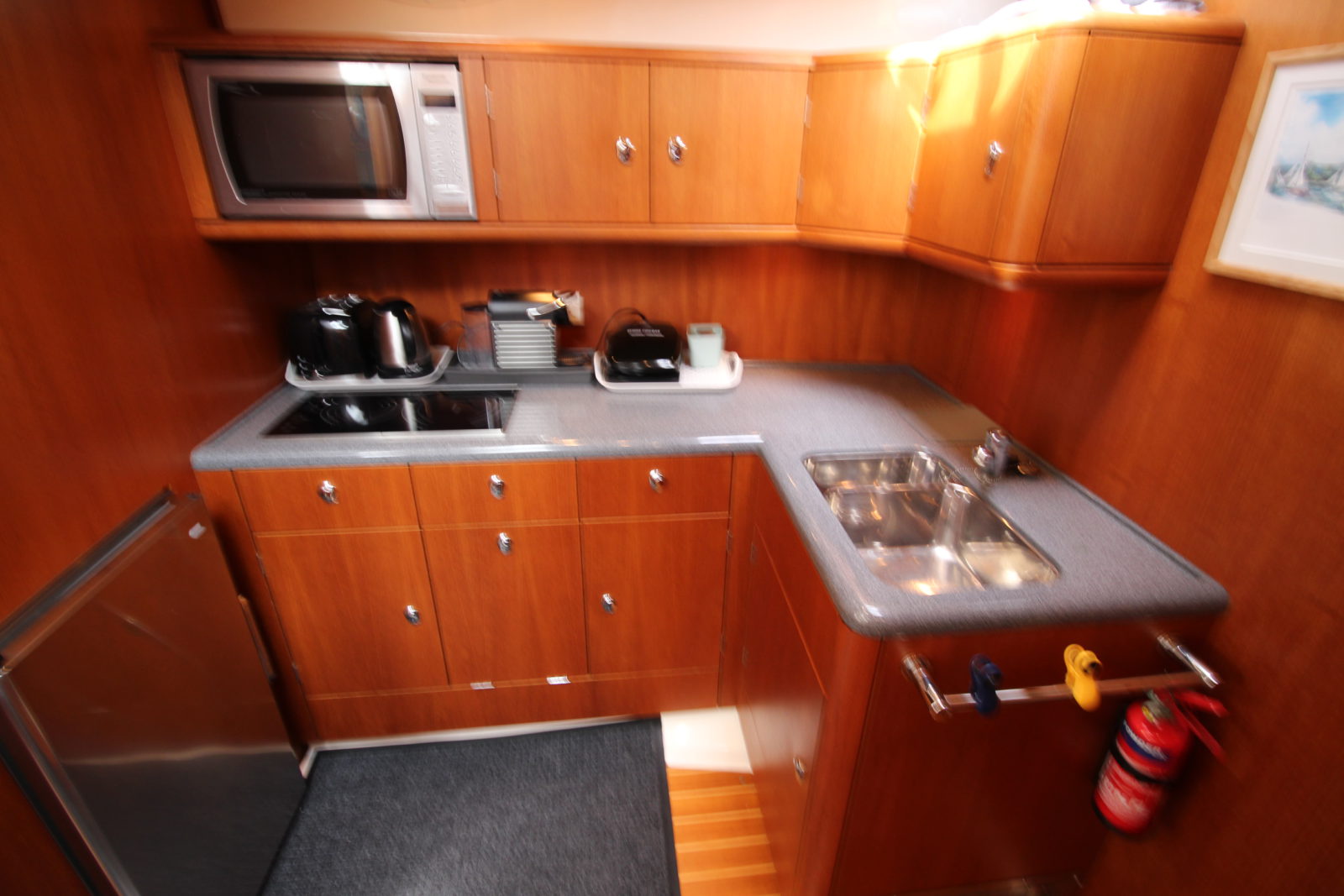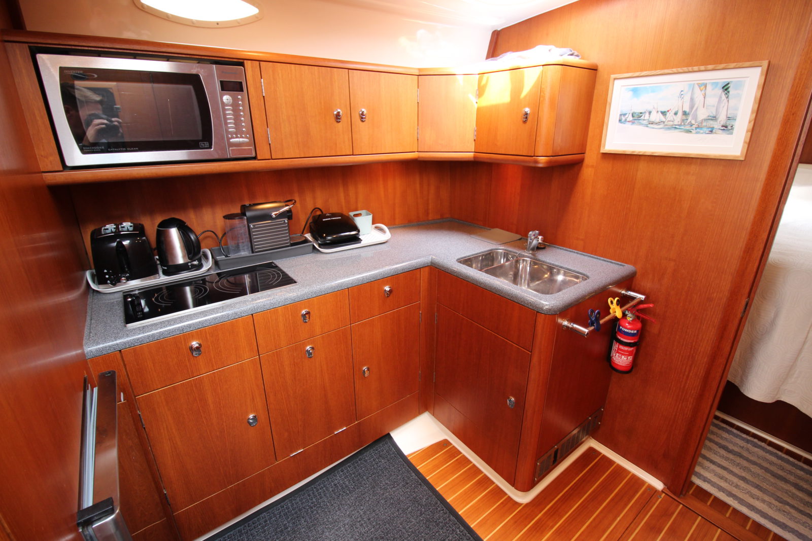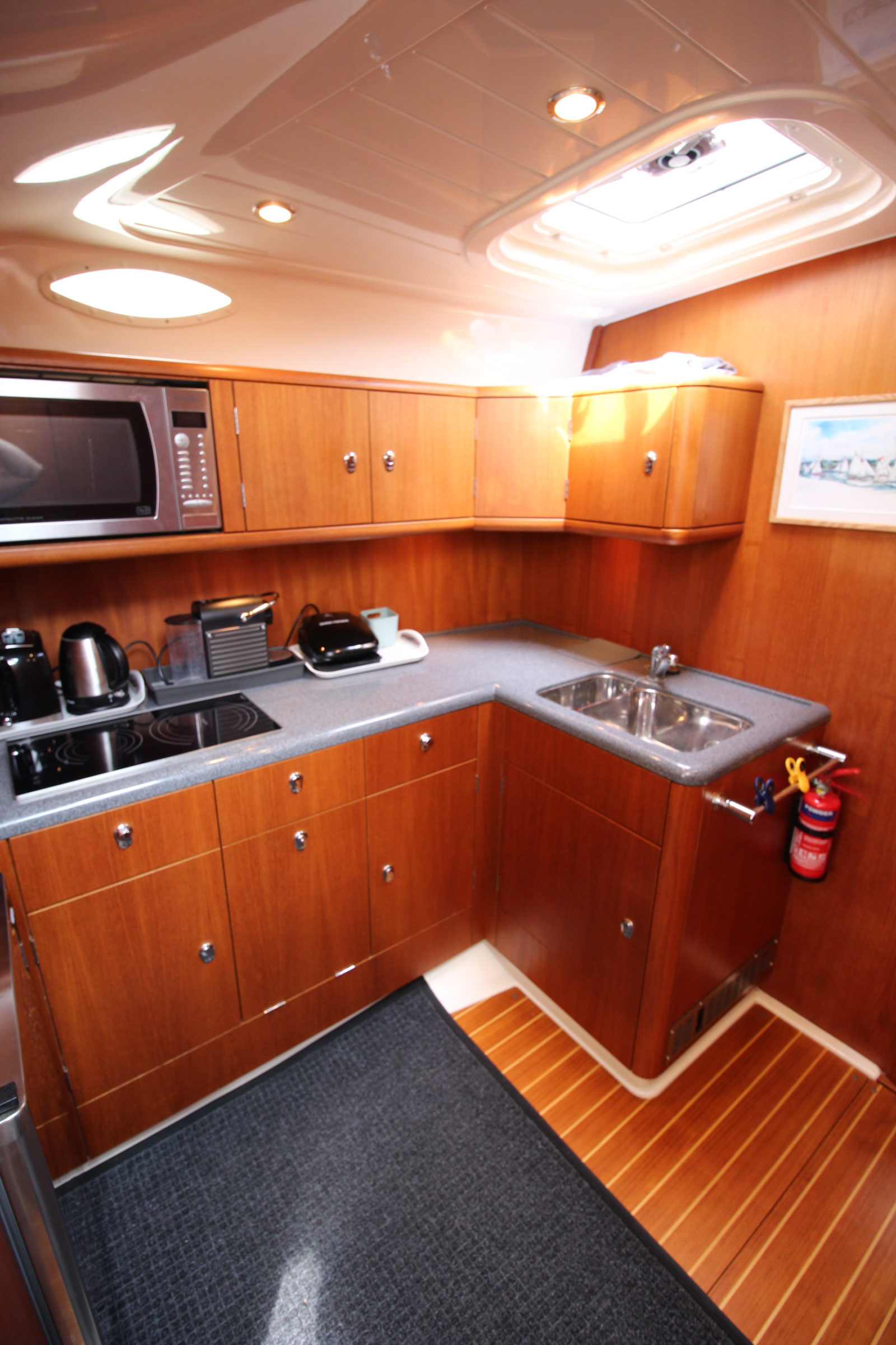 The galley is to port and is a half U with grey Avonite surfaces and a double sink and mixer tap supplying hot and cold water.