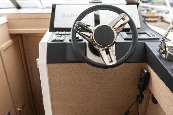 Helm console with engine throttles, full engine instrumentation, compass and cup holders